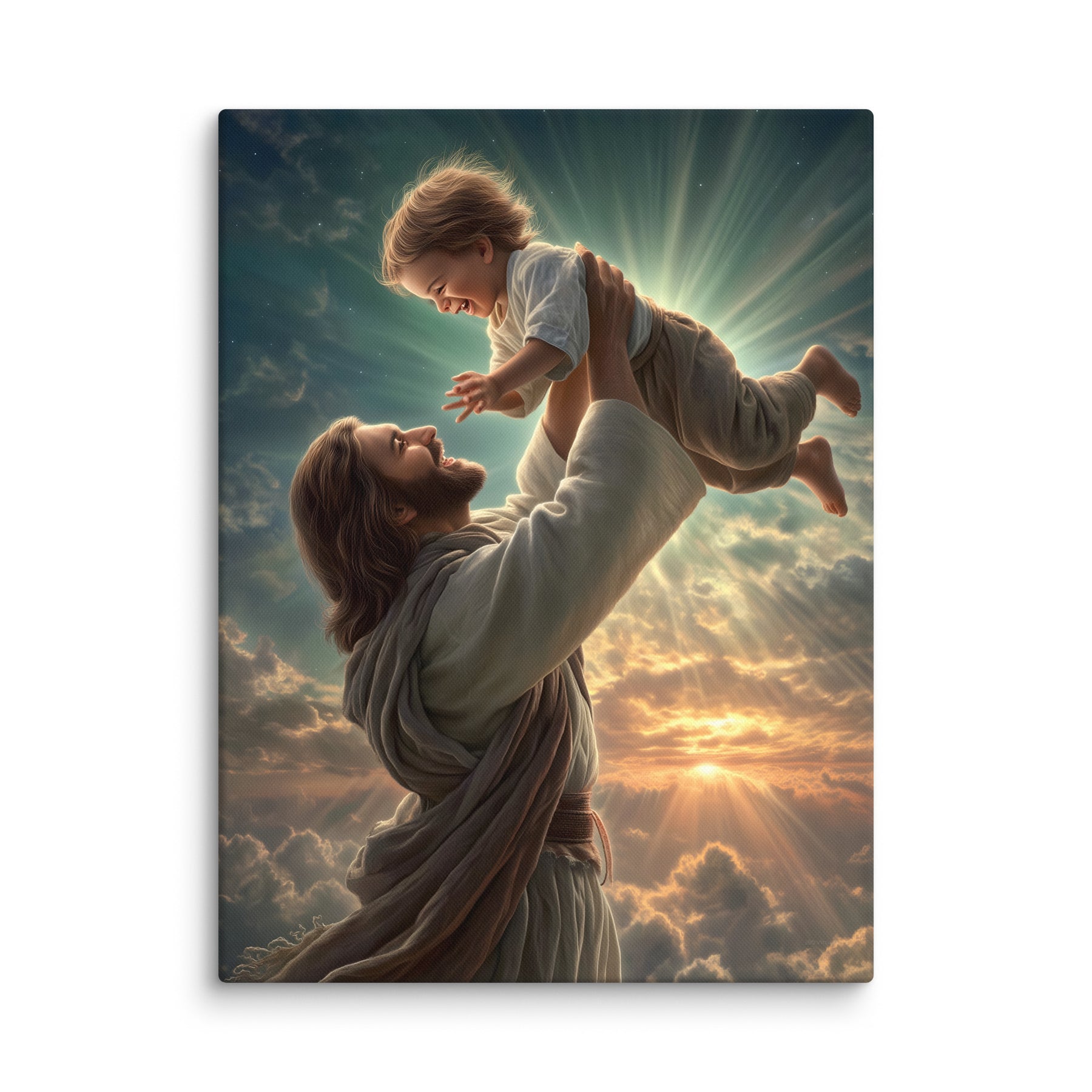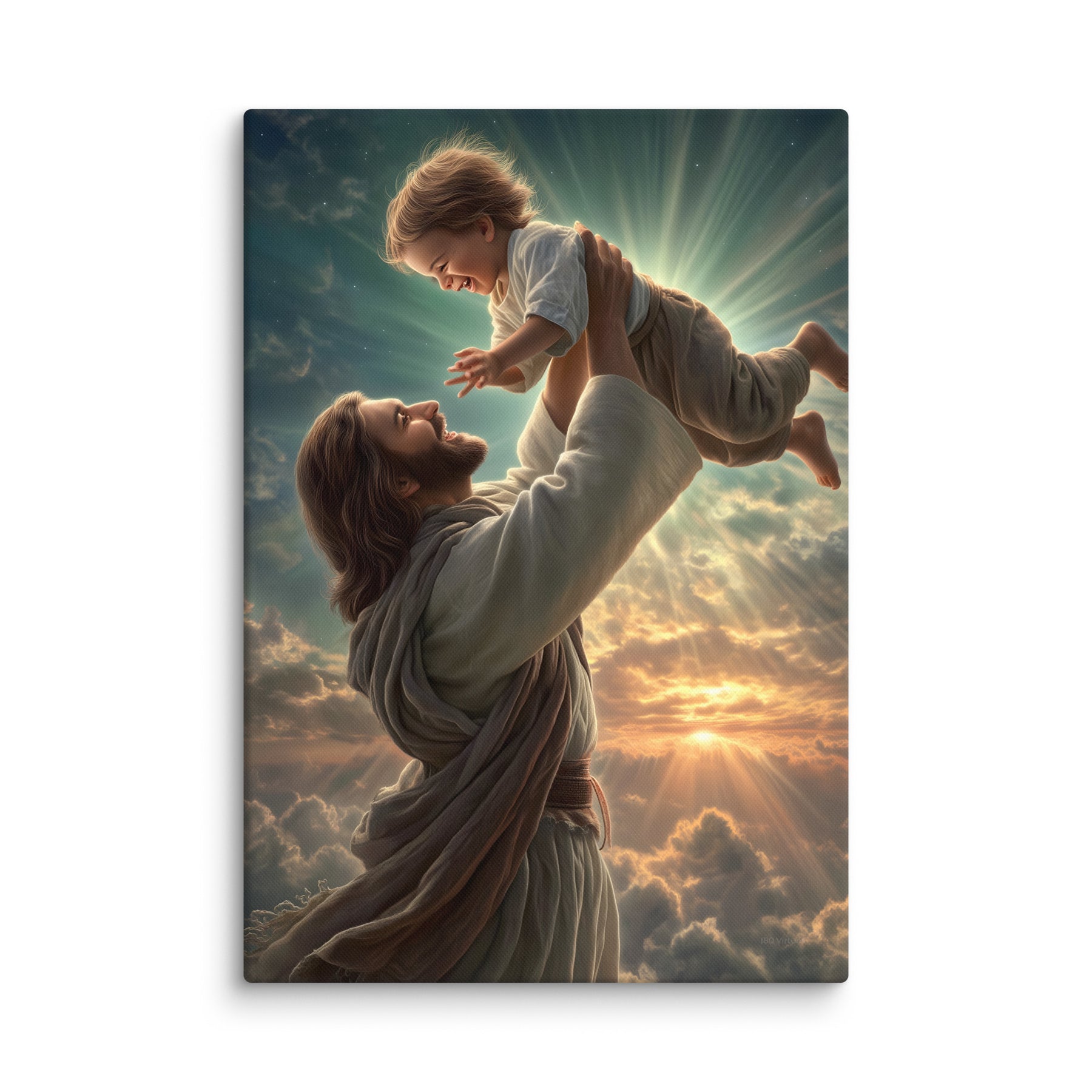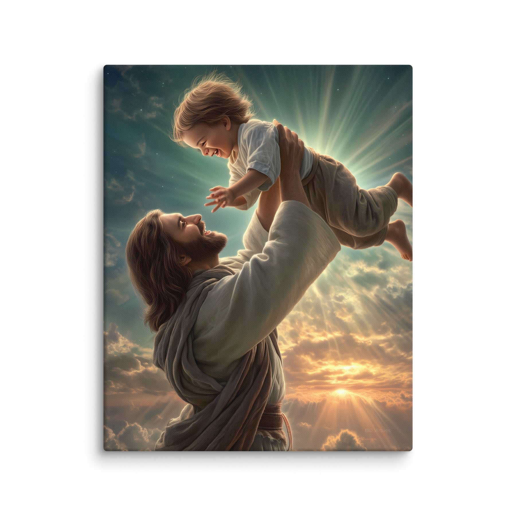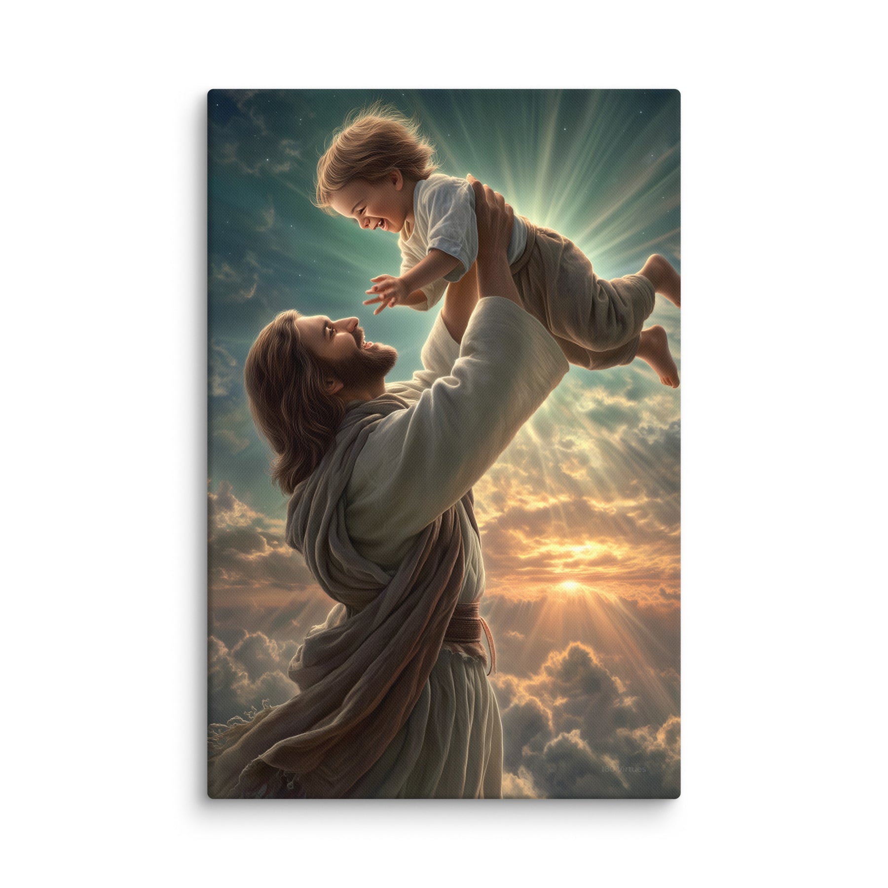 In this heart-warming scene, Jesus lifts a joyful child high into the heavenly light, His face glowing with pure delight as He watches the little one laugh without restraint. Soft rays burst through the clouds, surrounding them in warmth and wonder, as if all of heaven is celebrating this simple, perfect moment of love. The child’s laughter reflects the freedom and safety found only in the arms of the Savior, while Jesus’ radiant smile shows the depth of His affection for every soul.