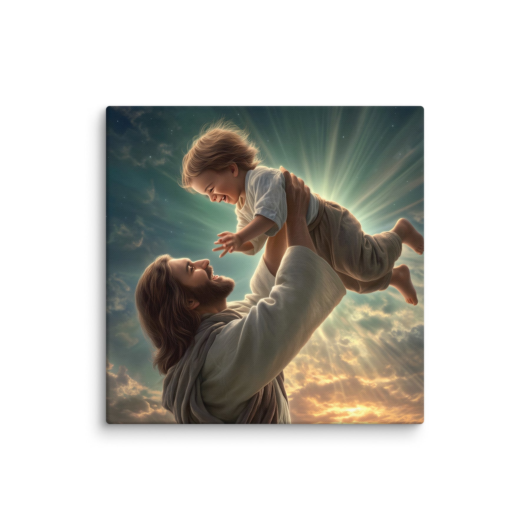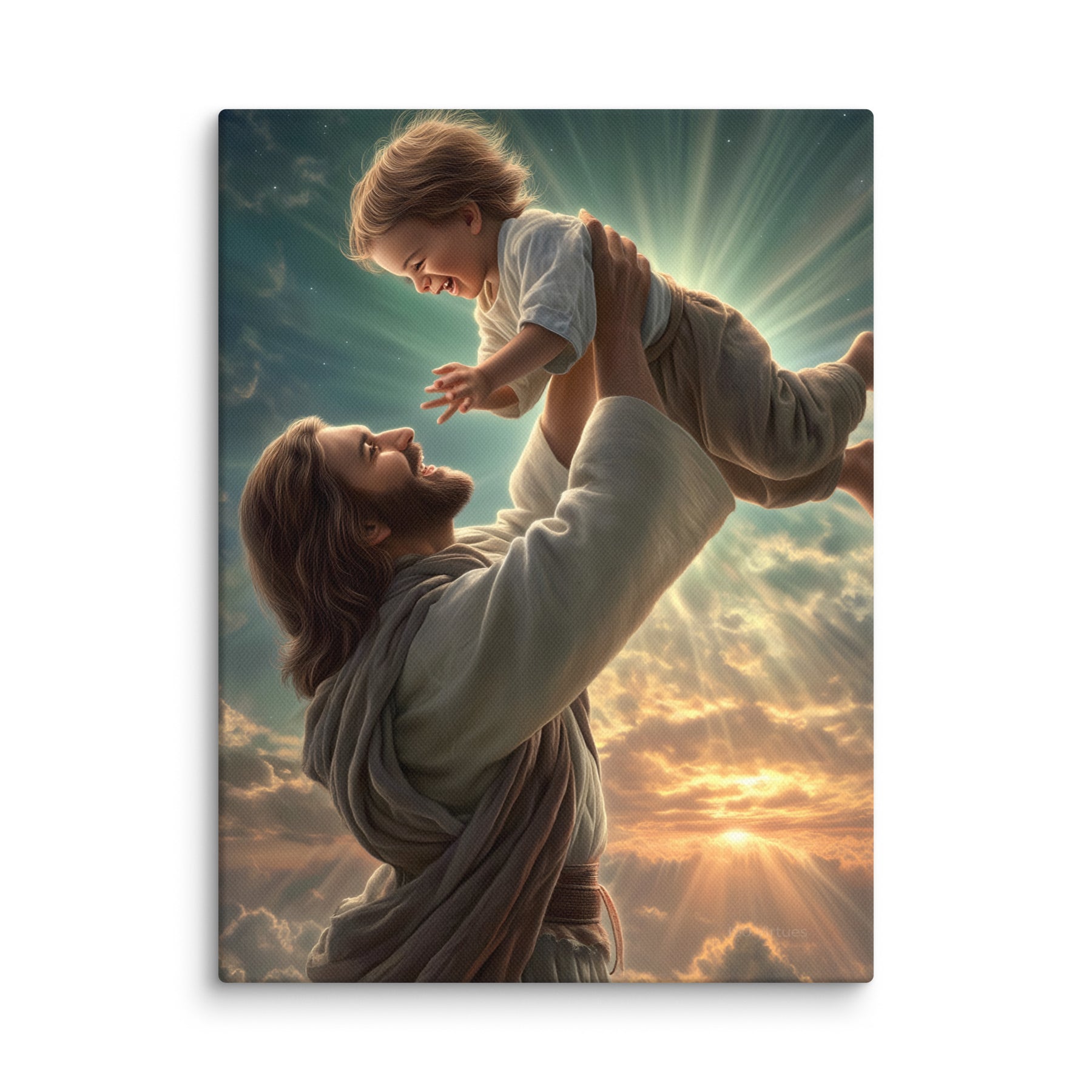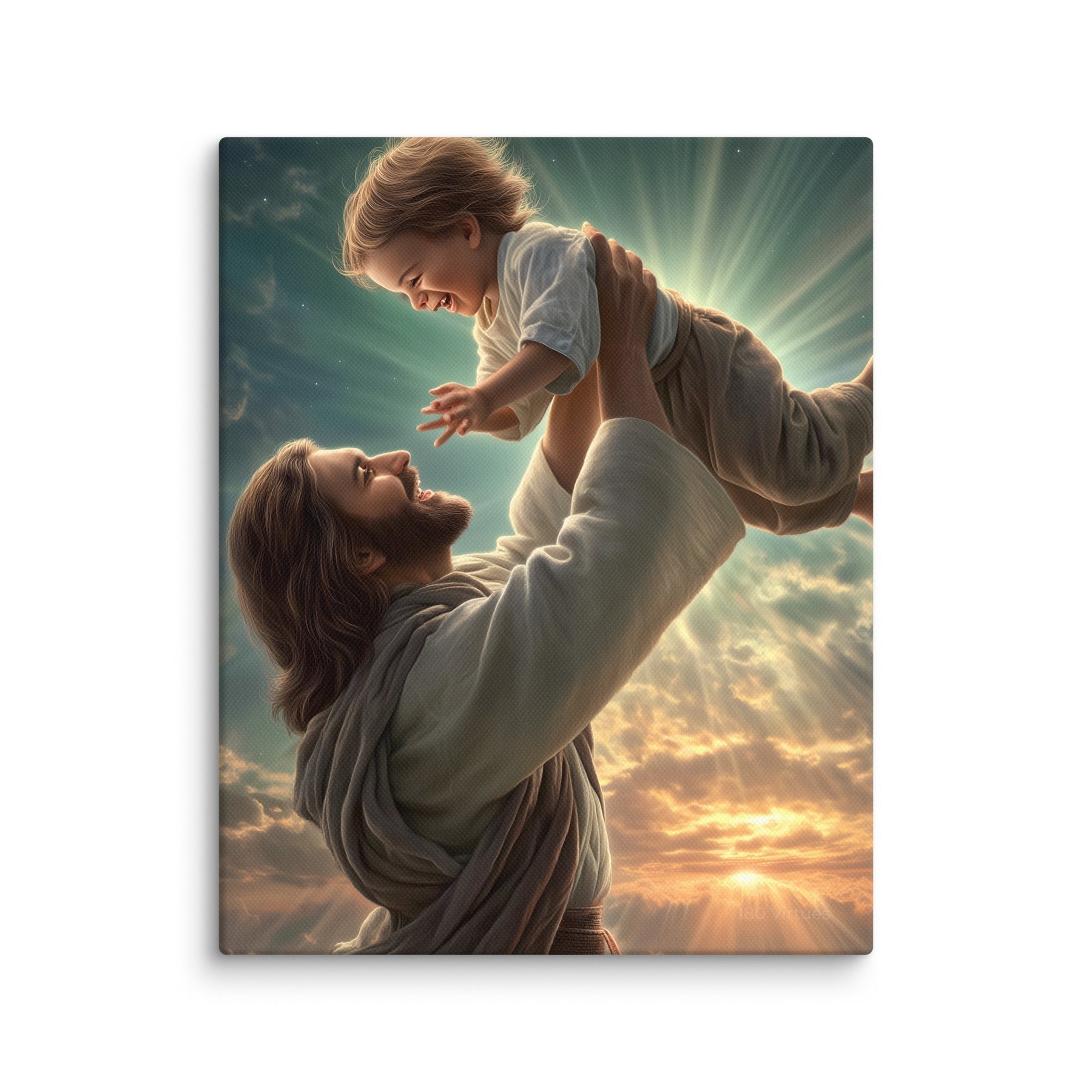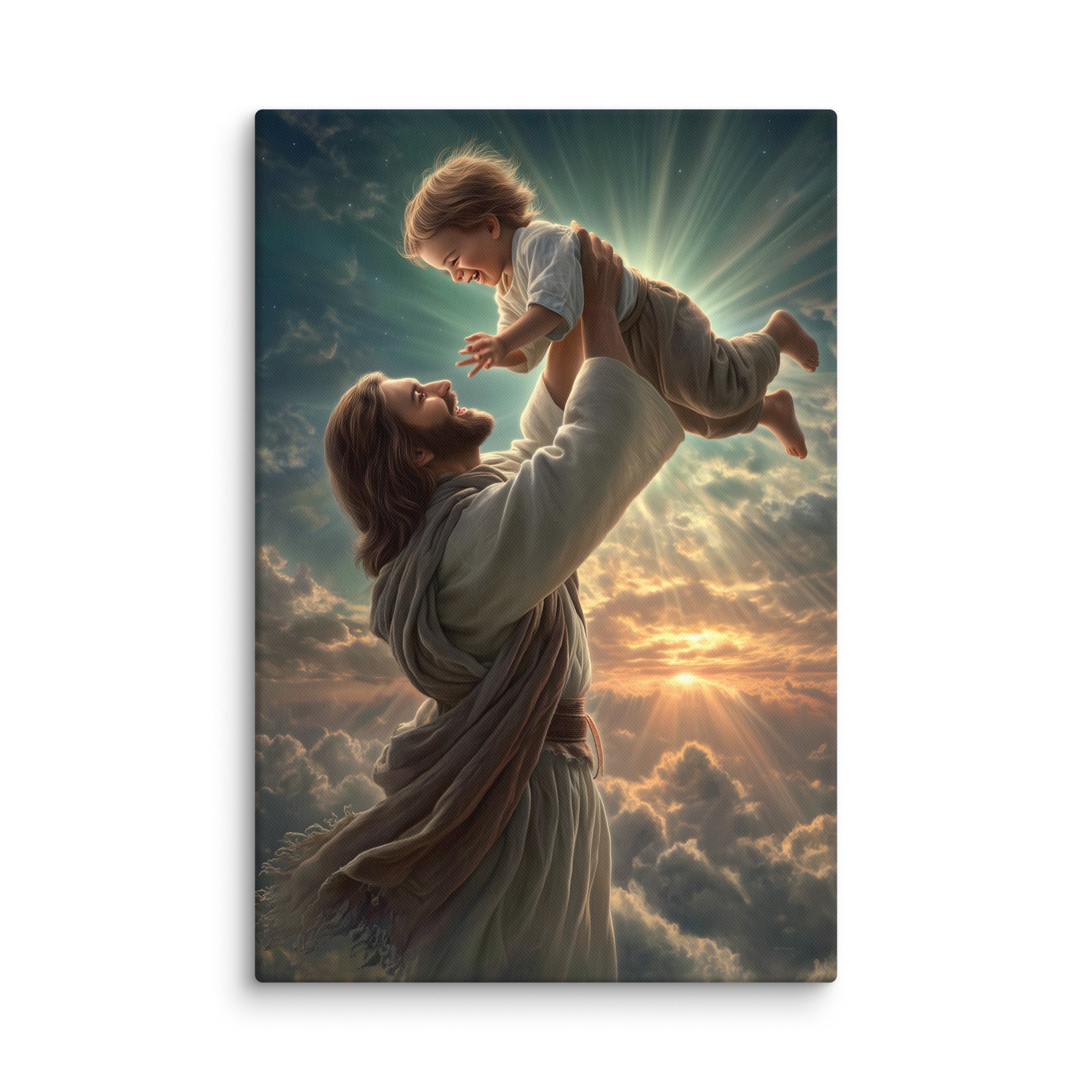 In this heart-warming scene, Jesus lifts a joyful child high into the heavenly light, His face glowing with pure delight as He watches the little one laugh without restraint. Soft rays burst through the clouds, surrounding them in warmth and wonder, as if all of heaven is celebrating this simple, perfect moment of love. The child’s laughter reflects the freedom and safety found only in the arms of the Savior, while Jesus’ radiant smile shows the depth of His affection for every soul.
