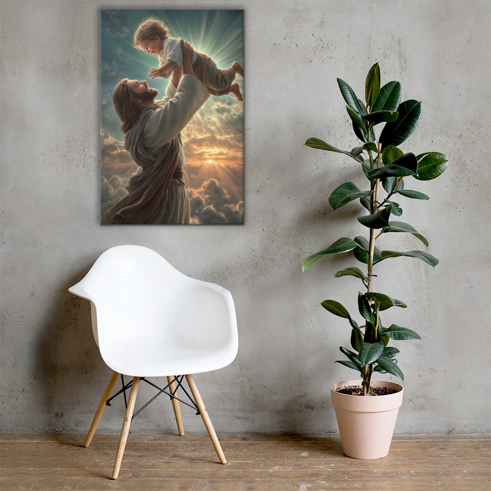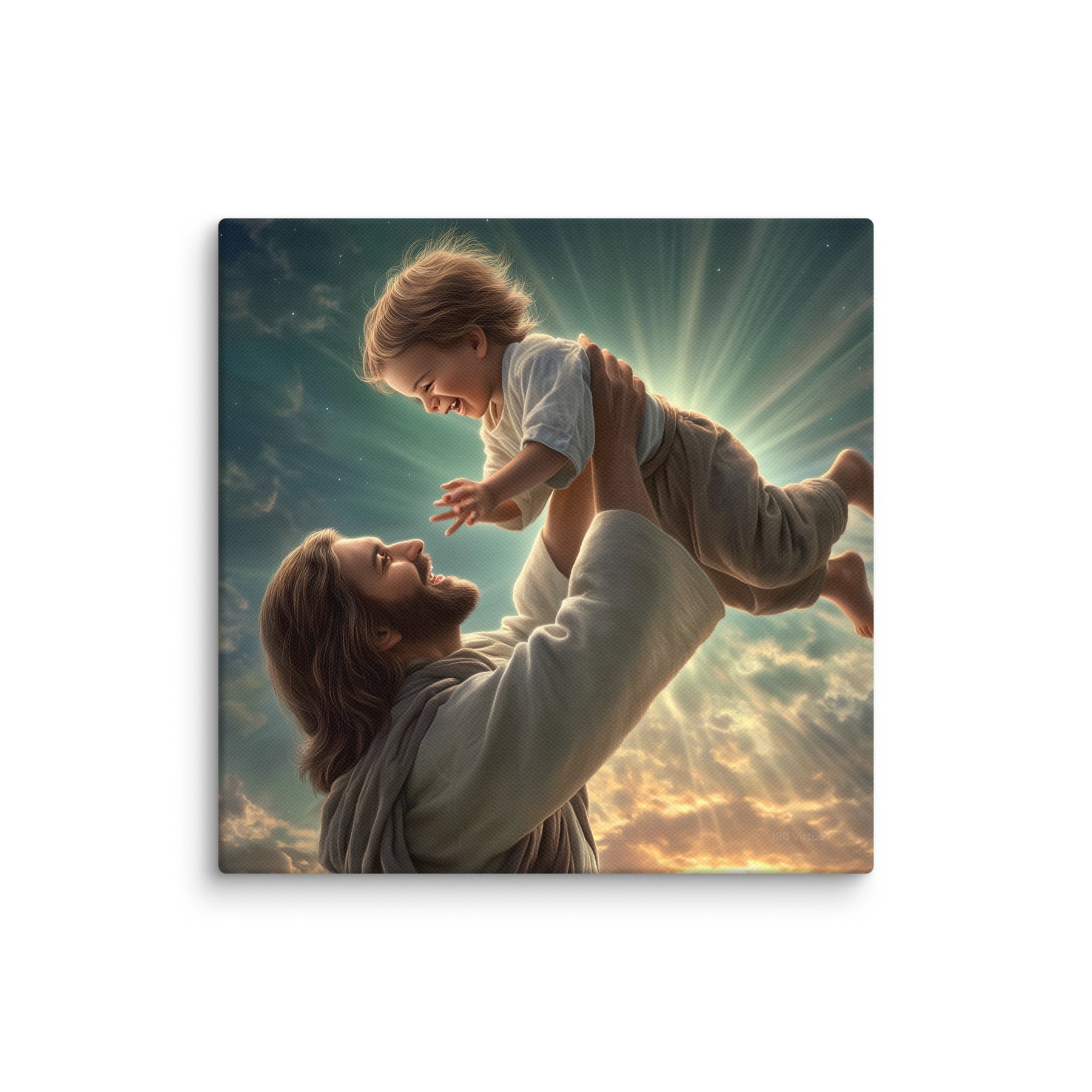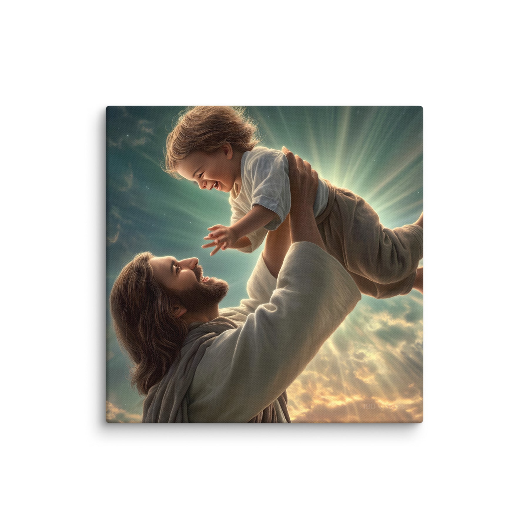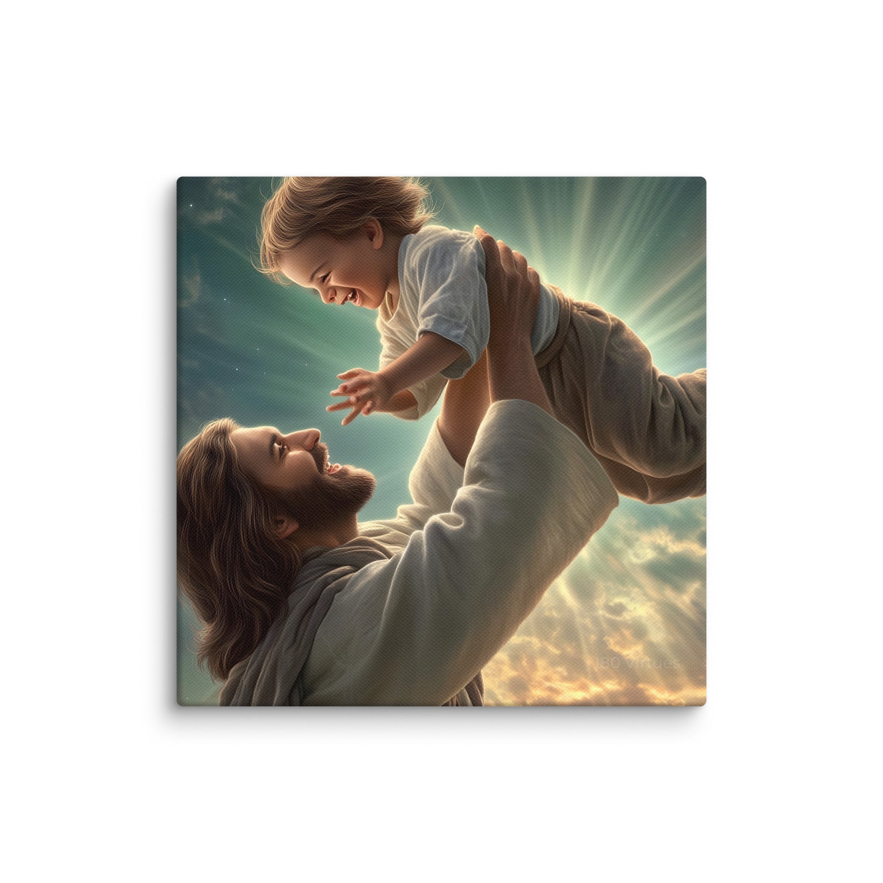 In this heart-warming scene, Jesus lifts a joyful child high into the heavenly light, His face glowing with pure delight as He watches the little one laugh without restraint. Soft rays burst through the clouds, surrounding them in warmth and wonder, as if all of heaven is celebrating this simple, perfect moment of love. The child’s laughter reflects the freedom and safety found only in the arms of the Savior, while Jesus’ radiant smile shows the depth of His affection for every soul.