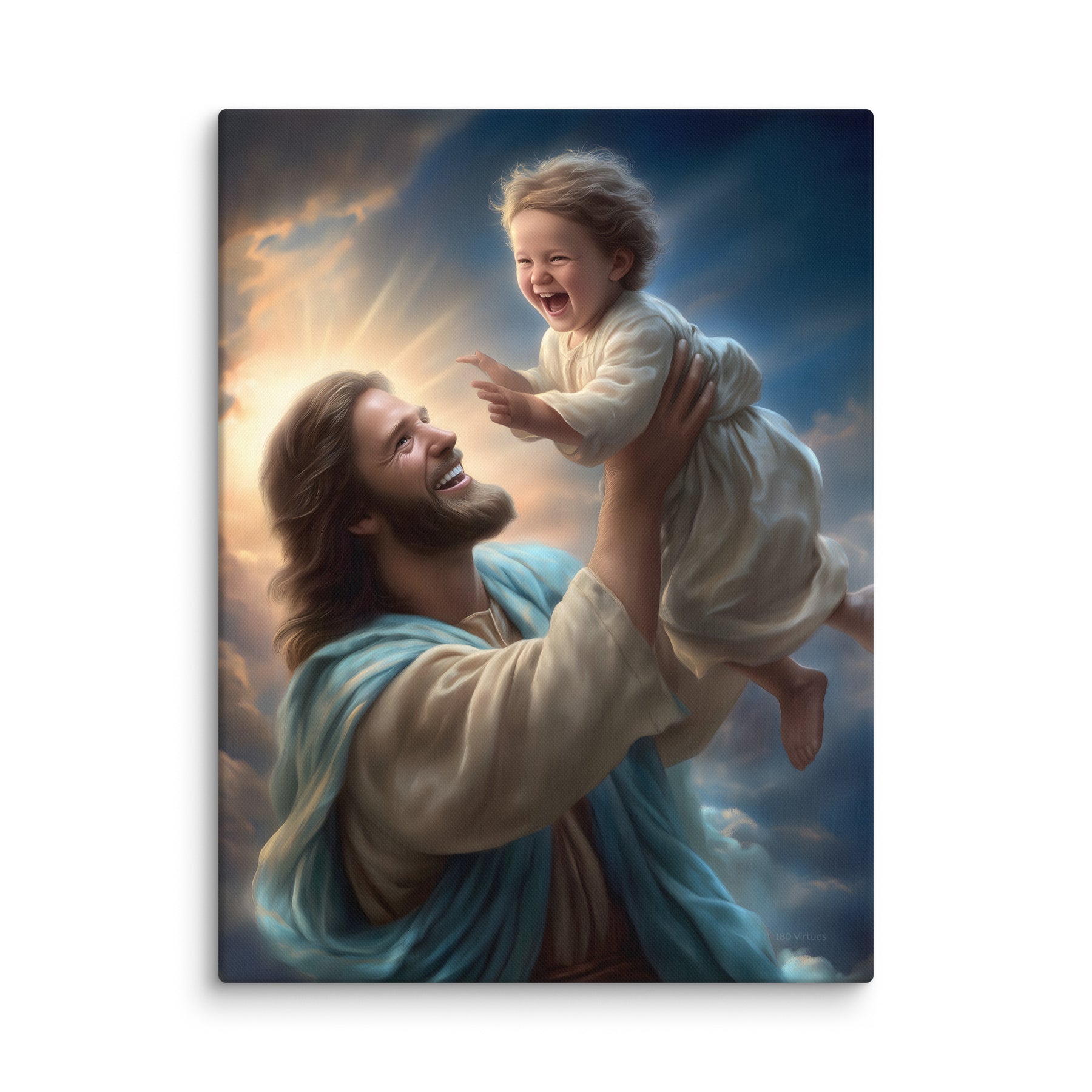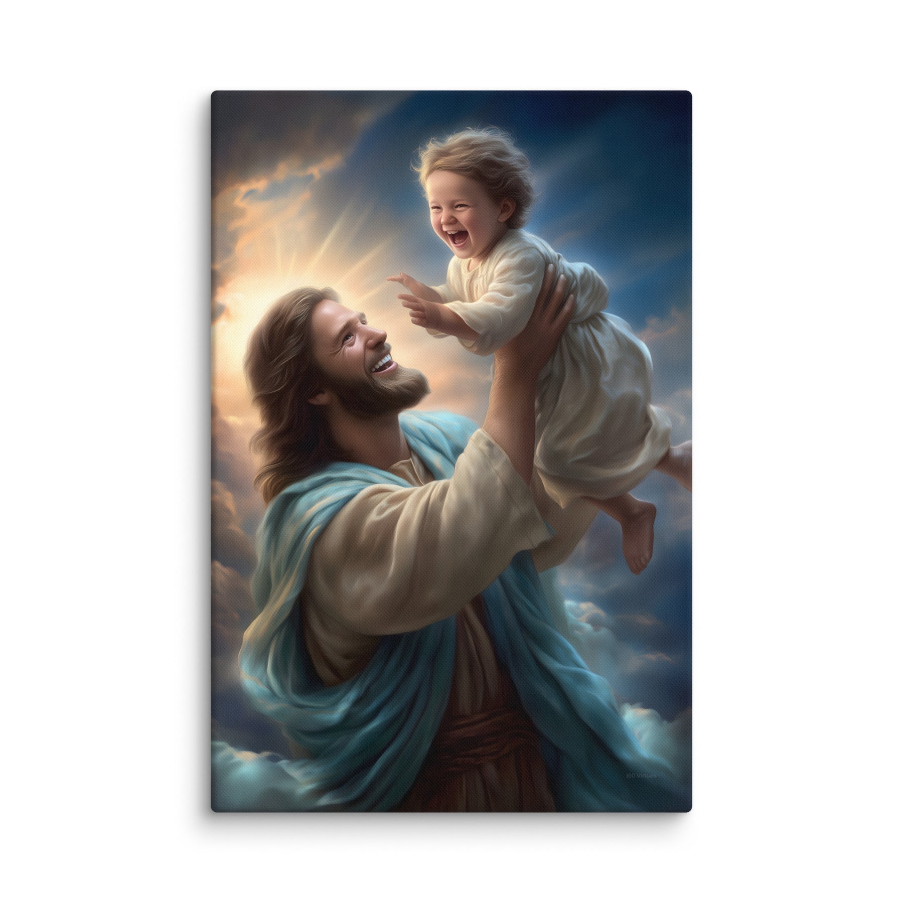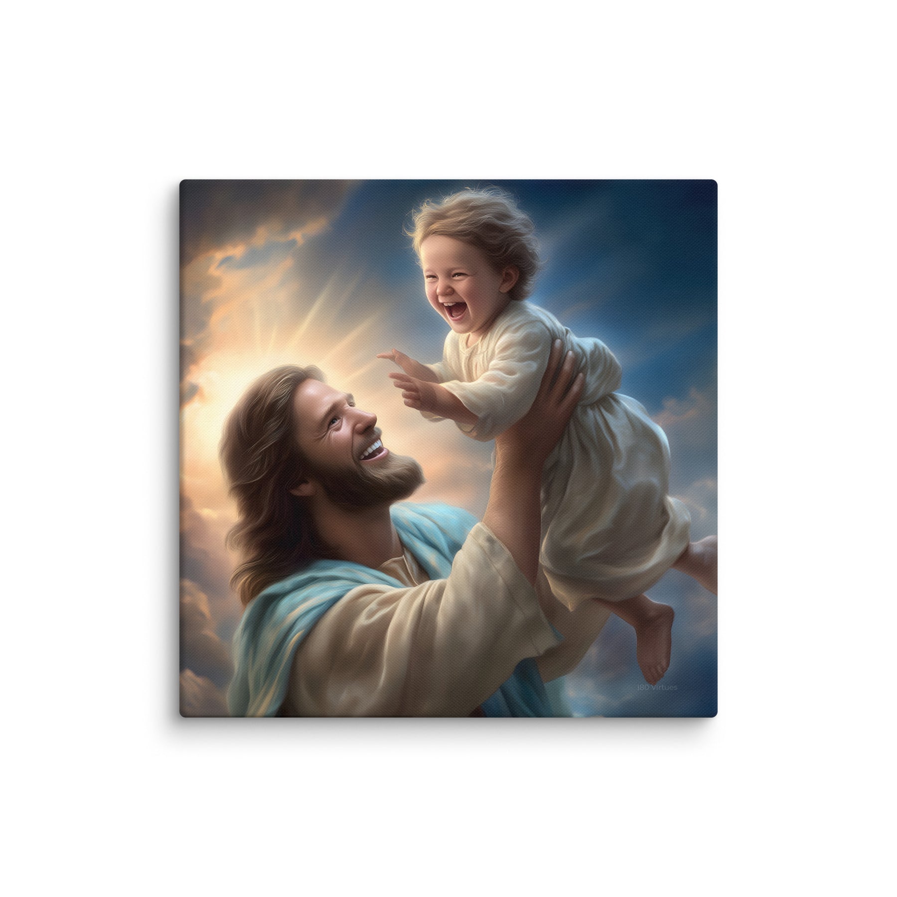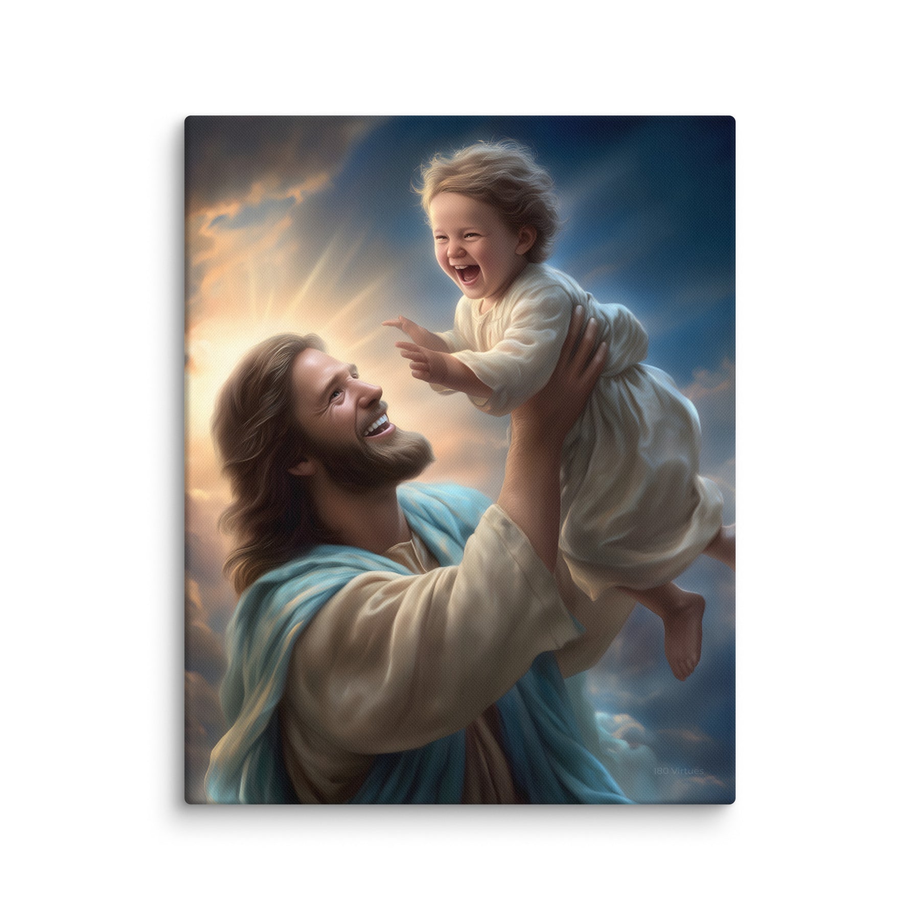 In this heart-melting moment, Jesus lifts a laughing child high into the warm glow of heaven’s light, His own face overflowing with pure joy. The child’s contagious laughter fills the sky as soft rays of gold break through the clouds around them, highlighting the tender delight the Savior takes in each of His little ones. Everything in this scene radiates warmth, love, and unshakable safety—the kind of joy that can only come from being held by the One who knows and cherishes us completely.