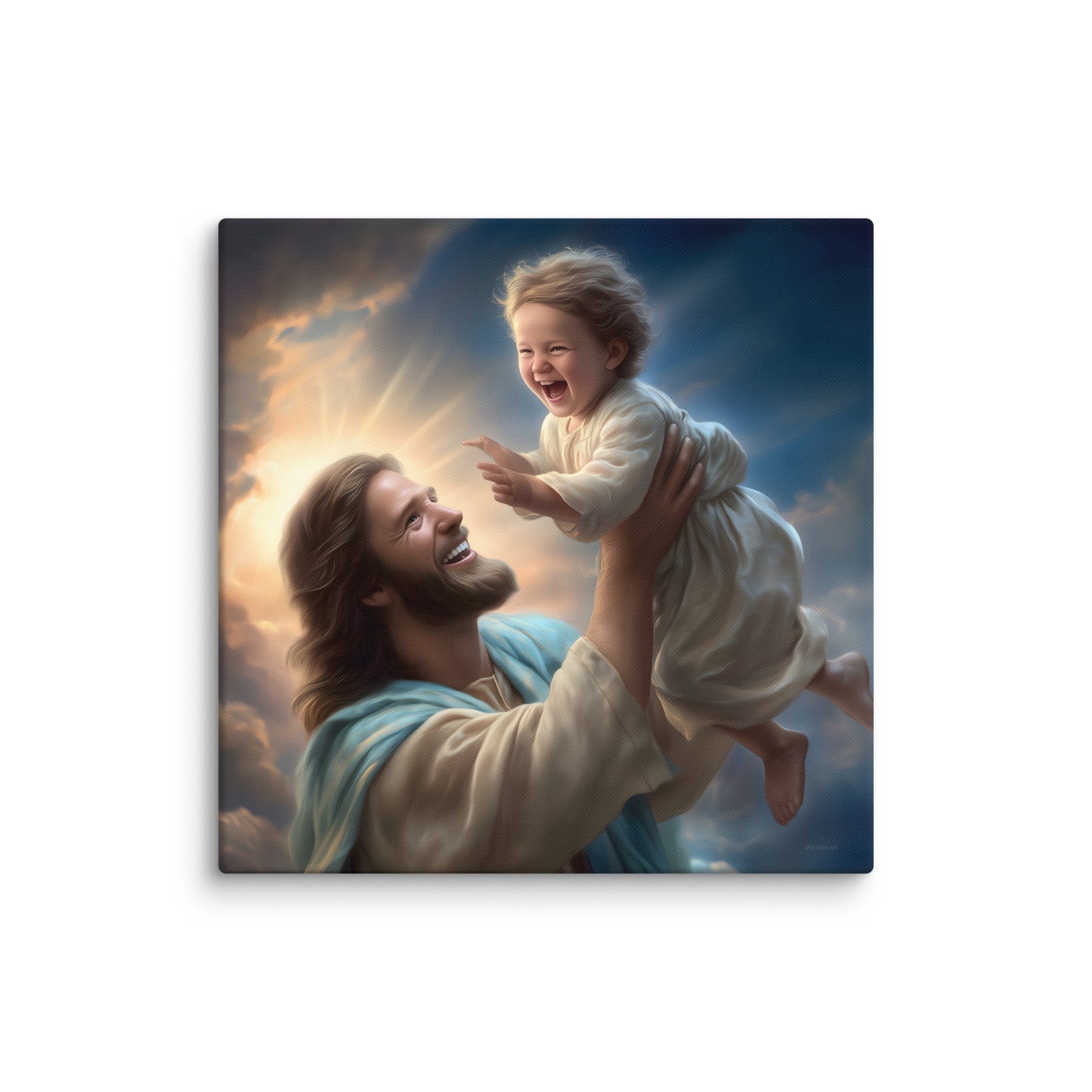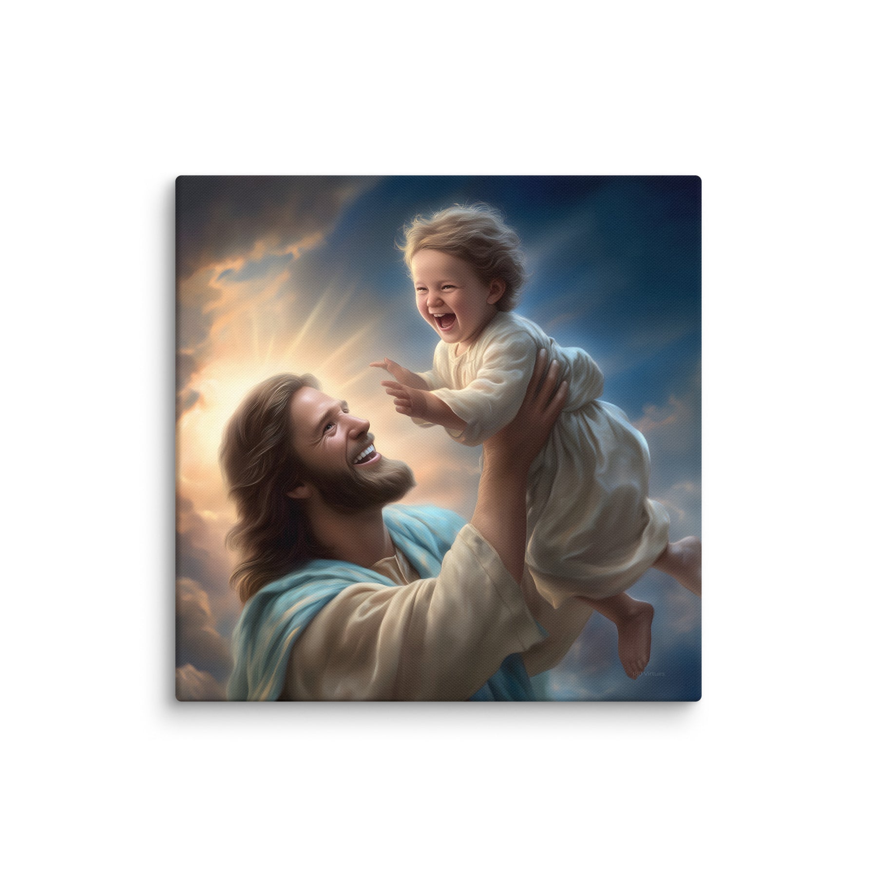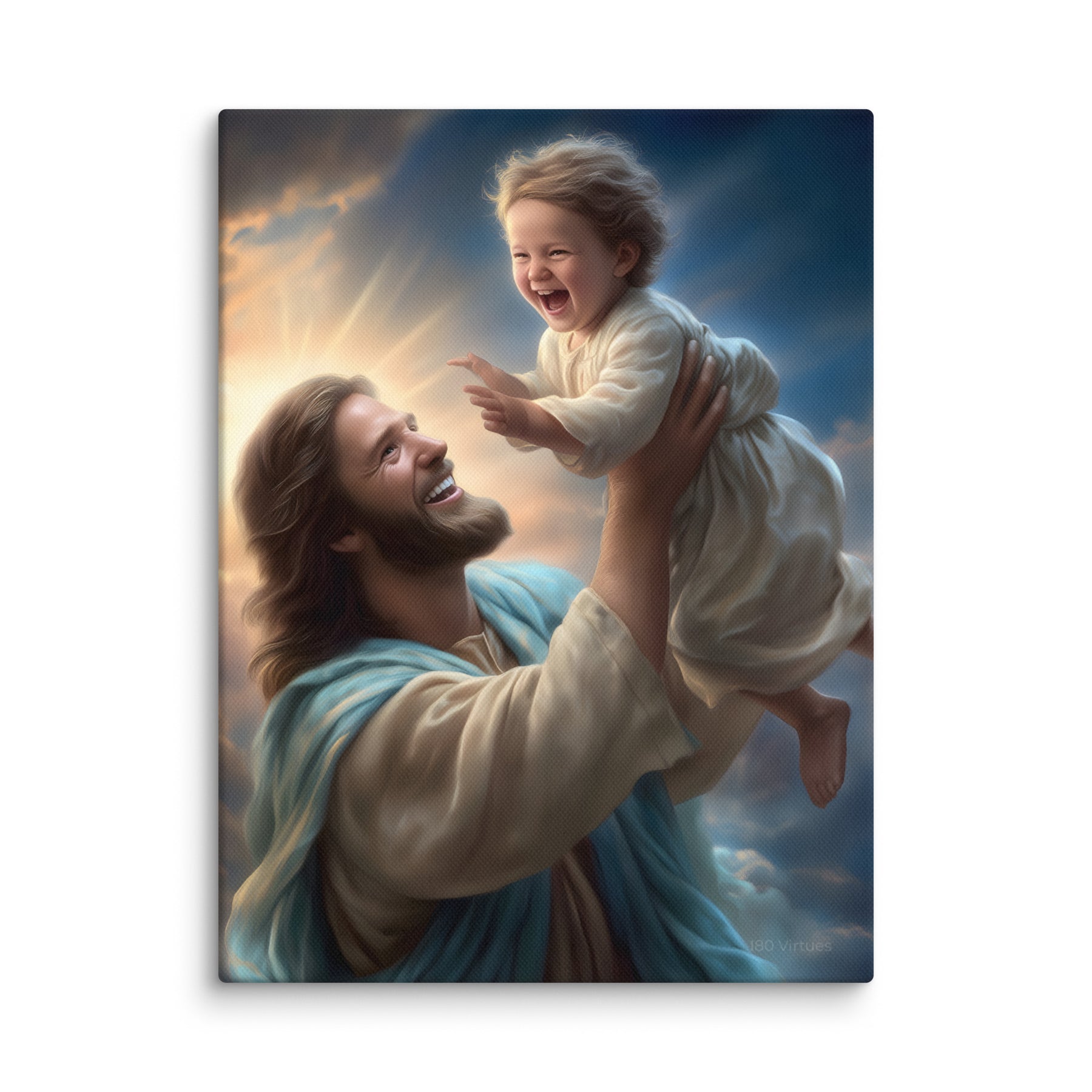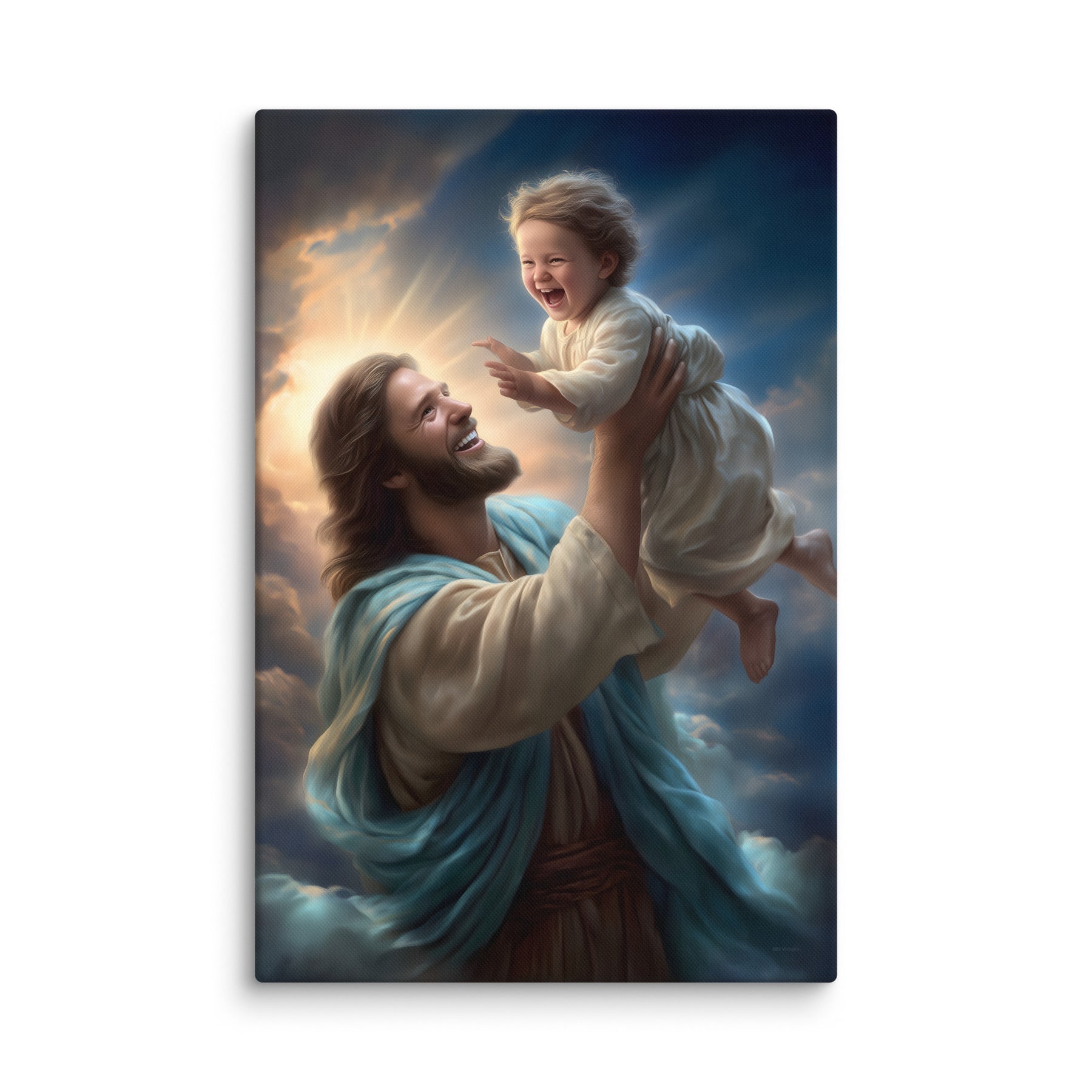 In this heart-melting moment, Jesus lifts a laughing child high into the warm glow of heaven’s light, His own face overflowing with pure joy. The child’s contagious laughter fills the sky as soft rays of gold break through the clouds around them, highlighting the tender delight the Savior takes in each of His little ones. Everything in this scene radiates warmth, love, and unshakable safety—the kind of joy that can only come from being held by the One who knows and cherishes us completely.