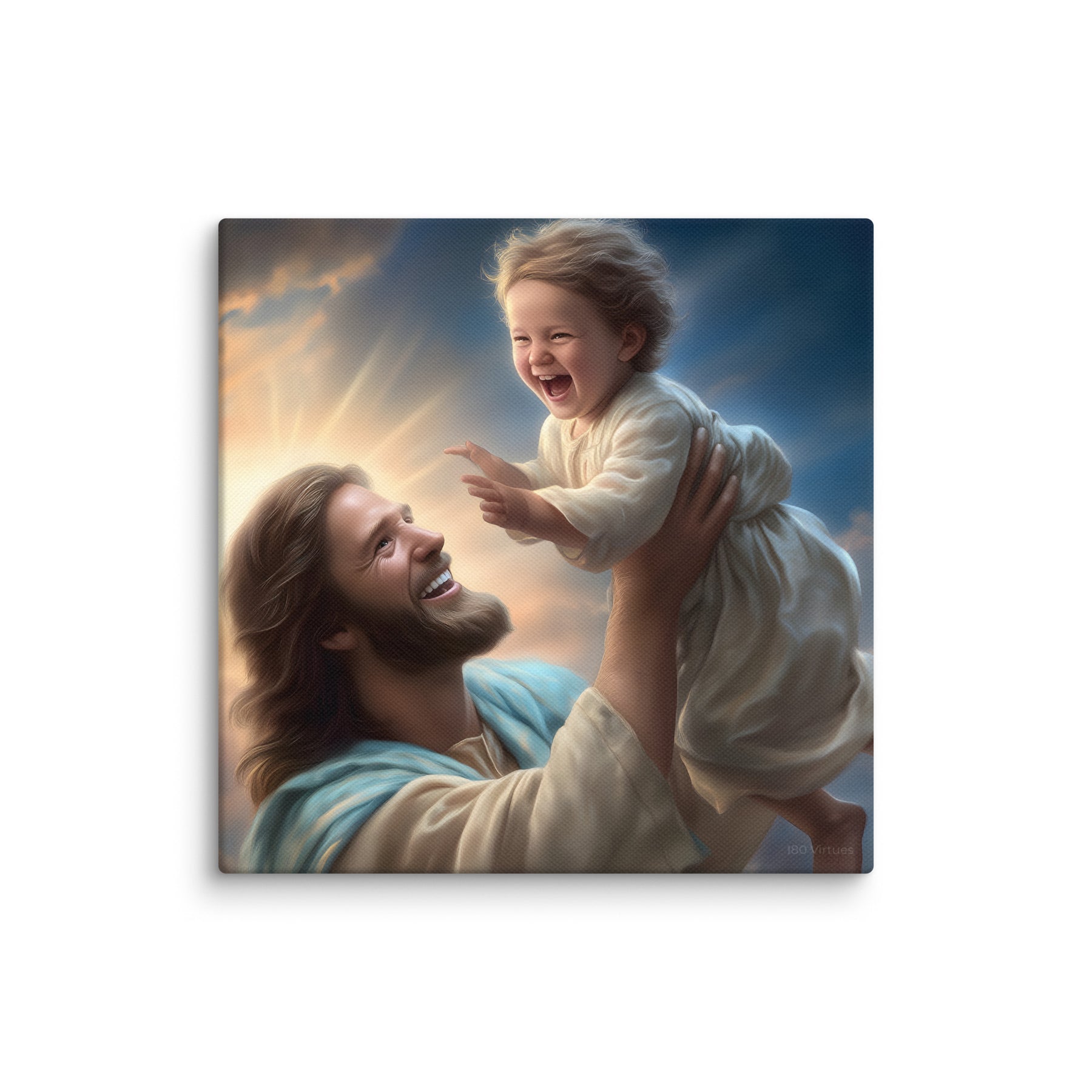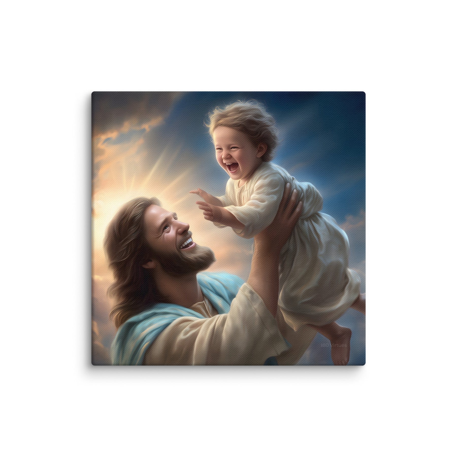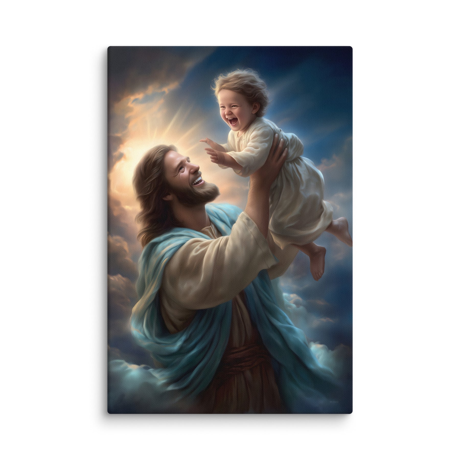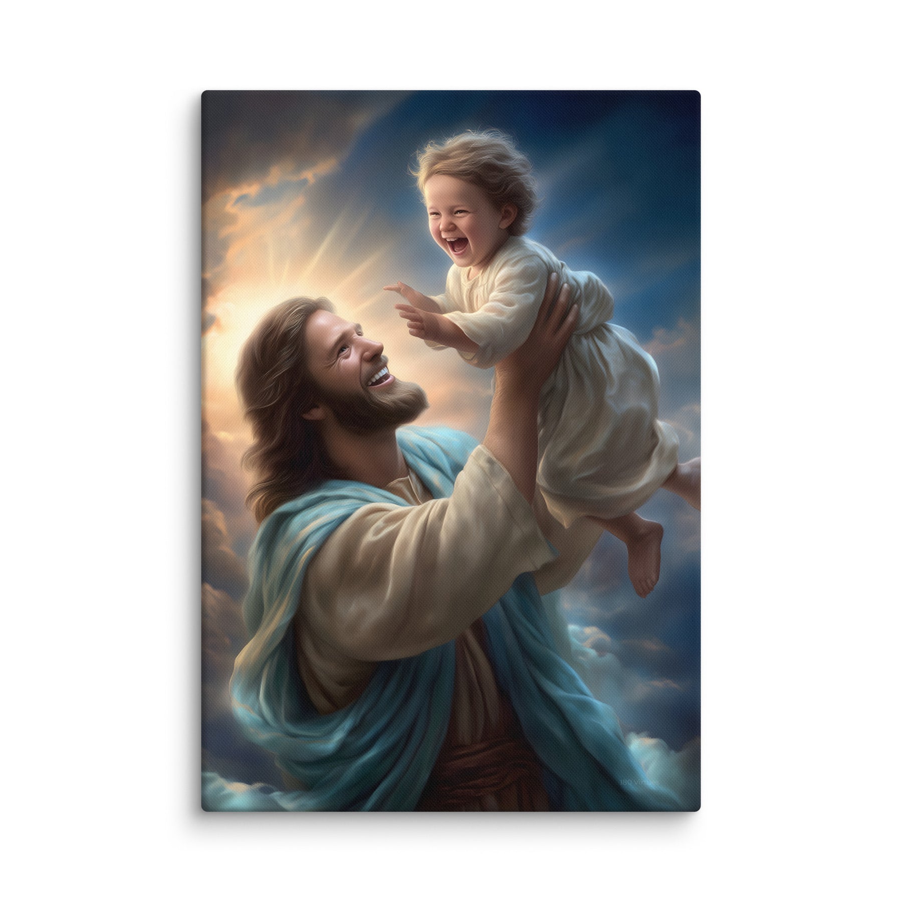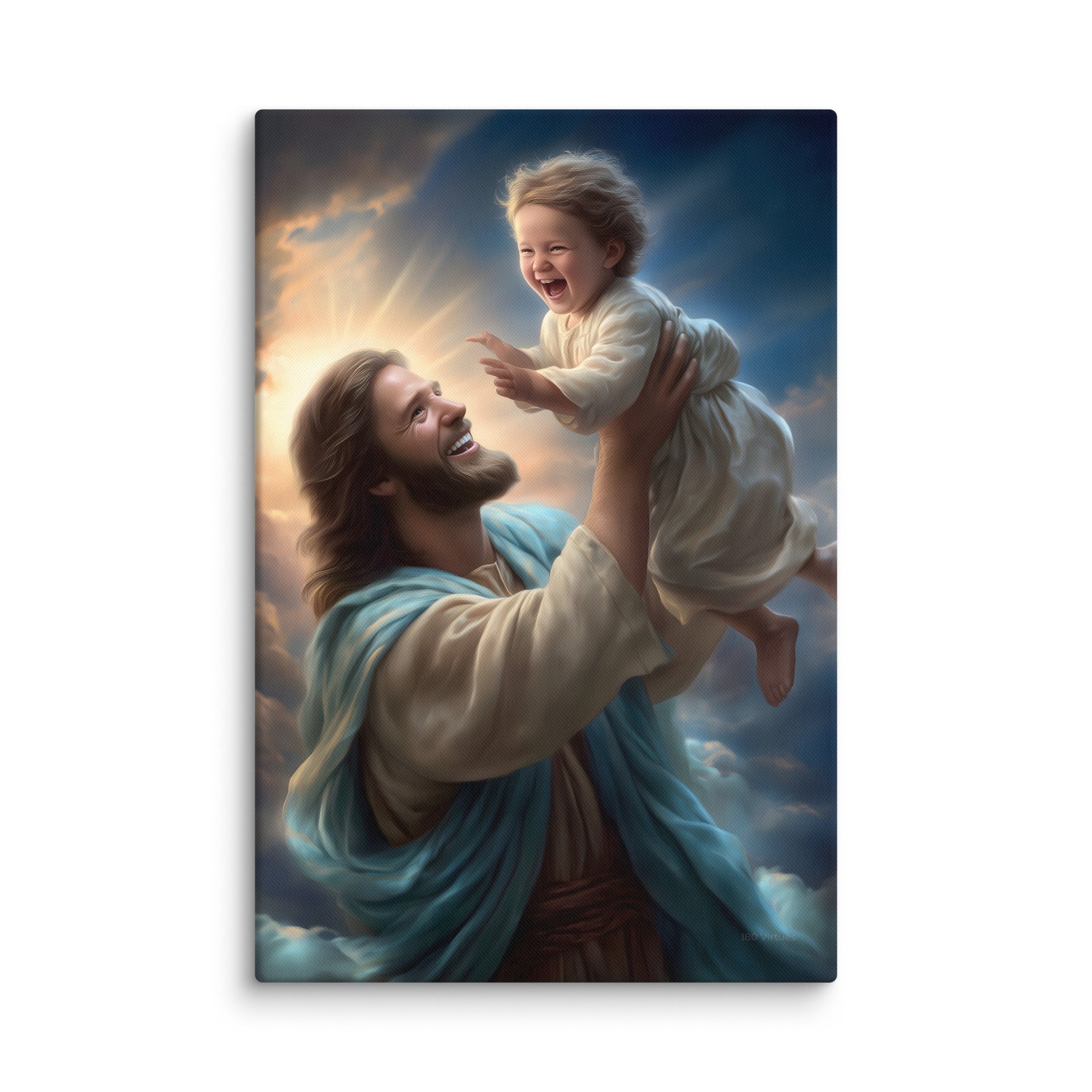 In this heart-melting moment, Jesus lifts a laughing child high into the warm glow of heaven’s light, His own face overflowing with pure joy. The child’s contagious laughter fills the sky as soft rays of gold break through the clouds around them, highlighting the tender delight the Savior takes in each of His little ones. Everything in this scene radiates warmth, love, and unshakable safety—the kind of joy that can only come from being held by the One who knows and cherishes us completely.