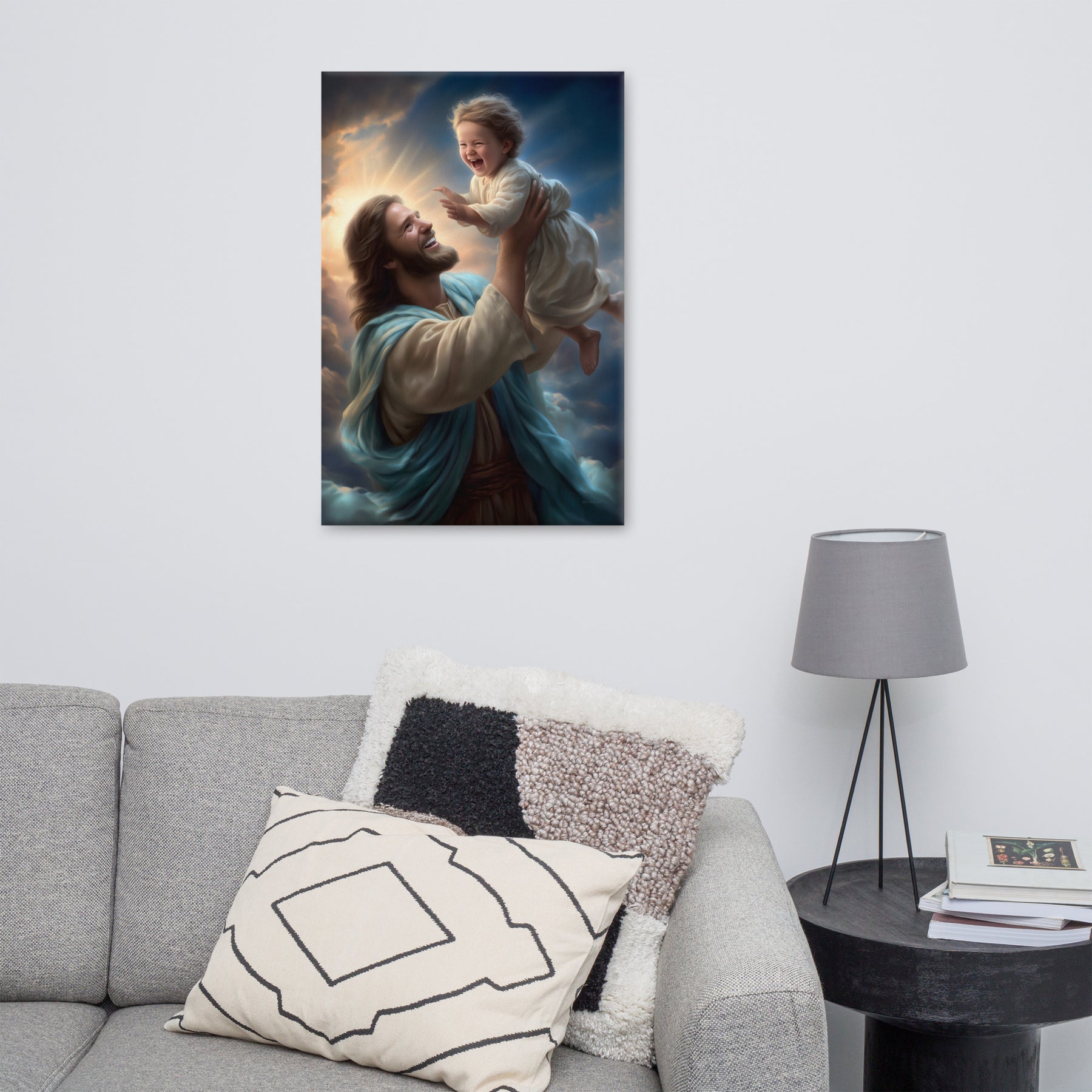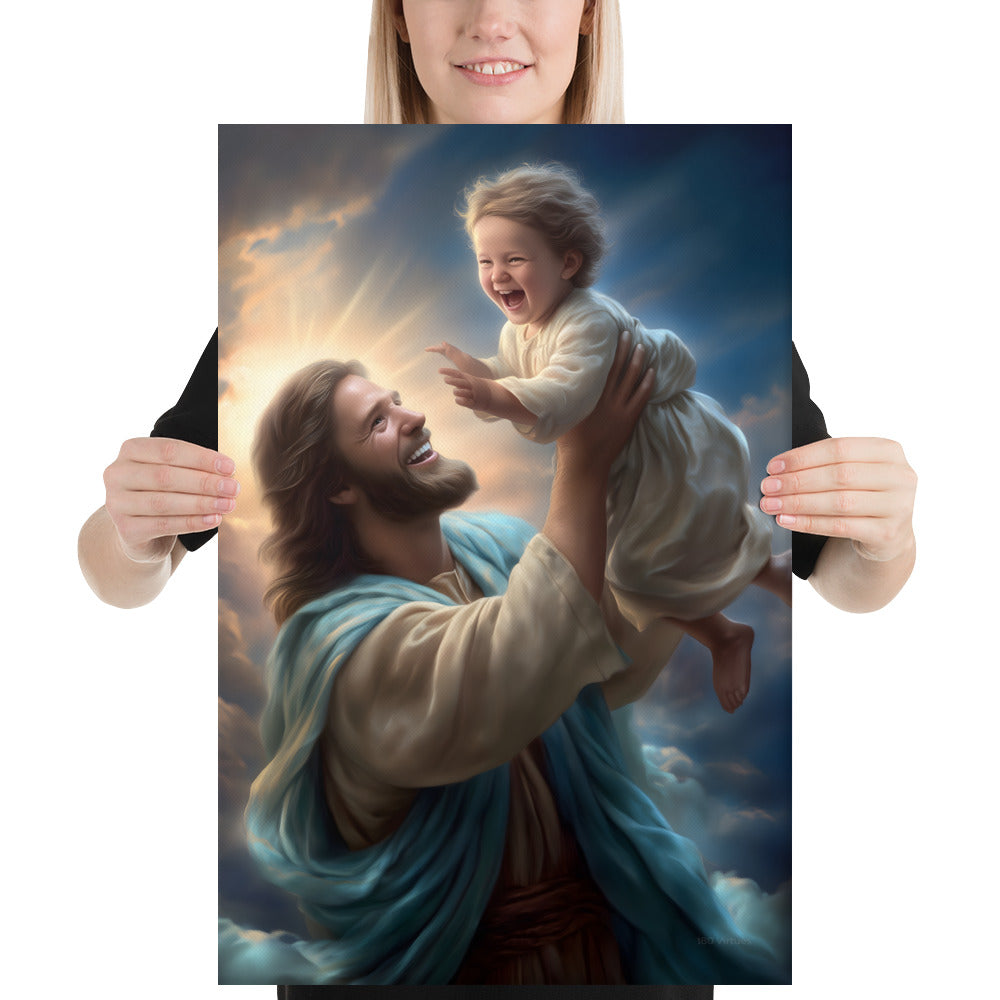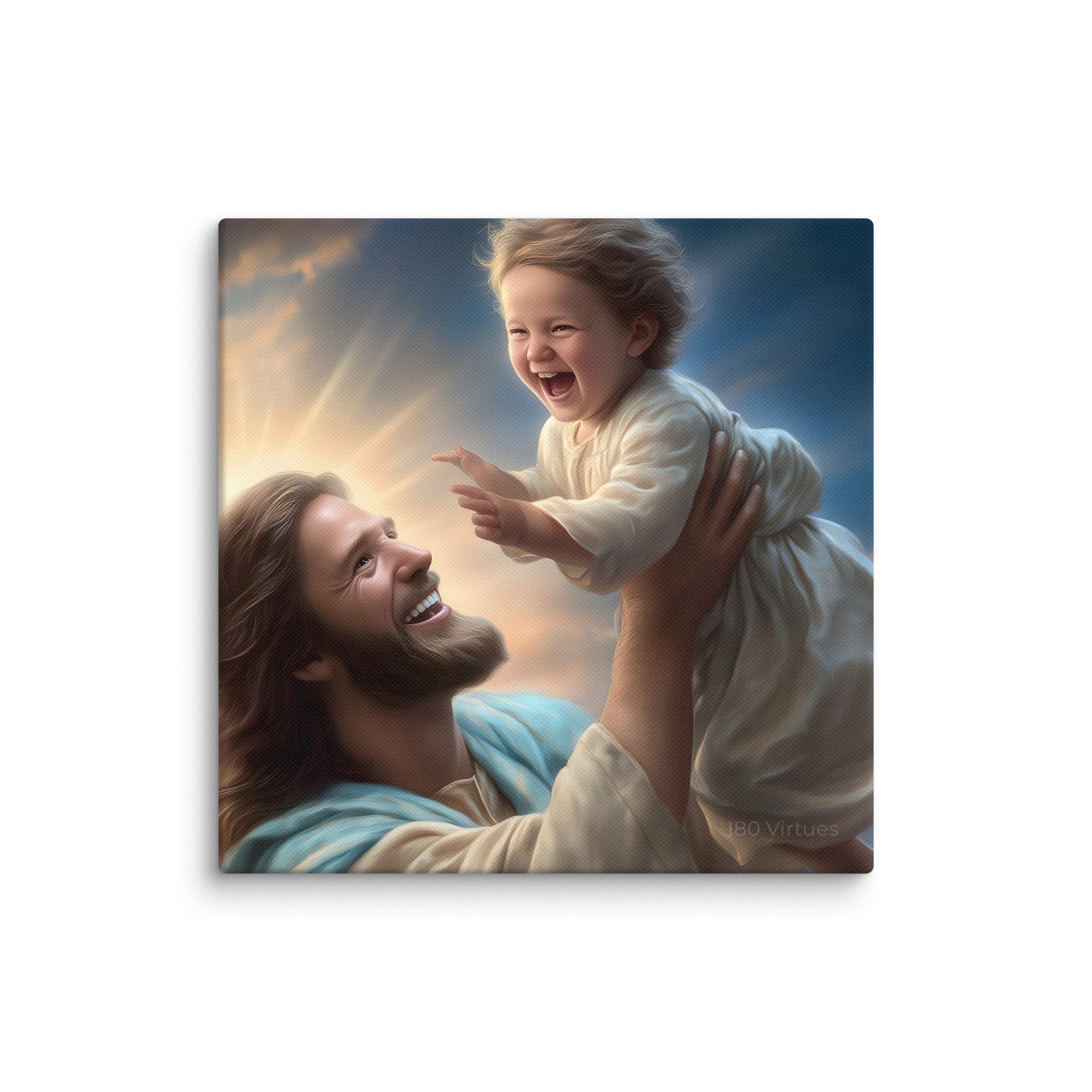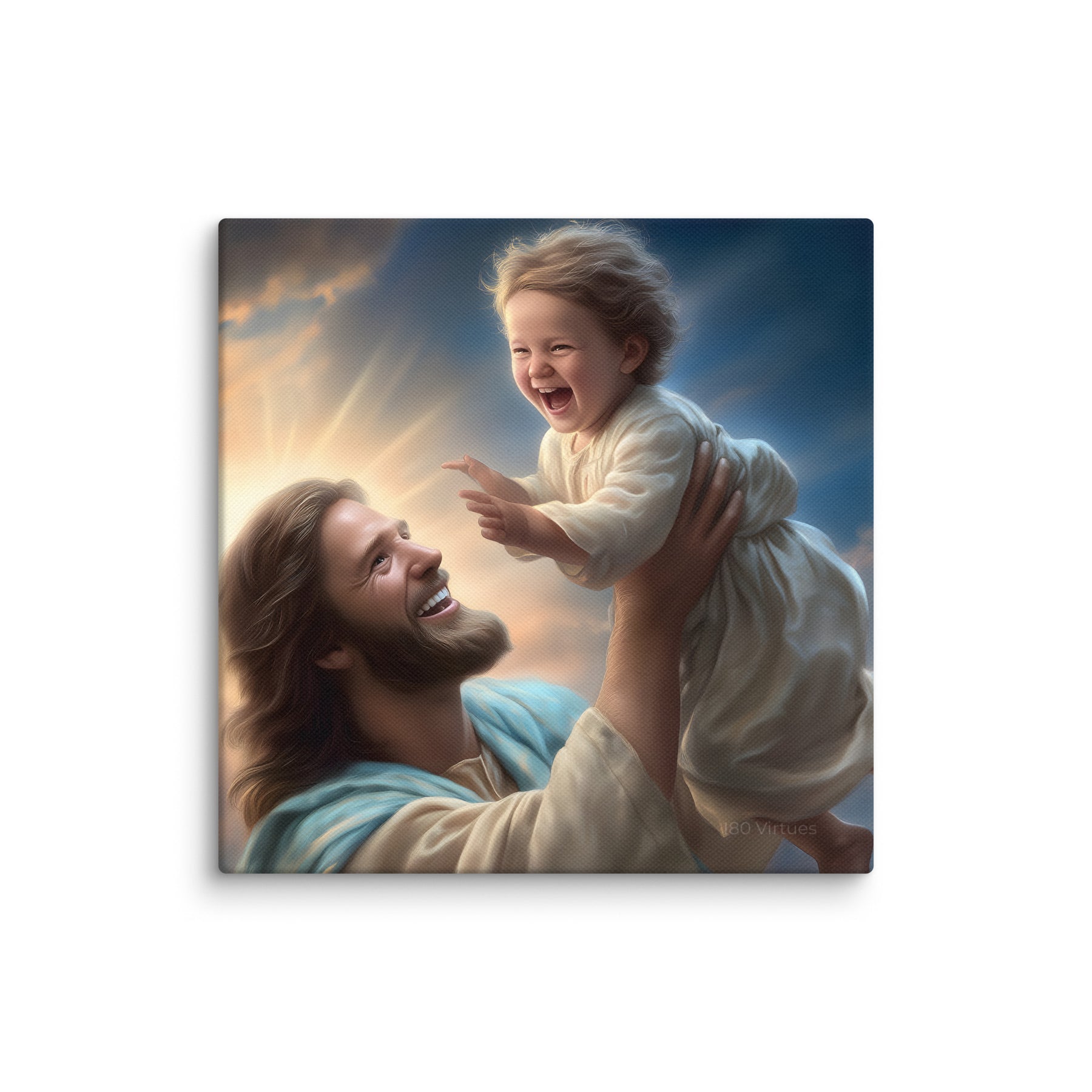 In this heart-melting moment, Jesus lifts a laughing child high into the warm glow of heaven’s light, His own face overflowing with pure joy. The child’s contagious laughter fills the sky as soft rays of gold break through the clouds around them, highlighting the tender delight the Savior takes in each of His little ones. Everything in this scene radiates warmth, love, and unshakable safety—the kind of joy that can only come from being held by the One who knows and cherishes us completely.