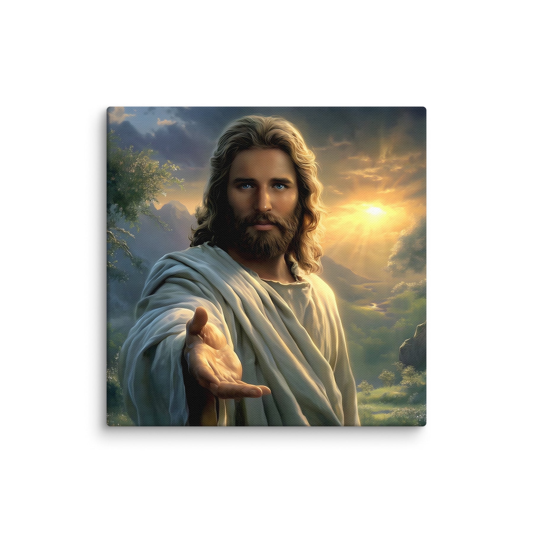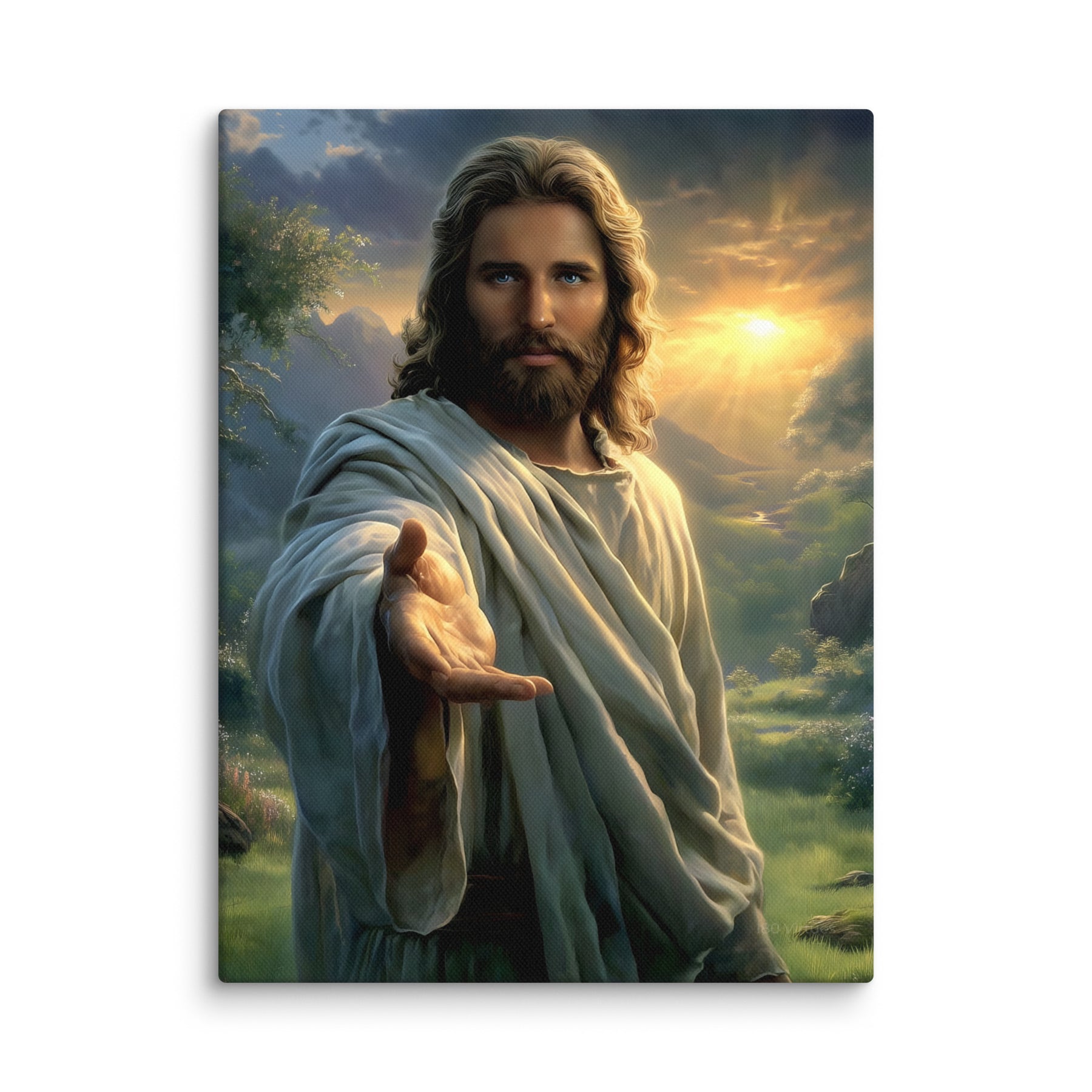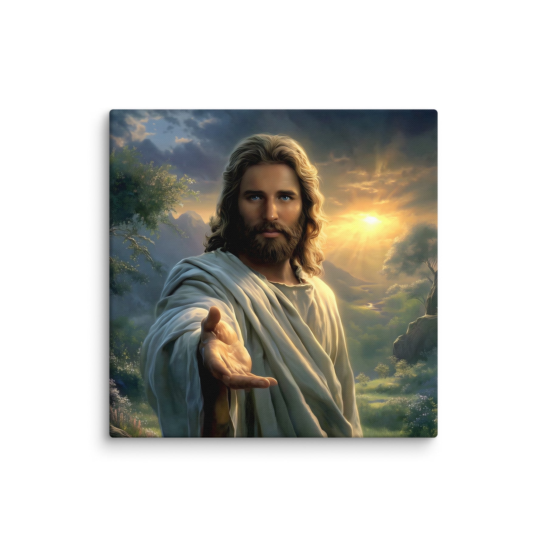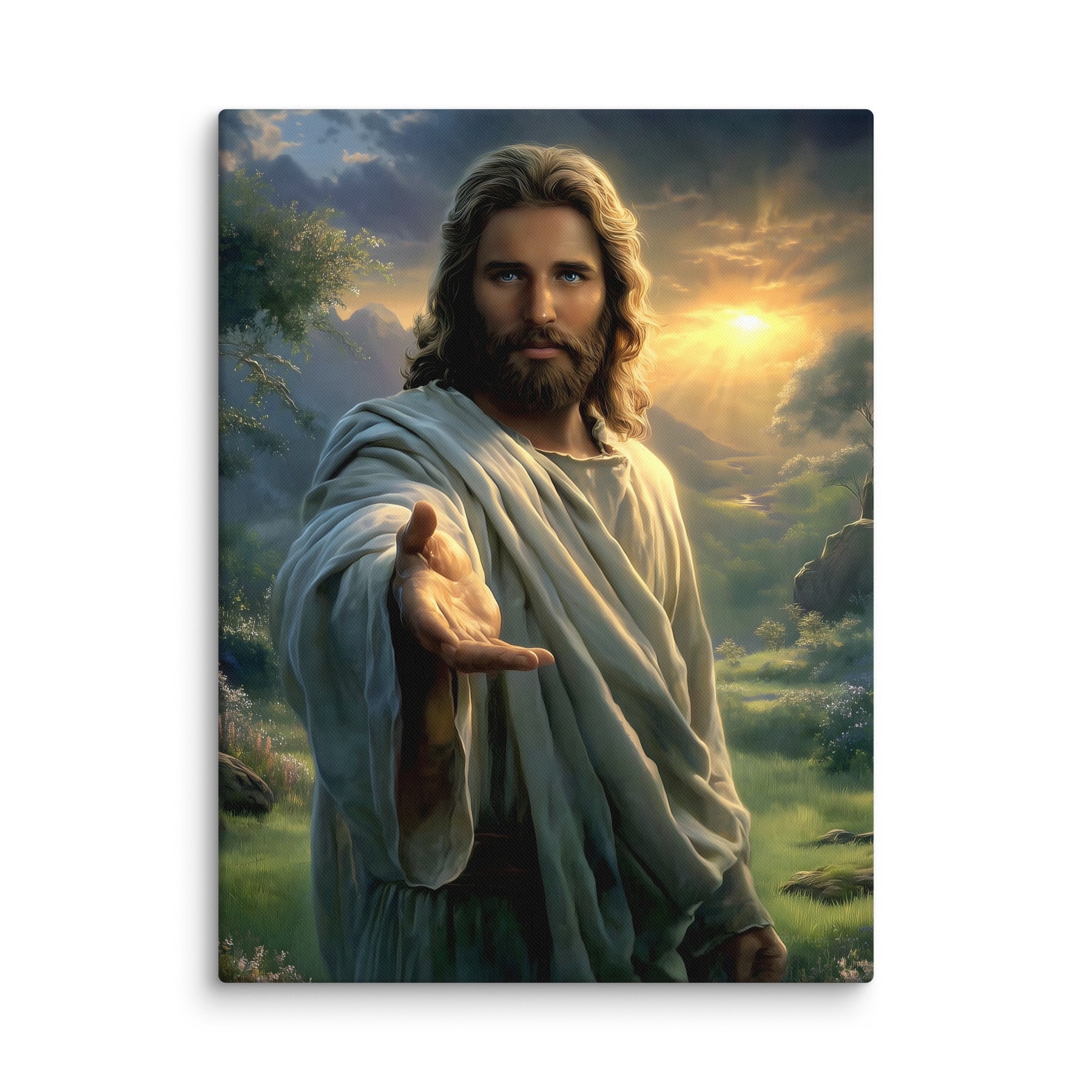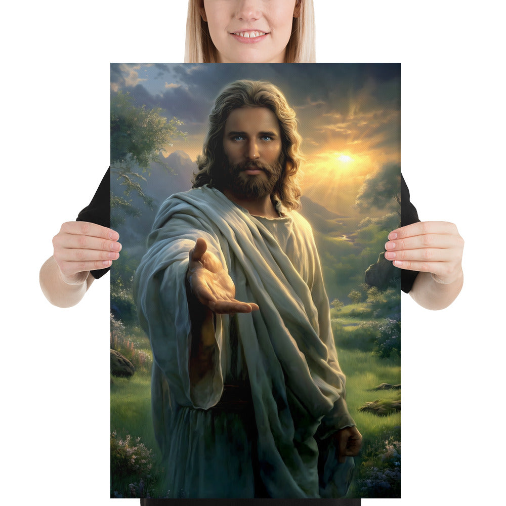 Every detail is crafted to inspire. The warm sunlight breaking through the clouds, the soft movement in His robes, and the serene landscape surrounding Him create an atmosphere of peace and divine presence. This canvas is a powerful reminder that no matter where you are or what you face, Christ is near—inviting you to walk with Him, trust Him, and find rest in Him.