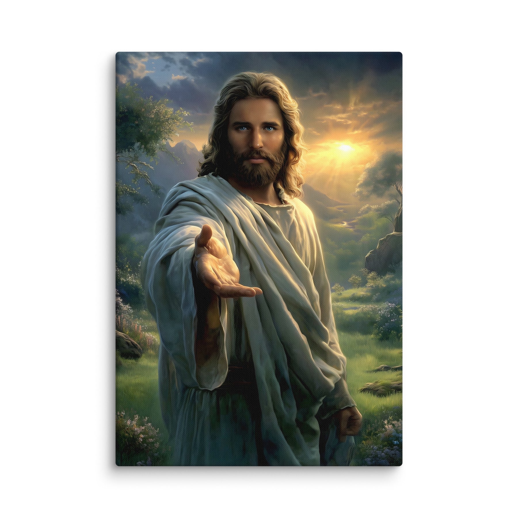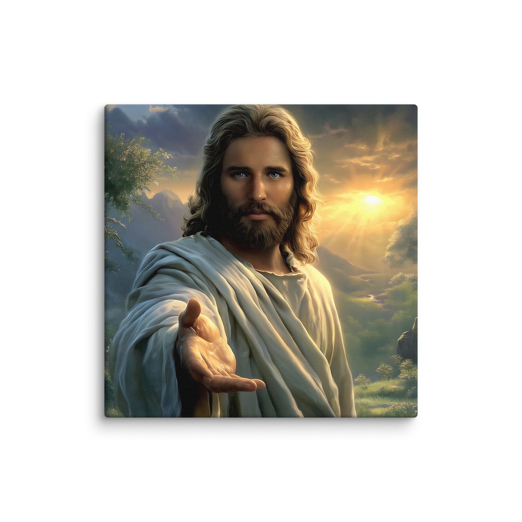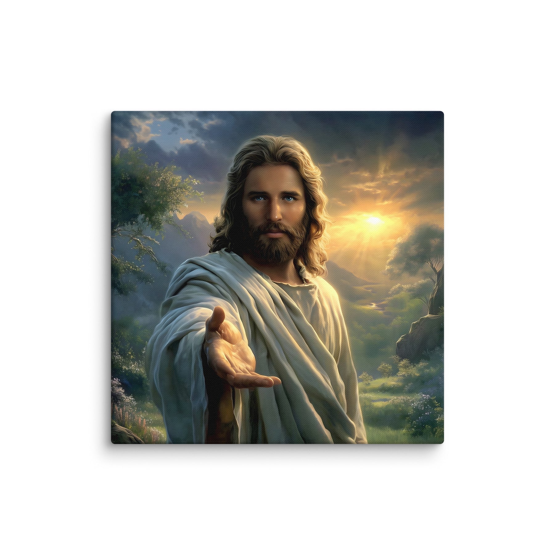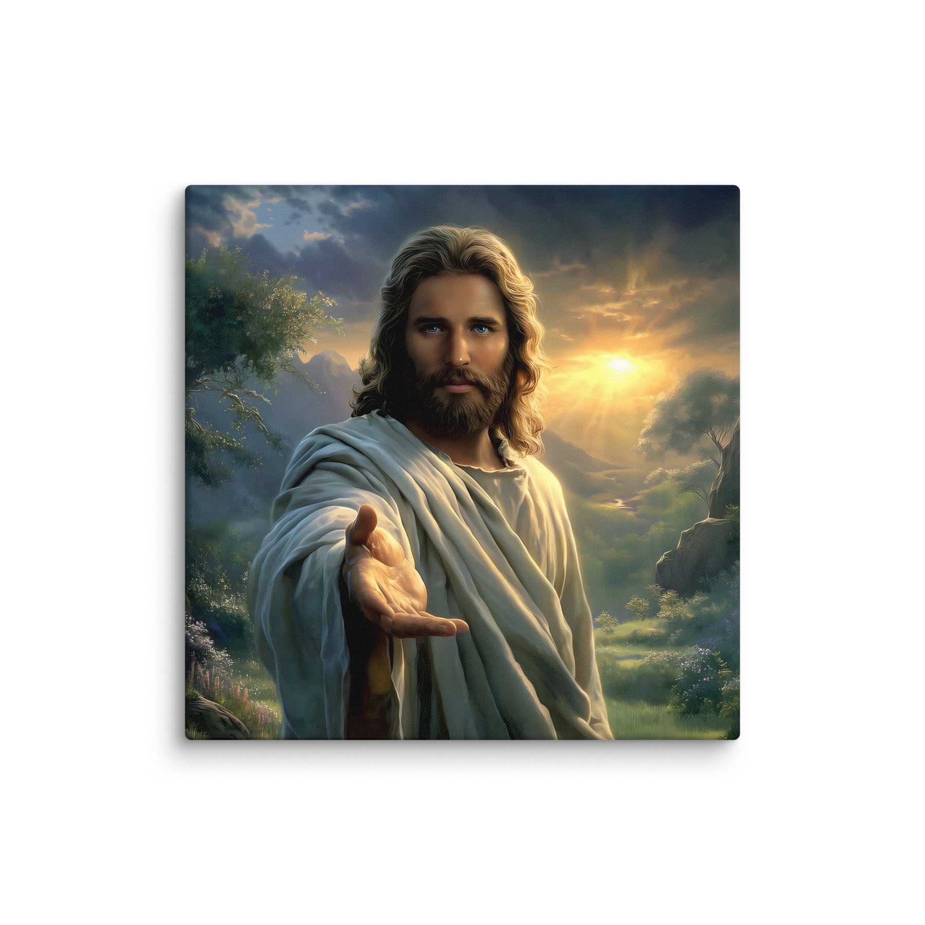 Every detail is crafted to inspire. The warm sunlight breaking through the clouds, the soft movement in His robes, and the serene landscape surrounding Him create an atmosphere of peace and divine presence. This canvas is a powerful reminder that no matter where you are or what you face, Christ is near—inviting you to walk with Him, trust Him, and find rest in Him.