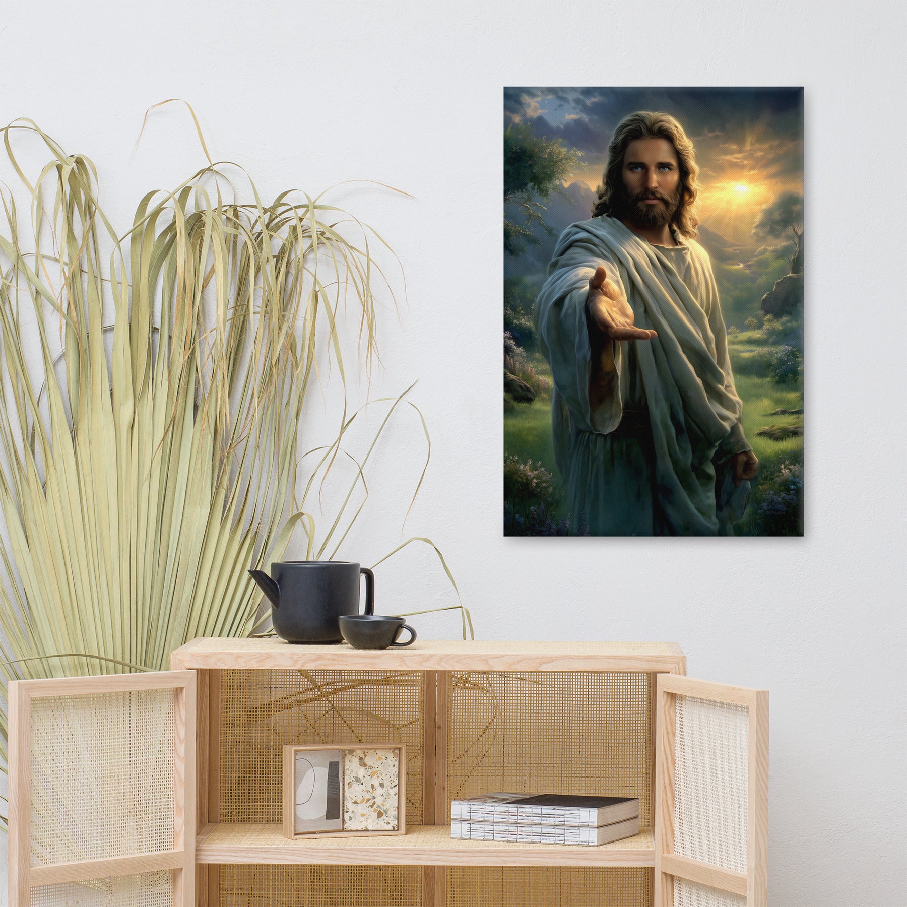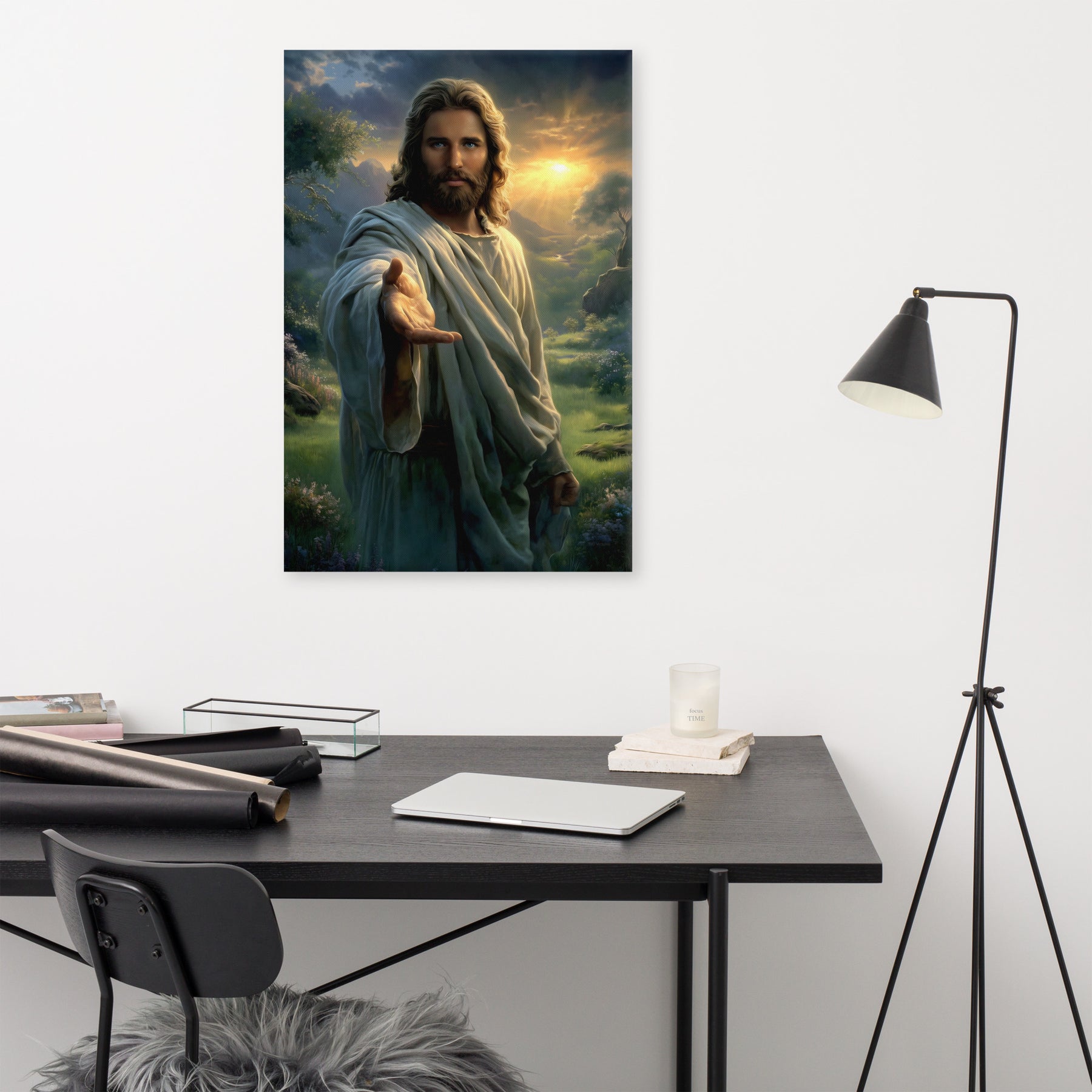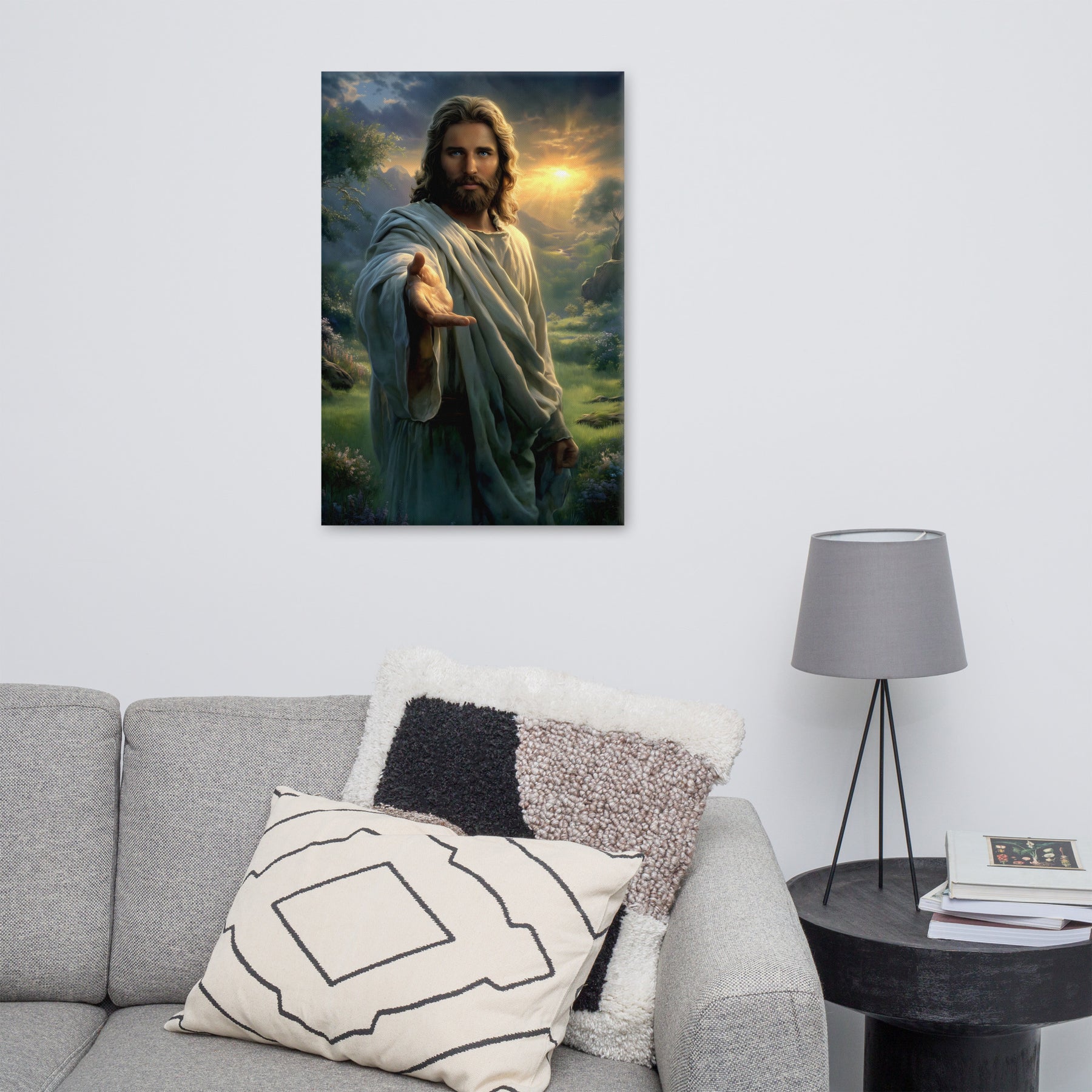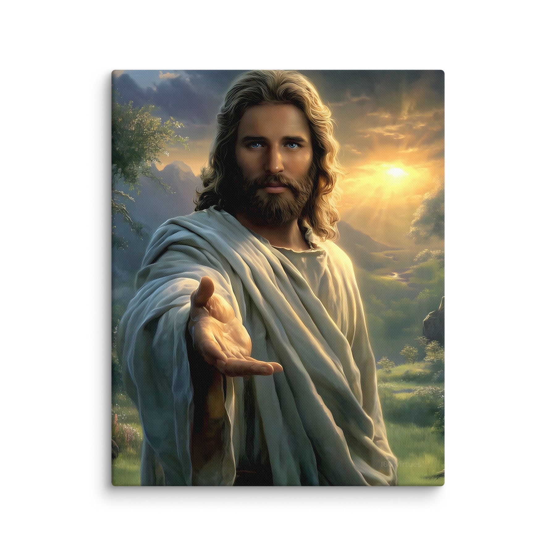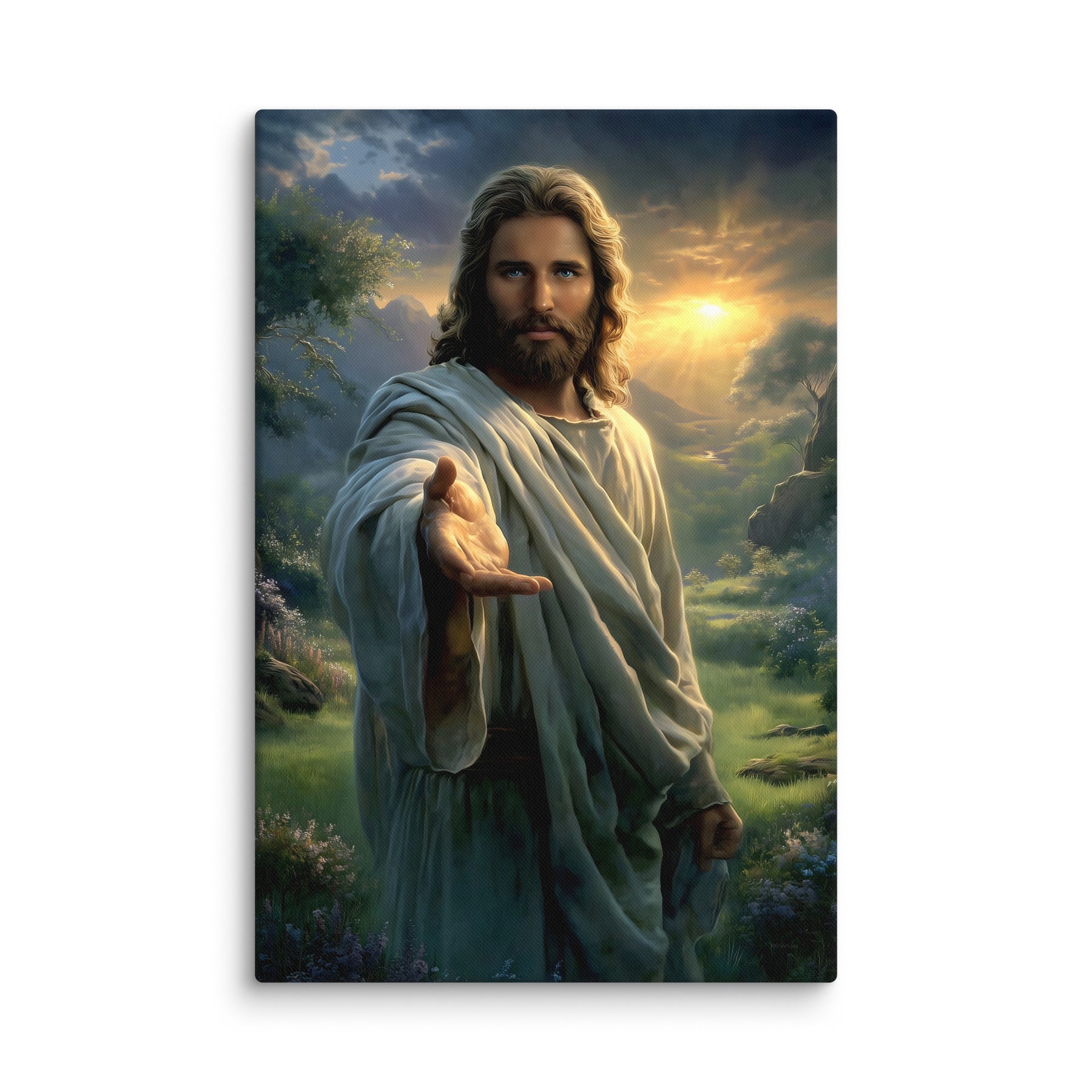 Every detail is crafted to inspire. The warm sunlight breaking through the clouds, the soft movement in His robes, and the serene landscape surrounding Him create an atmosphere of peace and divine presence. This canvas is a powerful reminder that no matter where you are or what you face, Christ is near—inviting you to walk with Him, trust Him, and find rest in Him.