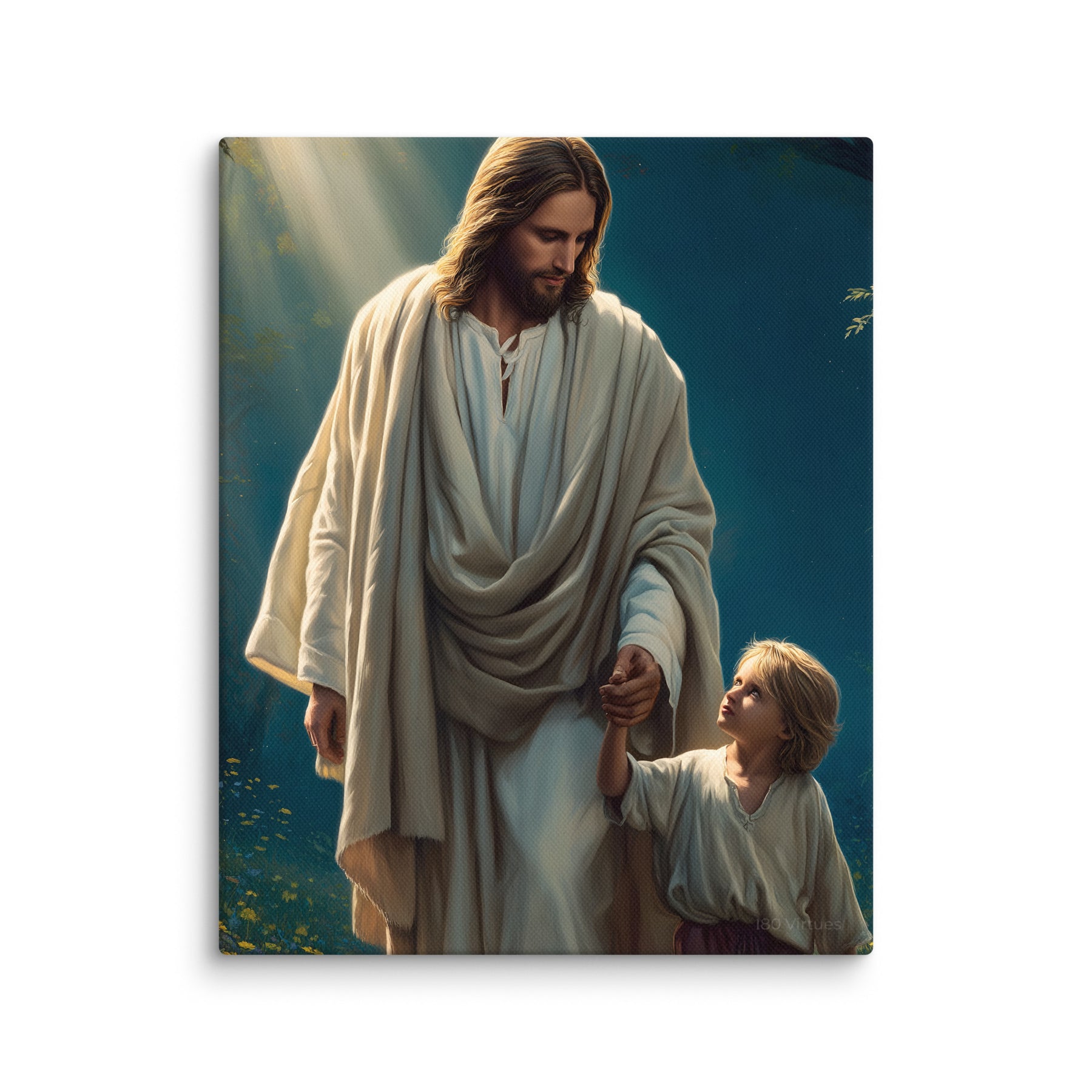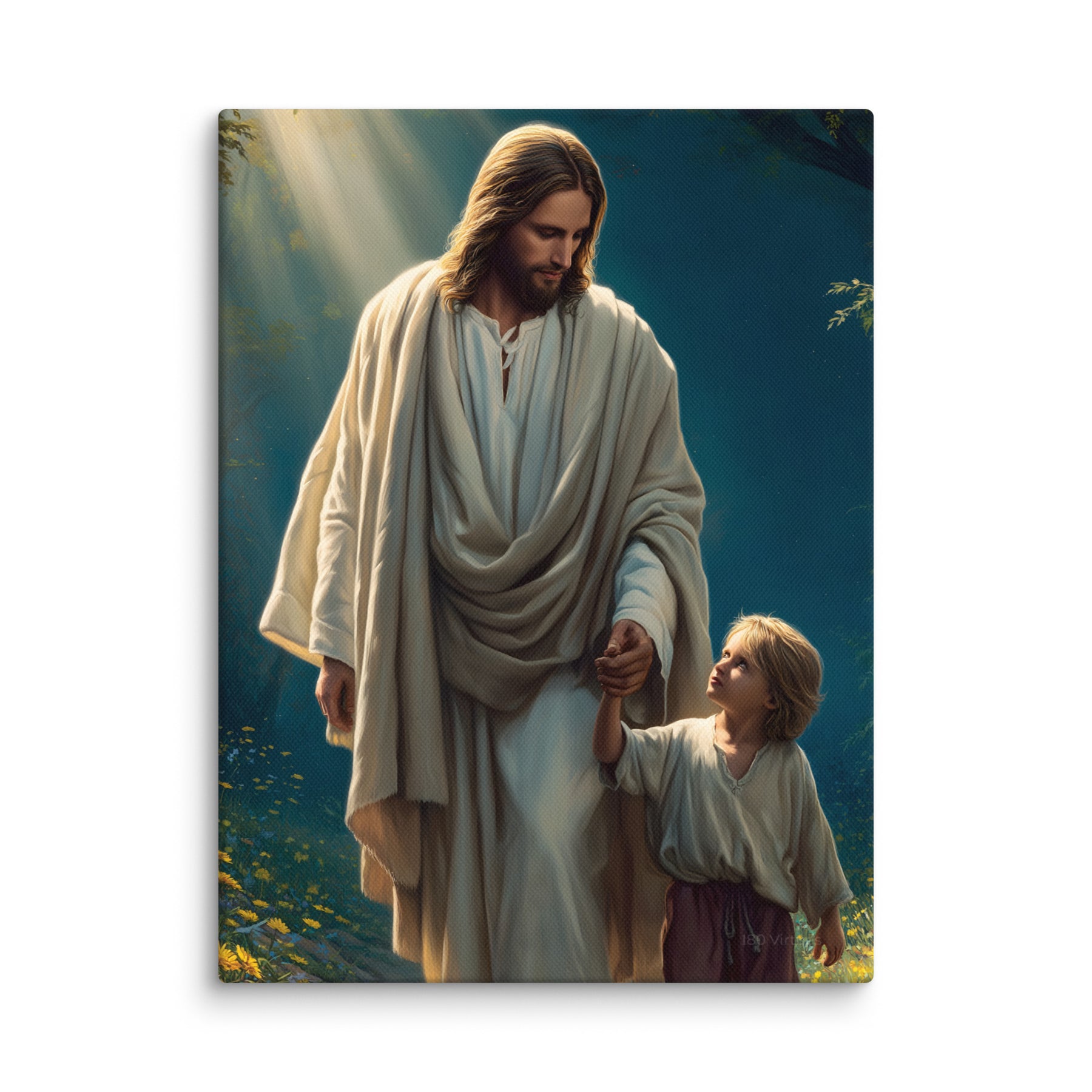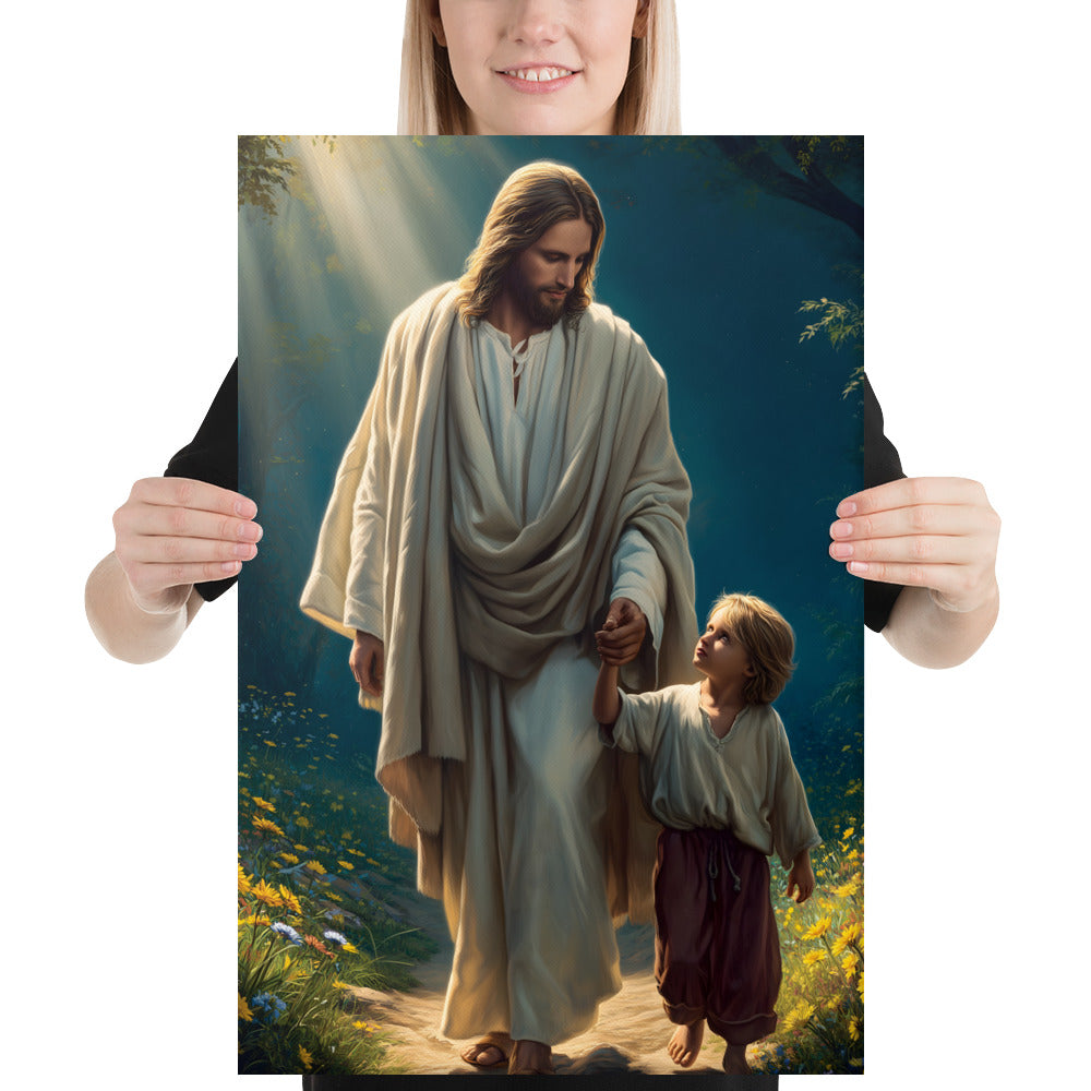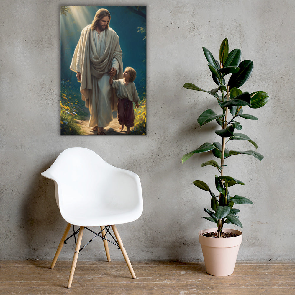 This image is a powerful reminder that Jesus walks beside us through every season of life, guiding our steps with patience, care, and unfailing love. It speaks to faith learned young, trust freely given, and the quiet assurance that we are never alone. A comforting and inspiring piece for homes, nurseries, classrooms, or prayer spaces.