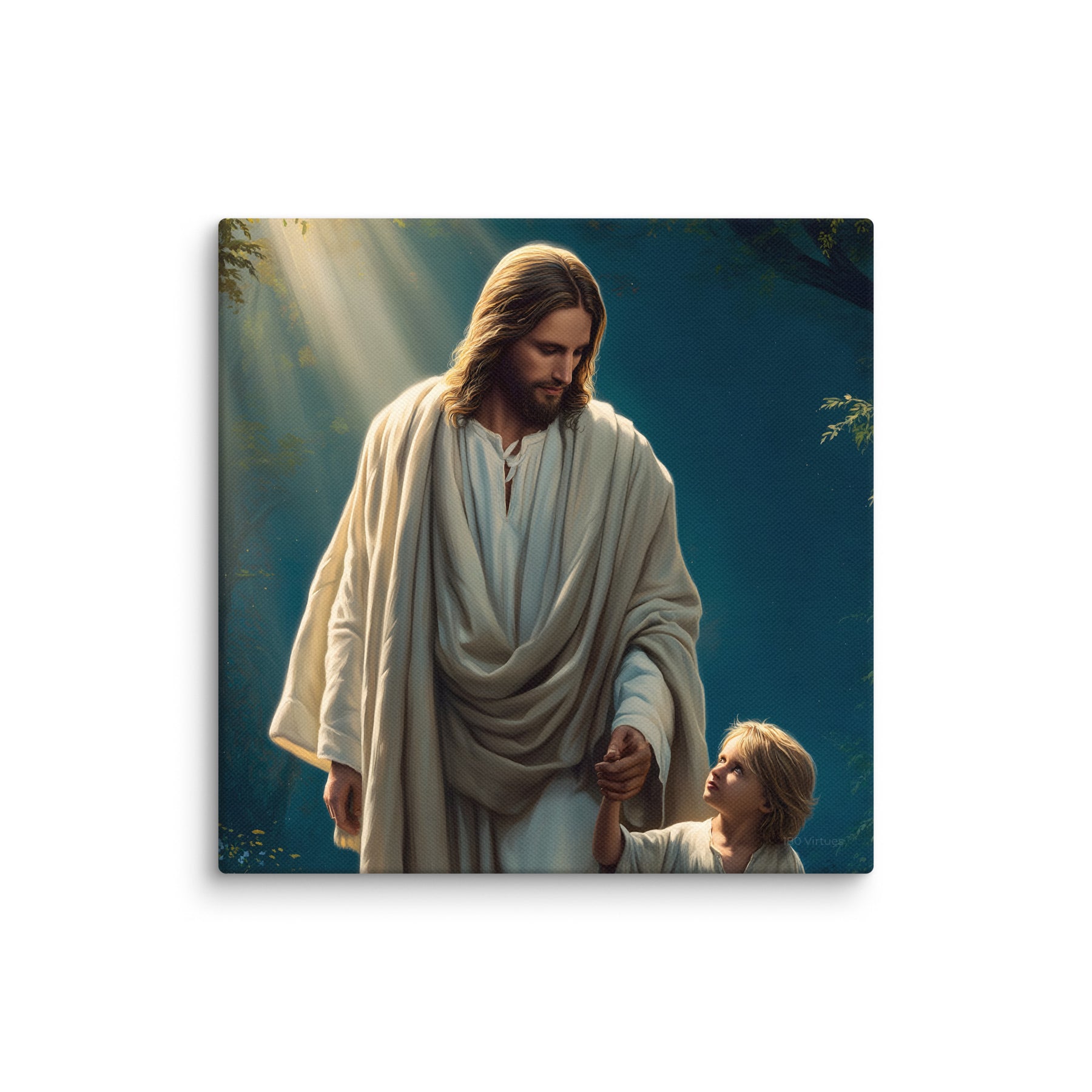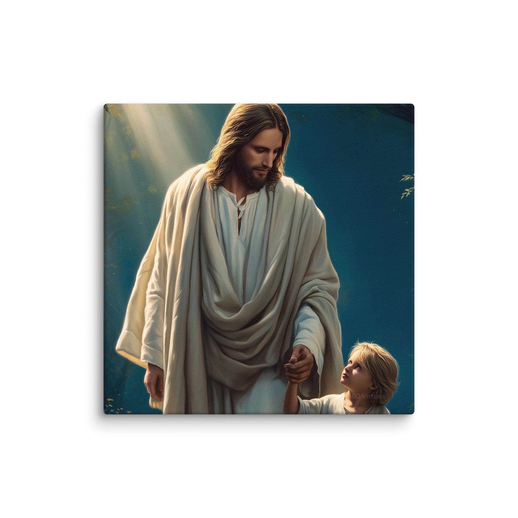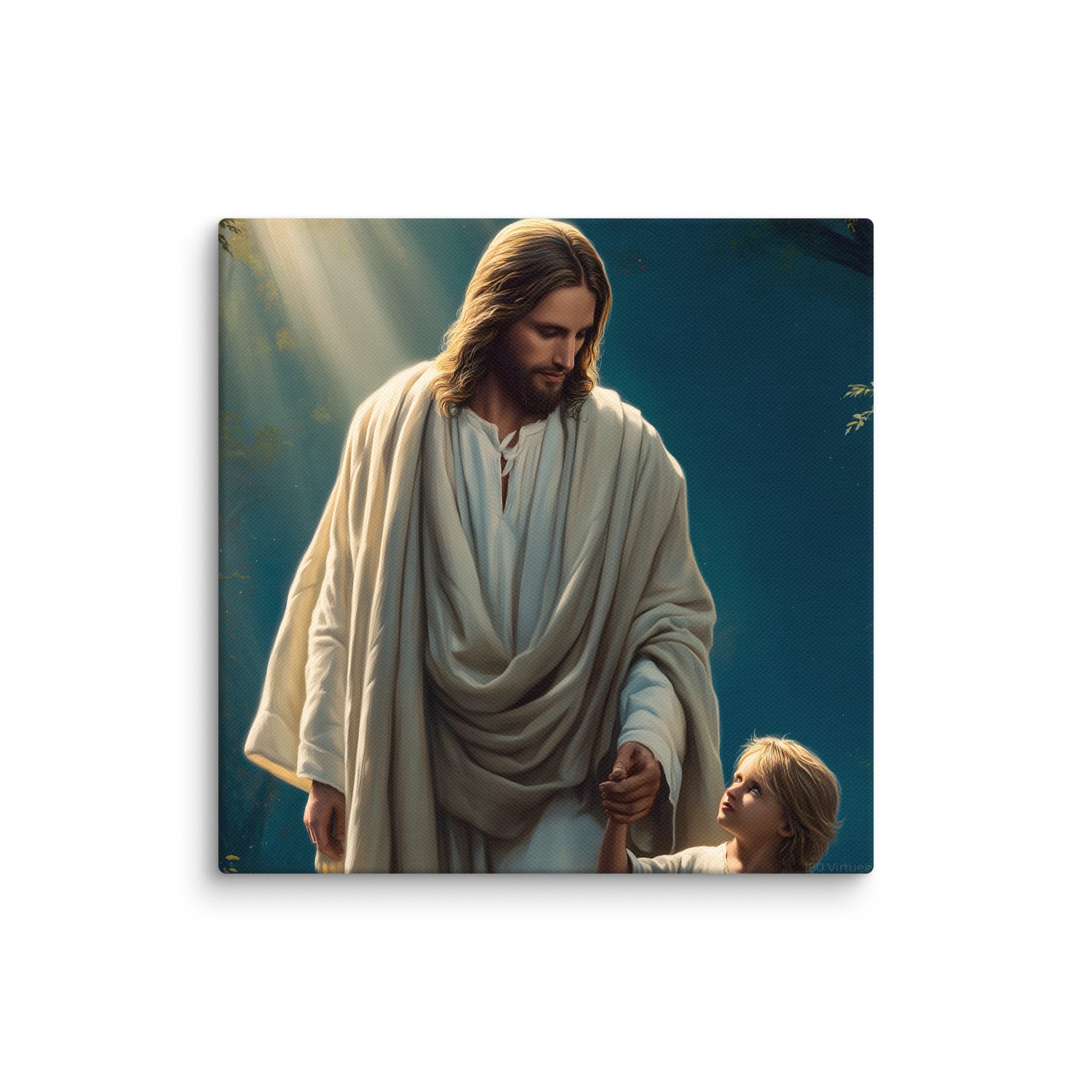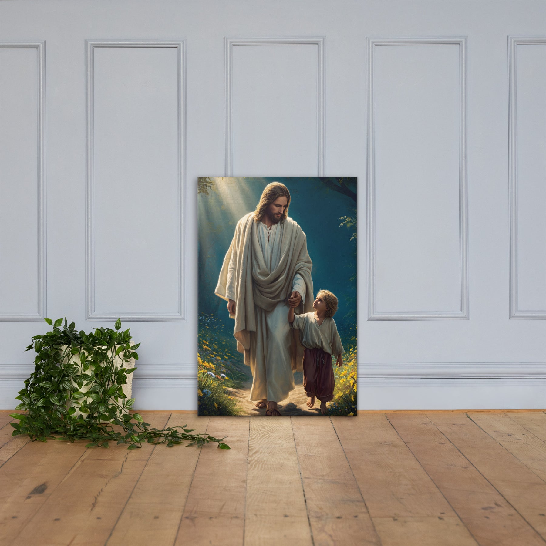 This image is a powerful reminder that Jesus walks beside us through every season of life, guiding our steps with patience, care, and unfailing love. It speaks to faith learned young, trust freely given, and the quiet assurance that we are never alone. A comforting and inspiring piece for homes, nurseries, classrooms, or prayer spaces.