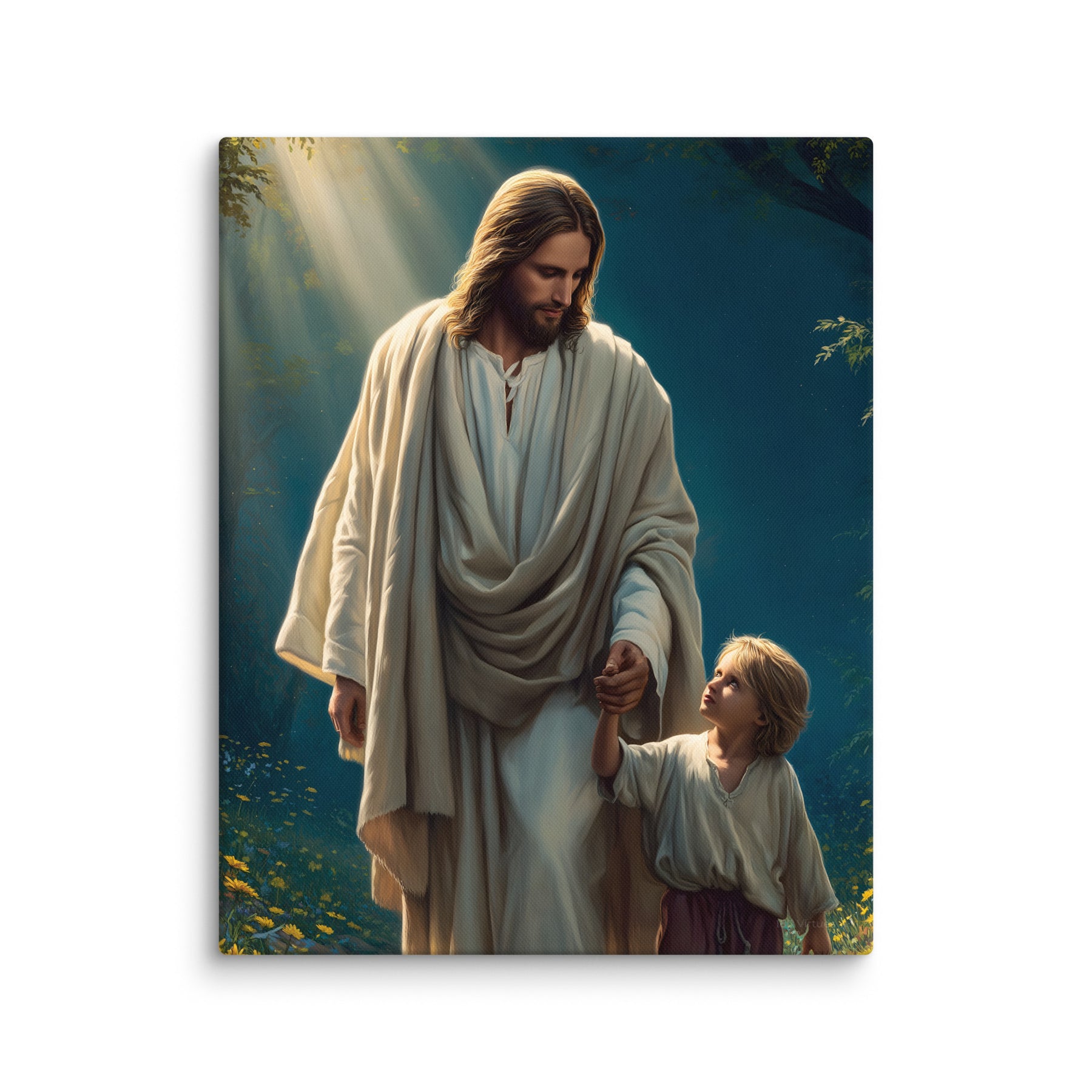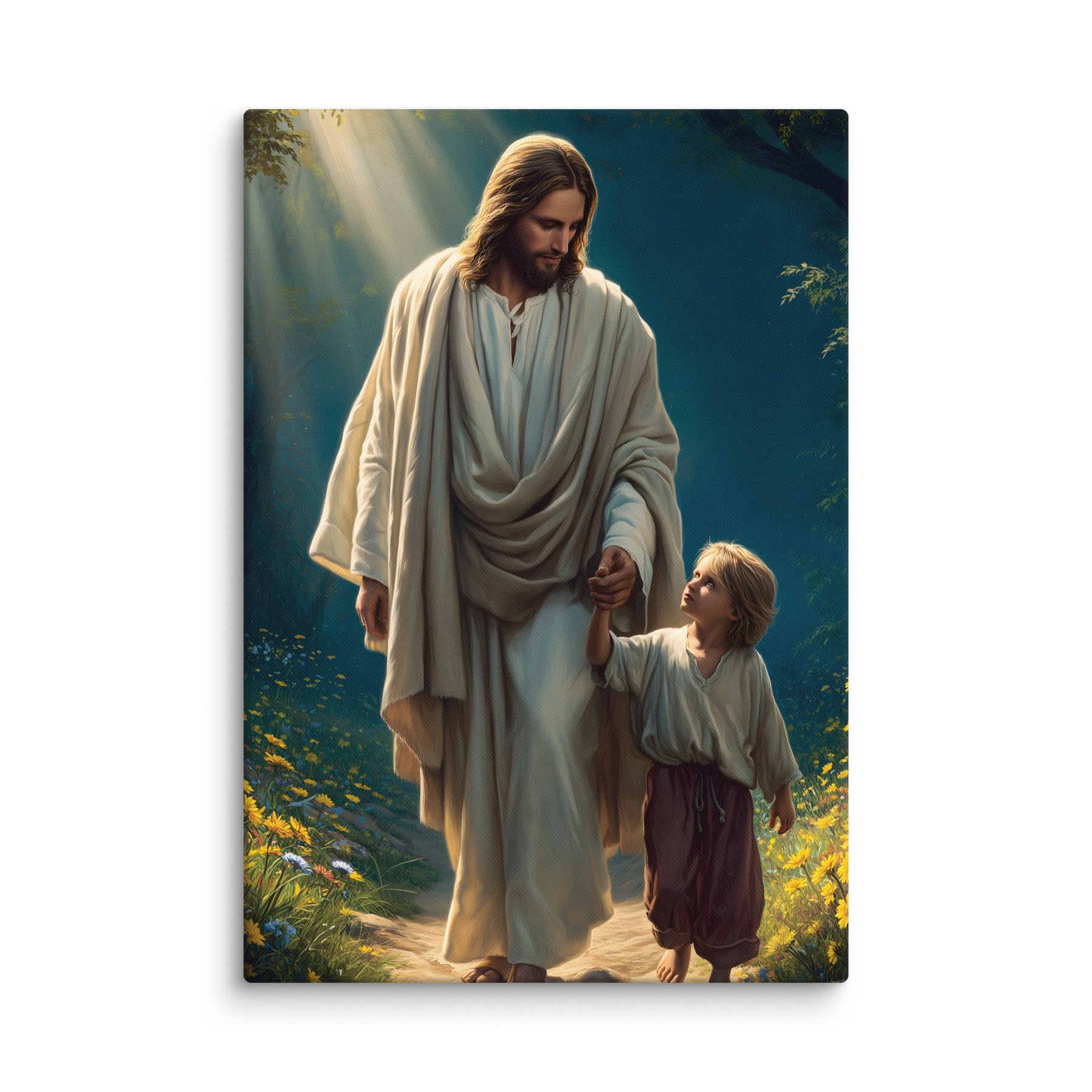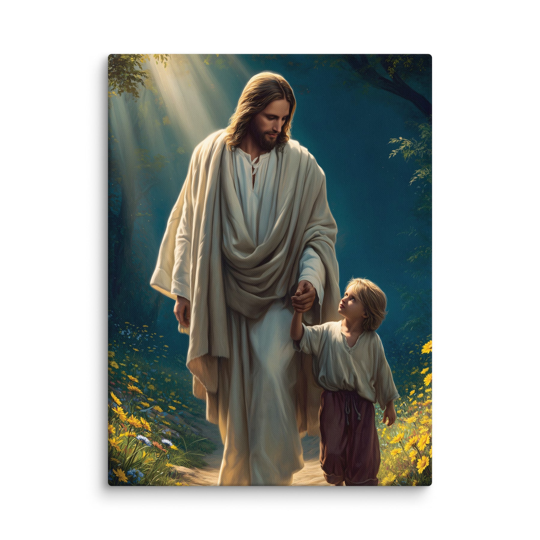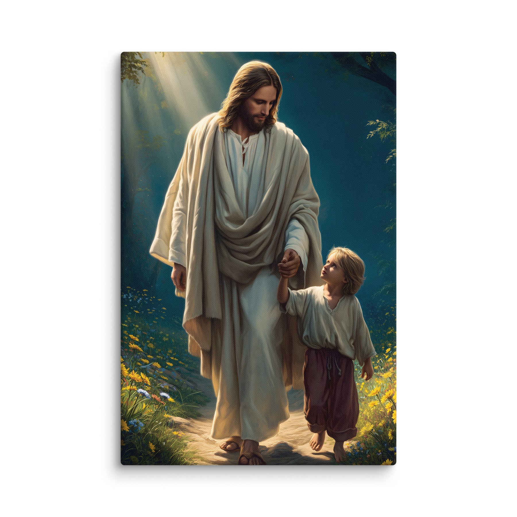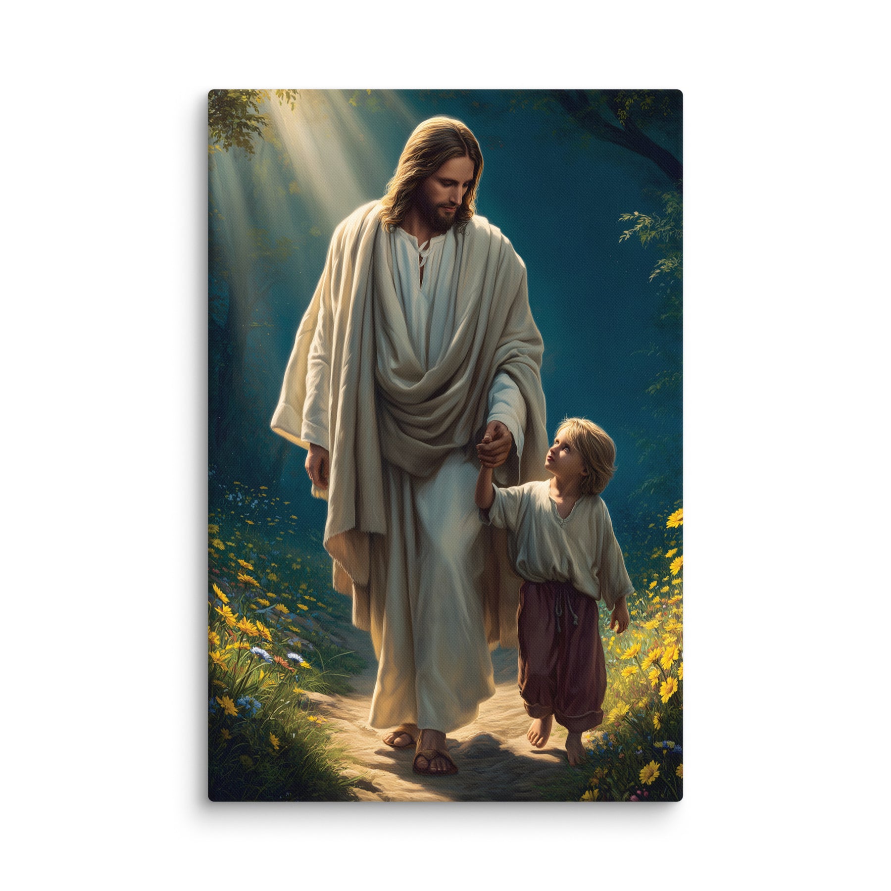 This peaceful artwork portrays a sacred moment of trust as Jesus gently leads a young boy along a quiet, flower-lined path. Sunlight filters through the trees, casting a warm glow that reflects Christ’s constant presence and loving guidance. The boy looks up with confidence and awe, knowing he is safe while walking hand-in-hand with the Savior.