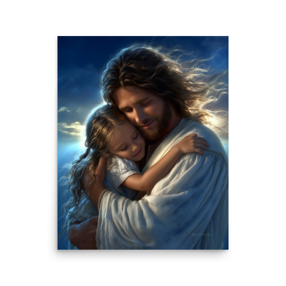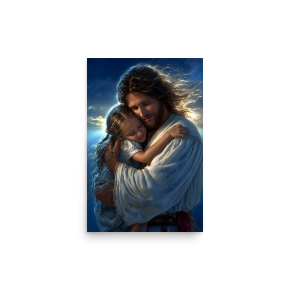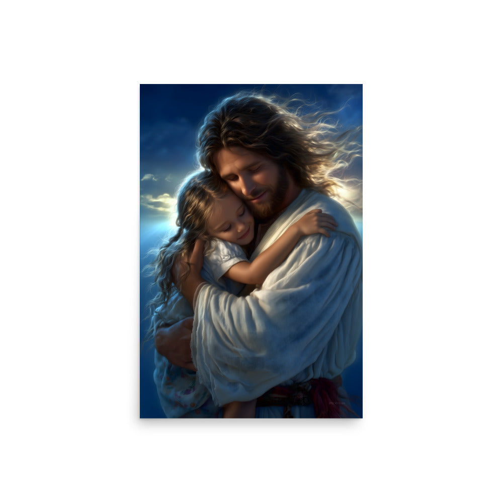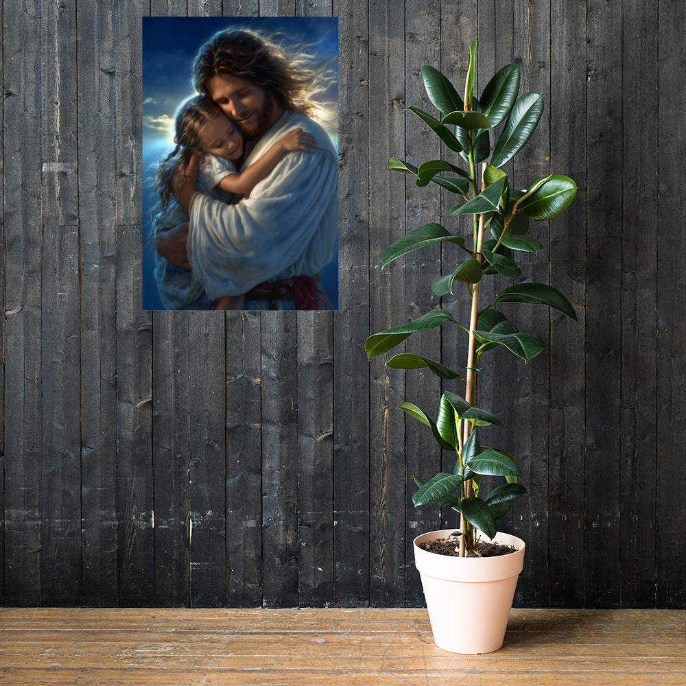 Bring comfort, safety, and gentle reassurance into your space with this moving museum-quality poster portraying Jesus Christ holding a young child close in a tender embrace. Soft, flowing light surrounds the figures as the Savior’s calm expression and protective arms convey deep compassion, peace, and unconditional love. The delicate interplay of light and shadow, along with the painterly texture of the scene, evokes a timeless beauty inspired by classical Christian art.