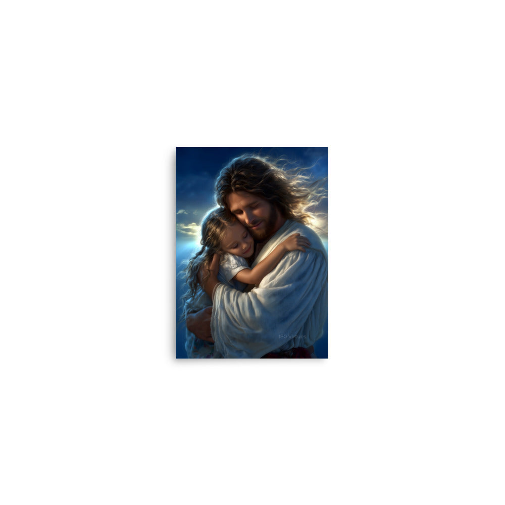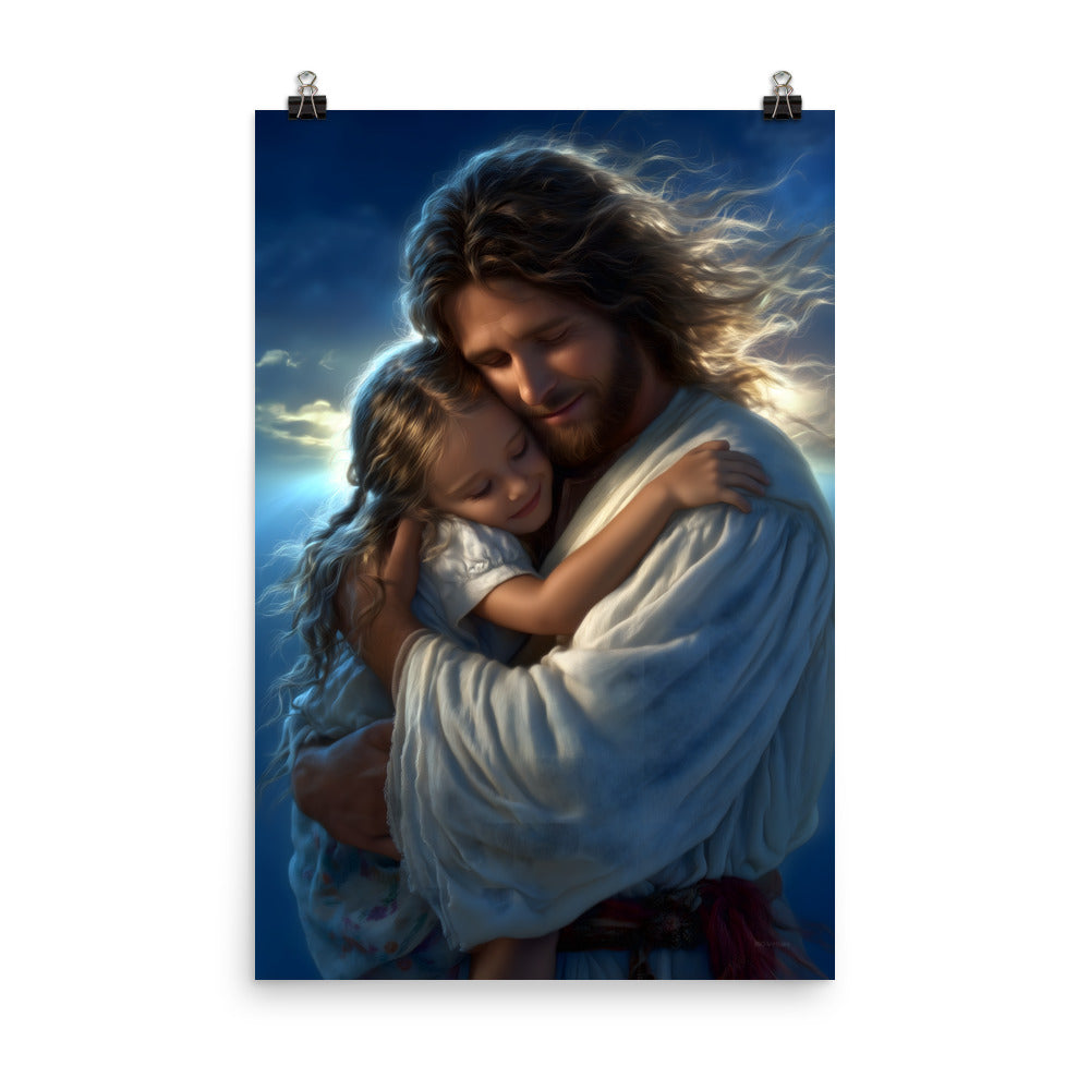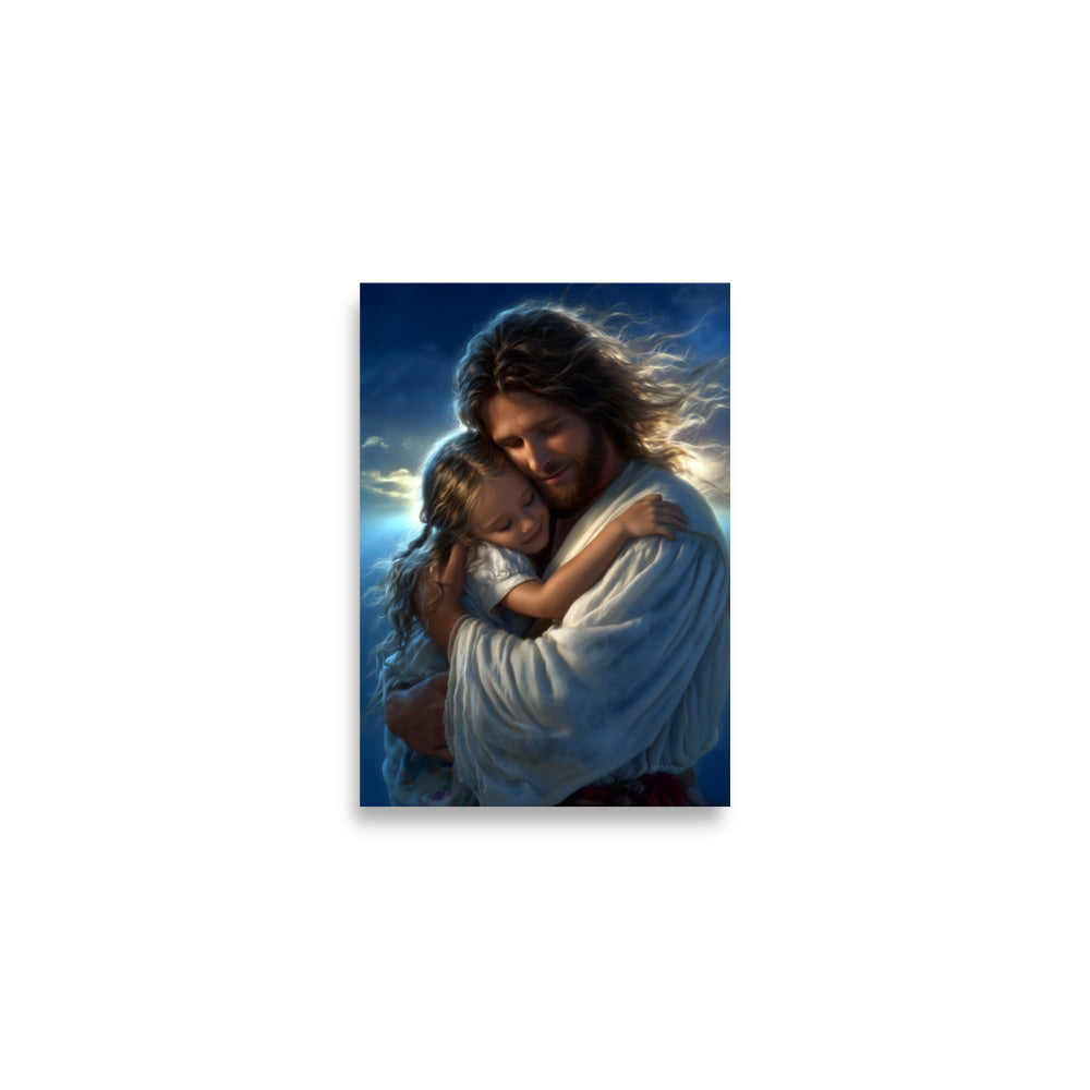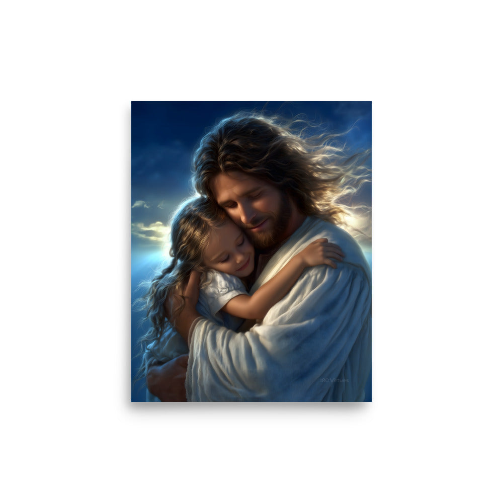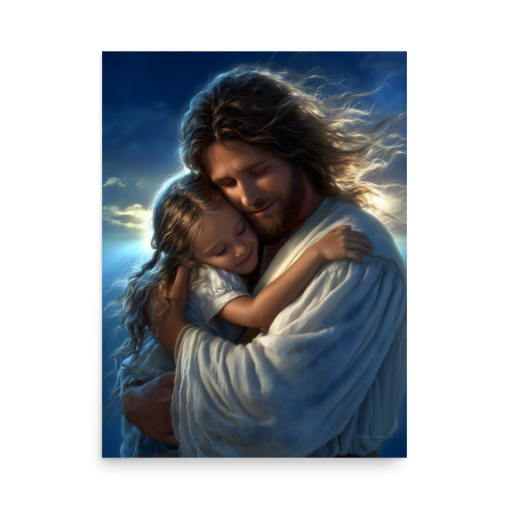 Bring comfort, safety, and gentle reassurance into your space with this moving museum-quality poster portraying Jesus Christ holding a young child close in a tender embrace. Soft, flowing light surrounds the figures as the Savior’s calm expression and protective arms convey deep compassion, peace, and unconditional love. The delicate interplay of light and shadow, along with the painterly texture of the scene, evokes a timeless beauty inspired by classical Christian art.