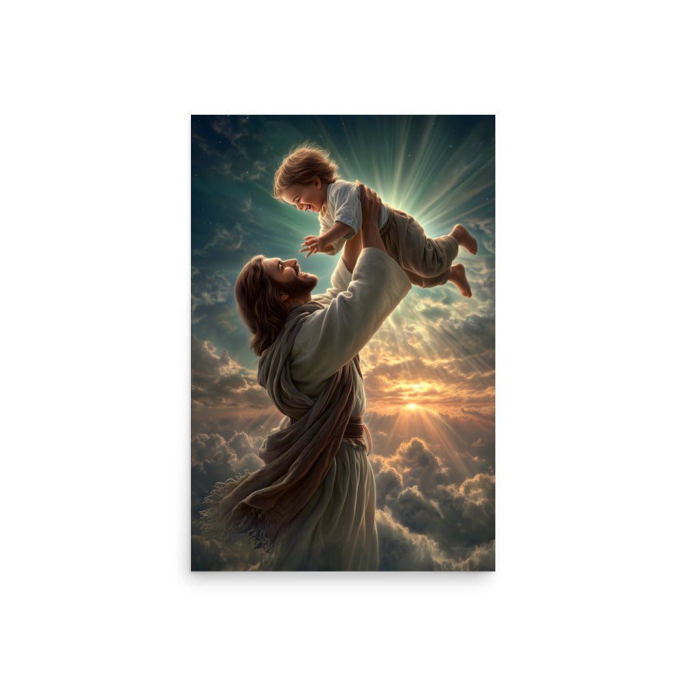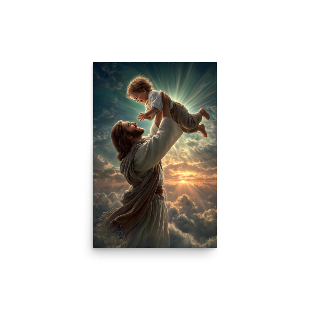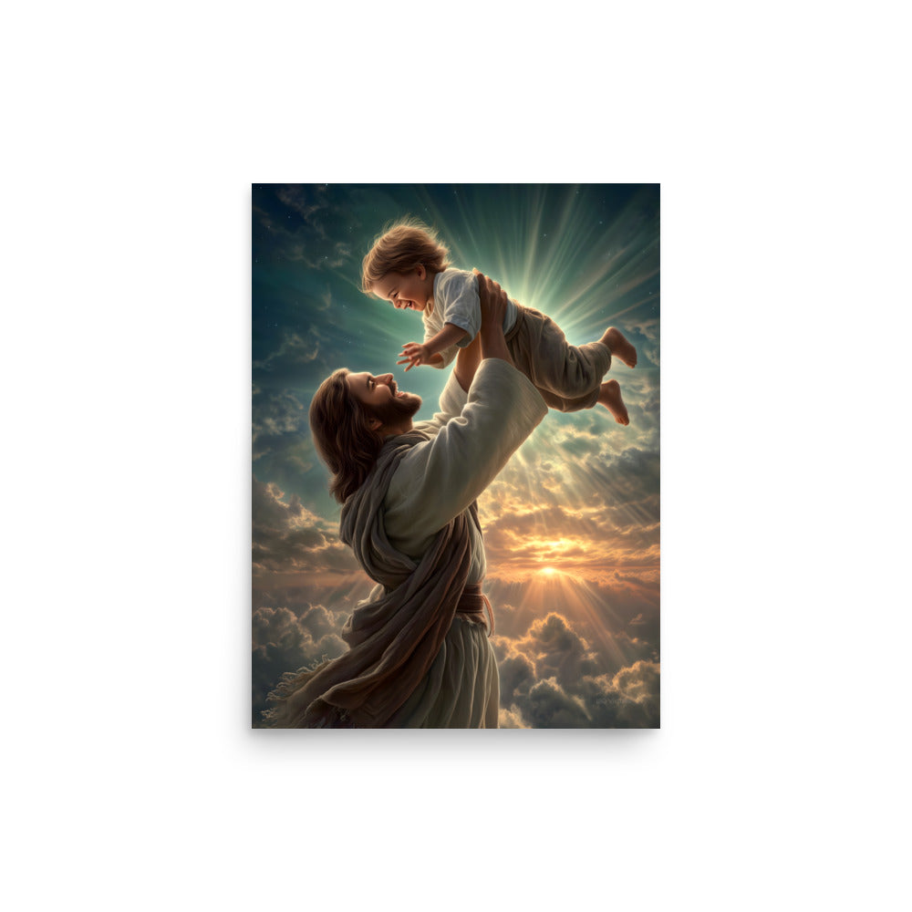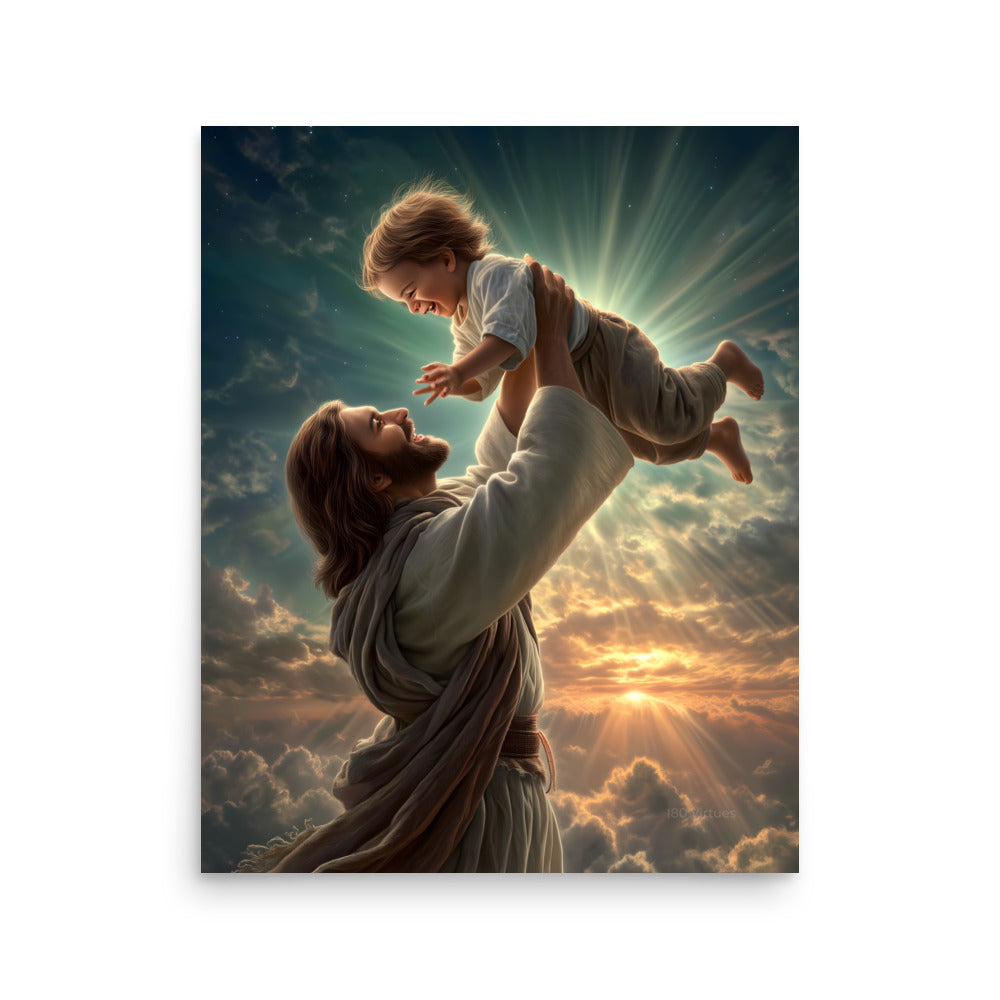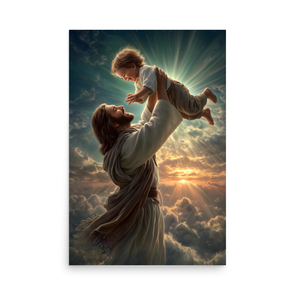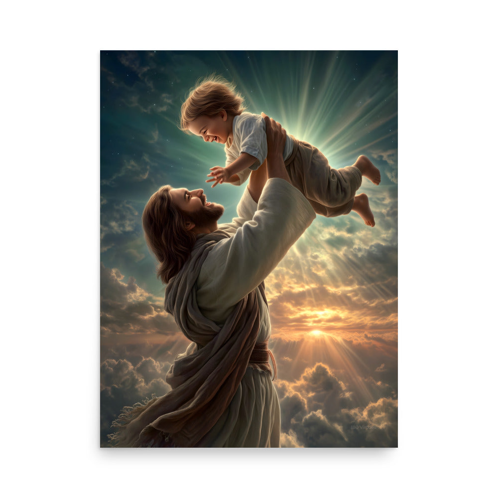 Bring joy, hope, and heavenly wonder into your space with this radiant museum-quality poster portraying Jesus Christ lifting a laughing child toward the sky. Bathed in golden light and surrounded by glowing clouds, the scene captures a moment of pure delight, innocence, and divine love. The Savior’s joyful expression and gentle strength, paired with luminous rays breaking through the heavens, create a breathtaking image inspired by classical Christian art and filled with warmth and life.
