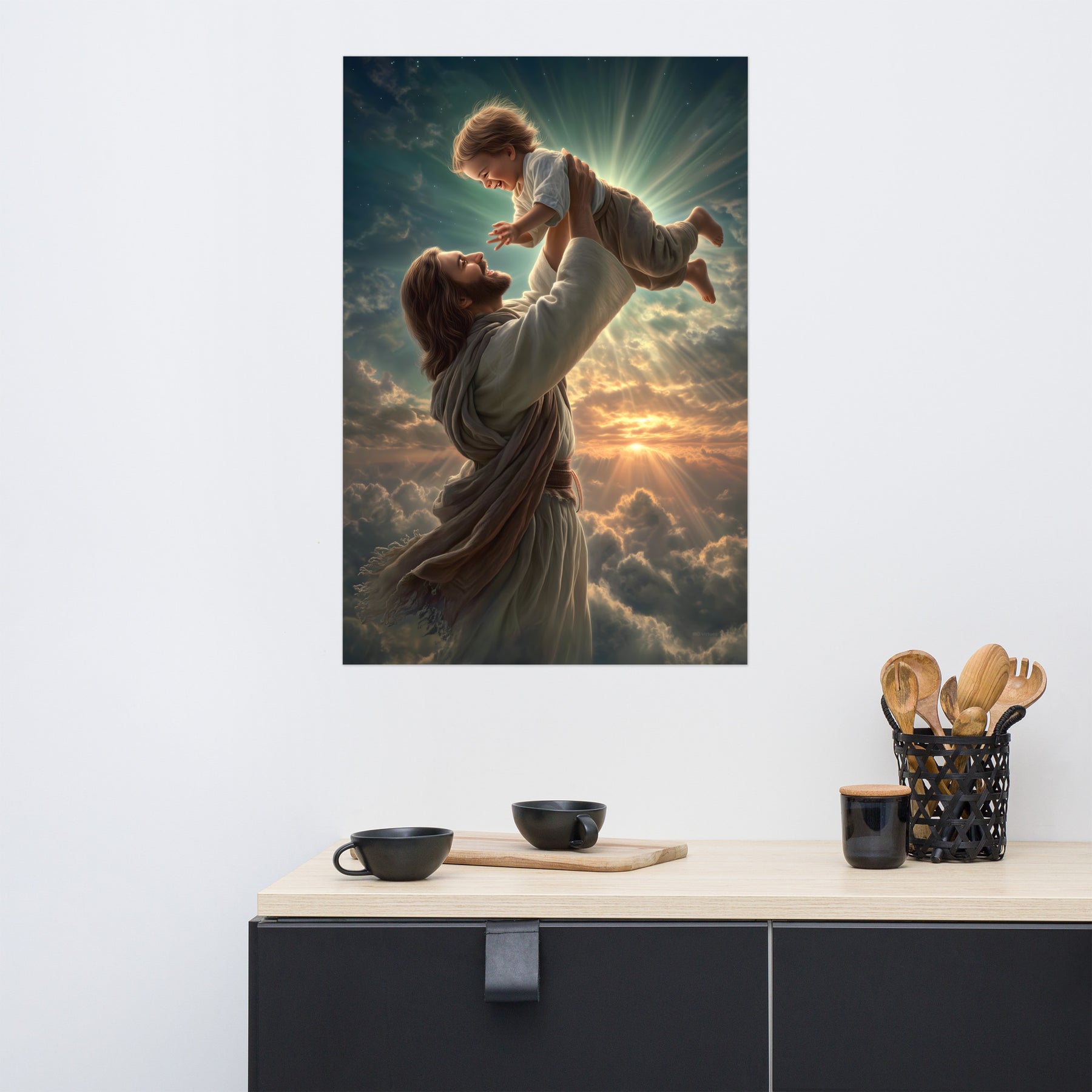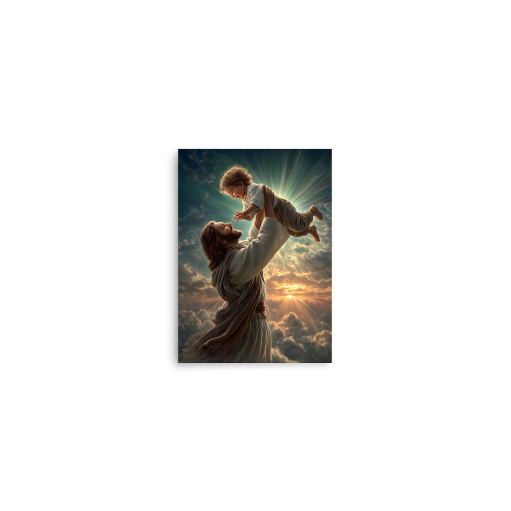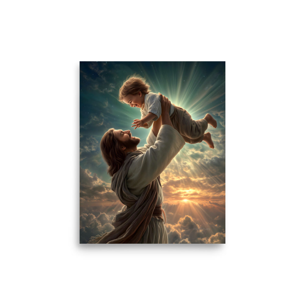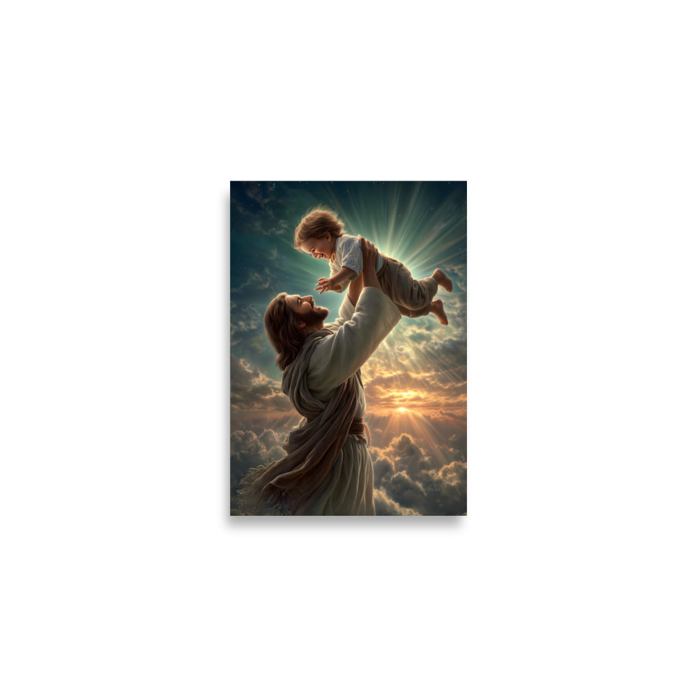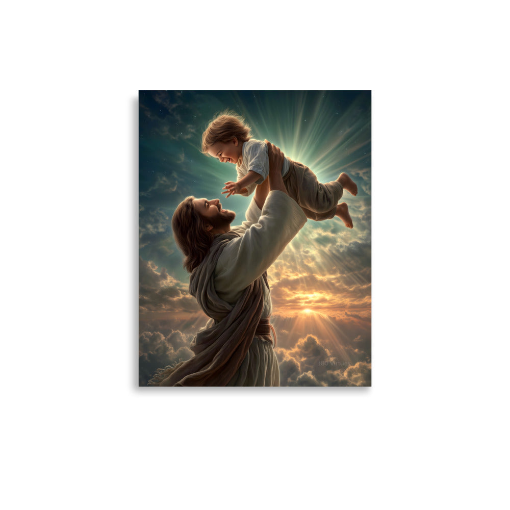 Bring joy, hope, and heavenly wonder into your space with this radiant museum-quality poster portraying Jesus Christ lifting a laughing child toward the sky. Bathed in golden light and surrounded by glowing clouds, the scene captures a moment of pure delight, innocence, and divine love. The Savior’s joyful expression and gentle strength, paired with luminous rays breaking through the heavens, create a breathtaking image inspired by classical Christian art and filled with warmth and life.