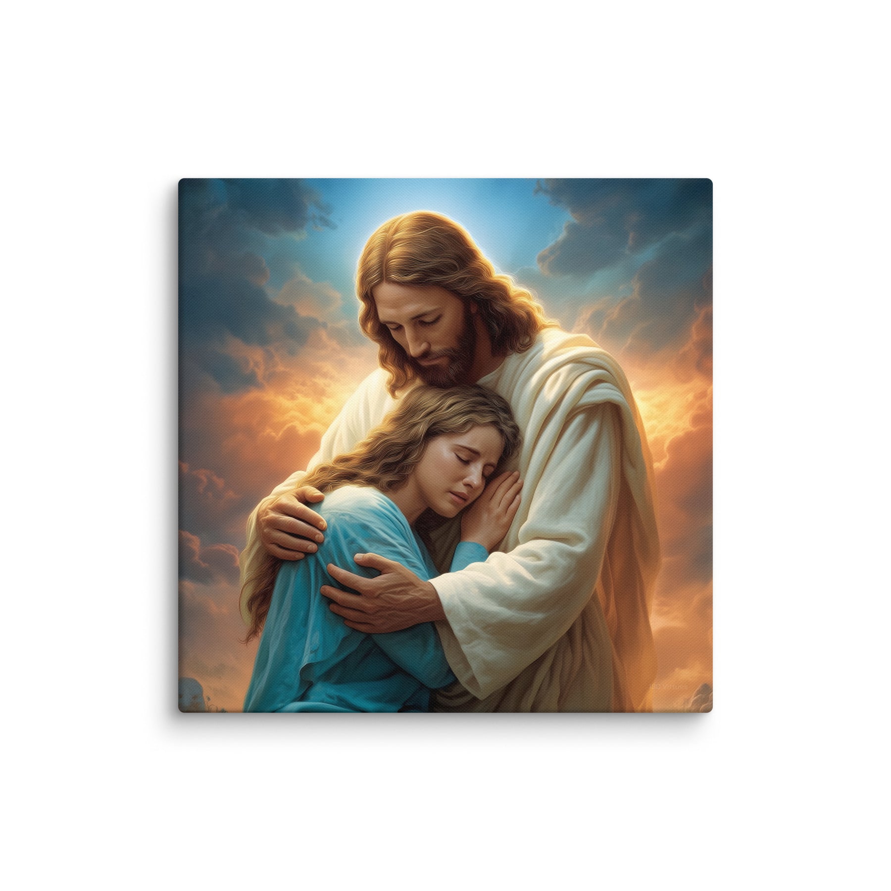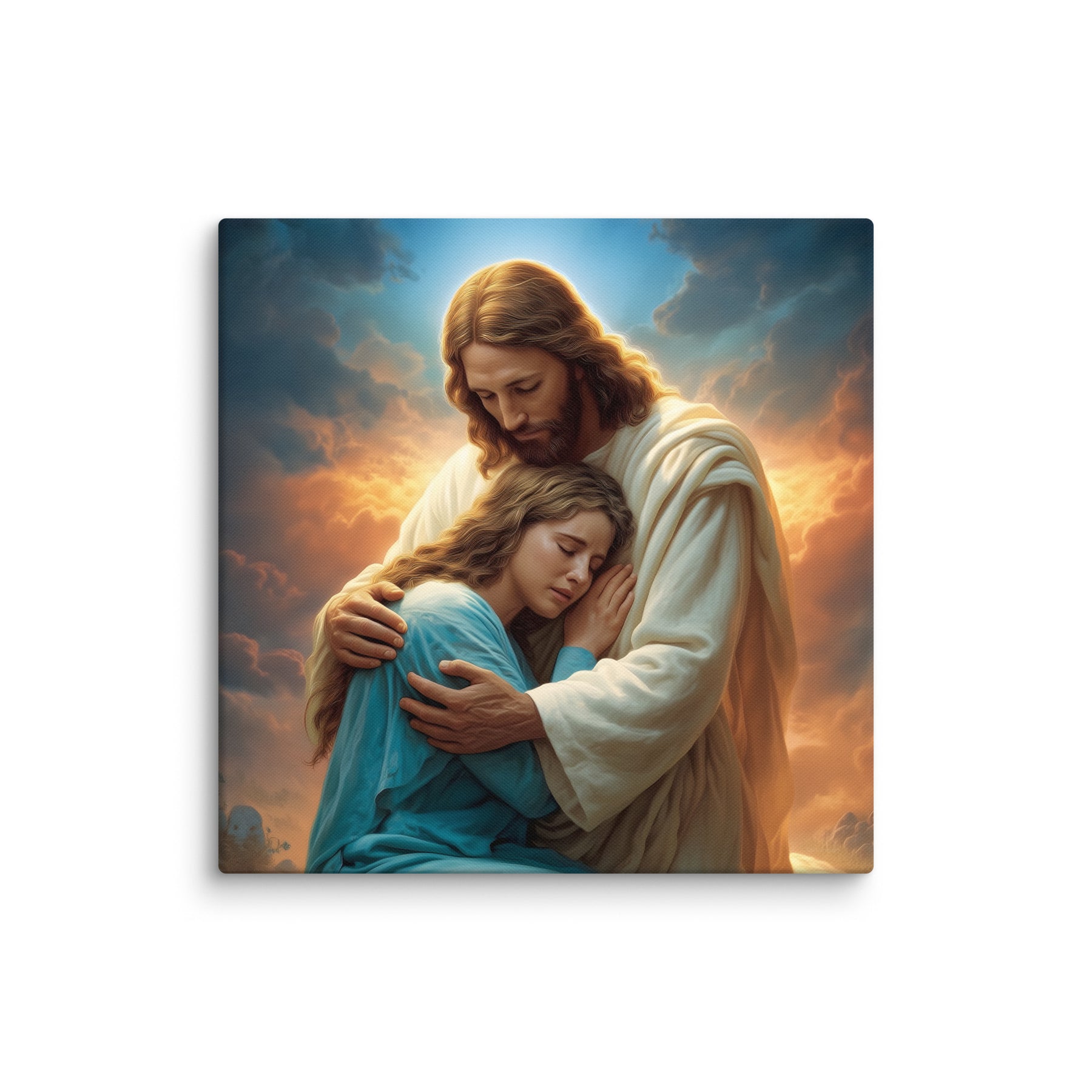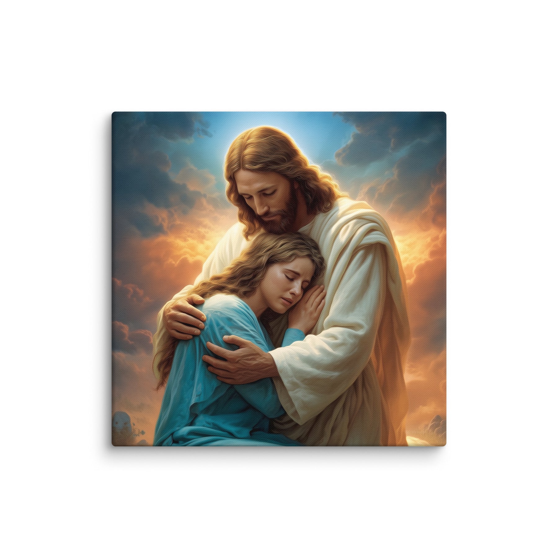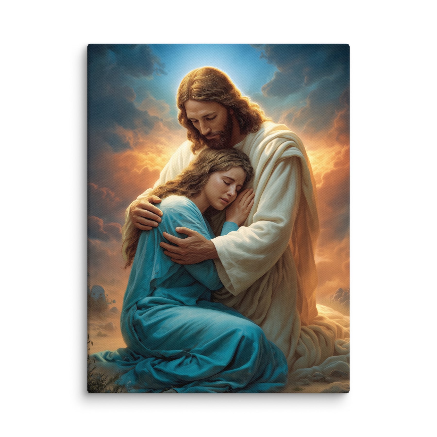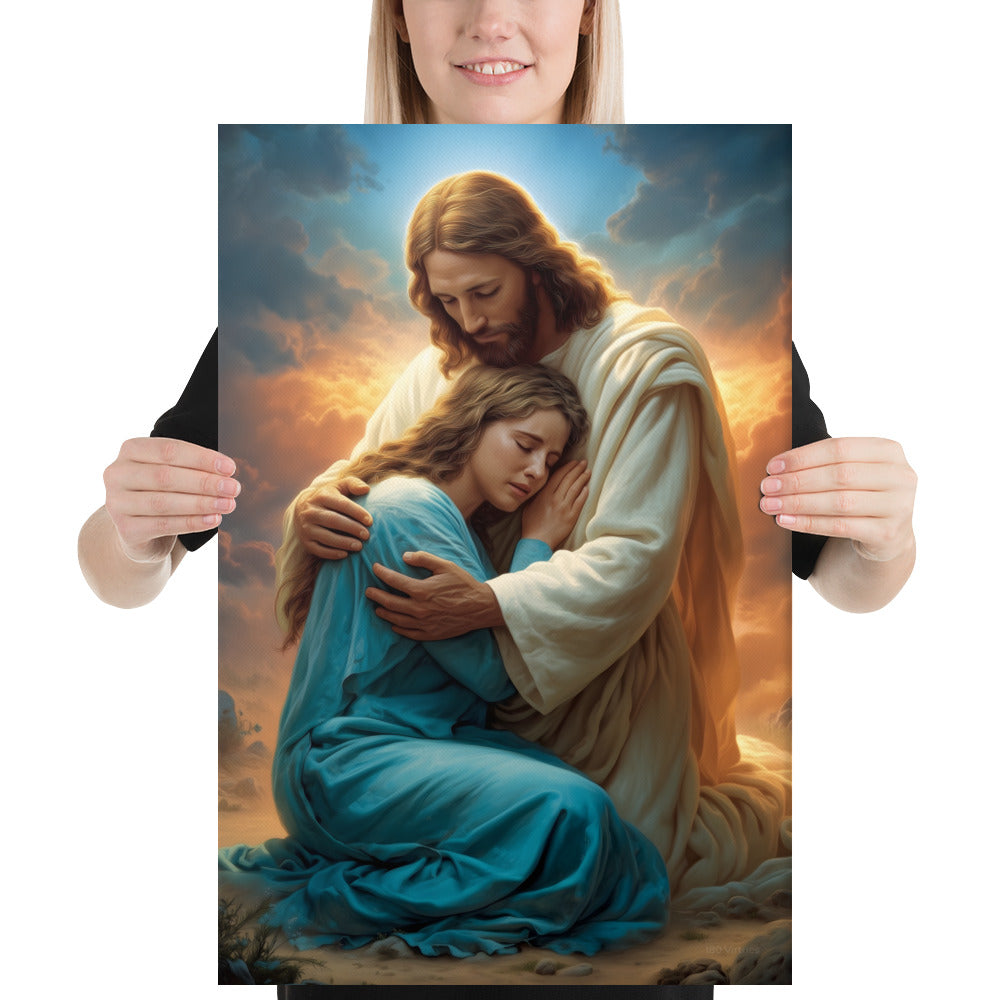 In this tender and deeply comforting artwork, Jesus gently wraps His arms around a grieving woman, drawing her close as she weeps into His embrace. The warm glow rising behind them symbolizes divine compassion breaking through the clouds of sorrow, illuminating the moment with hope, mercy, and peace. His bowed head and tender expression remind us that Christ does not merely observe our pain—He shares it, feels it, and meets us in it with perfect love.
