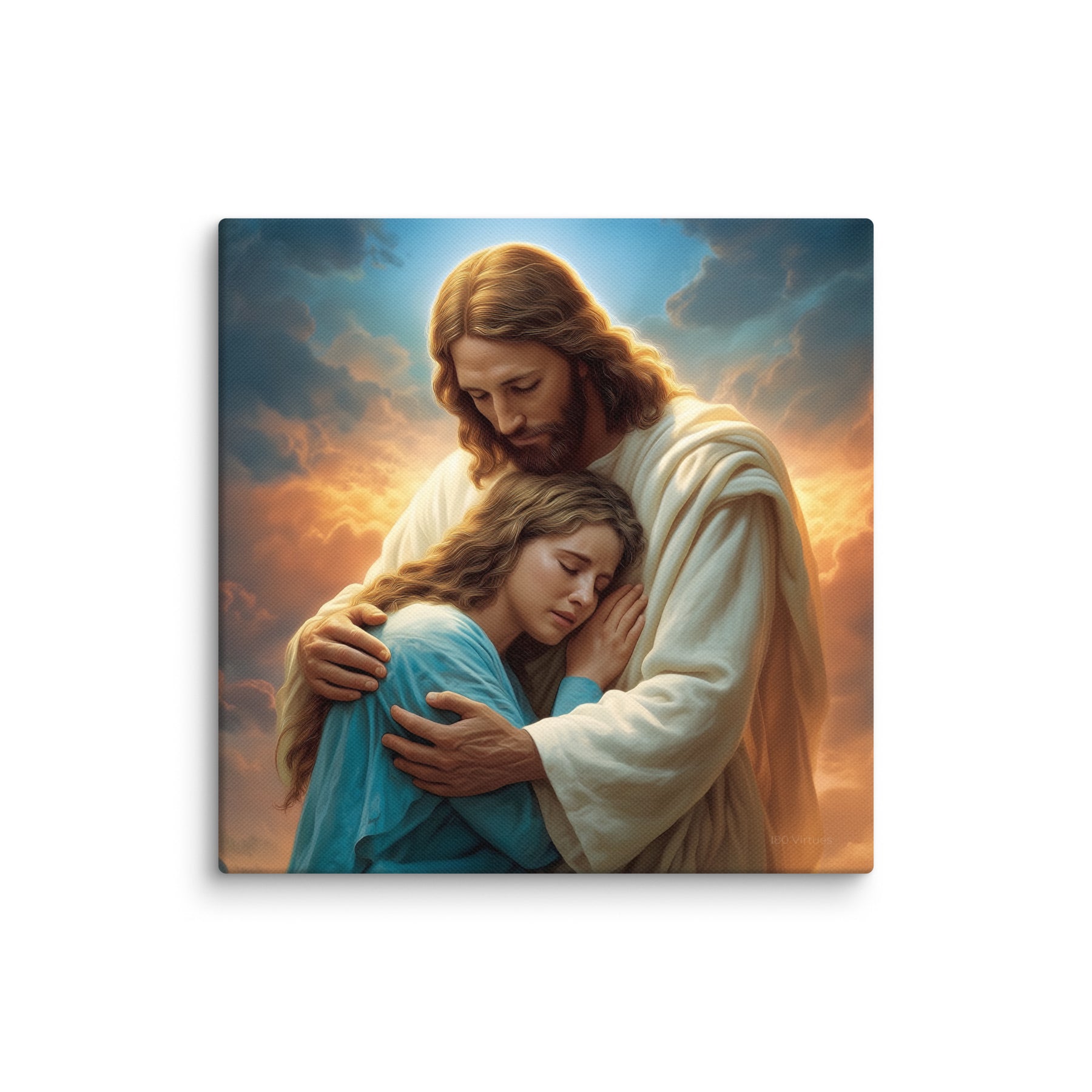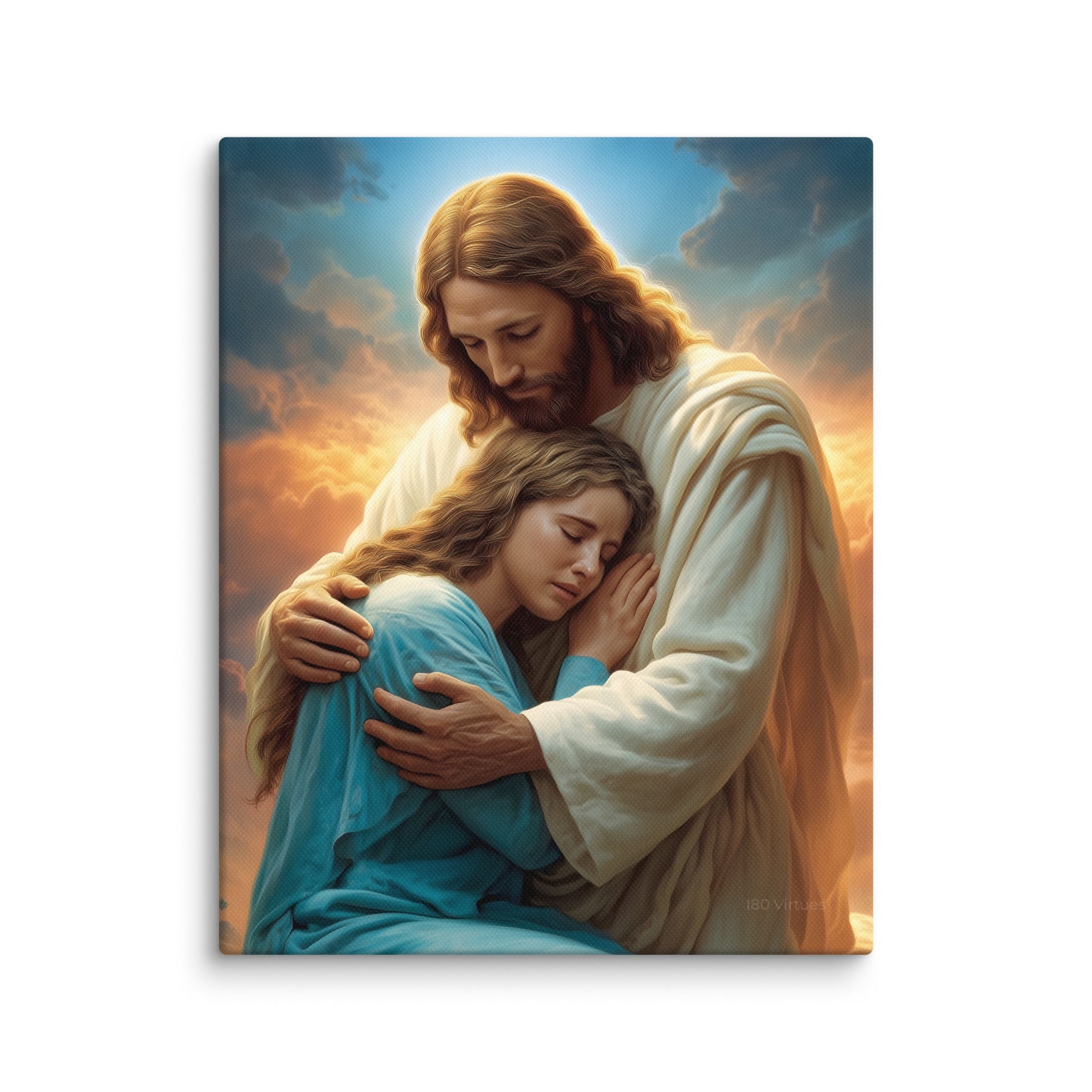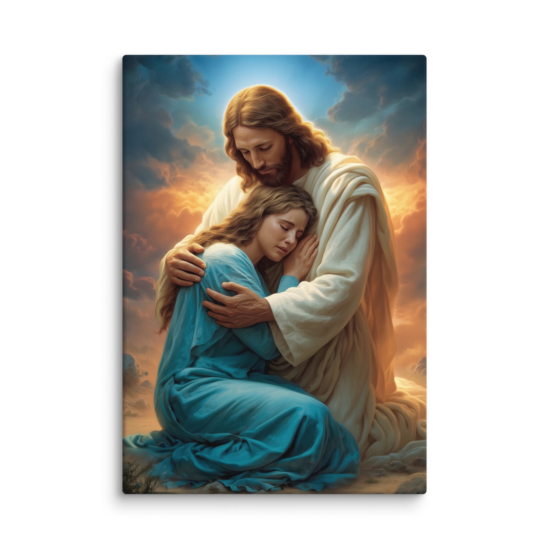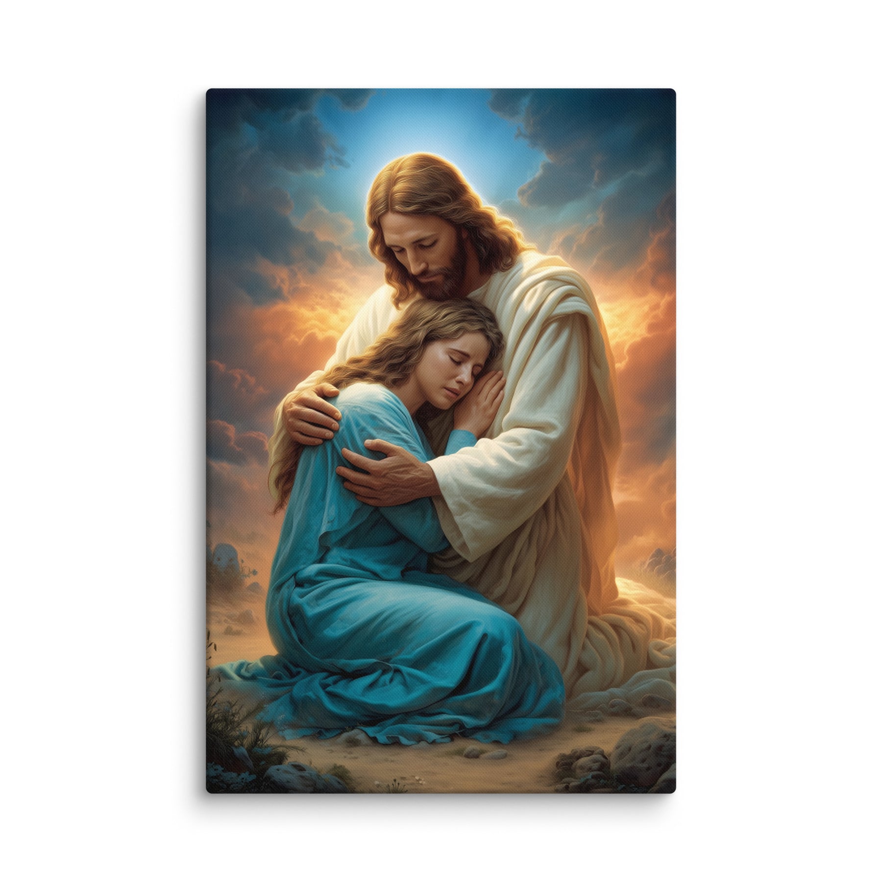 In this tender and deeply comforting artwork, Jesus gently wraps His arms around a grieving woman, drawing her close as she weeps into His embrace. The warm glow rising behind them symbolizes divine compassion breaking through the clouds of sorrow, illuminating the moment with hope, mercy, and peace. His bowed head and tender expression remind us that Christ does not merely observe our pain—He shares it, feels it, and meets us in it with perfect love.