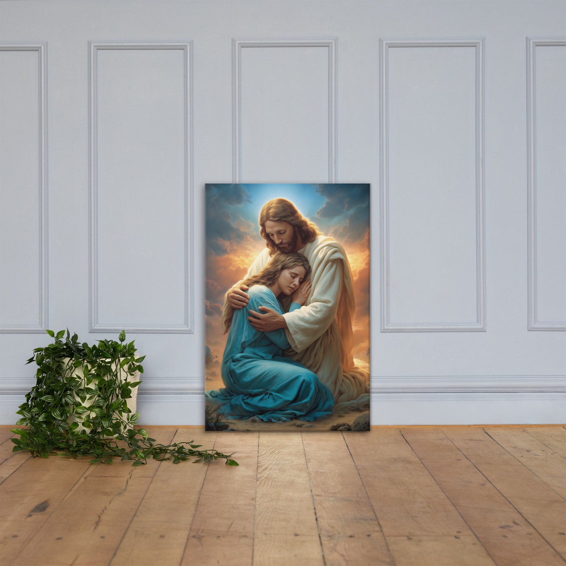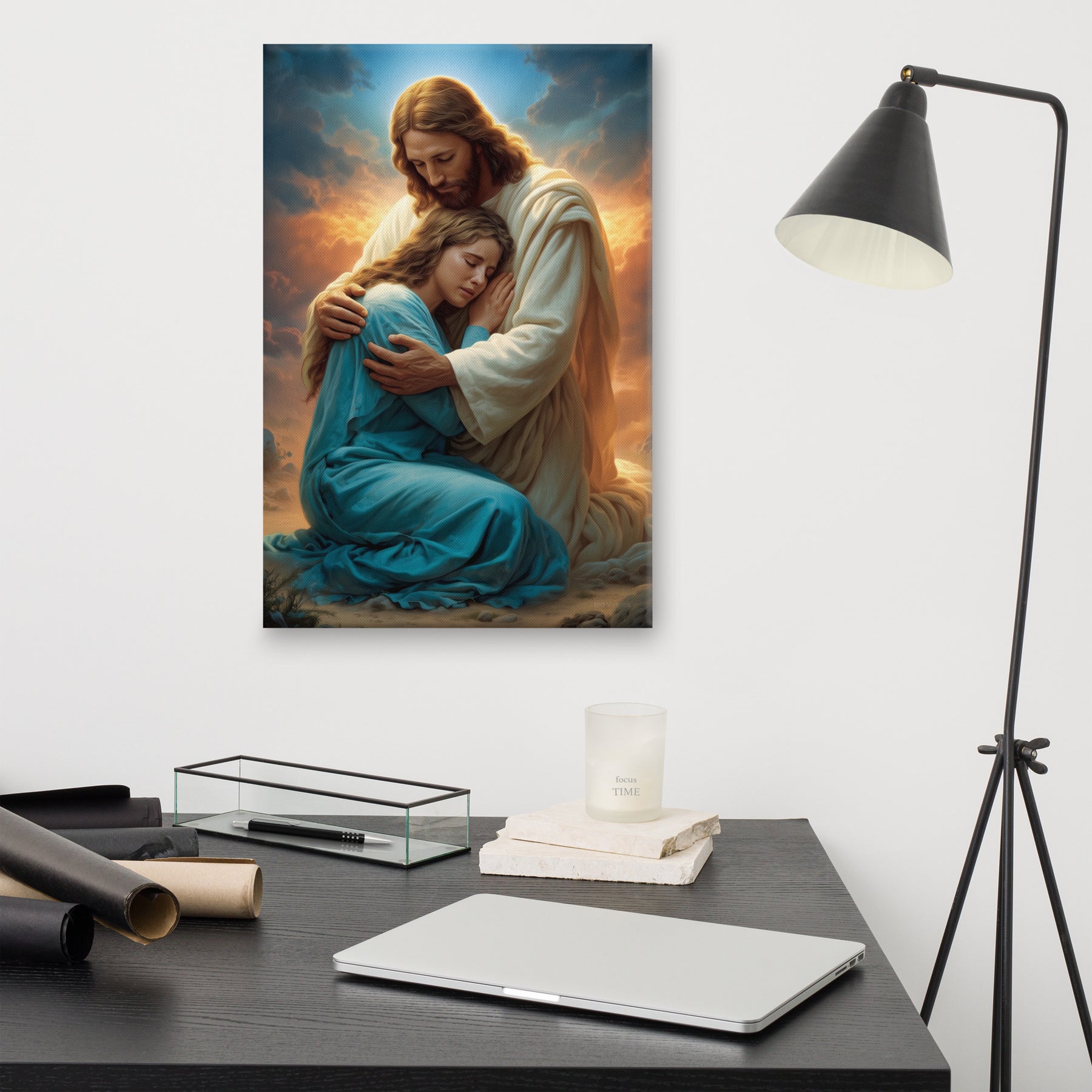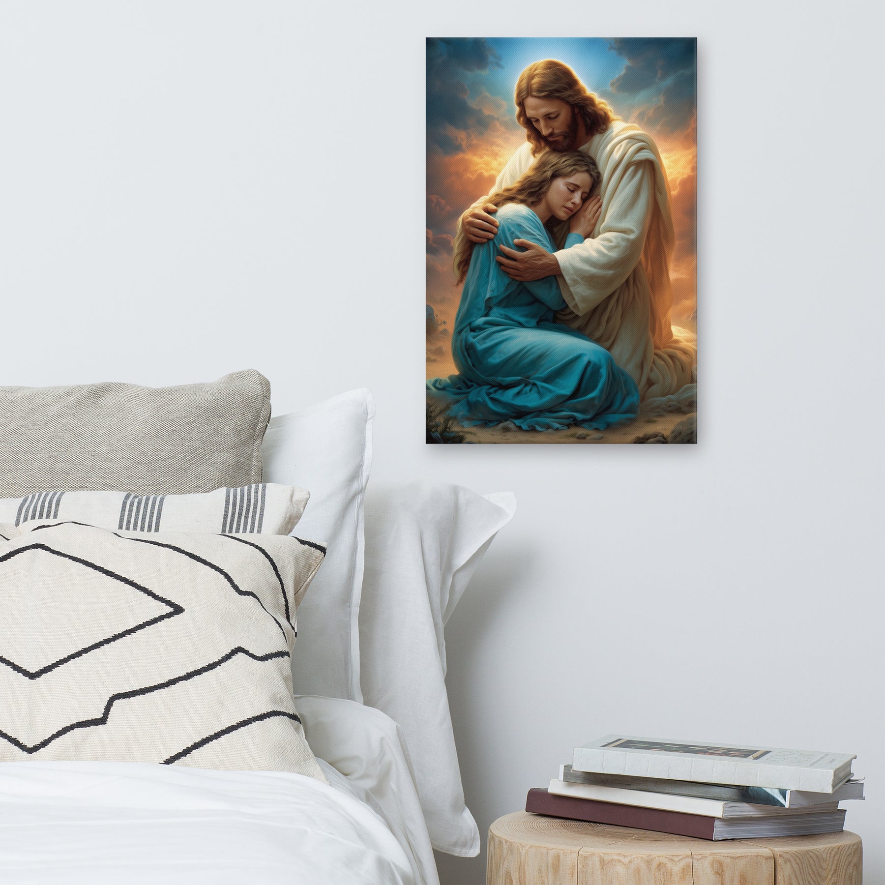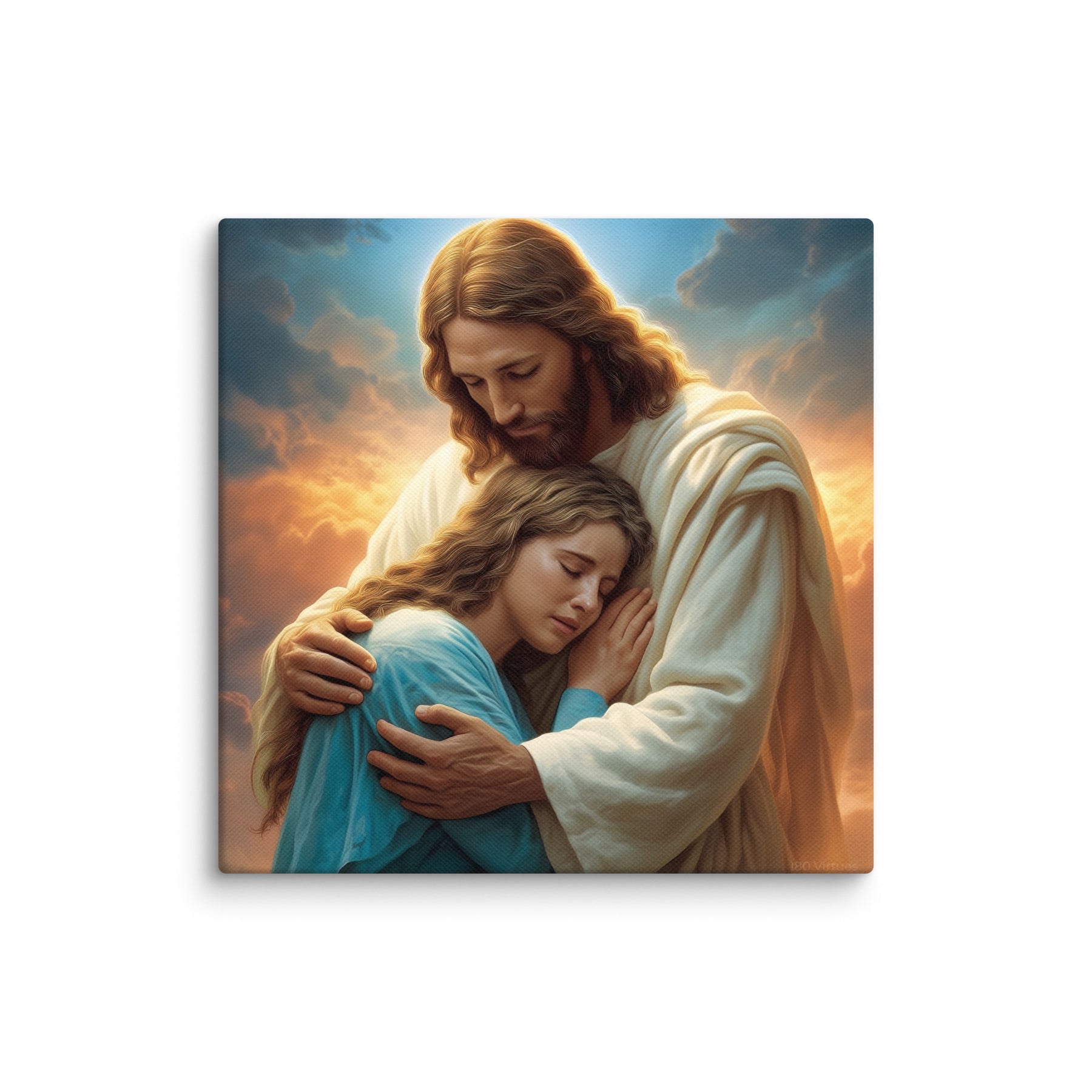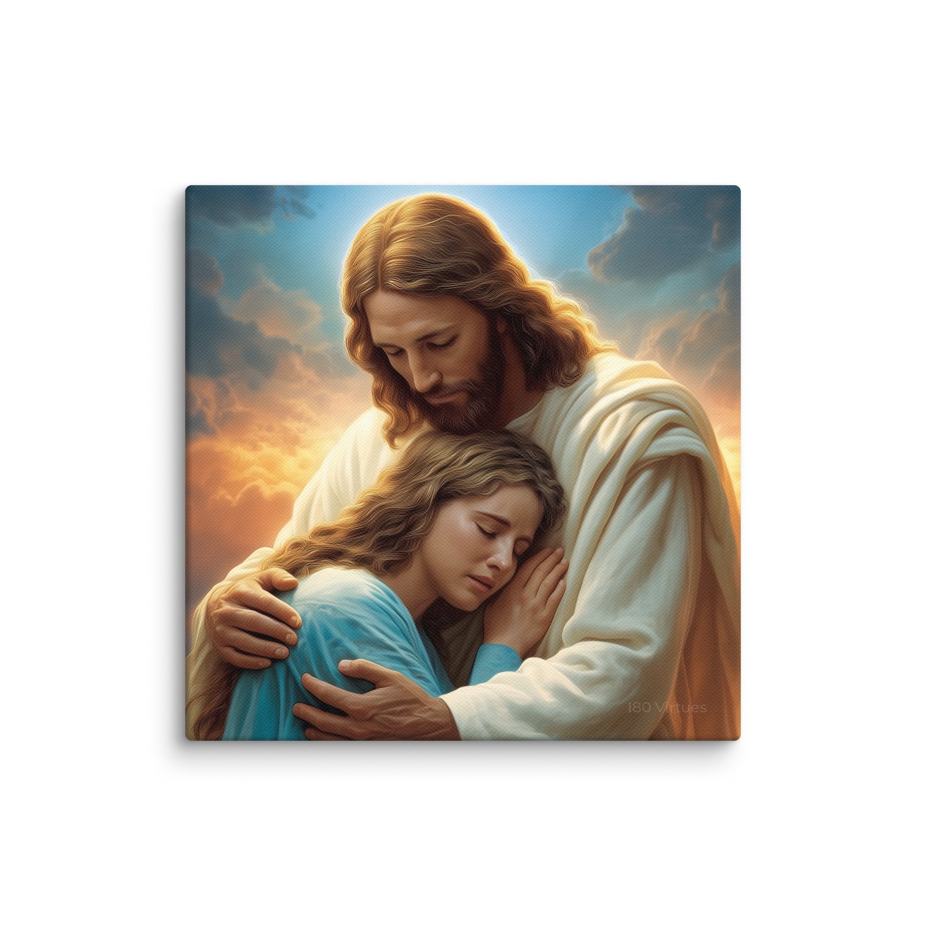 In this tender and deeply comforting artwork, Jesus gently wraps His arms around a grieving woman, drawing her close as she weeps into His embrace. The warm glow rising behind them symbolizes divine compassion breaking through the clouds of sorrow, illuminating the moment with hope, mercy, and peace. His bowed head and tender expression remind us that Christ does not merely observe our pain—He shares it, feels it, and meets us in it with perfect love.
