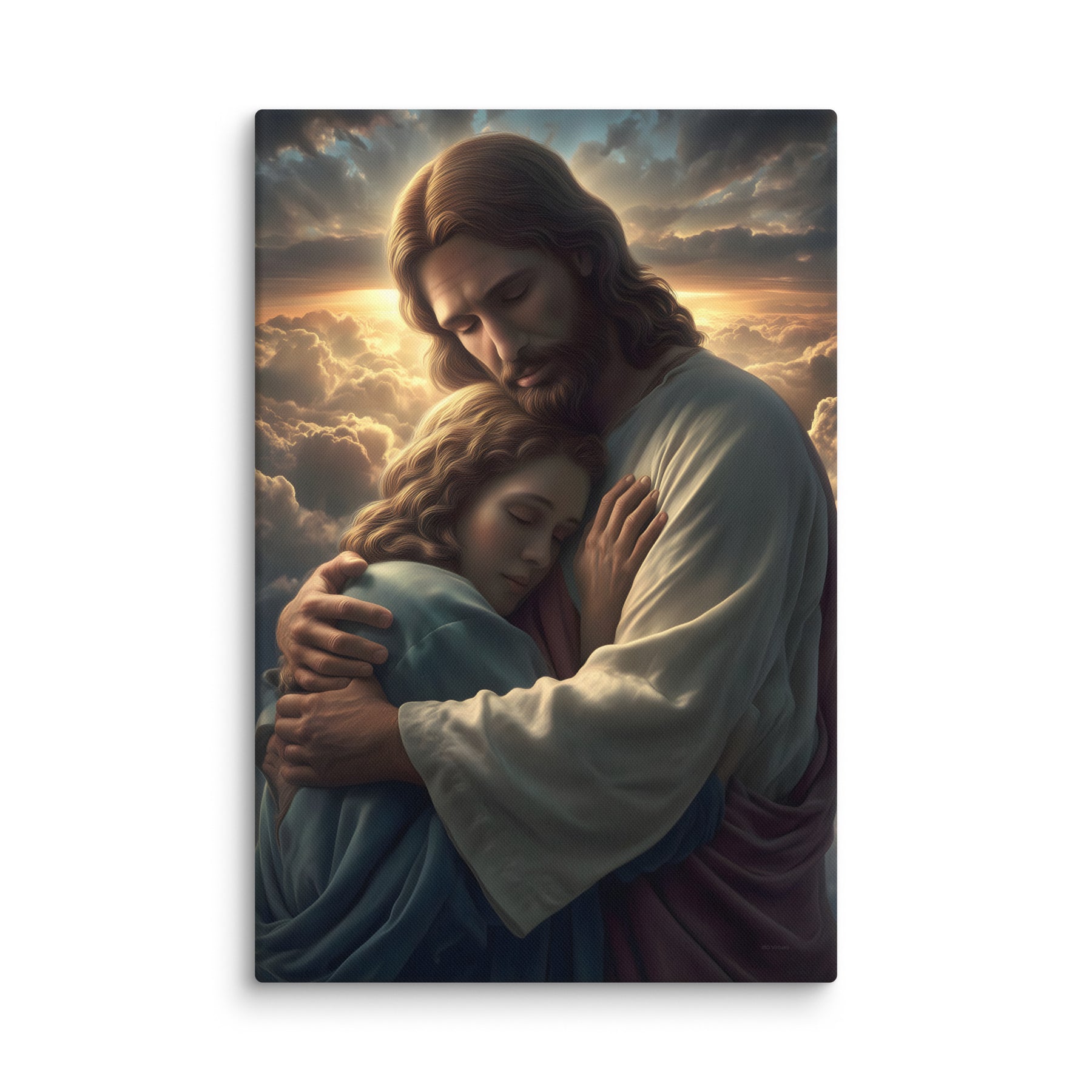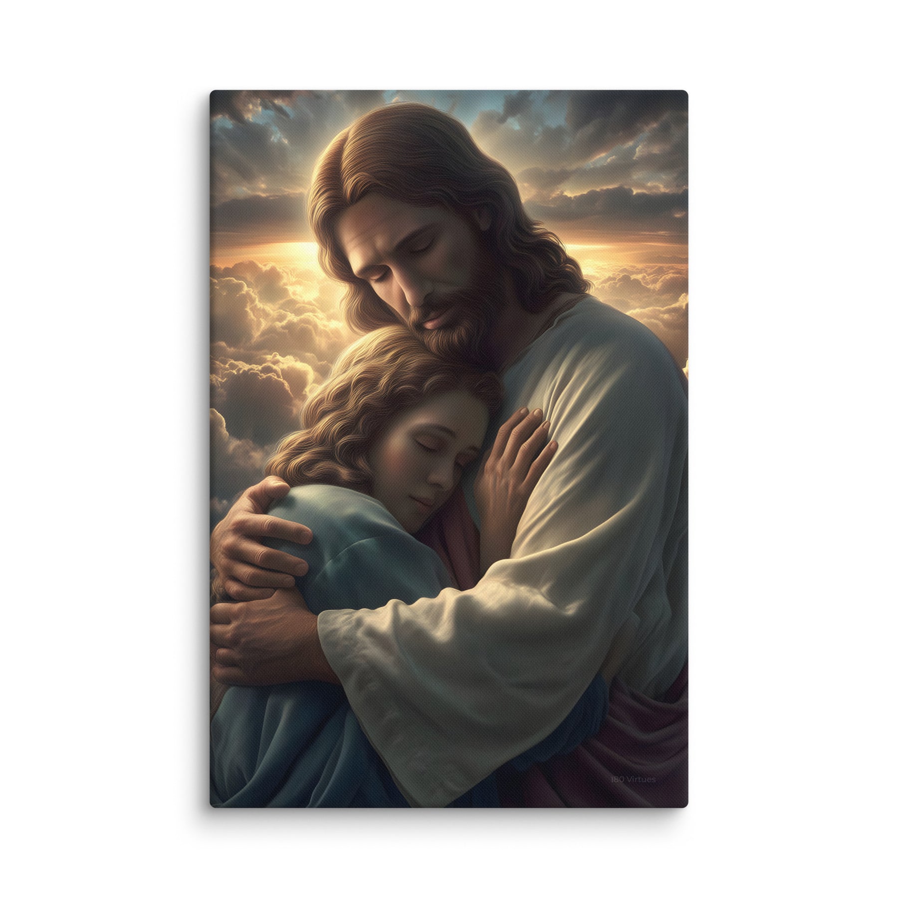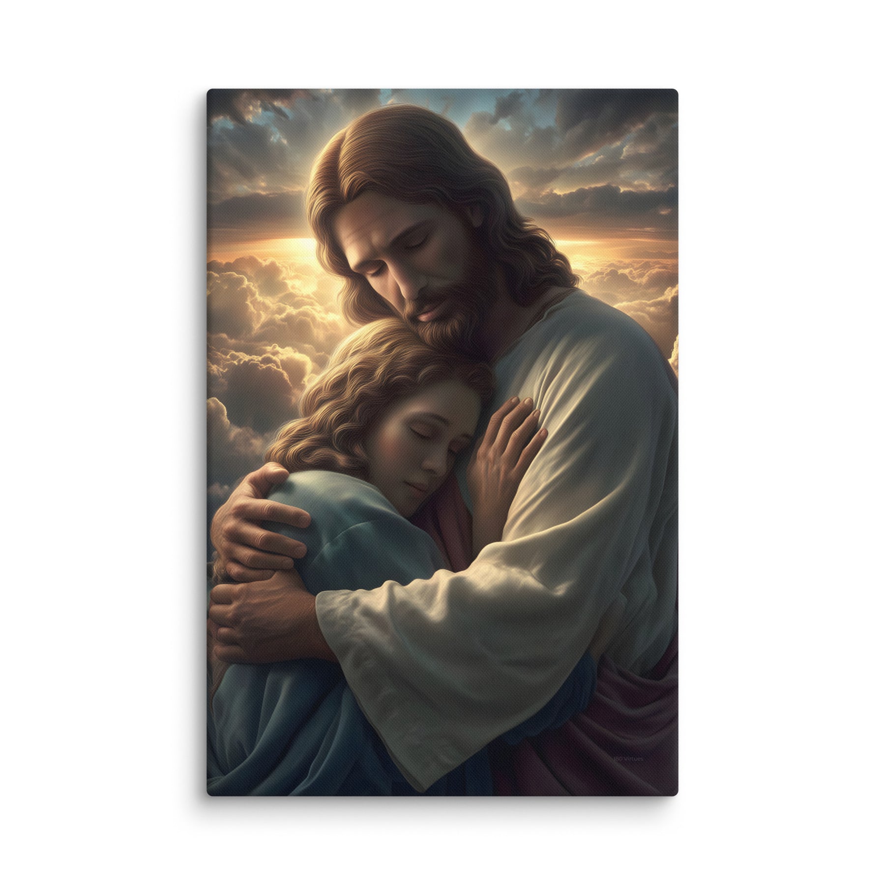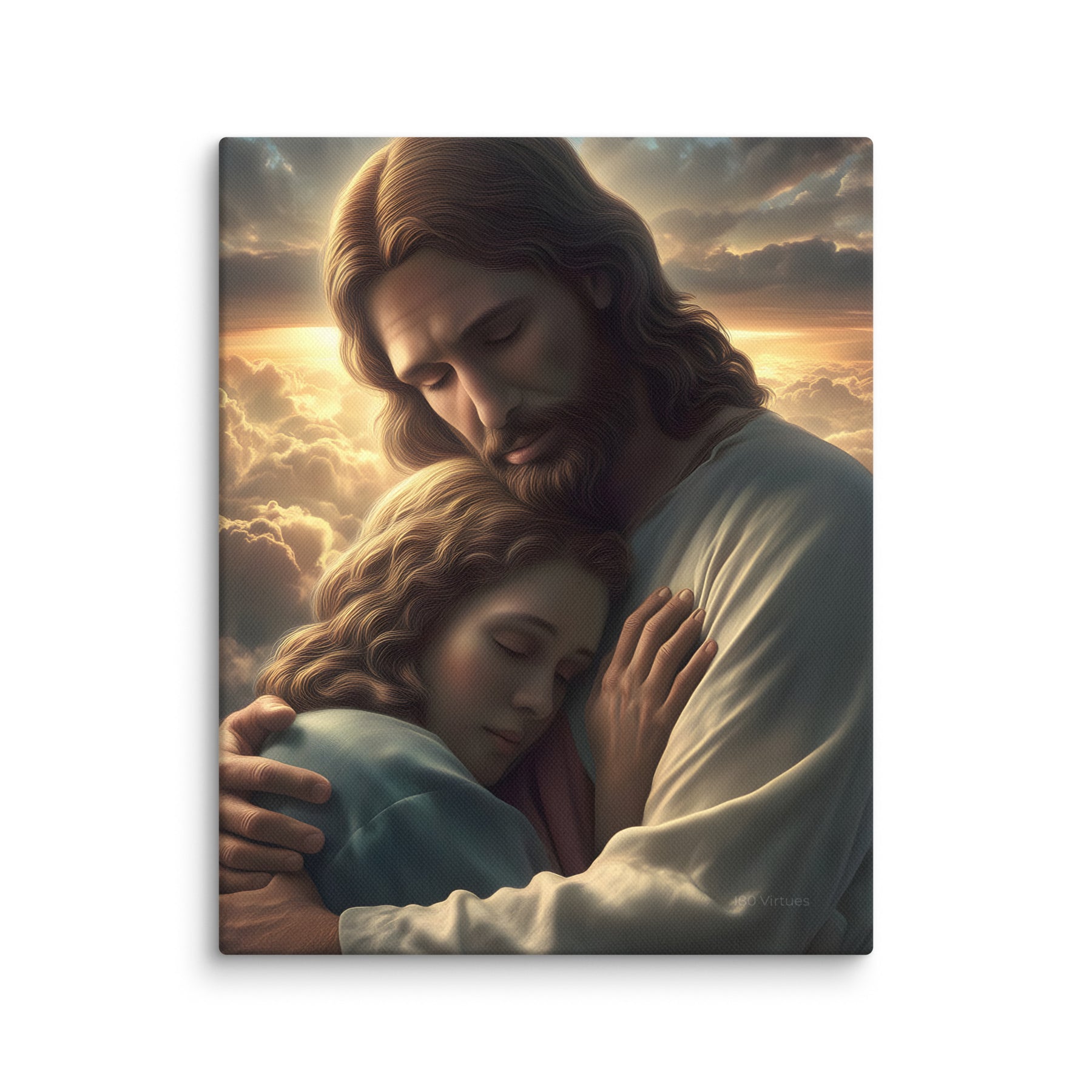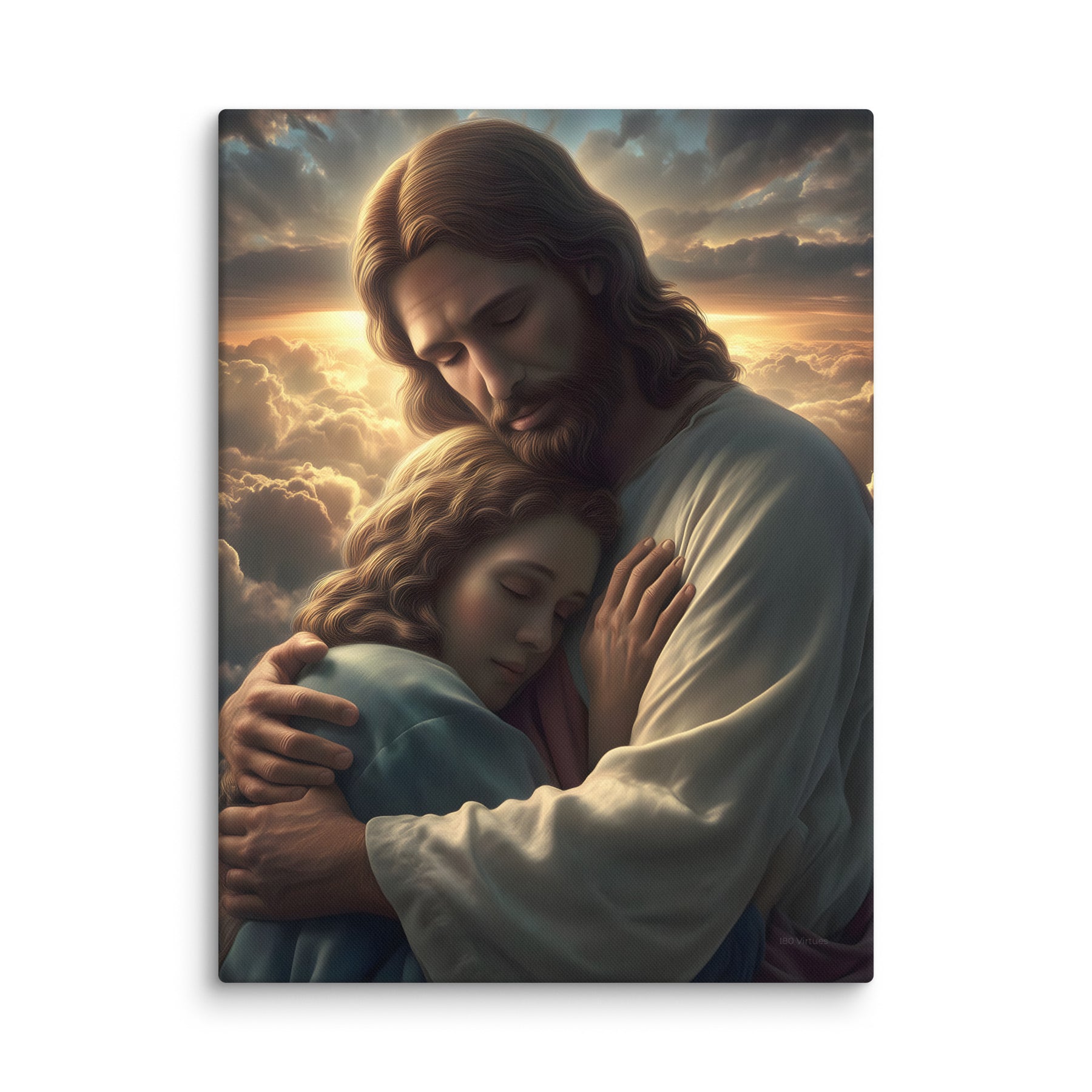 This piece is a powerful reminder that Jesus does not stand at a distance from our pain. He steps into it. He surrounds us. He carries us. When life overwhelms, when grief feels too heavy, when you don’t know how to take the next step—His embrace becomes your shelter. Displaying this artwork offers a daily whisper of truth: you are never forgotten, never abandoned, never unloved. In every storm, the Savior holds you close.