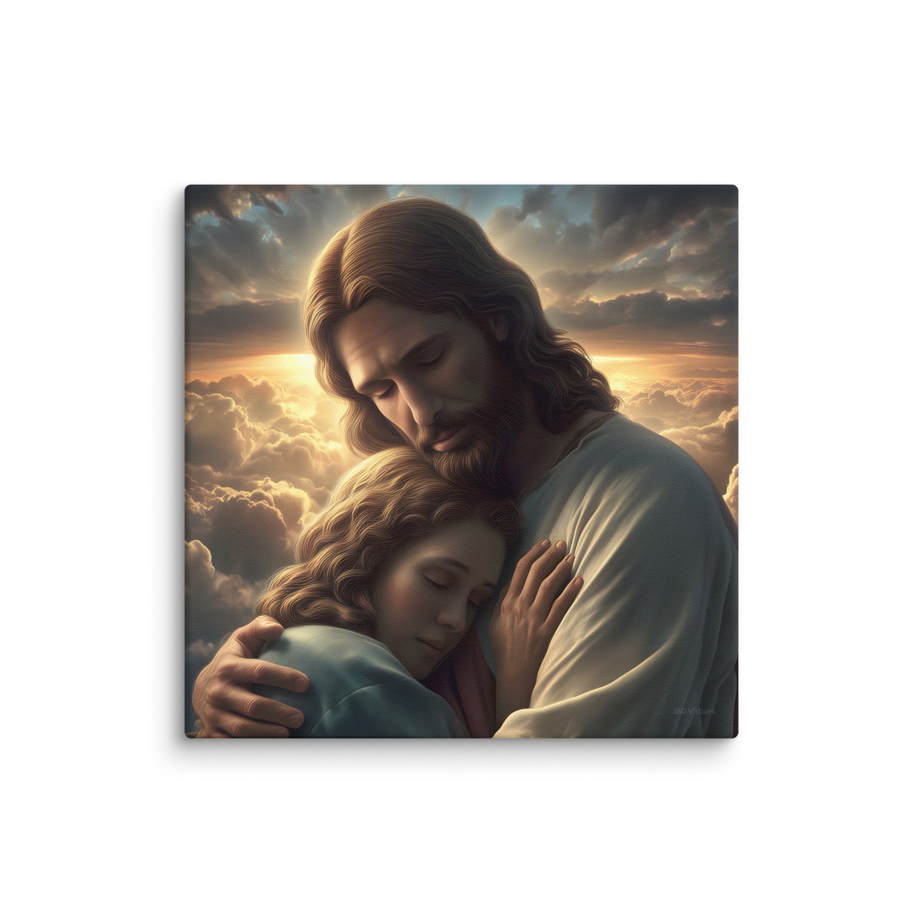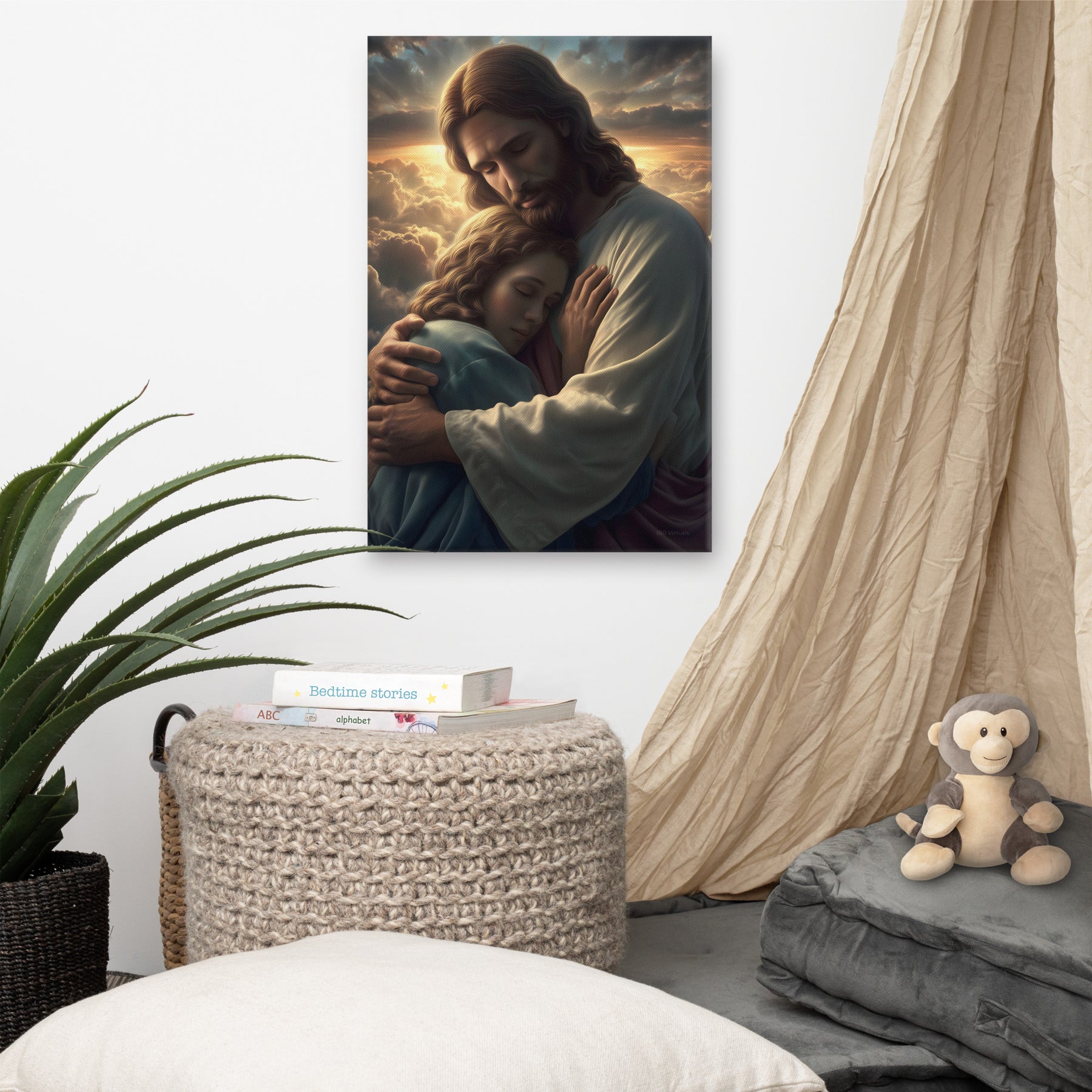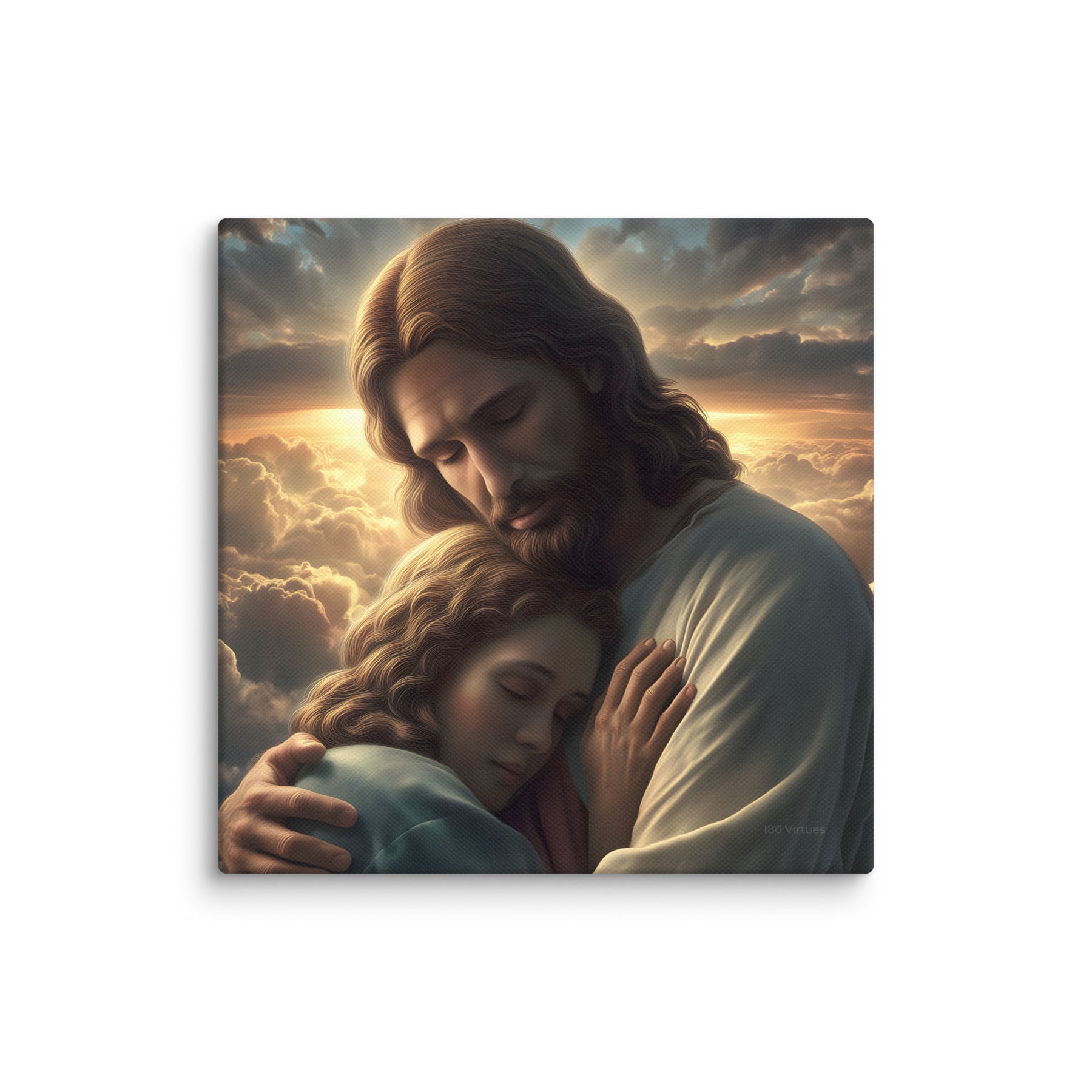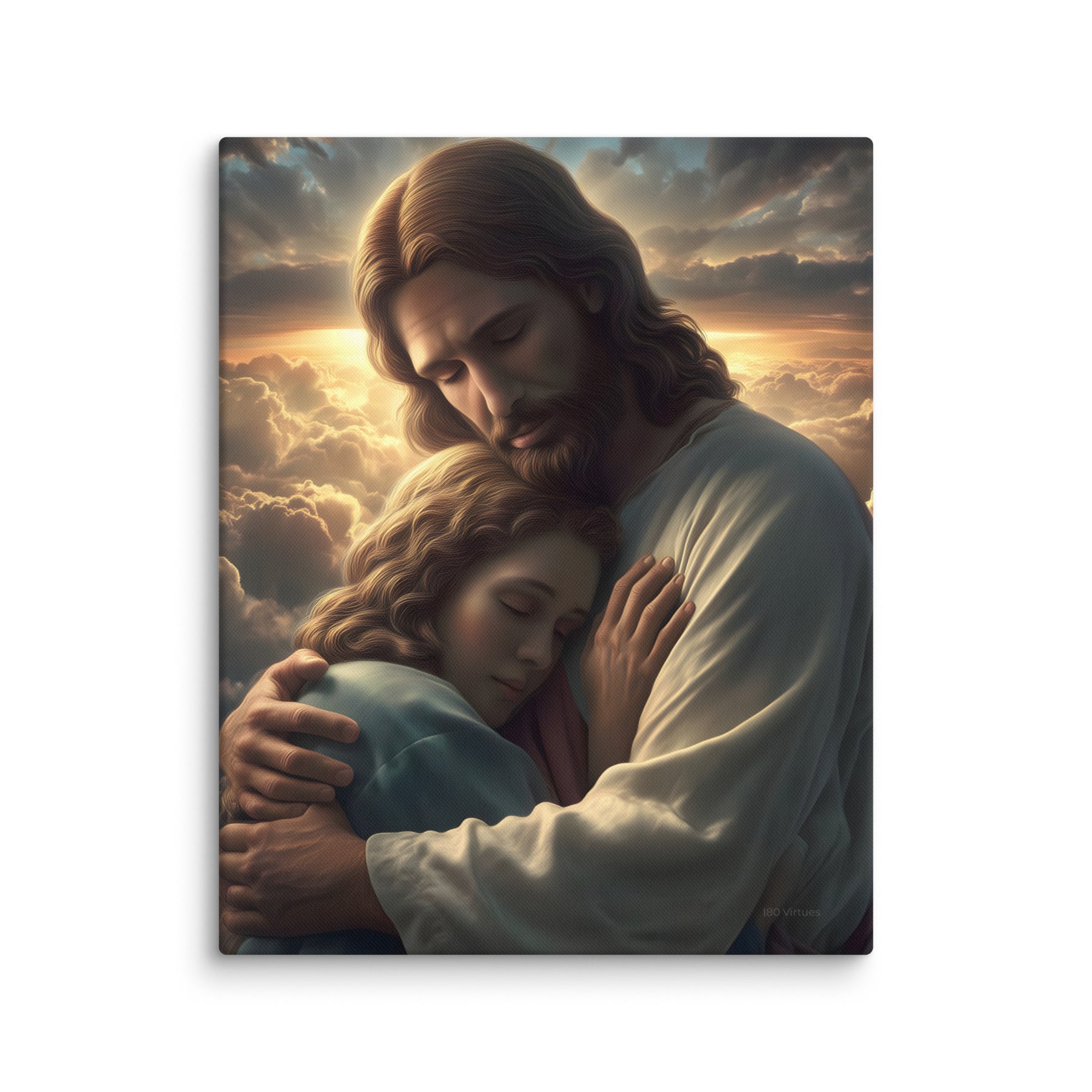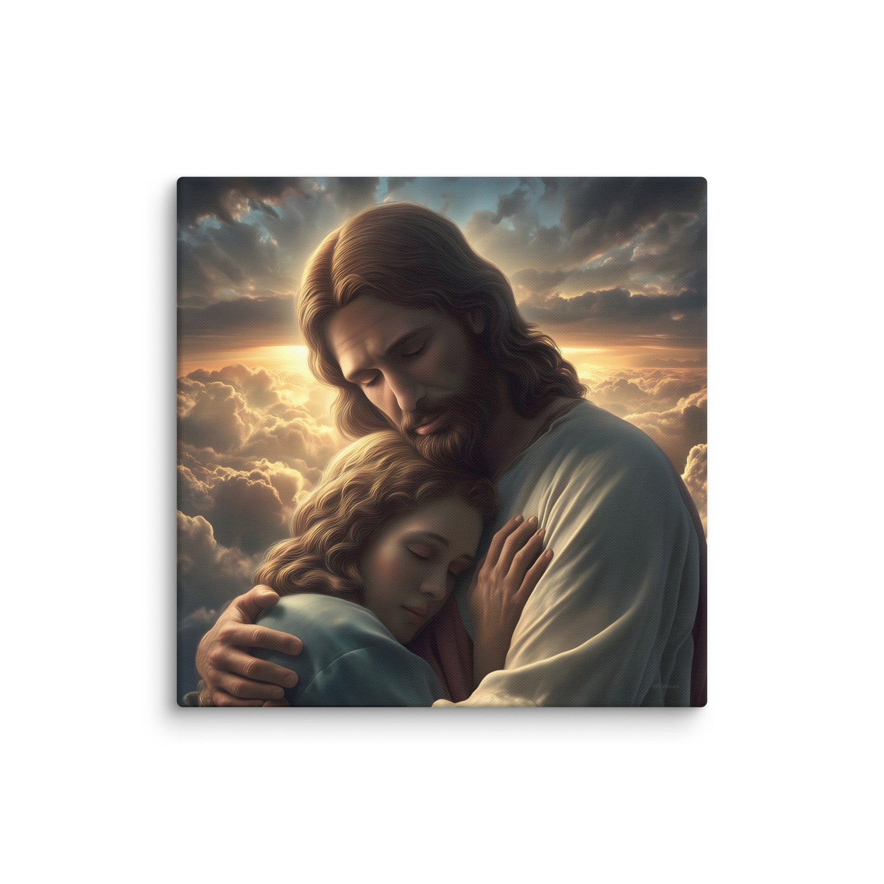 This piece is a powerful reminder that Jesus does not stand at a distance from our pain. He steps into it. He surrounds us. He carries us. When life overwhelms, when grief feels too heavy, when you don’t know how to take the next step—His embrace becomes your shelter. Displaying this artwork offers a daily whisper of truth: you are never forgotten, never abandoned, never unloved. In every storm, the Savior holds you close.
