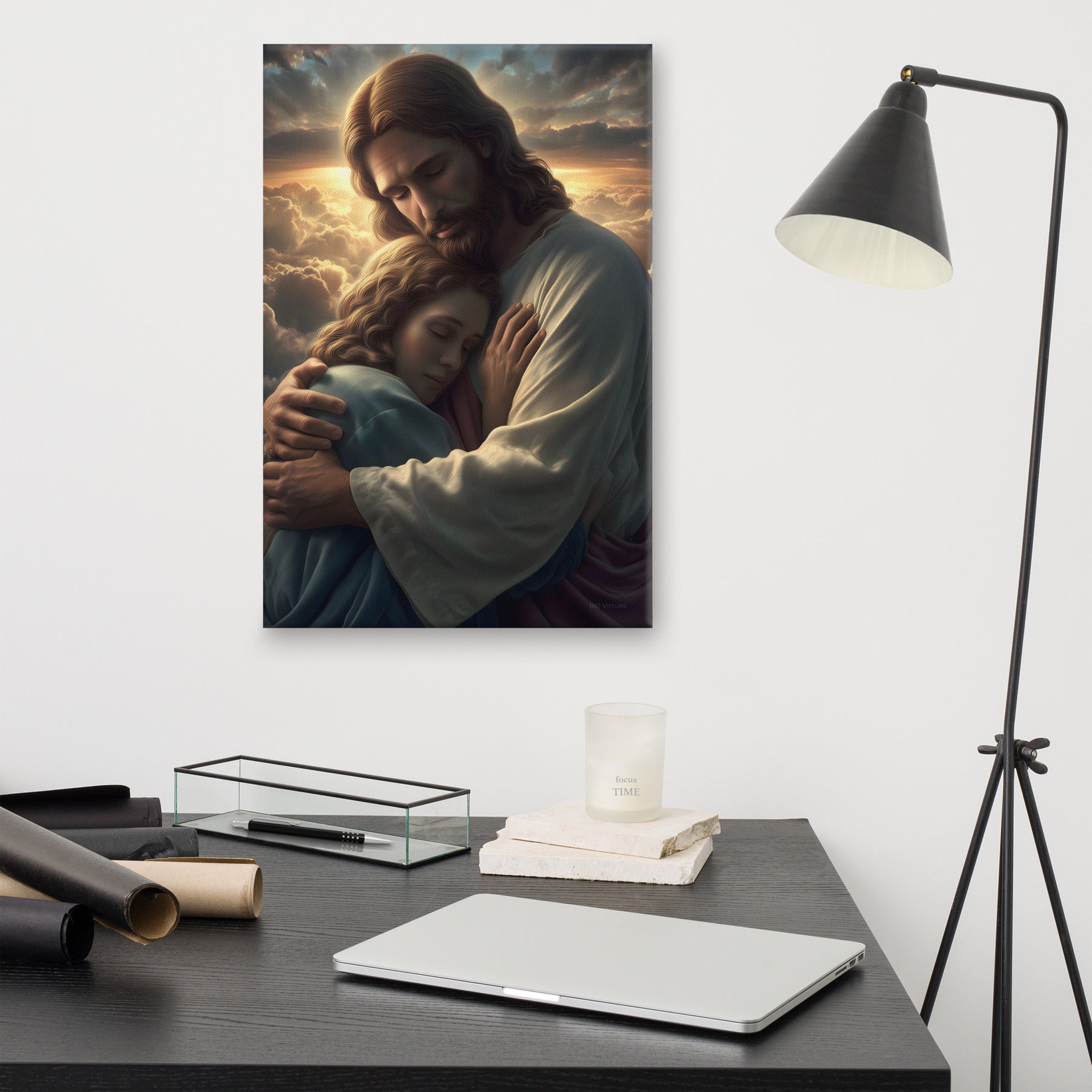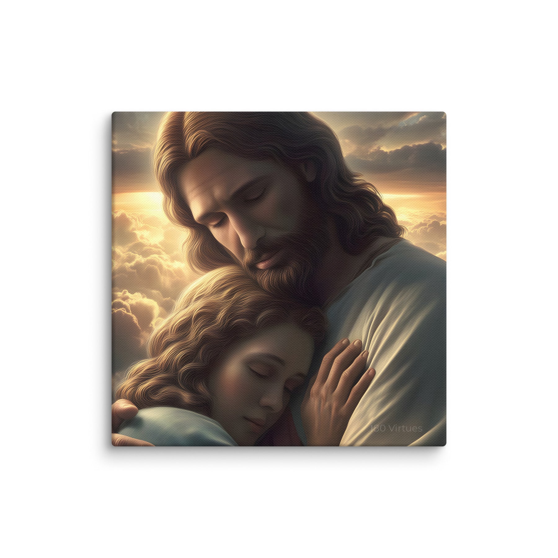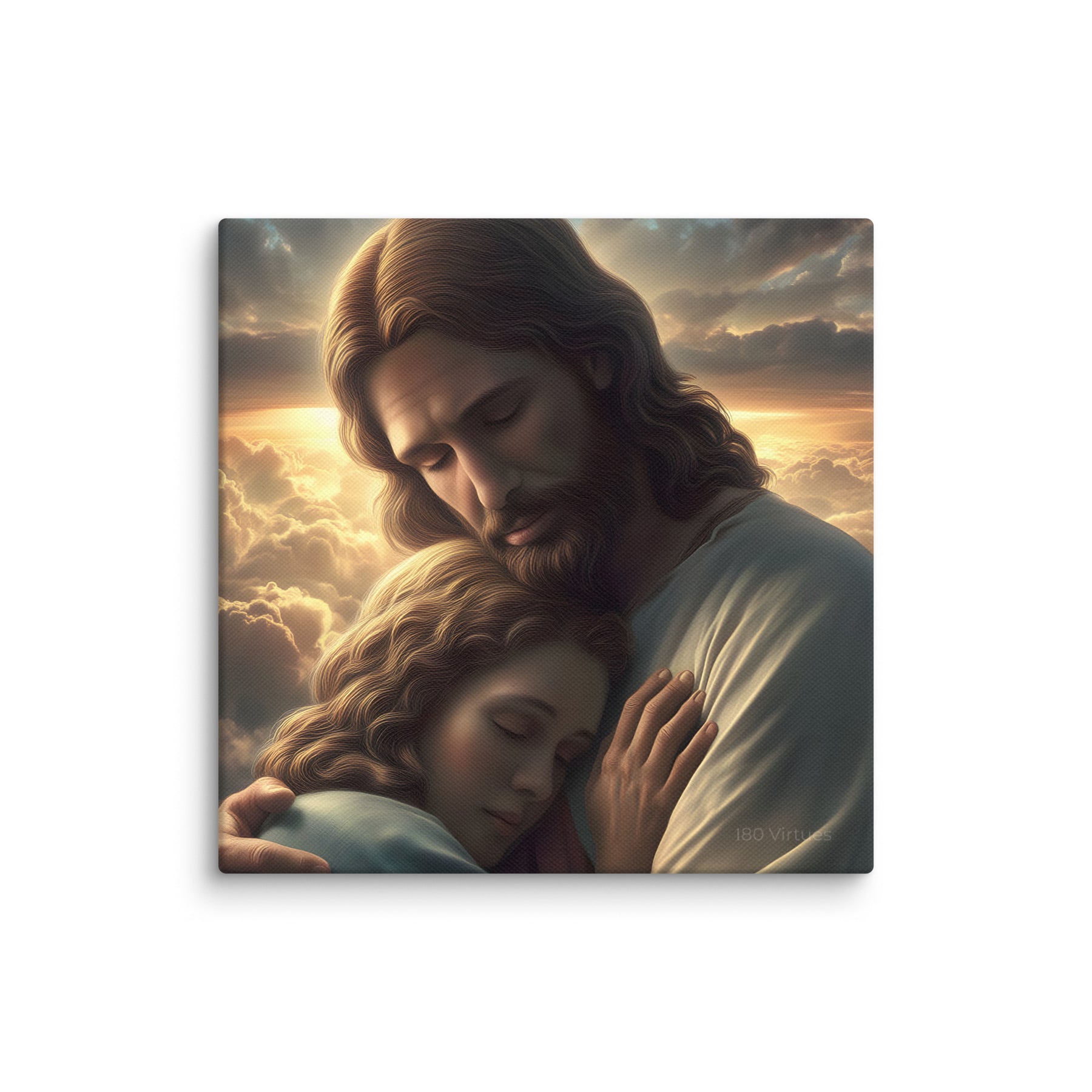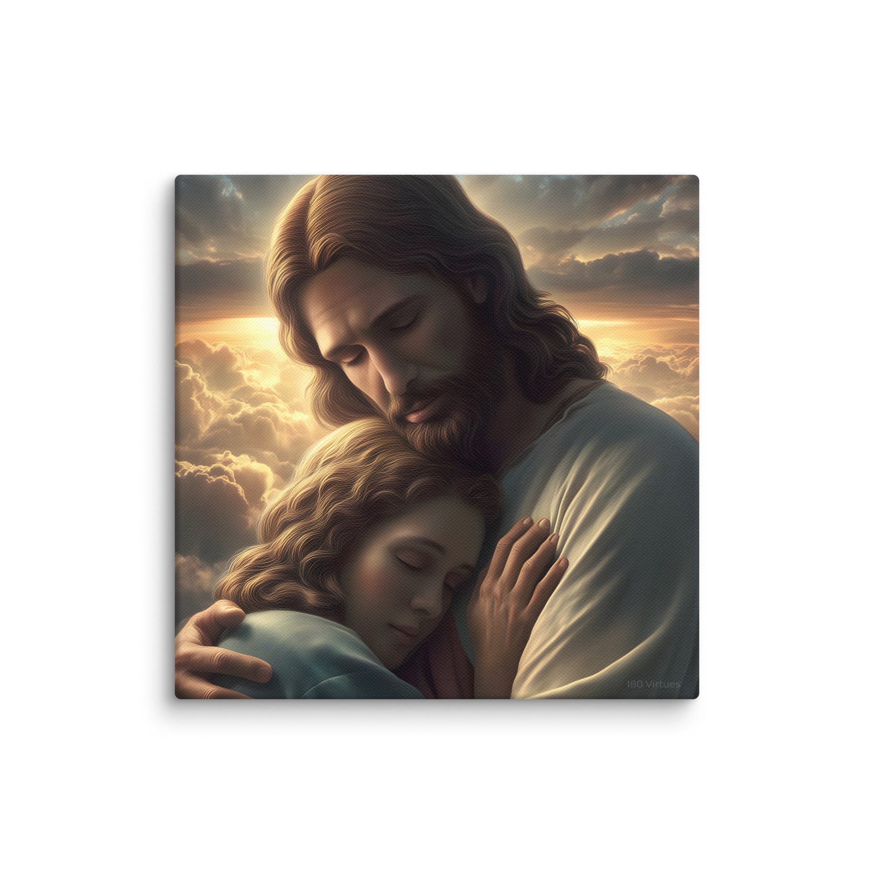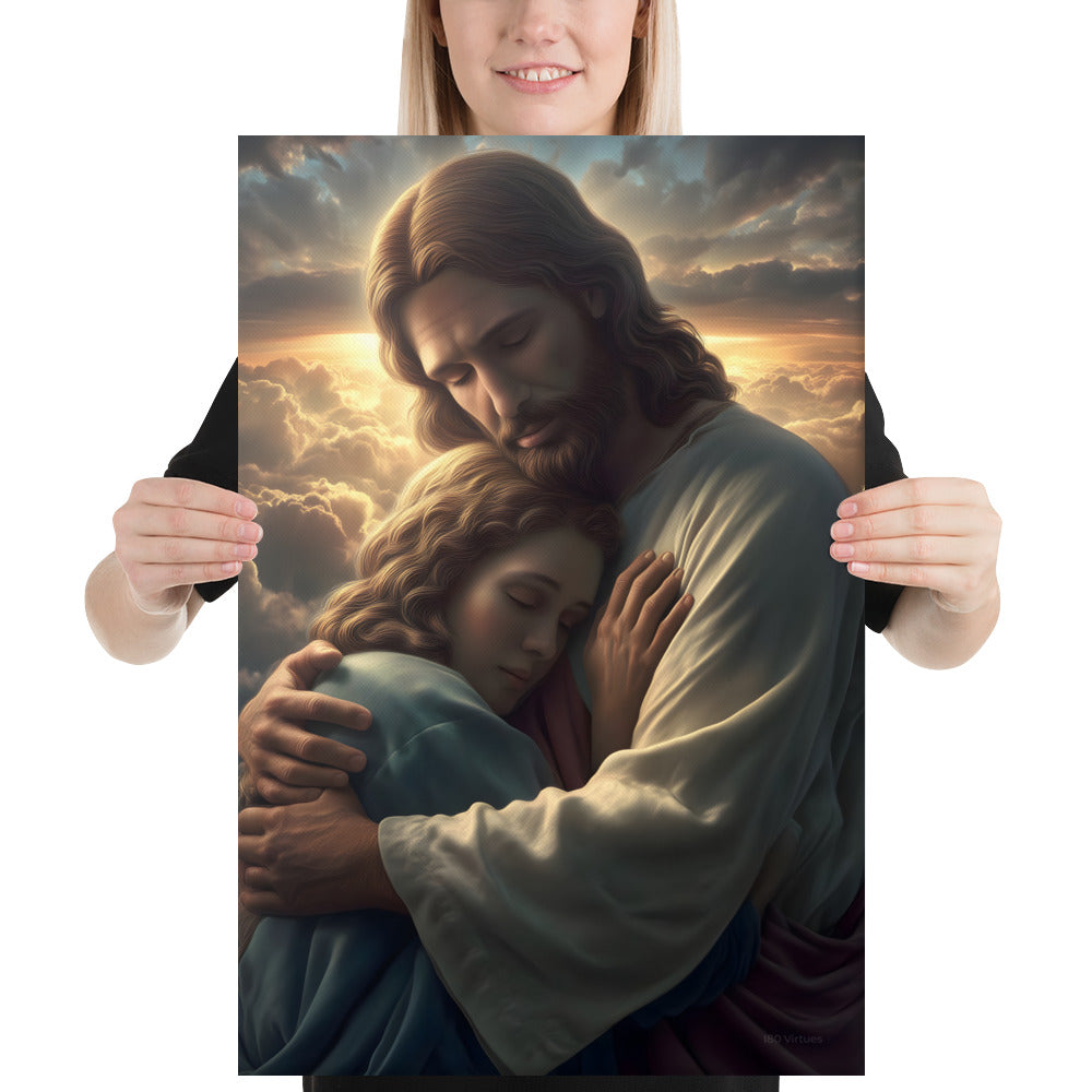 This piece is a powerful reminder that Jesus does not stand at a distance from our pain. He steps into it. He surrounds us. He carries us. When life overwhelms, when grief feels too heavy, when you don’t know how to take the next step—His embrace becomes your shelter. Displaying this artwork offers a daily whisper of truth: you are never forgotten, never abandoned, never unloved. In every storm, the Savior holds you close.