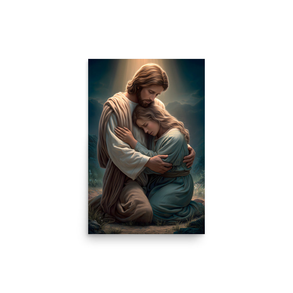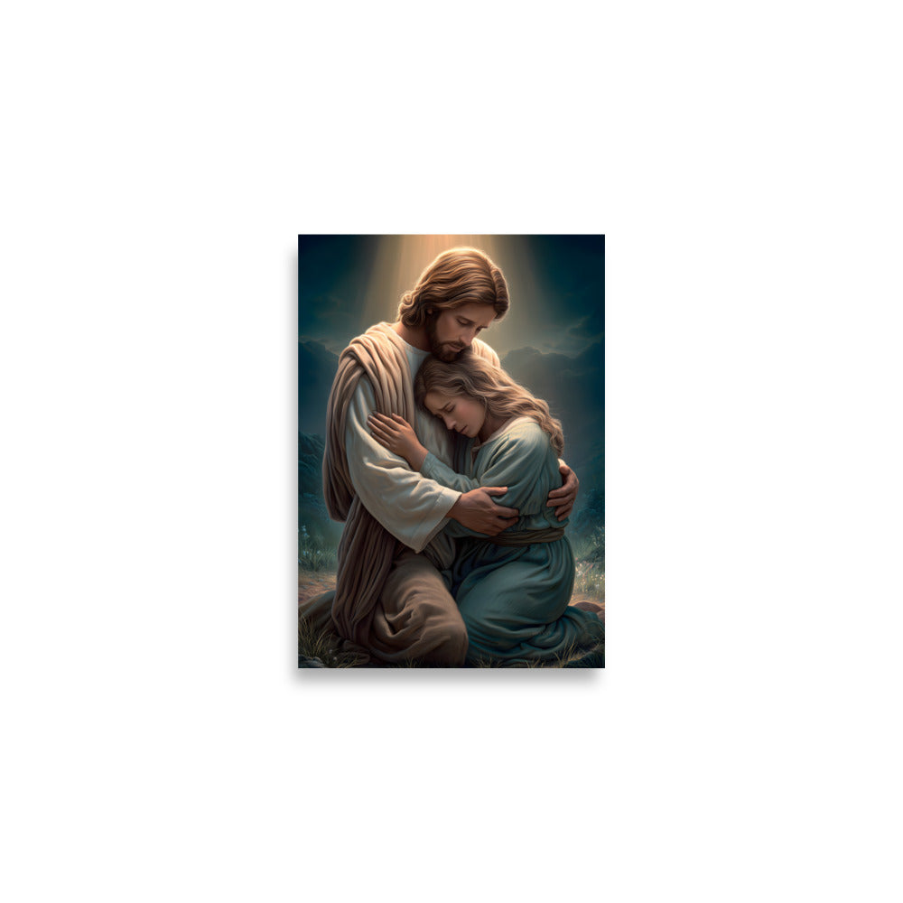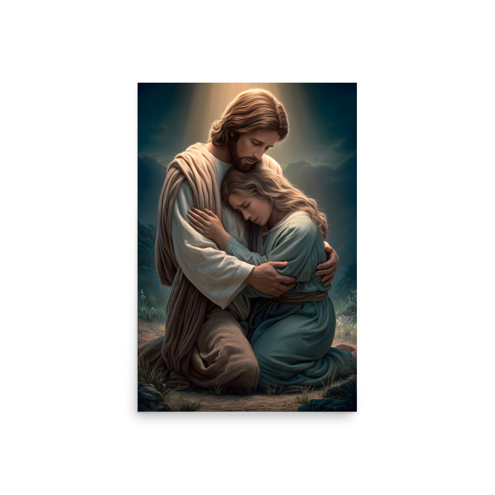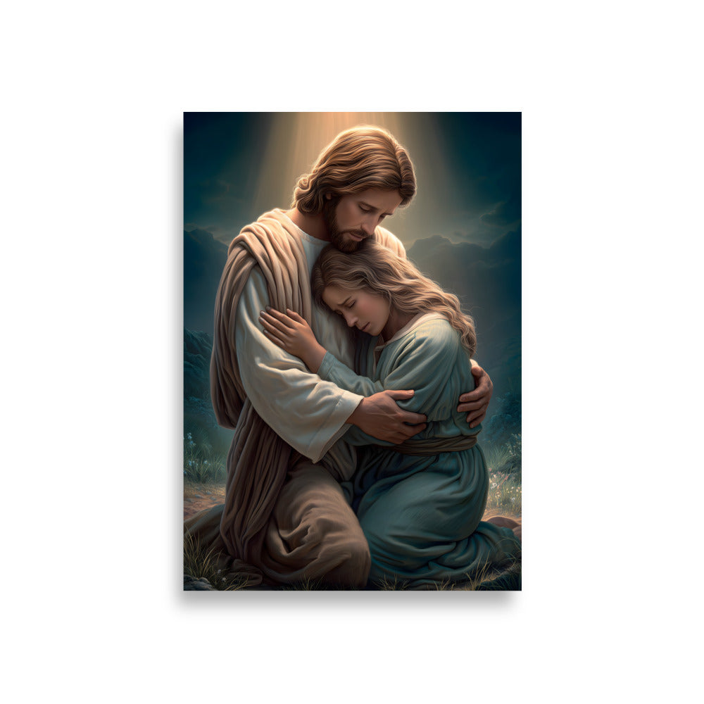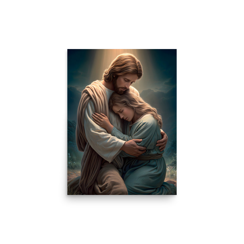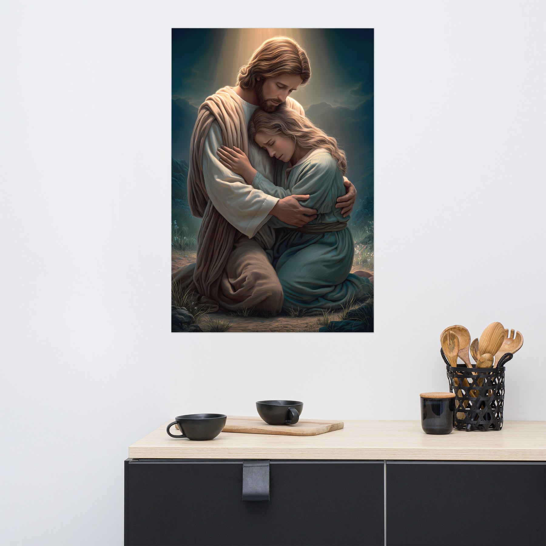 Bring solace, strength, and sacred intimacy into your space with this moving museum-quality poster depicting Jesus Christ embracing a weary soul beneath a soft, heaven-sent glow. Gentle light pours down from above, illuminating His bowed head and tender expression as He surrounds her with unwavering care. The muted earth tones, flowing garments, and tranquil landscape create a quiet, reverent atmosphere that invites stillness, reflection, and trust.