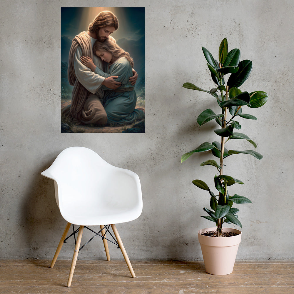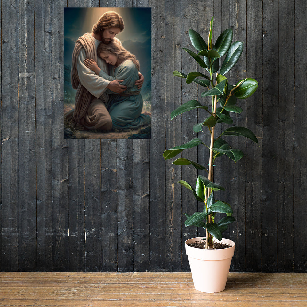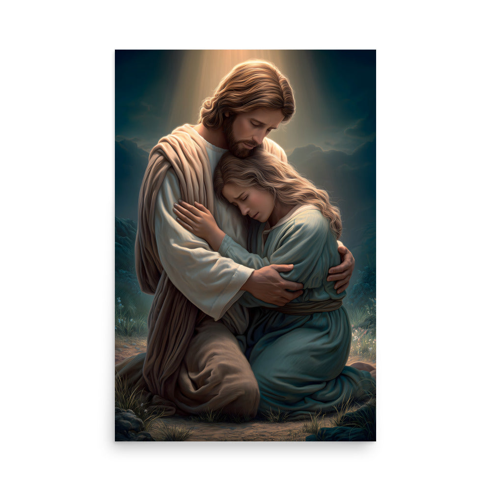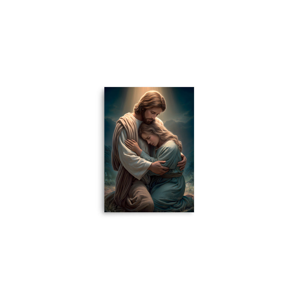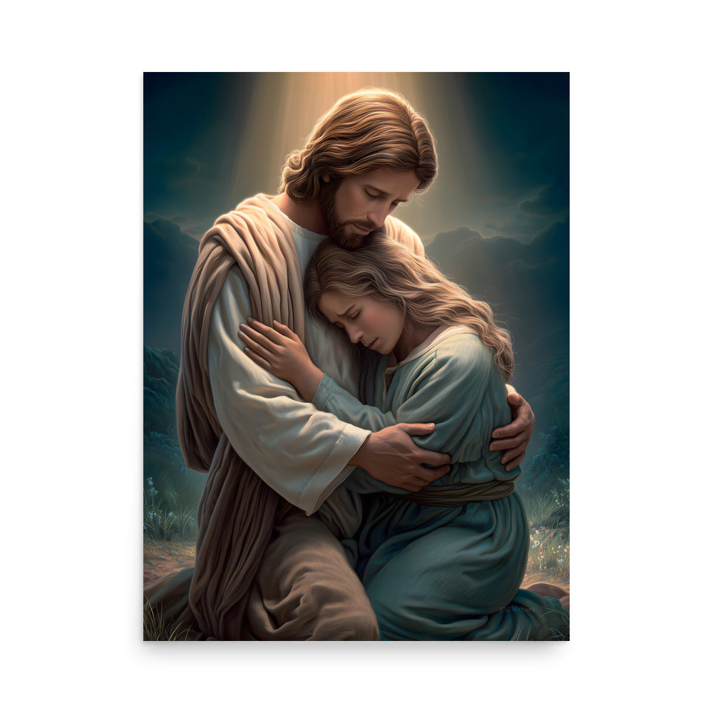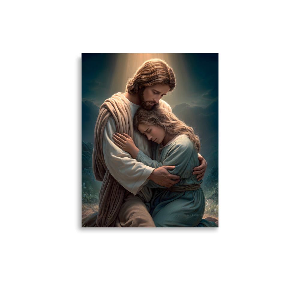 Bring solace, strength, and sacred intimacy into your space with this moving museum-quality poster depicting Jesus Christ embracing a weary soul beneath a soft, heaven-sent glow. Gentle light pours down from above, illuminating His bowed head and tender expression as He surrounds her with unwavering care. The muted earth tones, flowing garments, and tranquil landscape create a quiet, reverent atmosphere that invites stillness, reflection, and trust.
