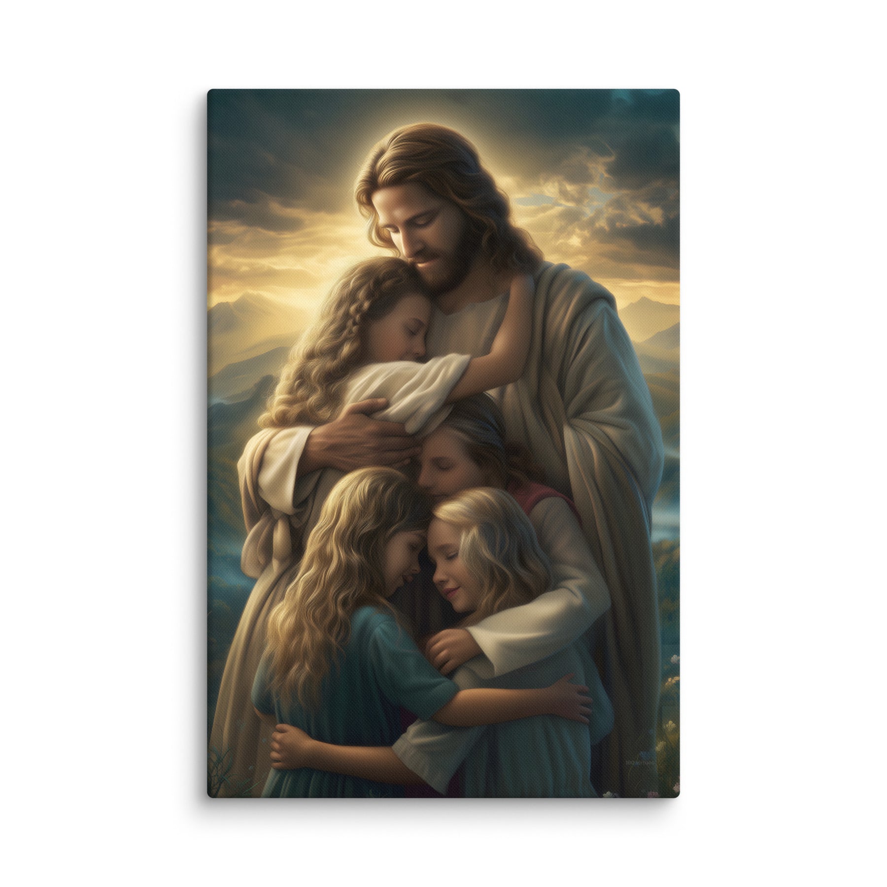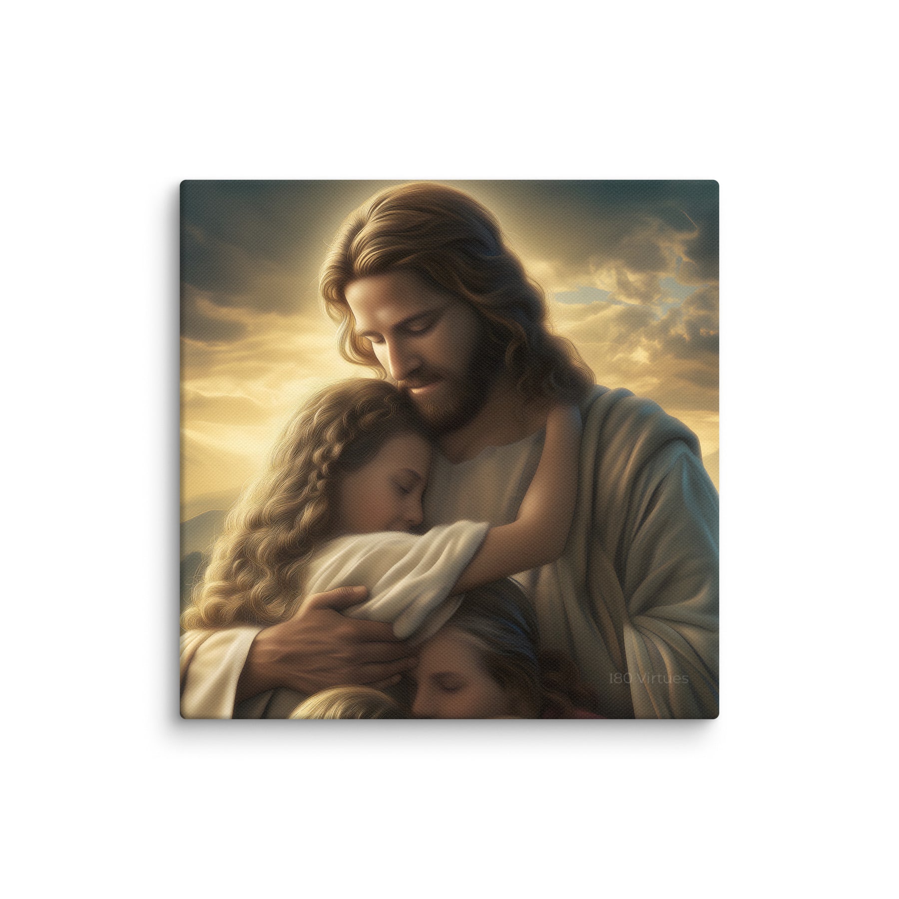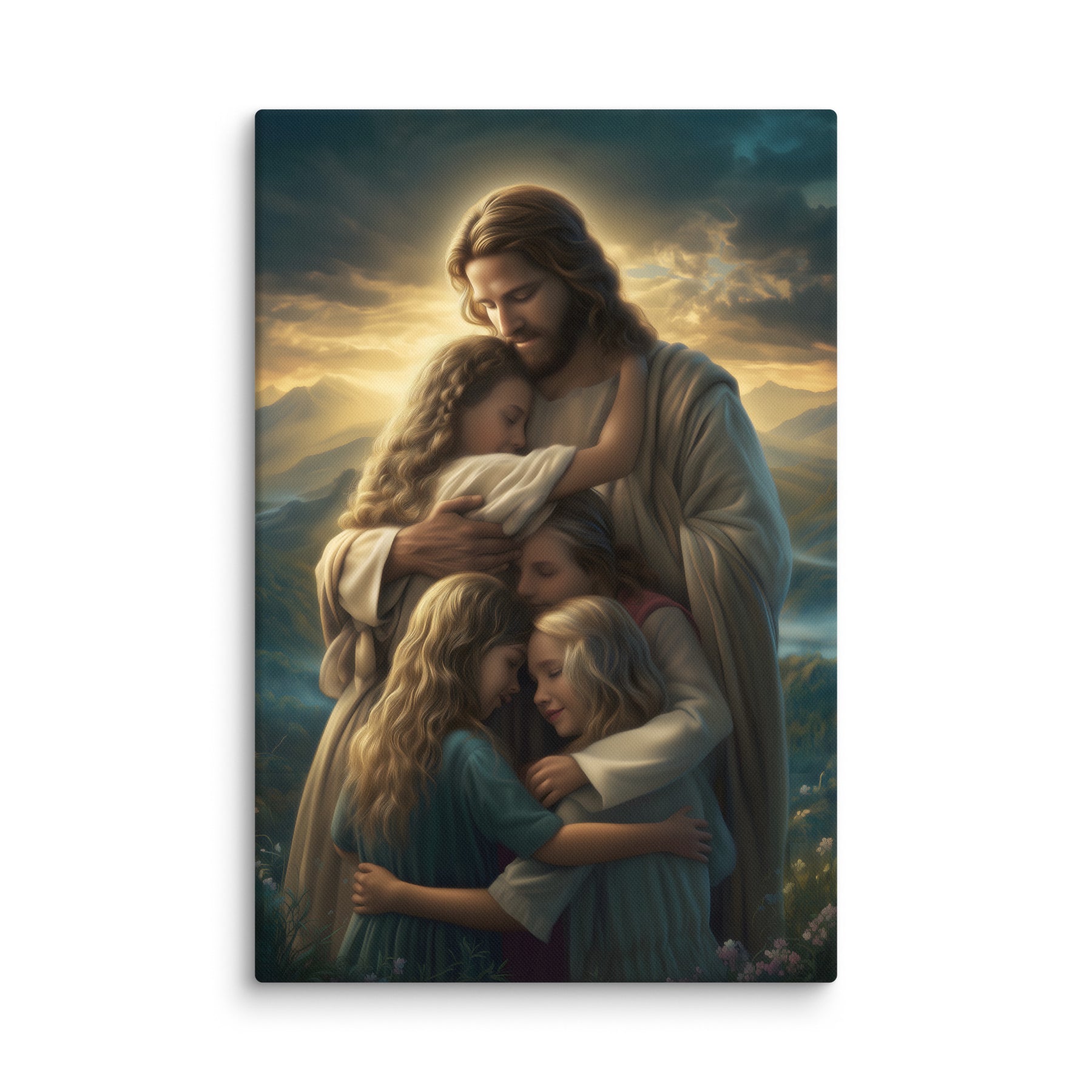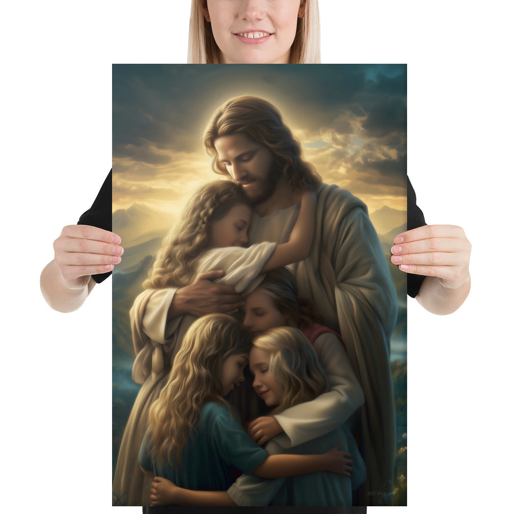 This artwork brings a sense of peace and emotional healing into any home or space. It reminds families, parents, and children alike that Jesus’ love is personal, protective, and ever near. Perfect for nurseries, bedrooms, family rooms, Christian schools, and church classrooms, this canvas fills the room with hope and the sweet message that no matter where we are or what we face, we are forever held in His loving arms.