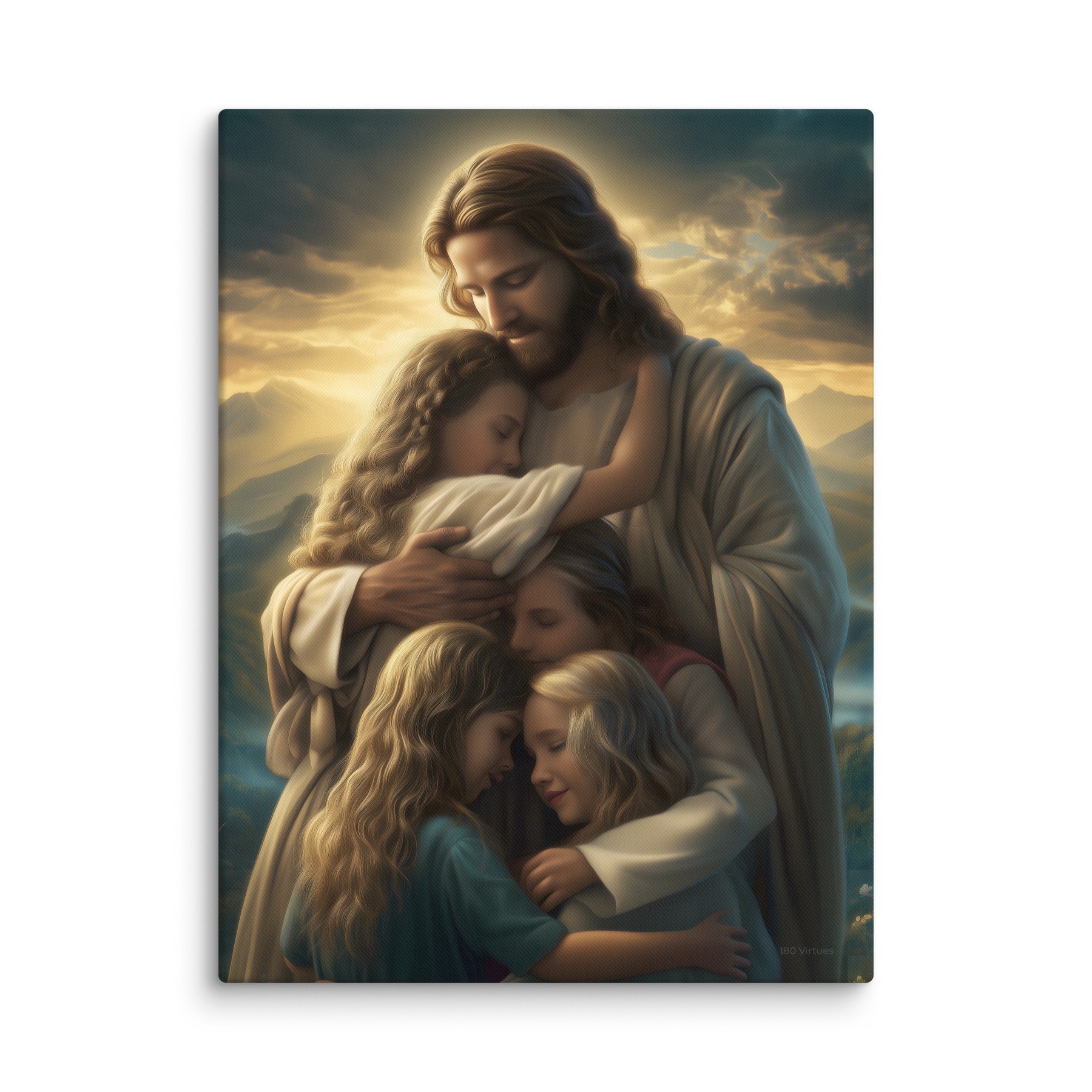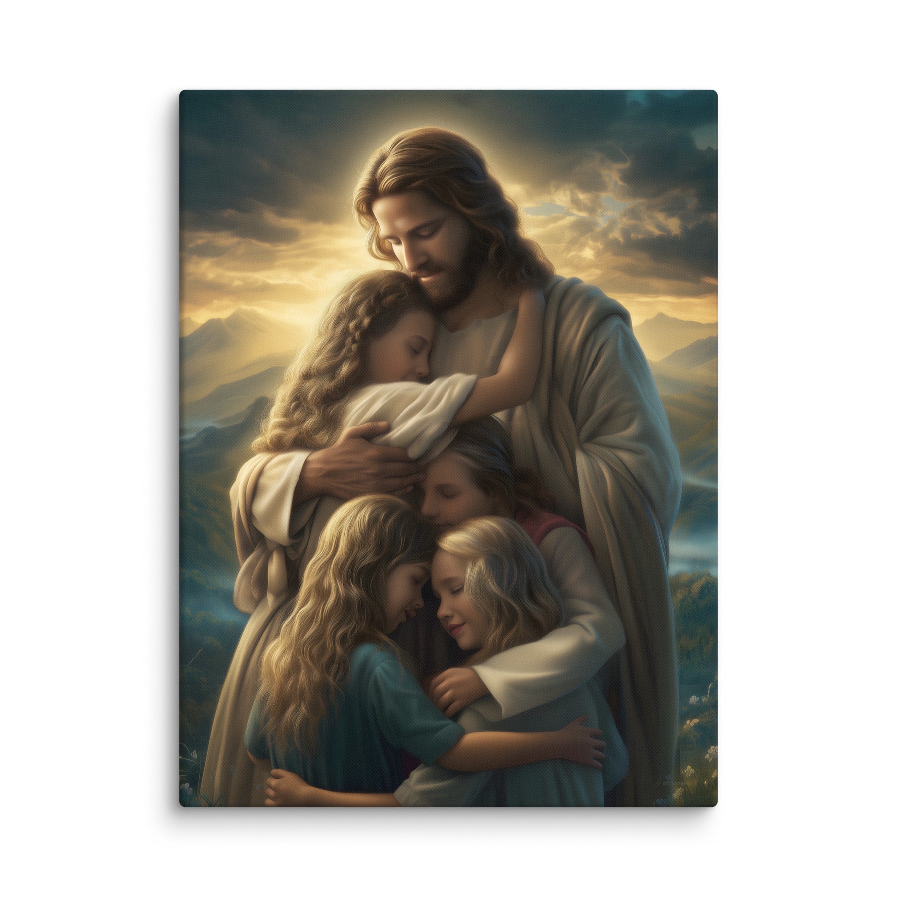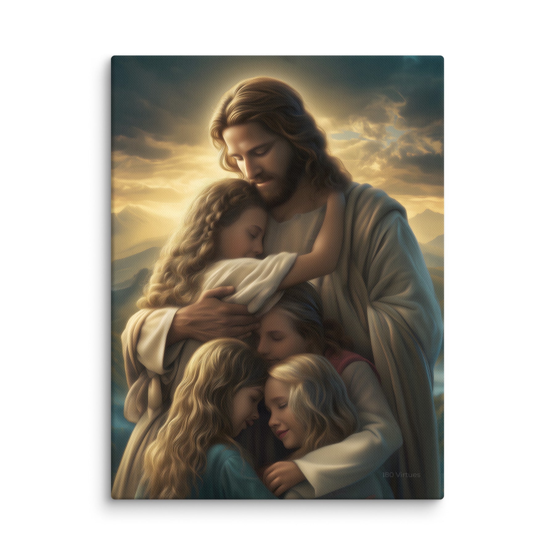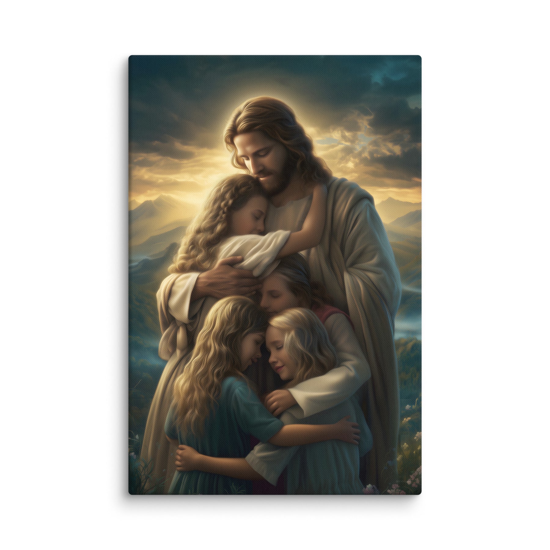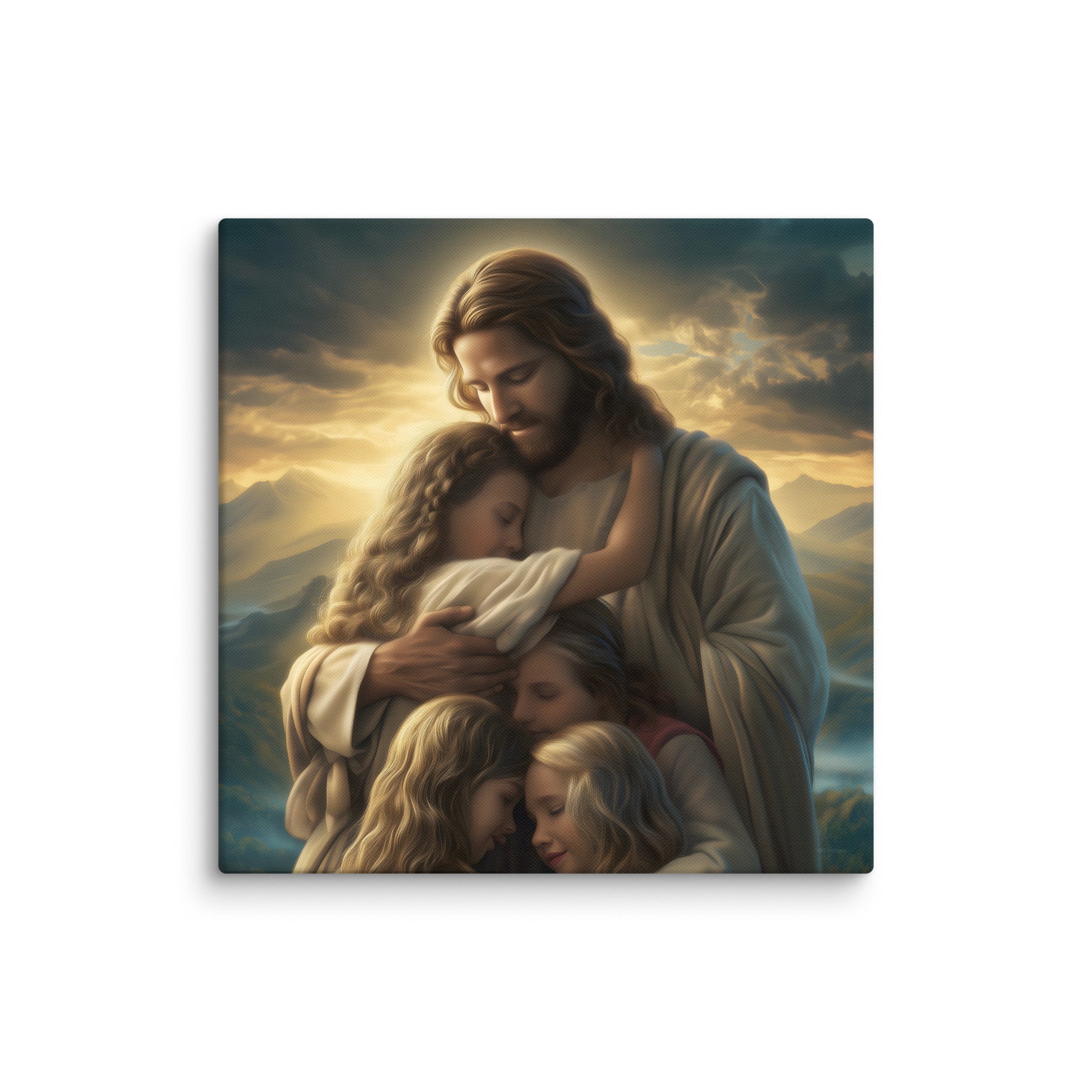This artwork brings a sense of peace and emotional healing into any home or space. It reminds families, parents, and children alike that Jesus’ love is personal, protective, and ever near. Perfect for nurseries, bedrooms, family rooms, Christian schools, and church classrooms, this canvas fills the room with hope and the sweet message that no matter where we are or what we face, we are forever held in His loving arms.