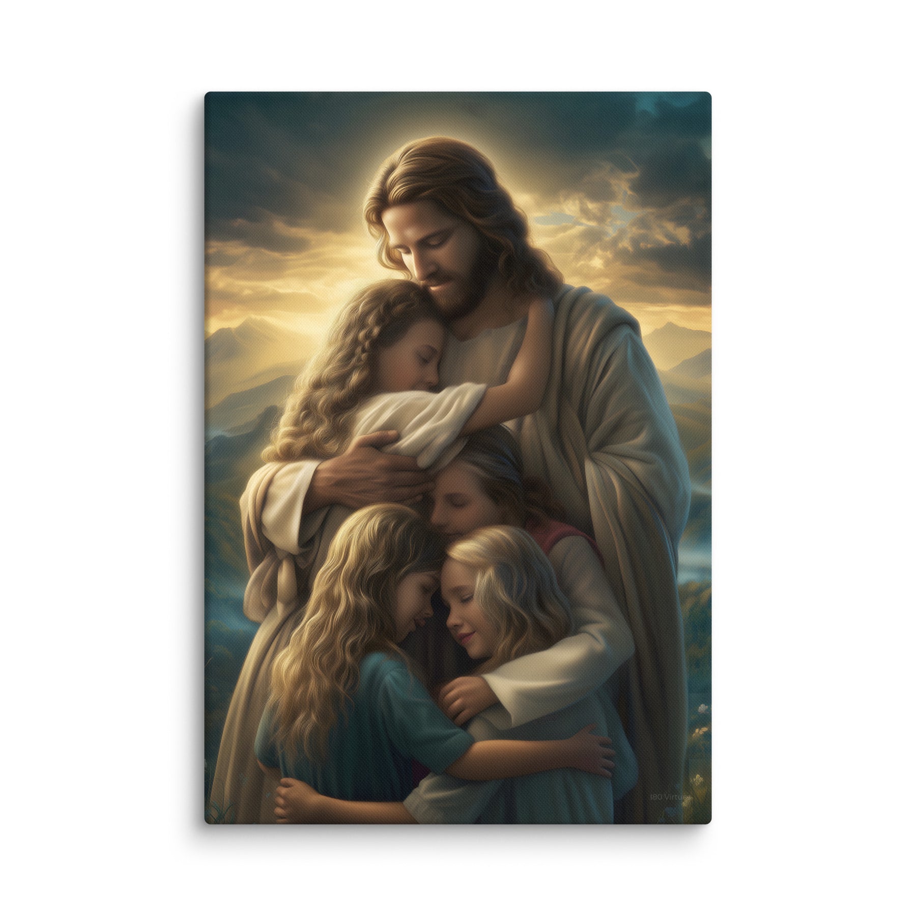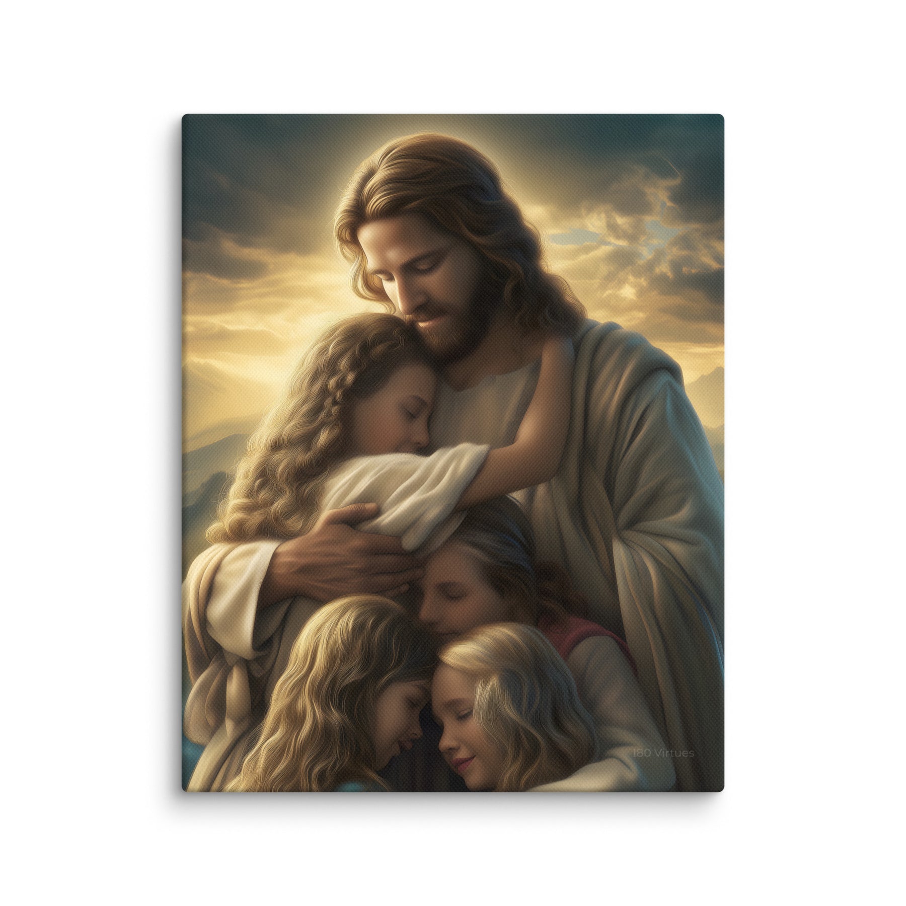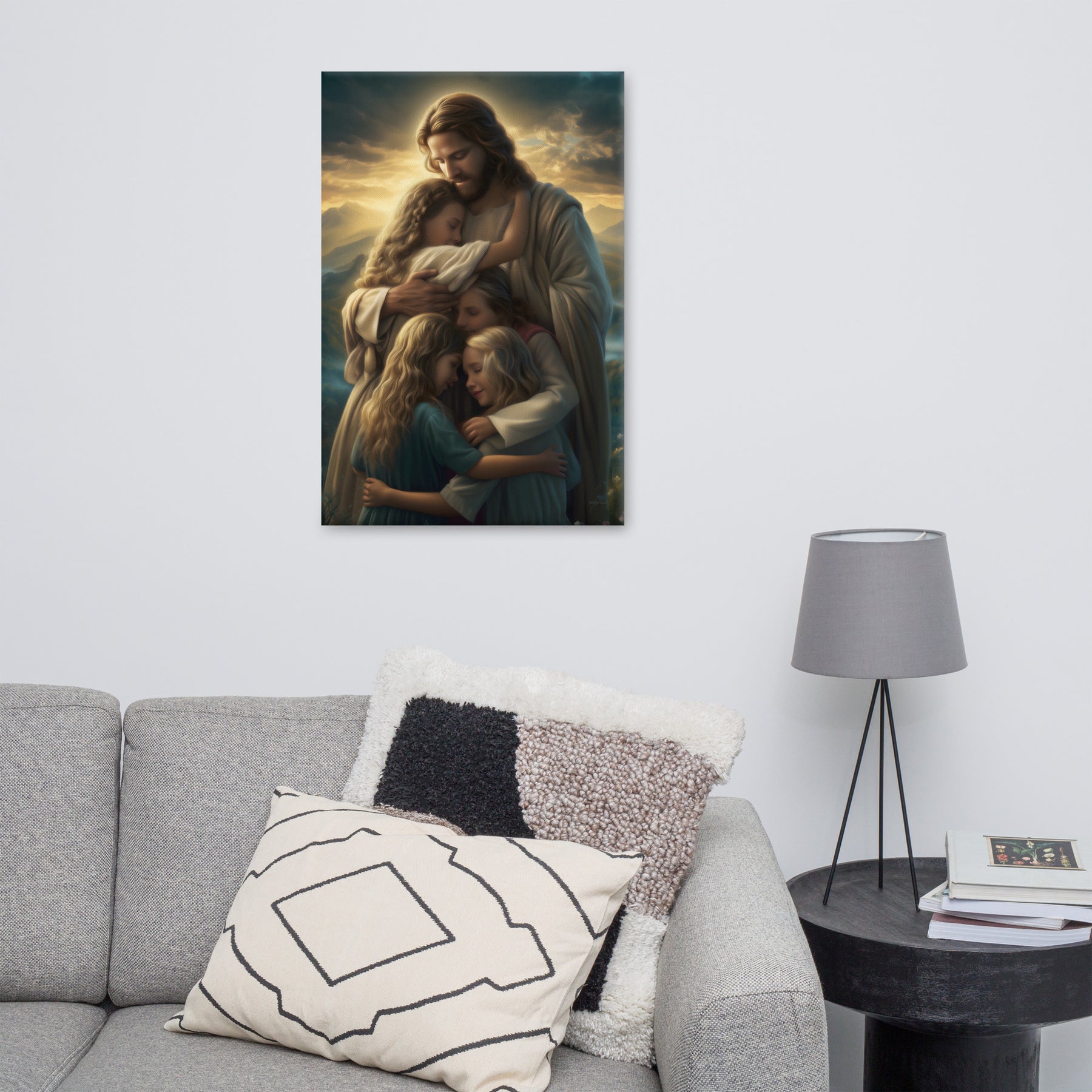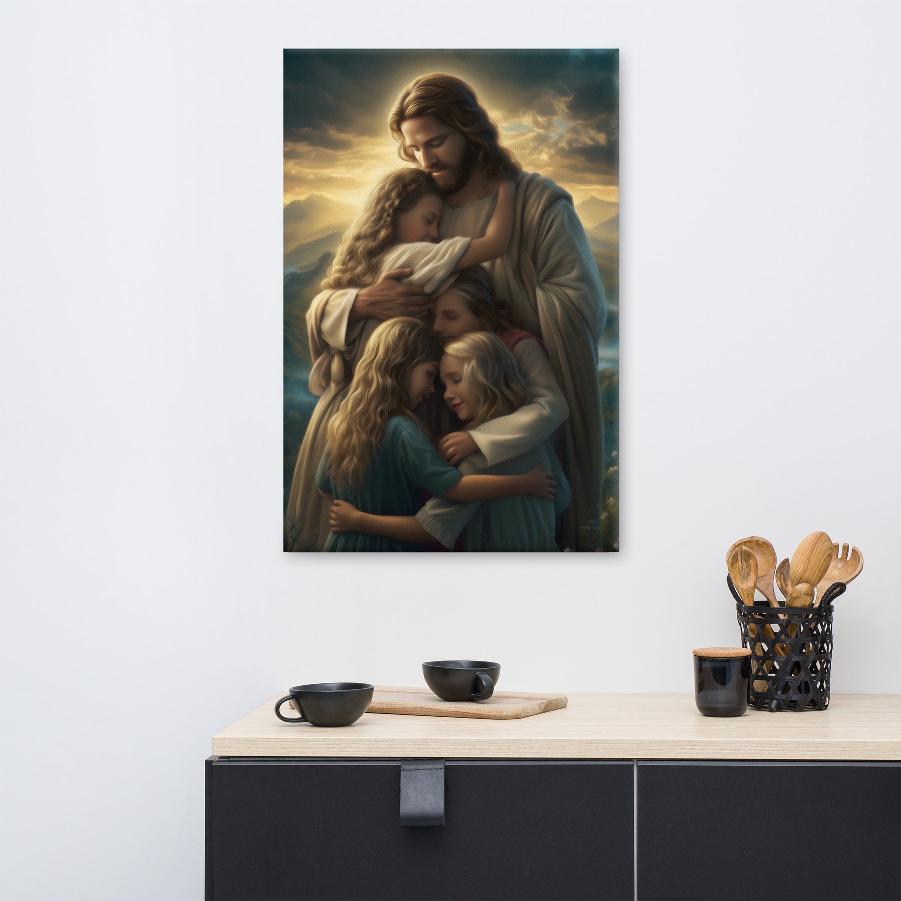 This artwork brings a sense of peace and emotional healing into any home or space. It reminds families, parents, and children alike that Jesus’ love is personal, protective, and ever near. Perfect for nurseries, bedrooms, family rooms, Christian schools, and church classrooms, this canvas fills the room with hope and the sweet message that no matter where we are or what we face, we are forever held in His loving arms.