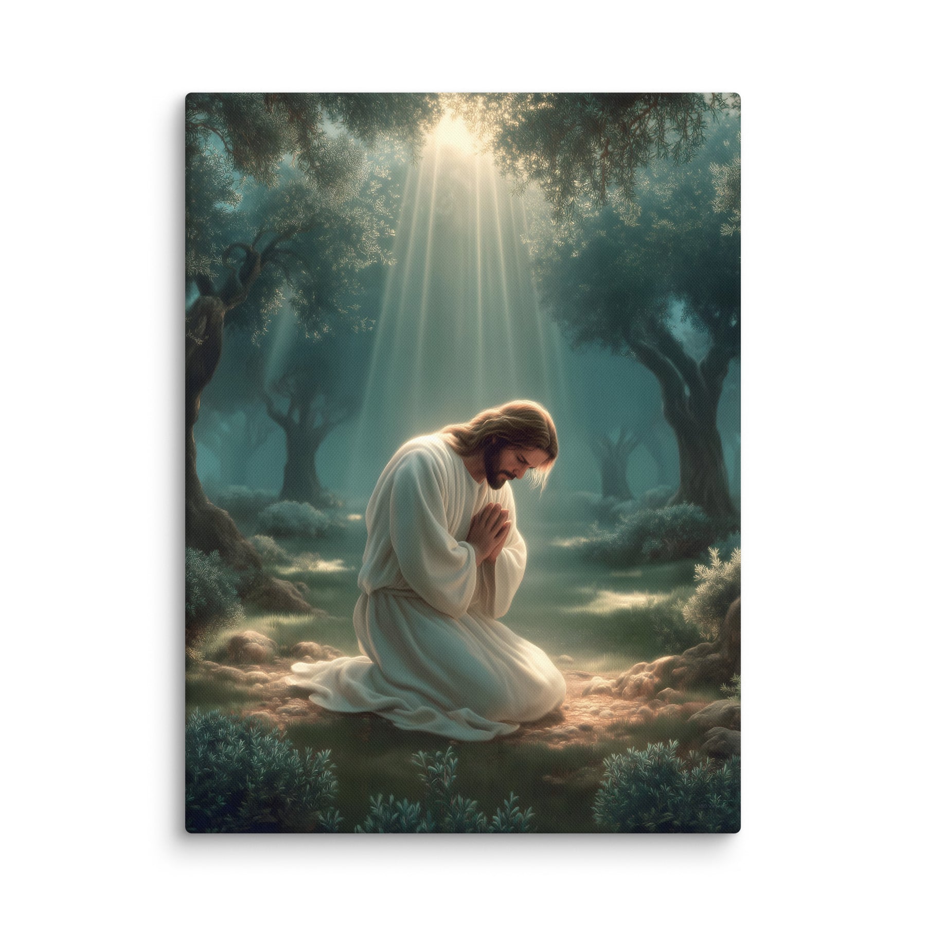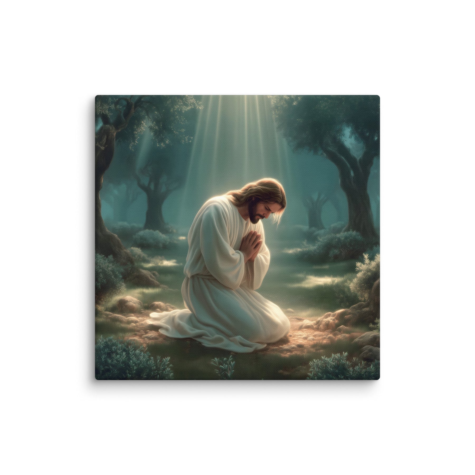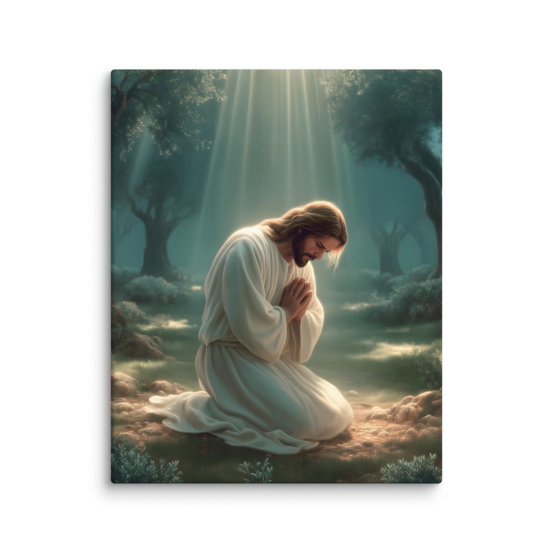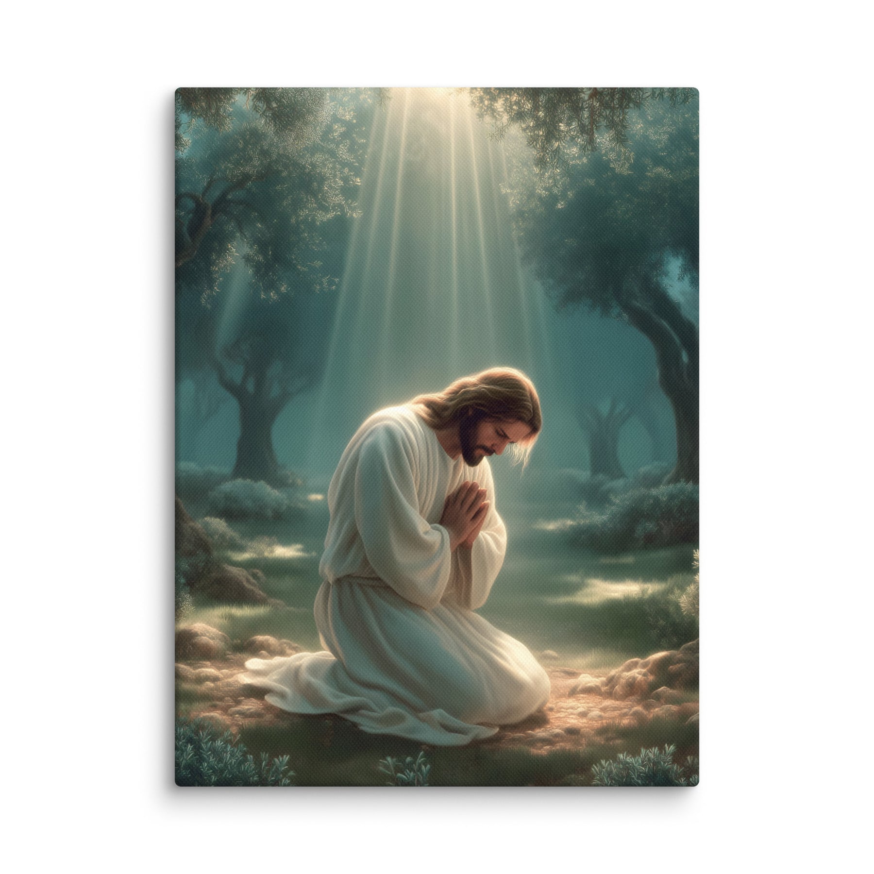 This artwork highlights the tenderness and divinity of Christ’s prayer, reminding us of His infinite love and willingness to bear the weight of the world. The soft glow illuminating His white robes symbolizes hope, mercy, and the divine strength that sustained Him through His suffering. Perfect for homes, prayer rooms, churches, and meditation spaces, this canvas brings a calming sense of holiness—inviting all who see it to pause, breathe deeply, and feel the nearness of the Savior.