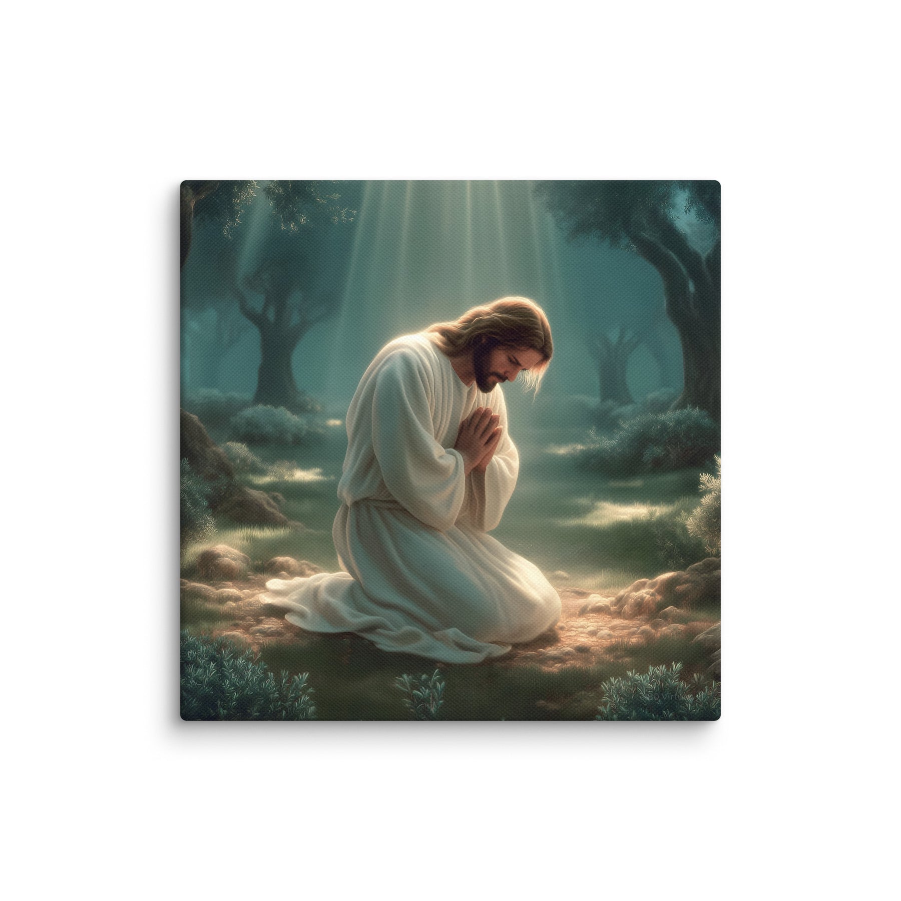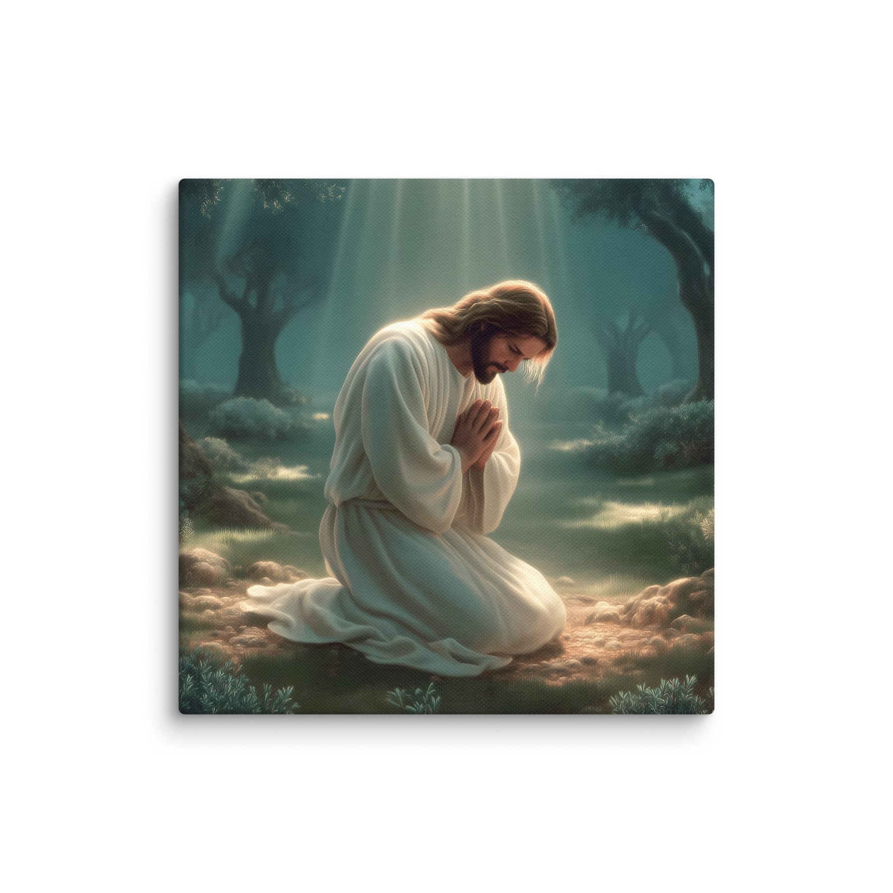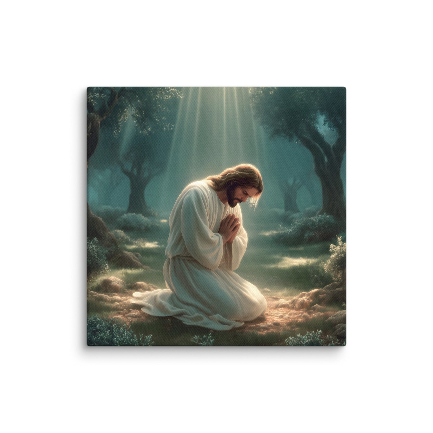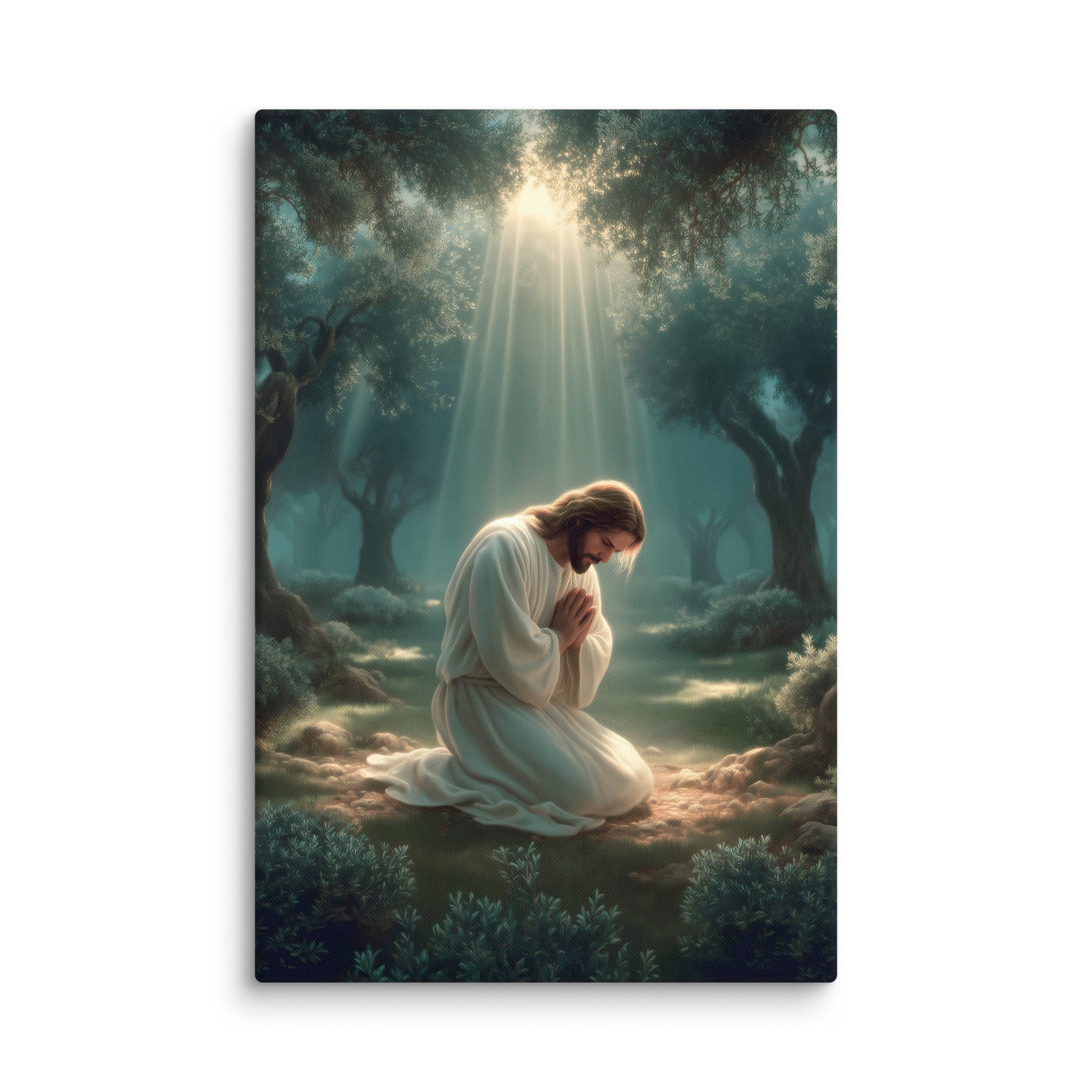 This artwork highlights the tenderness and divinity of Christ’s prayer, reminding us of His infinite love and willingness to bear the weight of the world. The soft glow illuminating His white robes symbolizes hope, mercy, and the divine strength that sustained Him through His suffering. Perfect for homes, prayer rooms, churches, and meditation spaces, this canvas brings a calming sense of holiness—inviting all who see it to pause, breathe deeply, and feel the nearness of the Savior.