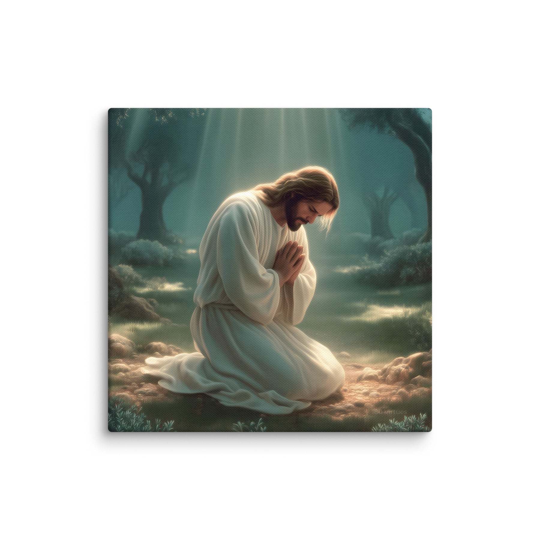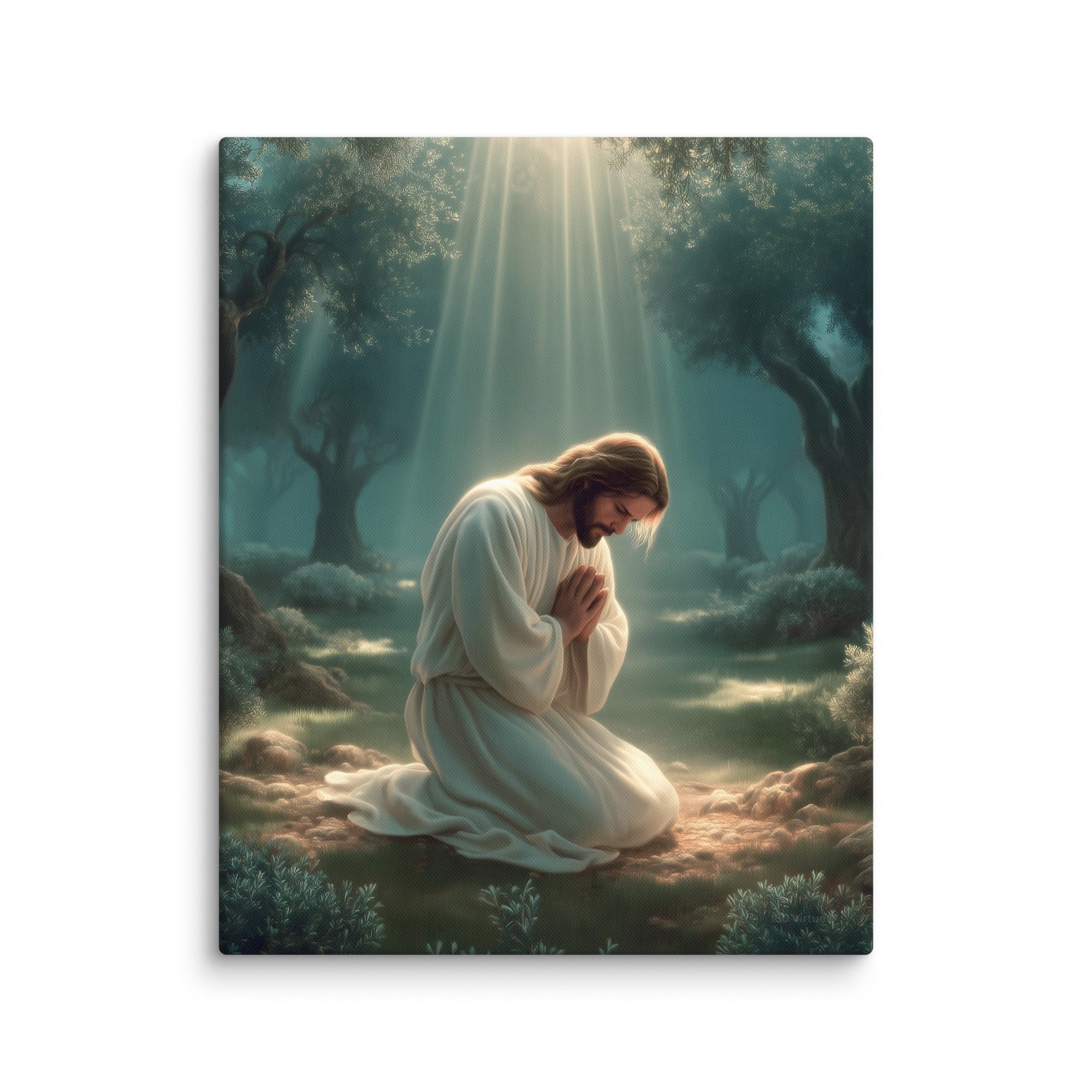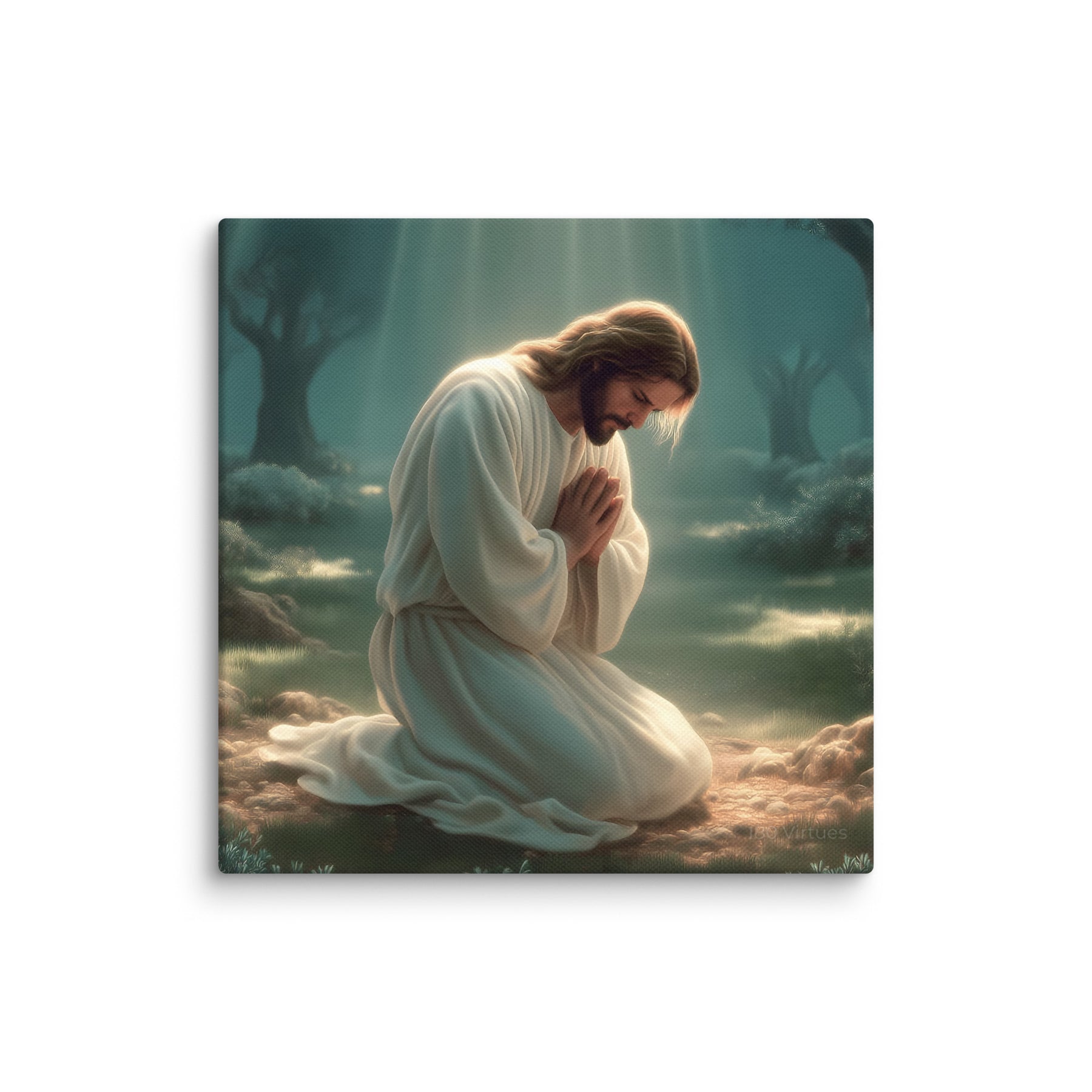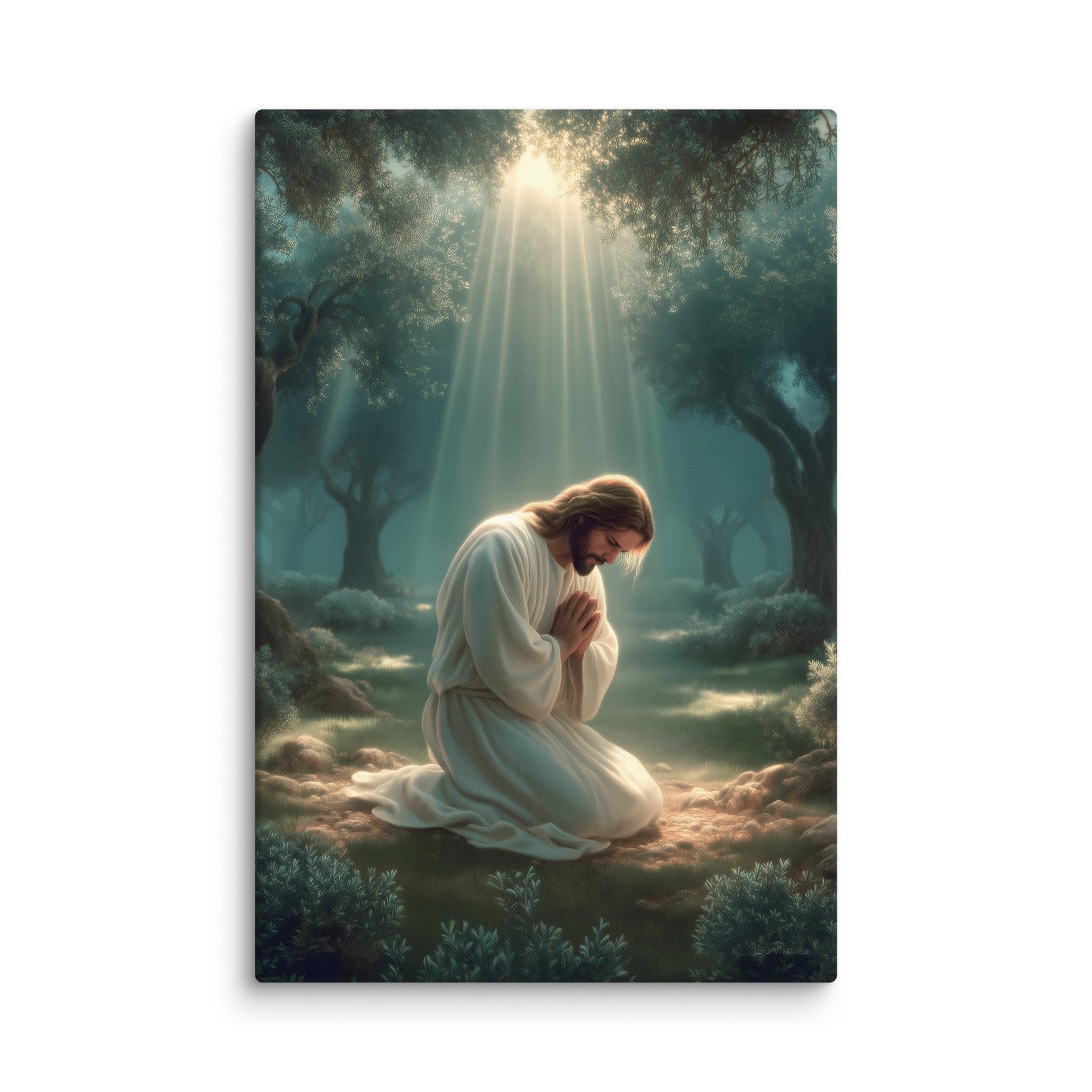 This artwork highlights the tenderness and divinity of Christ’s prayer, reminding us of His infinite love and willingness to bear the weight of the world. The soft glow illuminating His white robes symbolizes hope, mercy, and the divine strength that sustained Him through His suffering. Perfect for homes, prayer rooms, churches, and meditation spaces, this canvas brings a calming sense of holiness—inviting all who see it to pause, breathe deeply, and feel the nearness of the Savior.