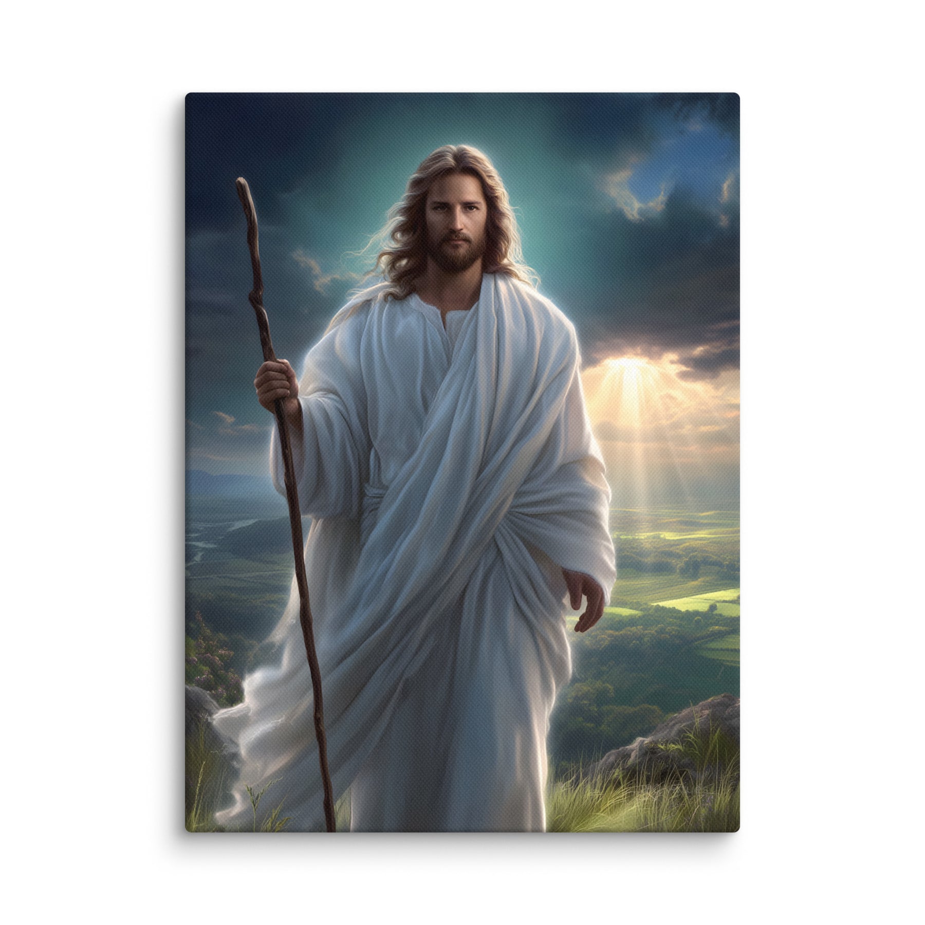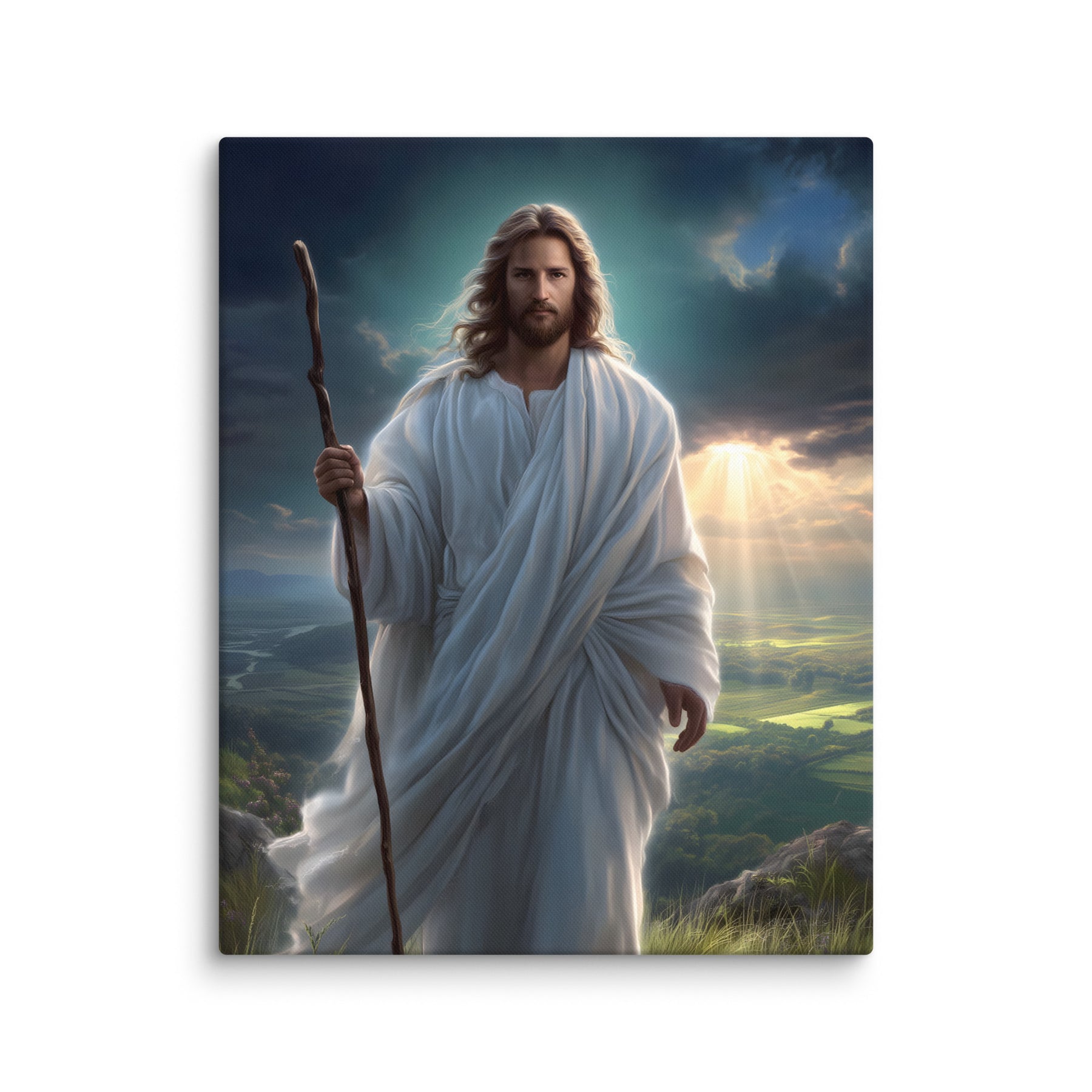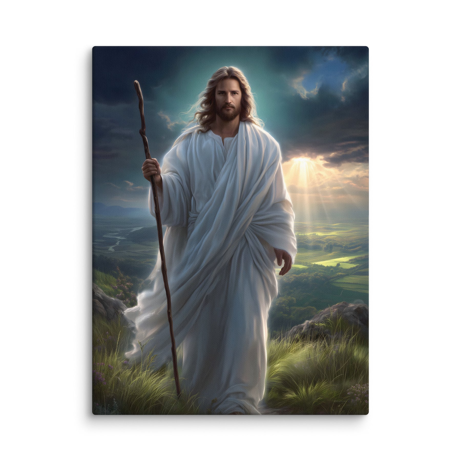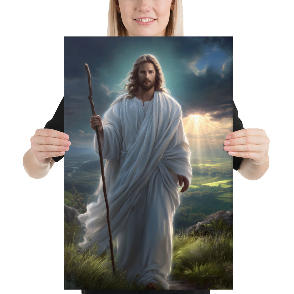 This serene masterpiece captures Jesus as the Good Shepherd, standing with quiet strength atop a sun-kissed hillside. Soft rays of heavenly light break through the clouds behind Him, illuminating the landscape and filling the scene with hope and calm. His flowing white robes move gently in the breeze, and His steady gaze reflects both compassion and unwavering purpose. The shepherd’s staff in His hand symbolizes His role as protector and guide—One who leads His children with love, patience, and mercy.