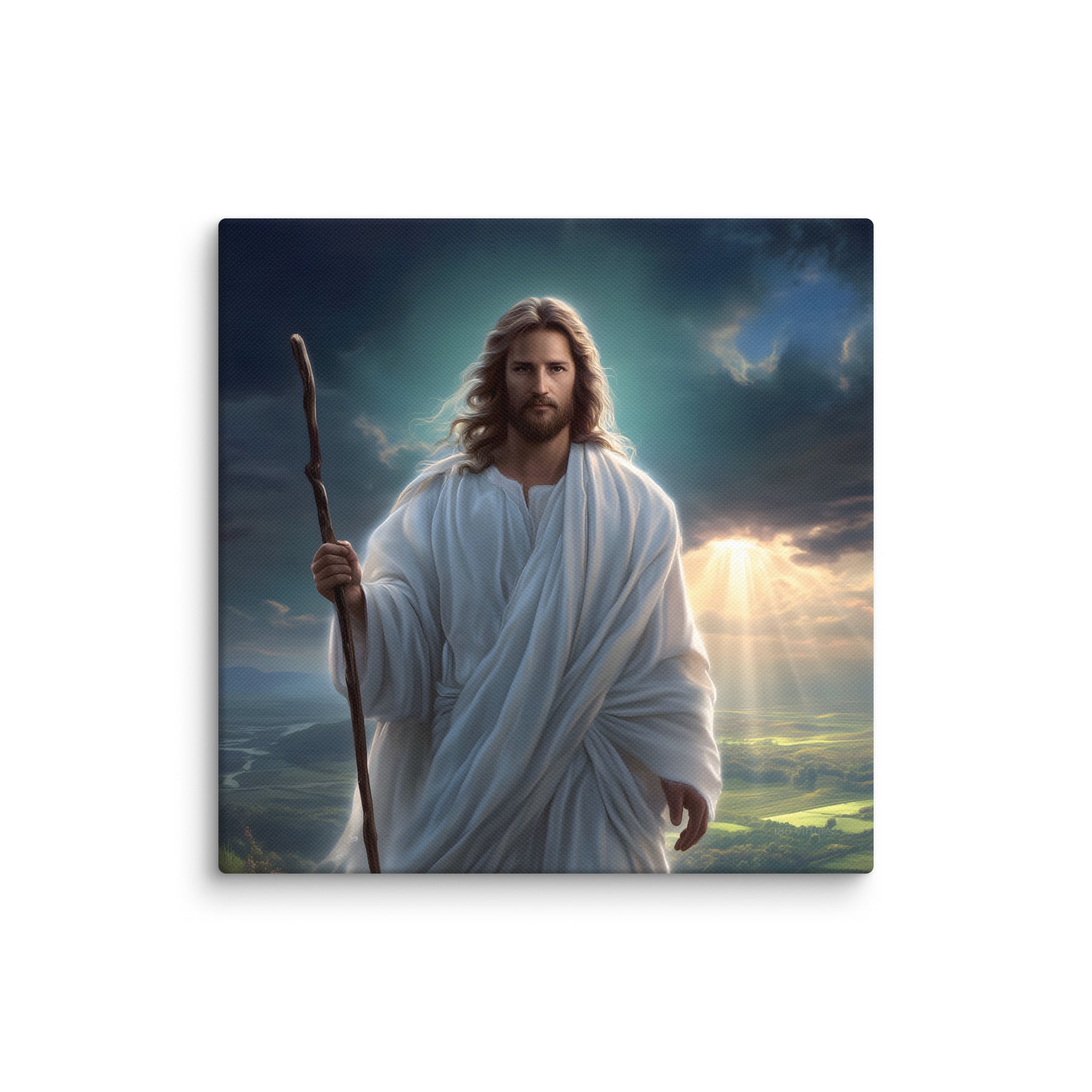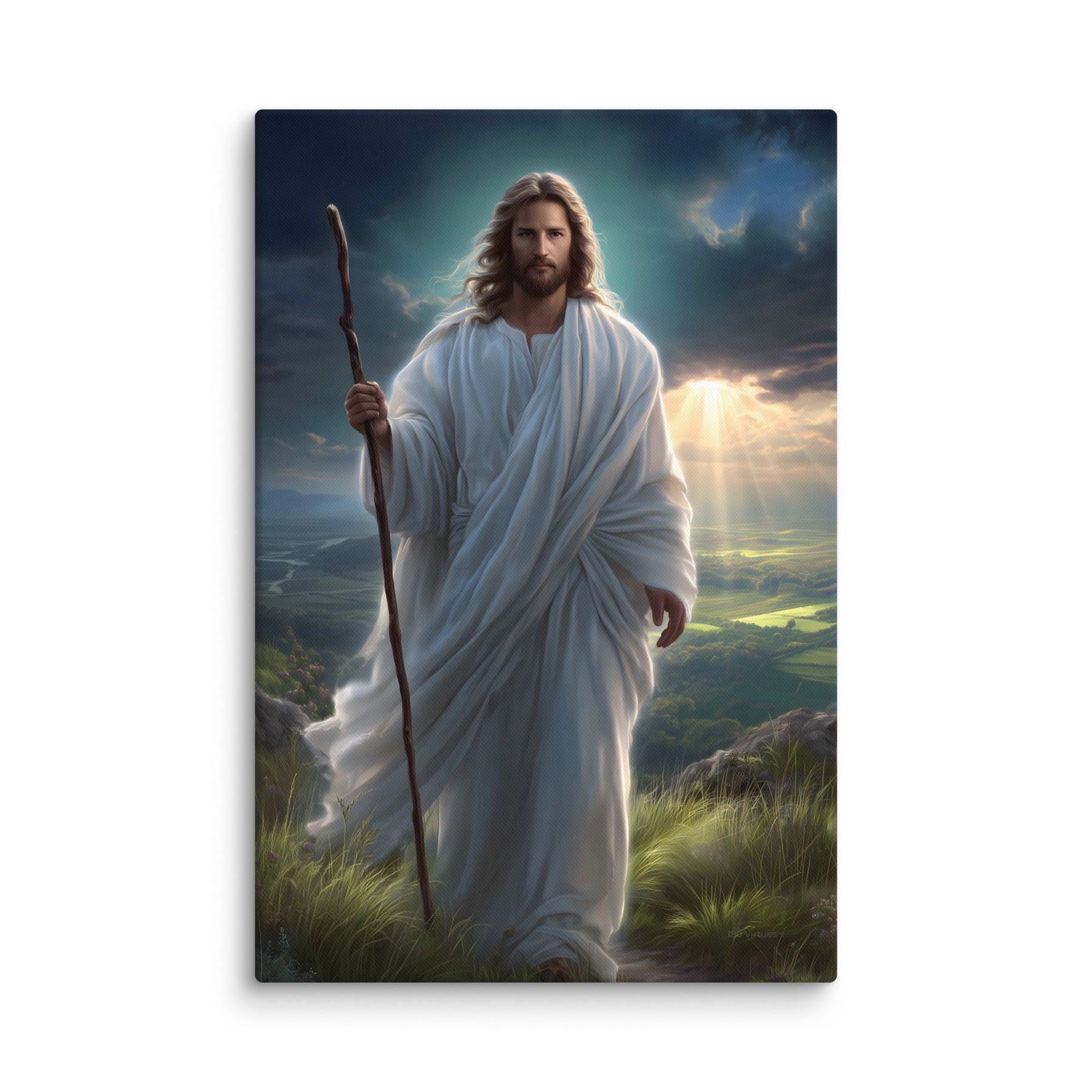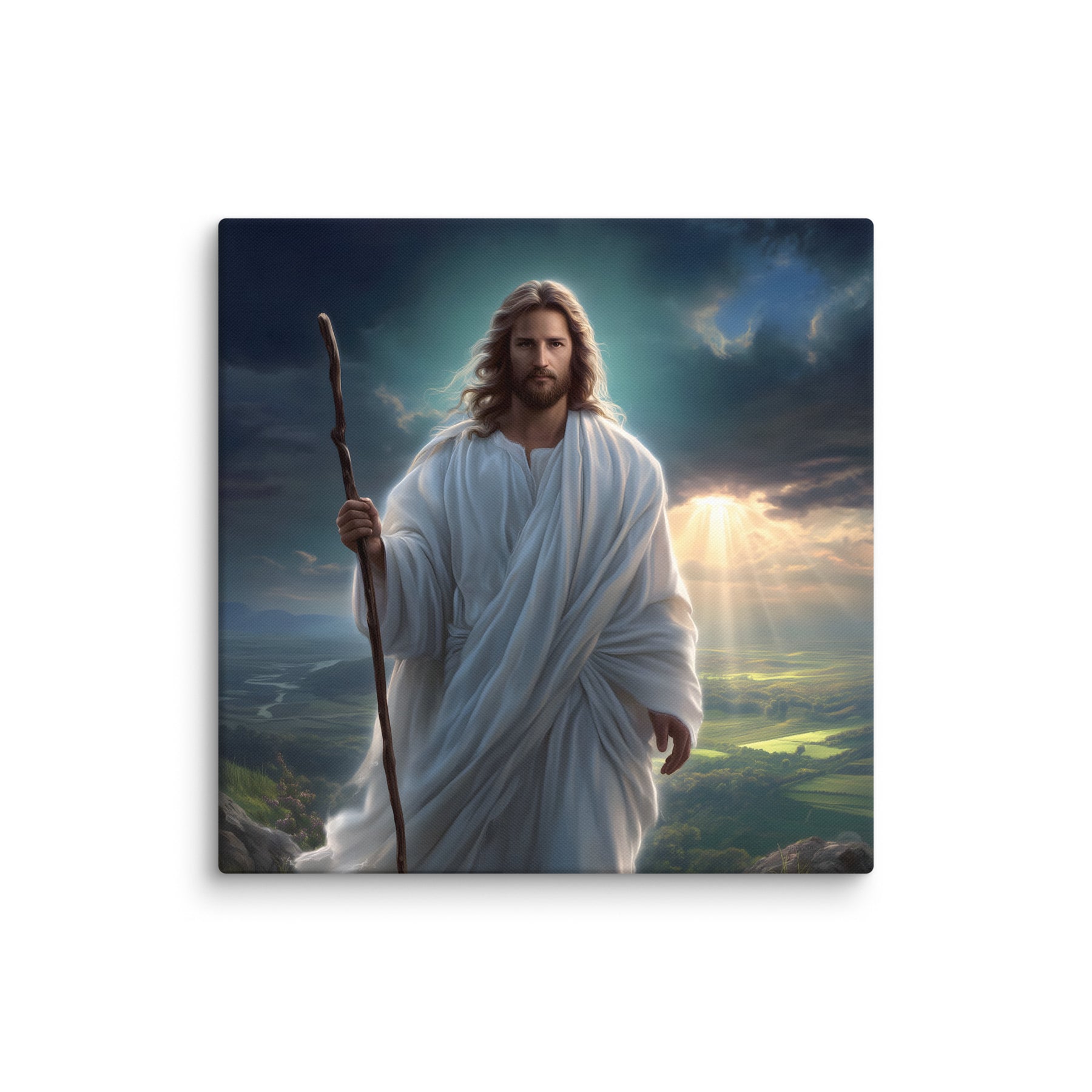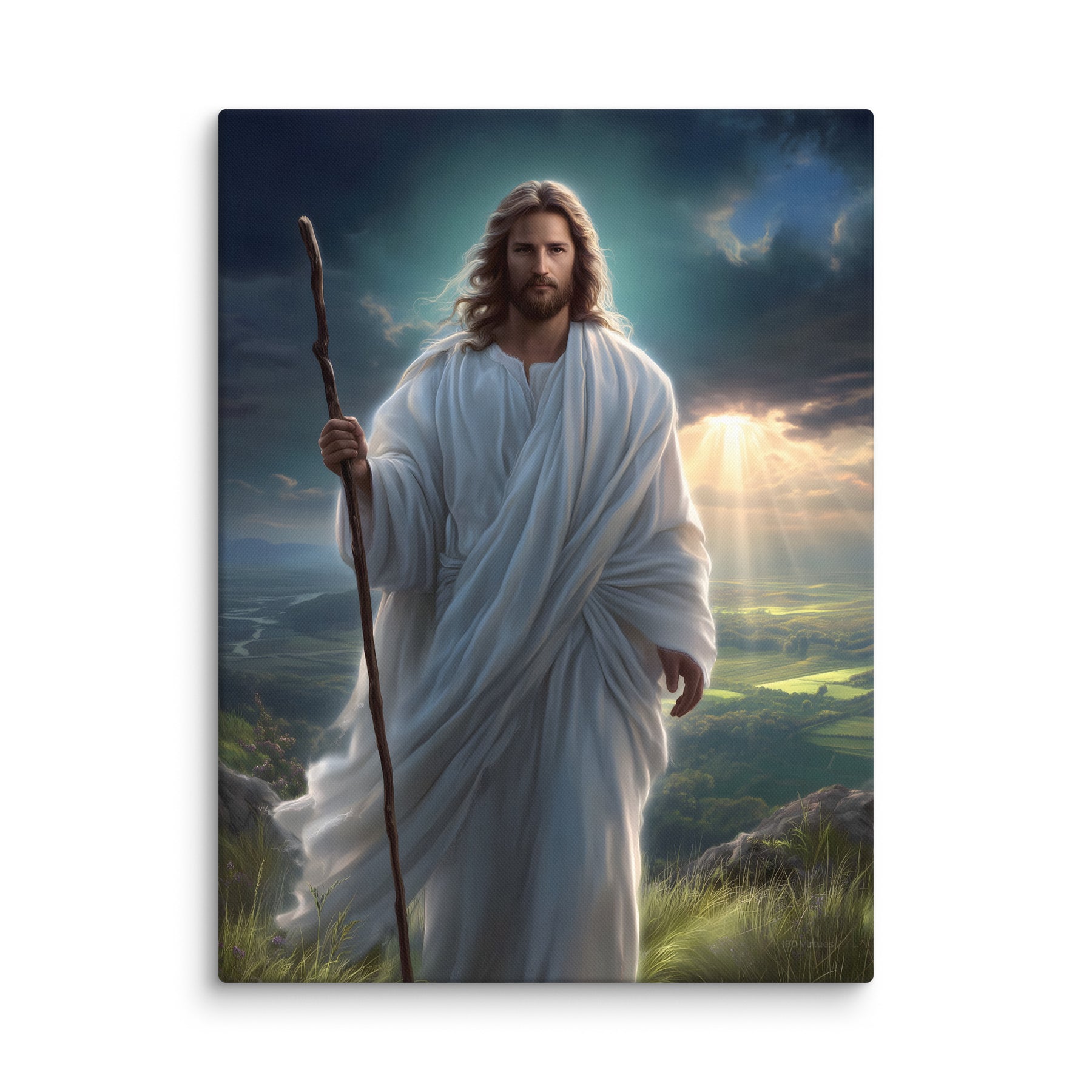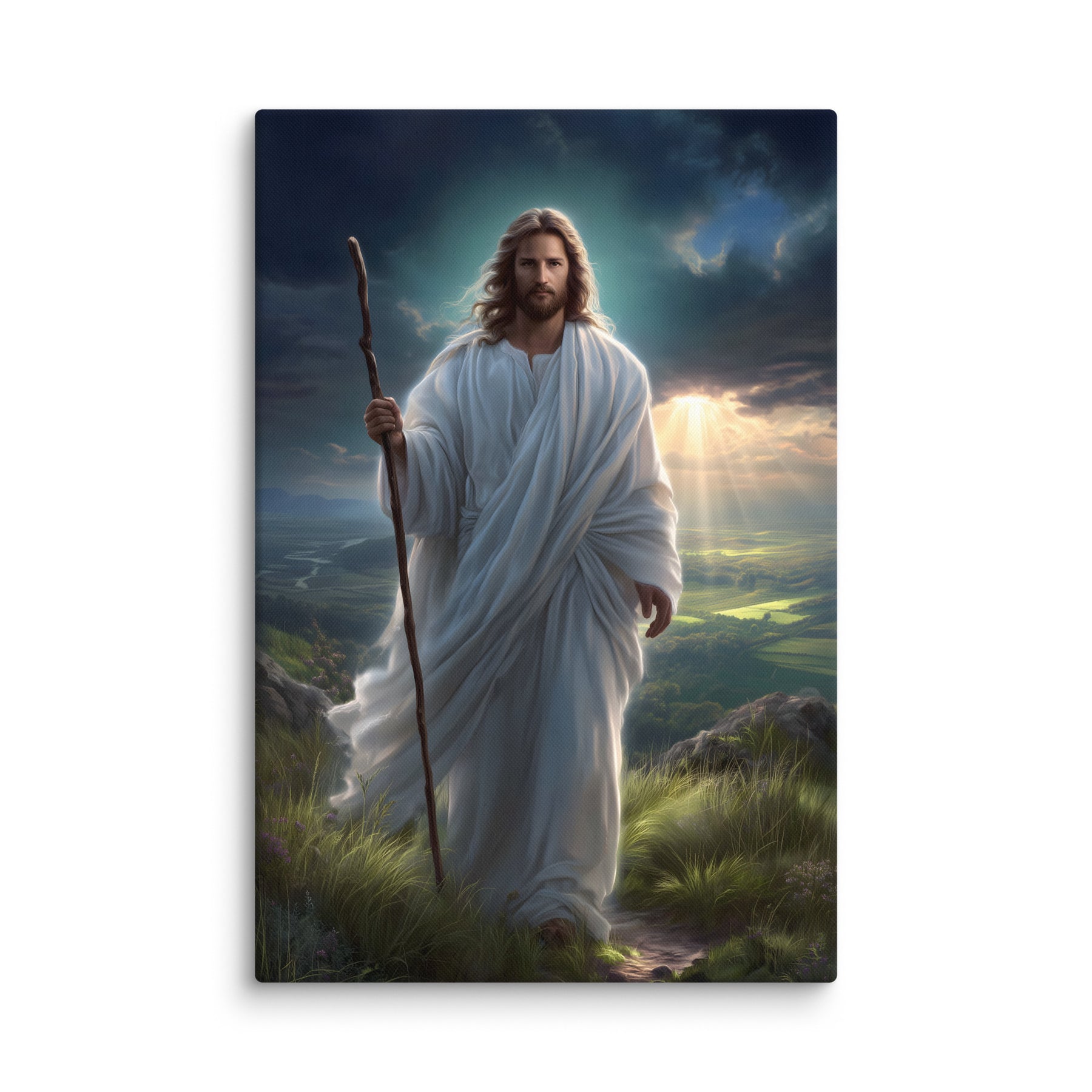 This serene masterpiece captures Jesus as the Good Shepherd, standing with quiet strength atop a sun-kissed hillside. Soft rays of heavenly light break through the clouds behind Him, illuminating the landscape and filling the scene with hope and calm. His flowing white robes move gently in the breeze, and His steady gaze reflects both compassion and unwavering purpose. The shepherd’s staff in His hand symbolizes His role as protector and guide—One who leads His children with love, patience, and mercy.