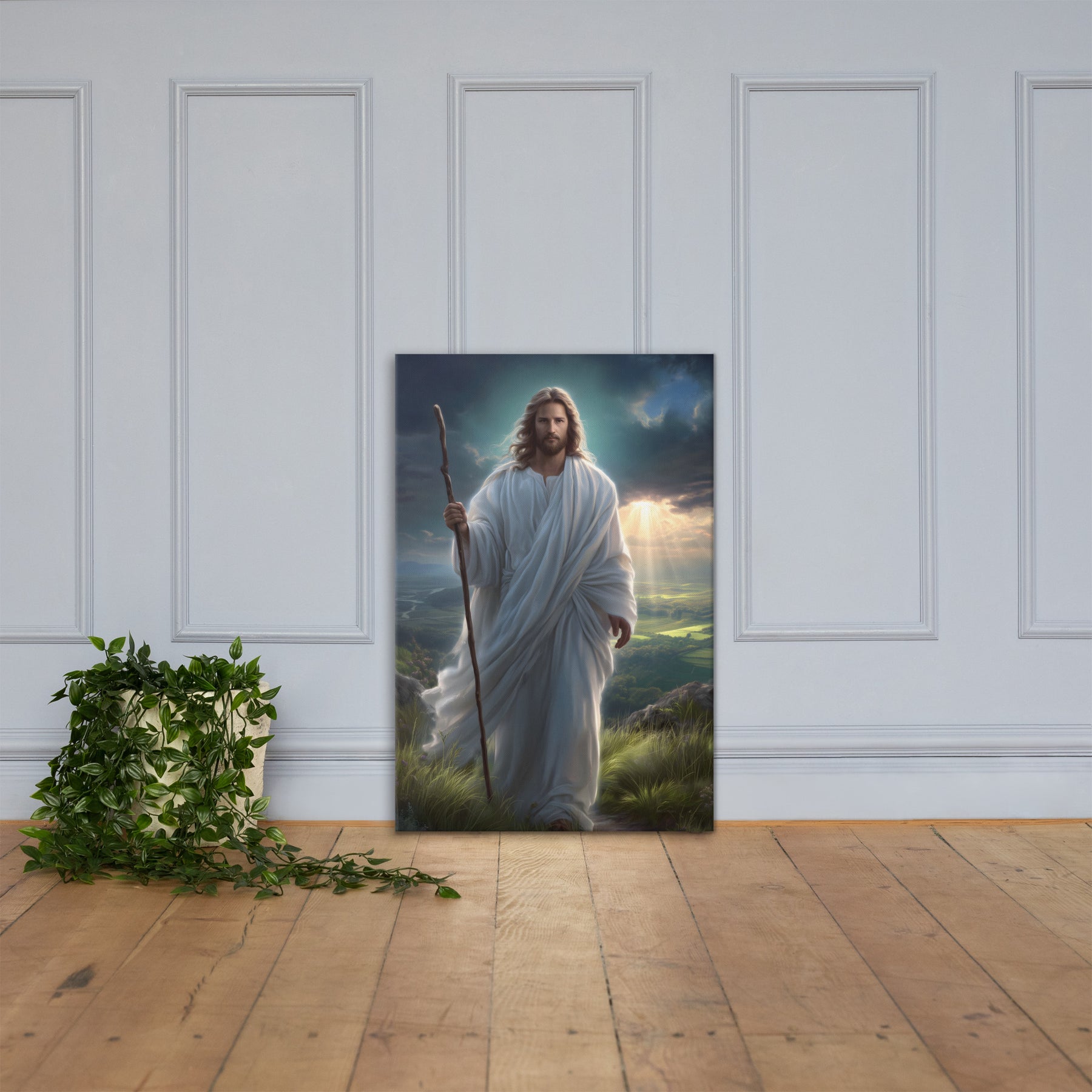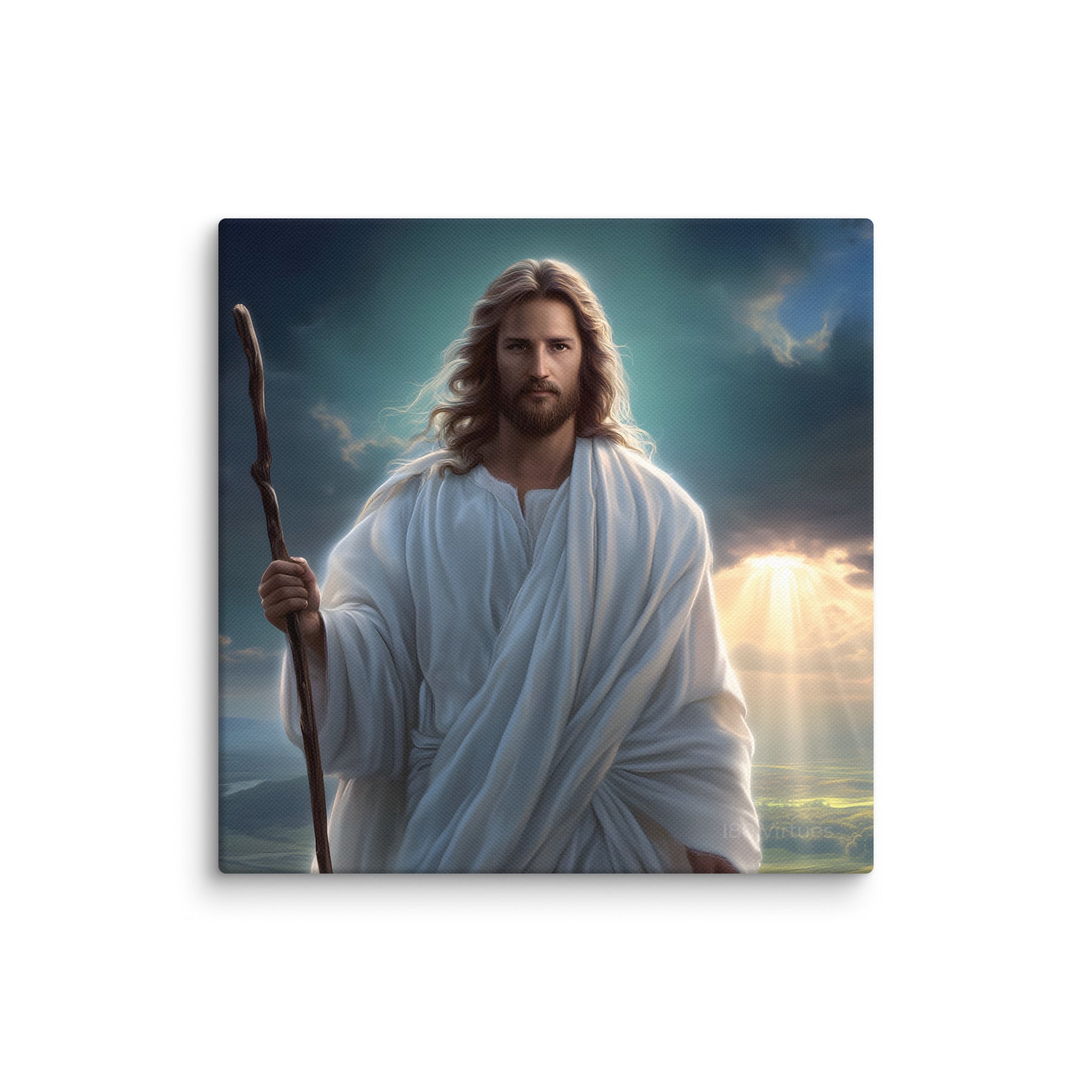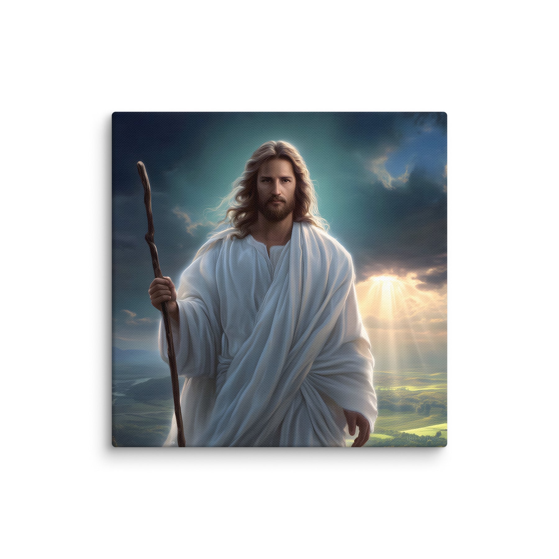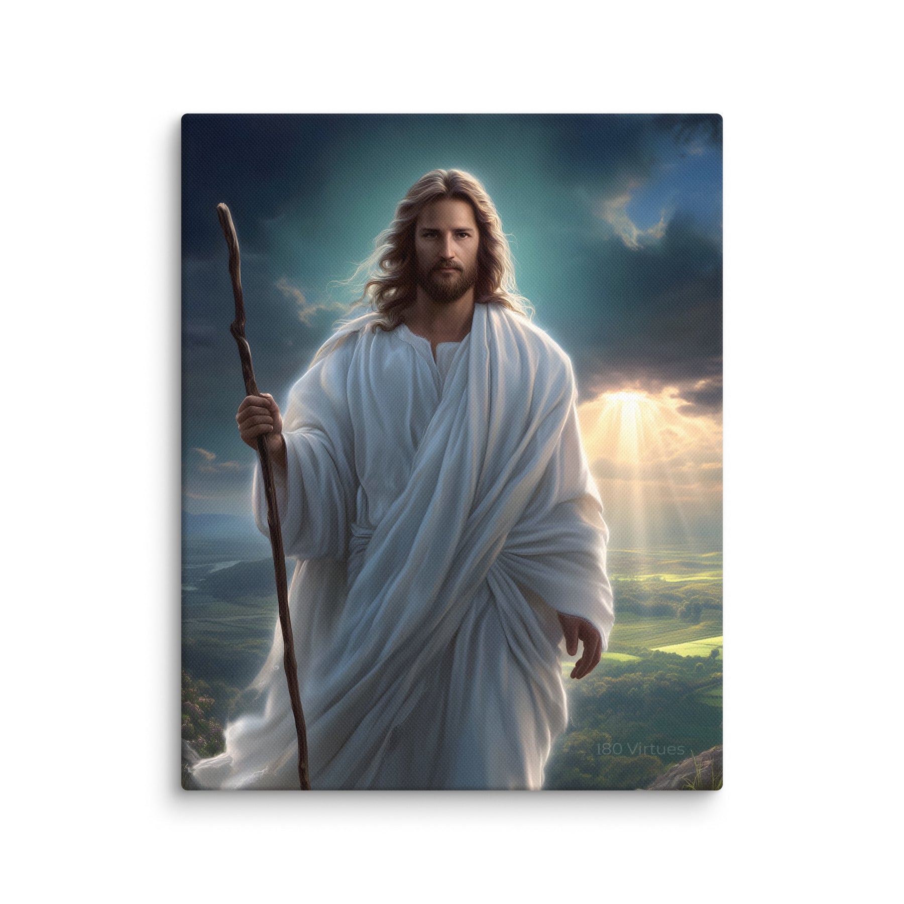 This serene masterpiece captures Jesus as the Good Shepherd, standing with quiet strength atop a sun-kissed hillside. Soft rays of heavenly light break through the clouds behind Him, illuminating the landscape and filling the scene with hope and calm. His flowing white robes move gently in the breeze, and His steady gaze reflects both compassion and unwavering purpose. The shepherd’s staff in His hand symbolizes His role as protector and guide—One who leads His children with love, patience, and mercy.