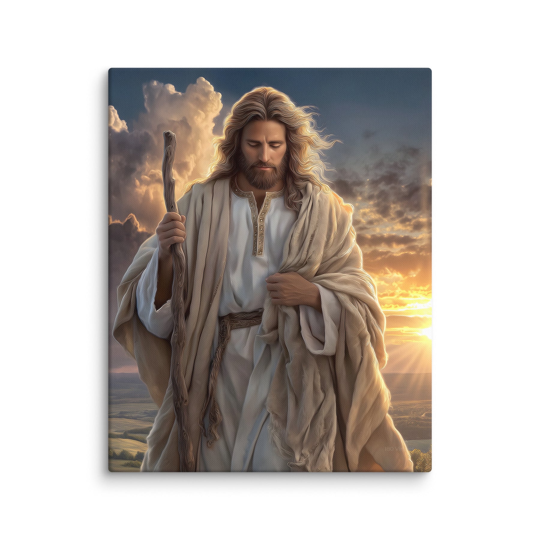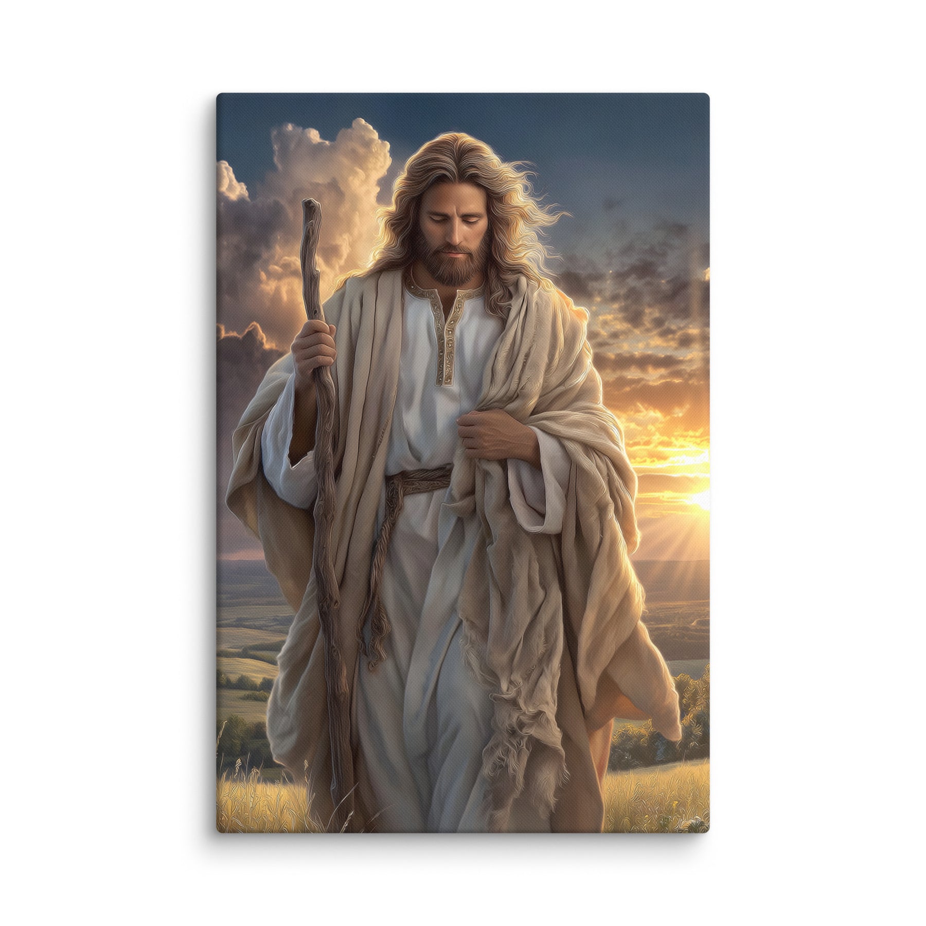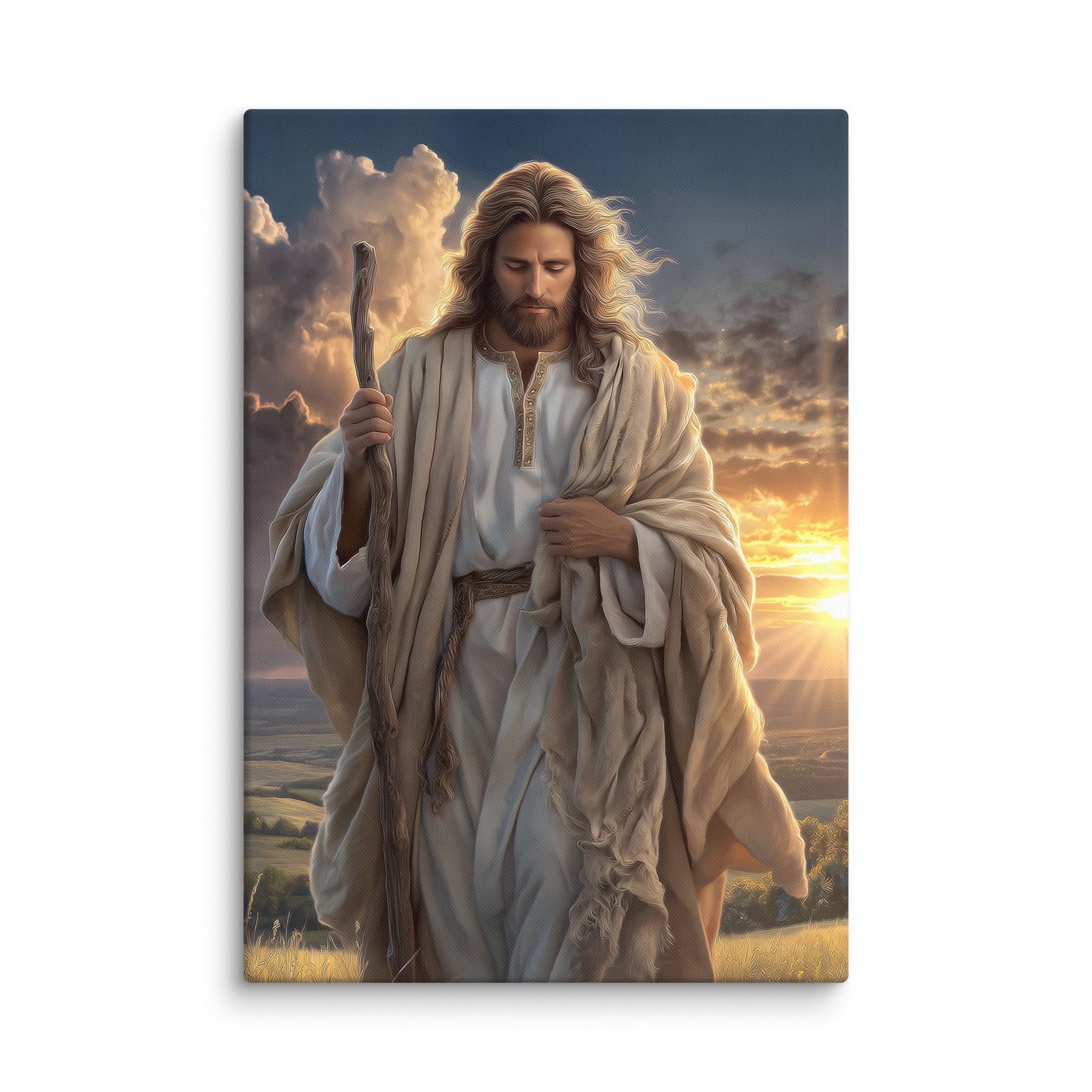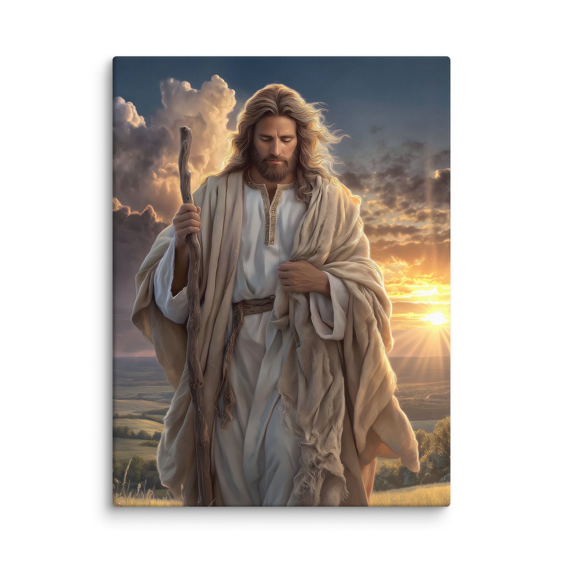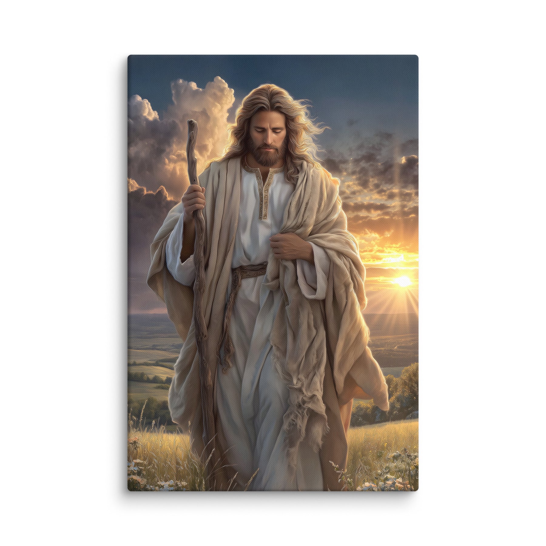 In this serene and majestic artwork, Jesus walks through a field at sunrise, His shepherd’s staff in hand and His eyes lowered in calm reflection. The golden morning light pours over the landscape, illuminating His robes and casting a warm glow across the soft grasses at His feet. Every detail—the gentle wind in His hair, the richness of the embroidered tunic, the quiet strength in His posture—invites the viewer to feel His nearness and His unwavering guidance.