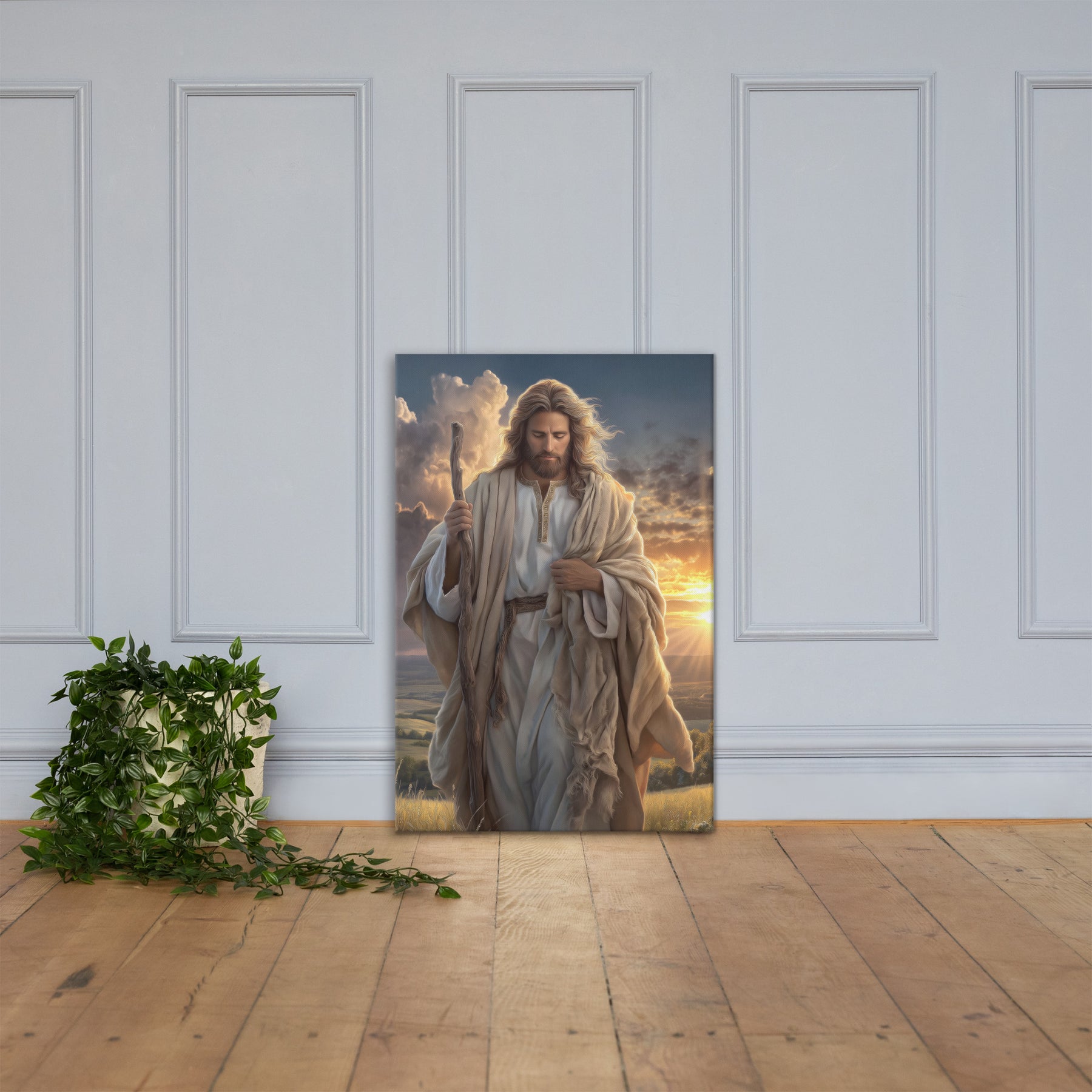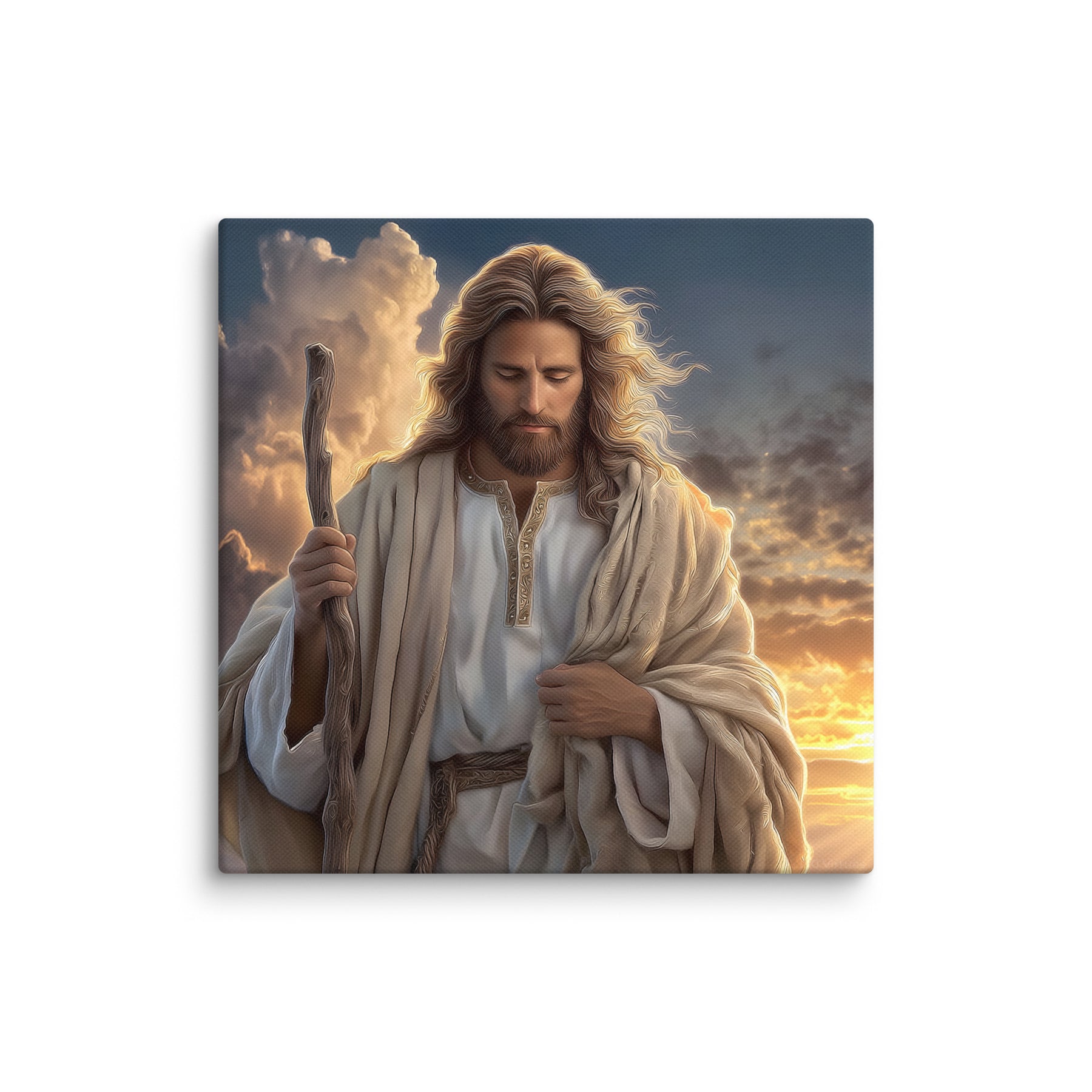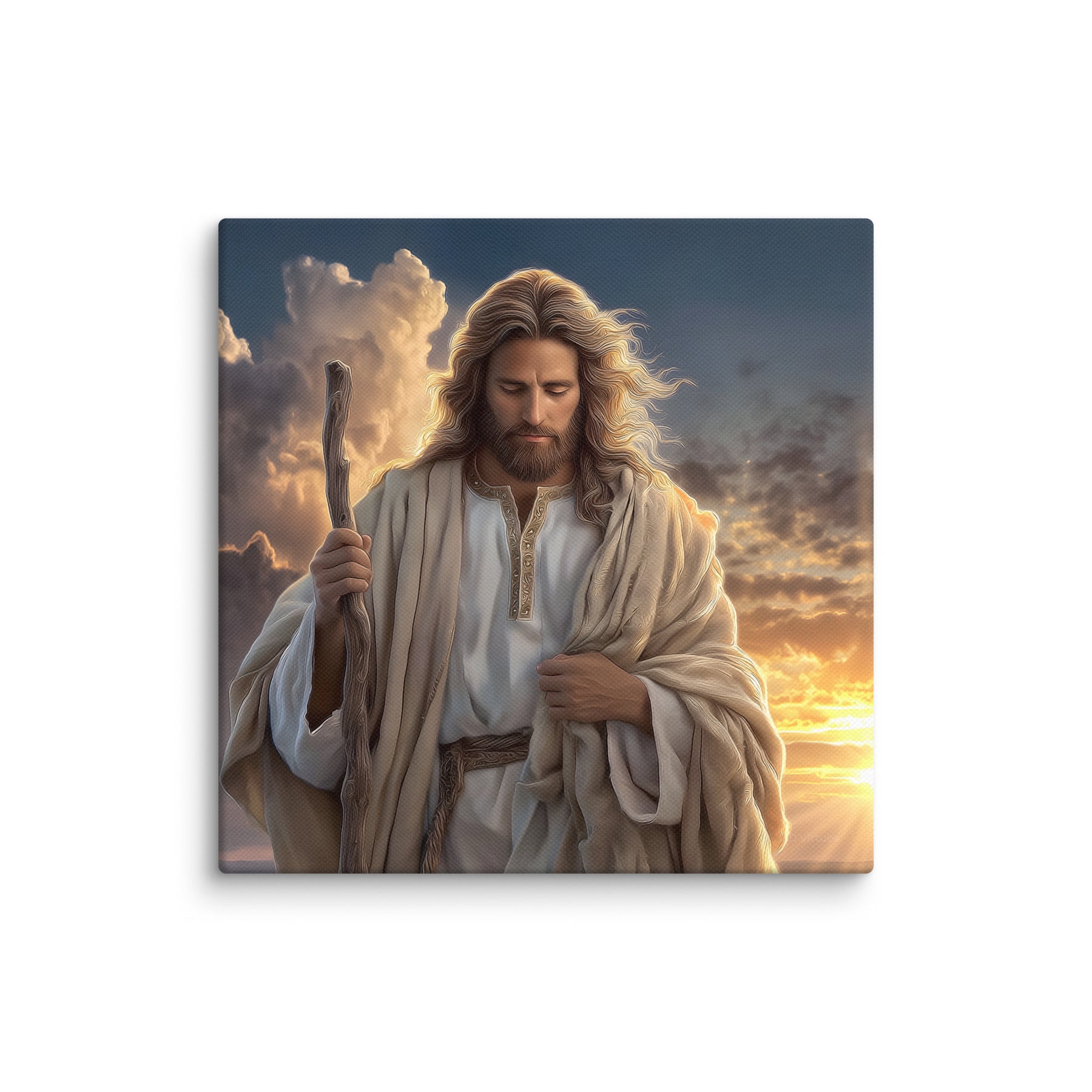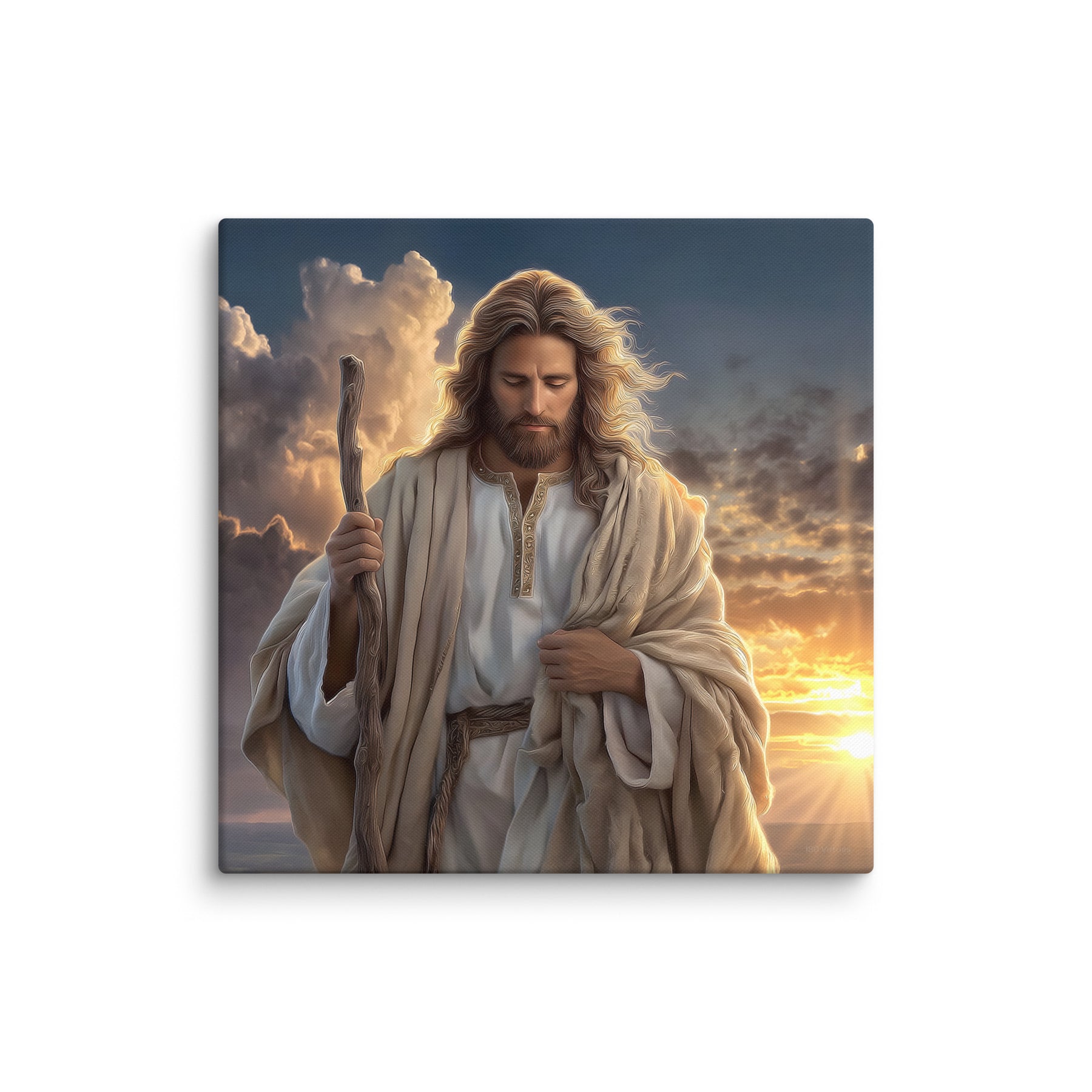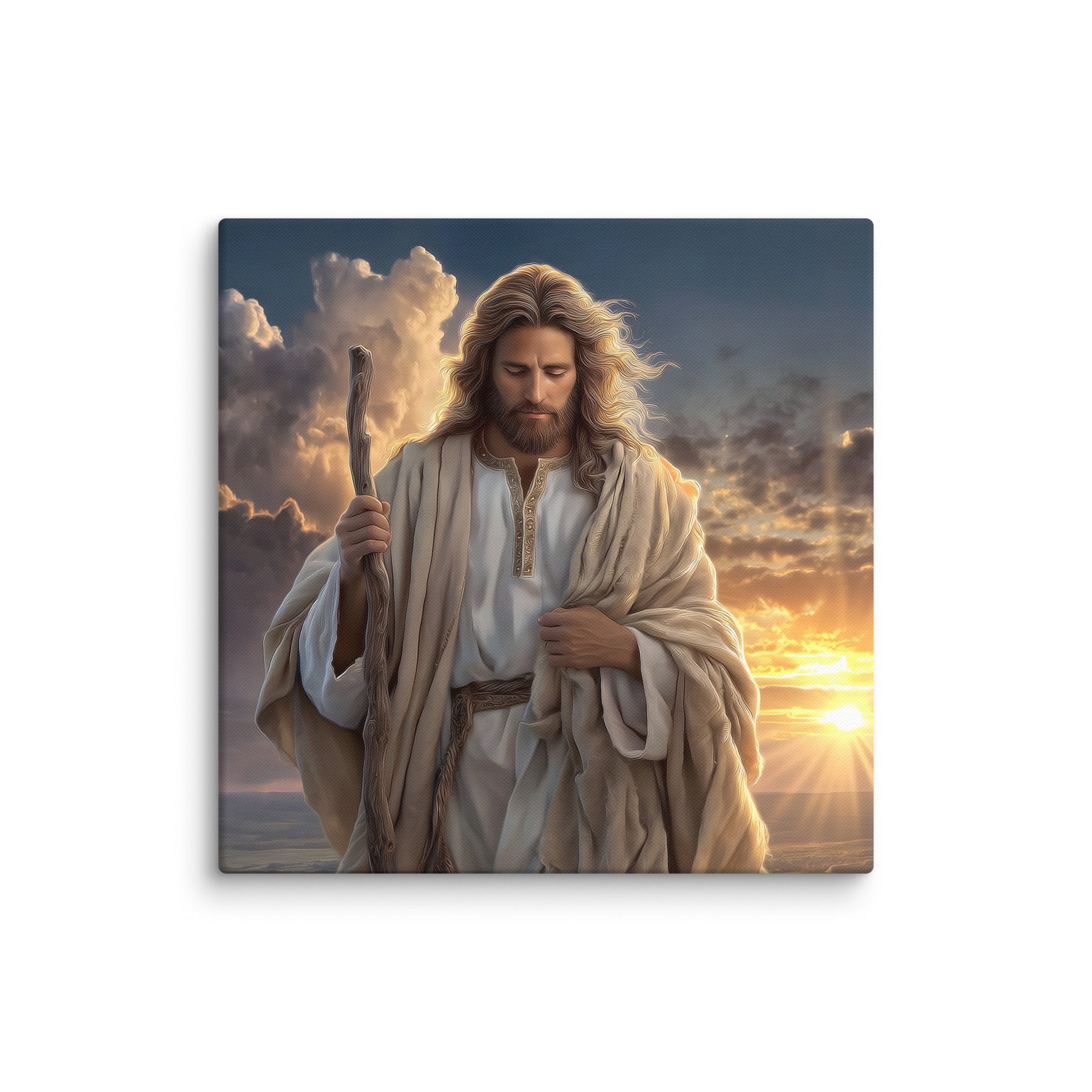 In this serene and majestic artwork, Jesus walks through a field at sunrise, His shepherd’s staff in hand and His eyes lowered in calm reflection. The golden morning light pours over the landscape, illuminating His robes and casting a warm glow across the soft grasses at His feet. Every detail—the gentle wind in His hair, the richness of the embroidered tunic, the quiet strength in His posture—invites the viewer to feel His nearness and His unwavering guidance.