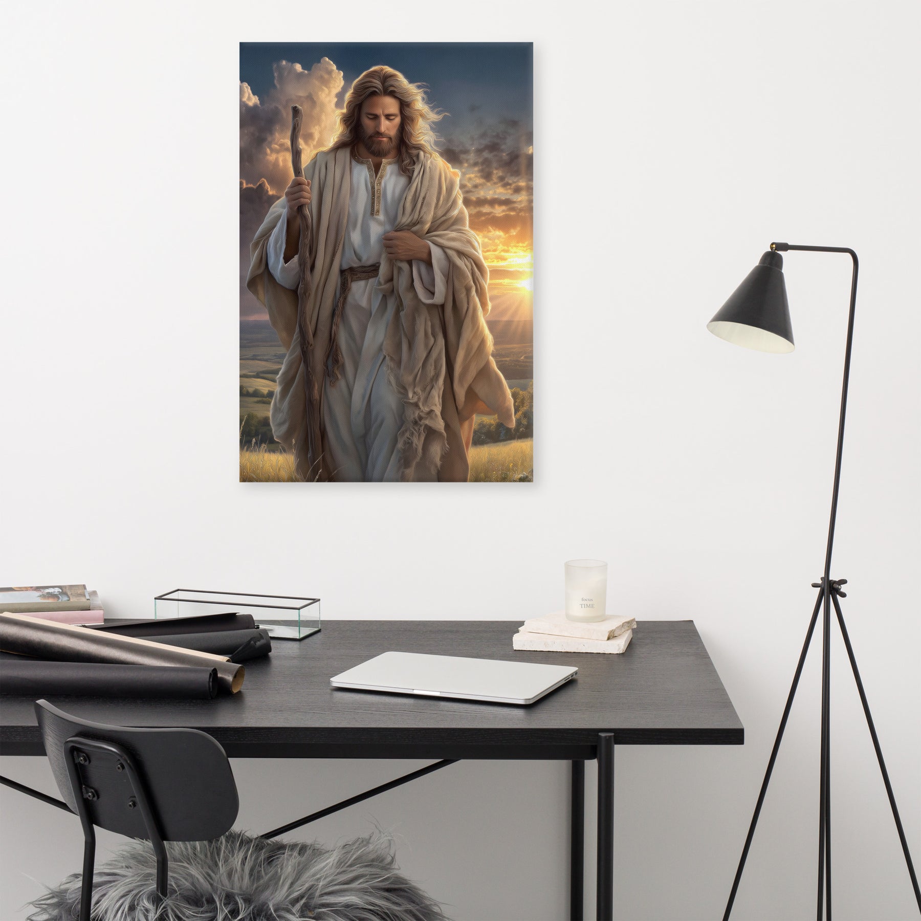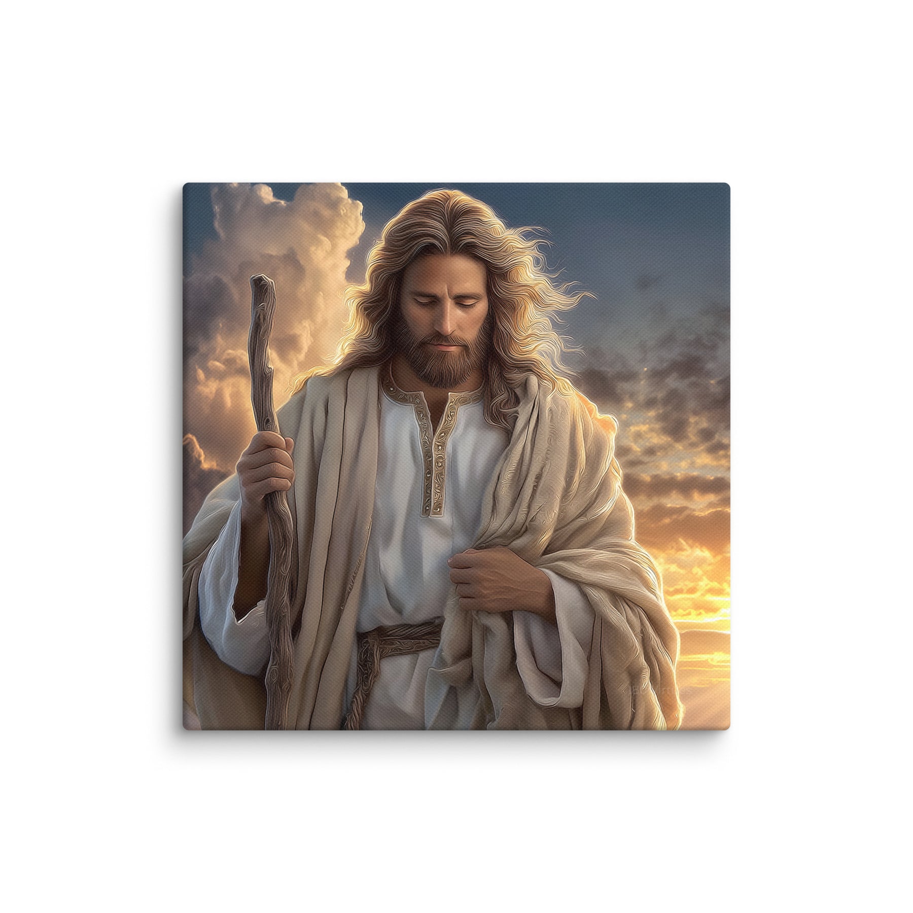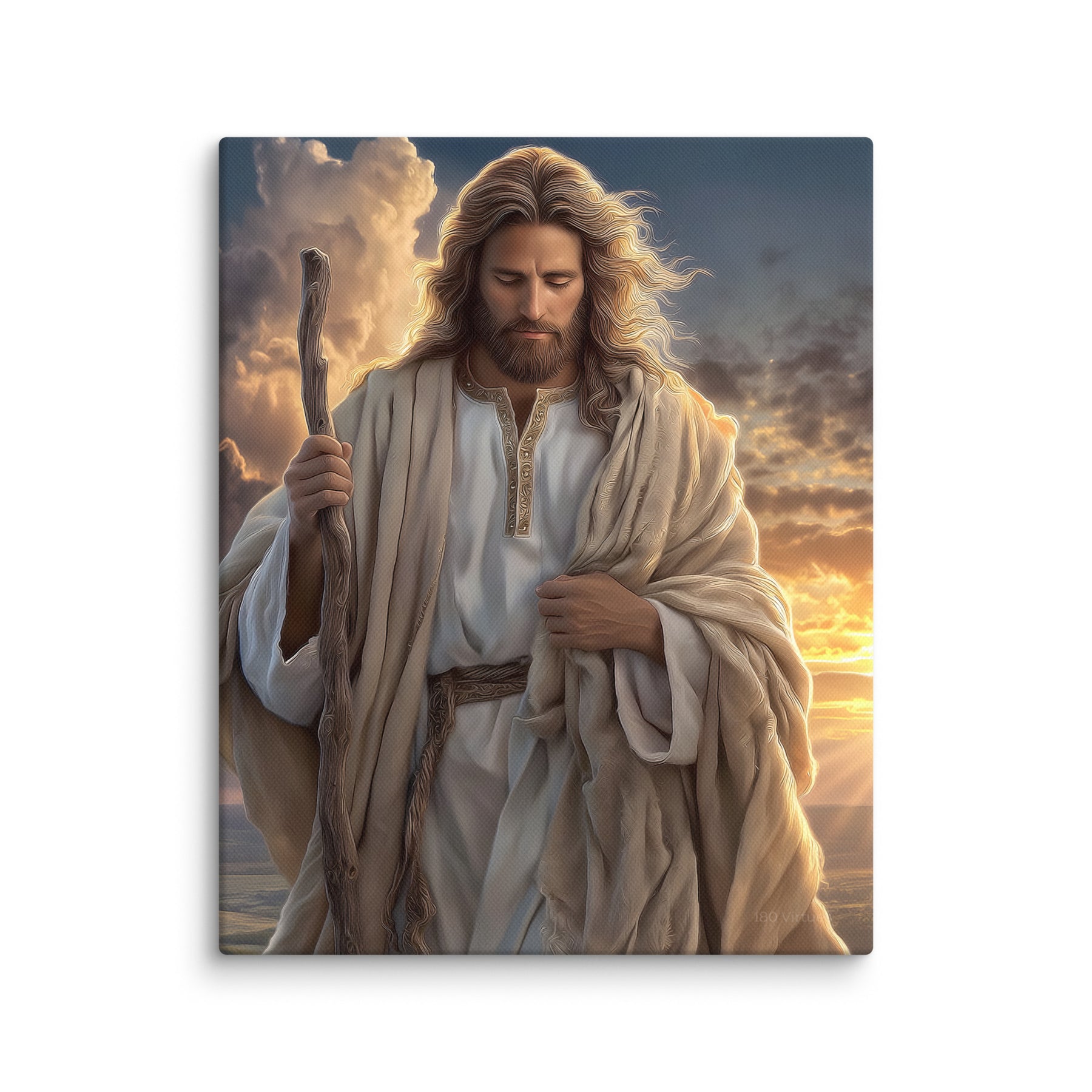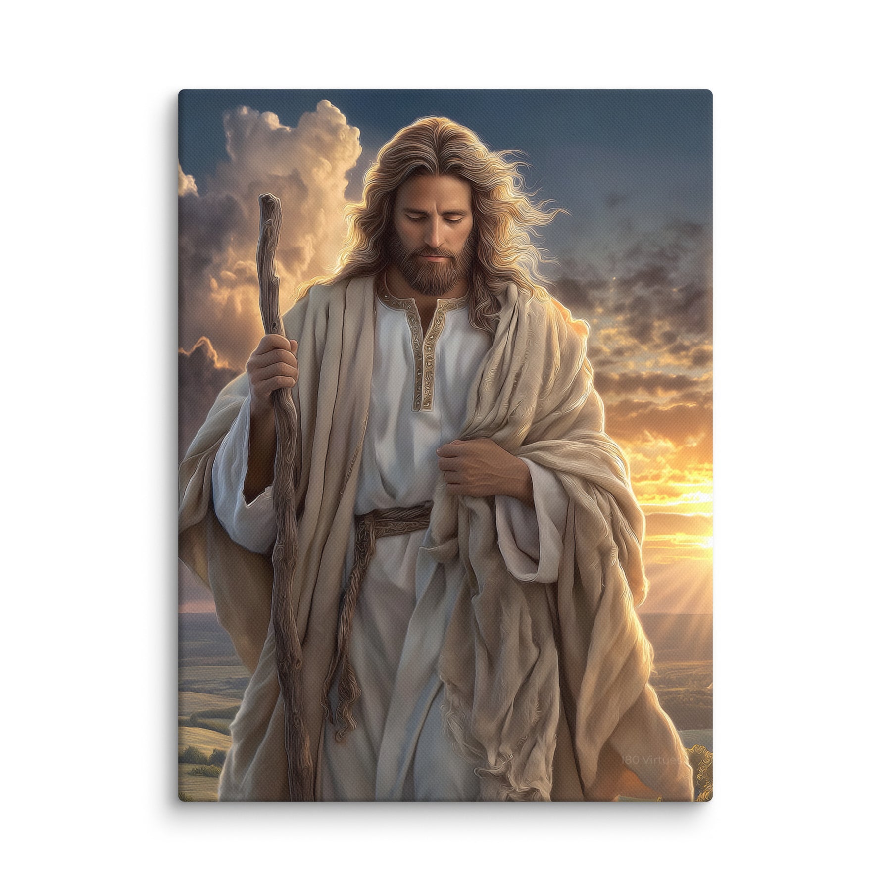 This portrait captures the heart of the Savior as the Shepherd who leads, protects, and walks beside His people. The dramatic sky behind Him, filled with light breaking through the clouds, symbolizes hope, renewal, and divine presence. Perfect for homes, churches, and study spaces, this piece serves as a daily reminder that no matter where we are on our journey, Christ walks with us—steady, compassionate, and full of grace.