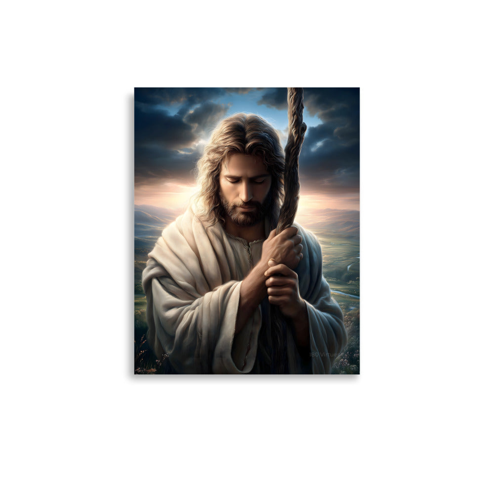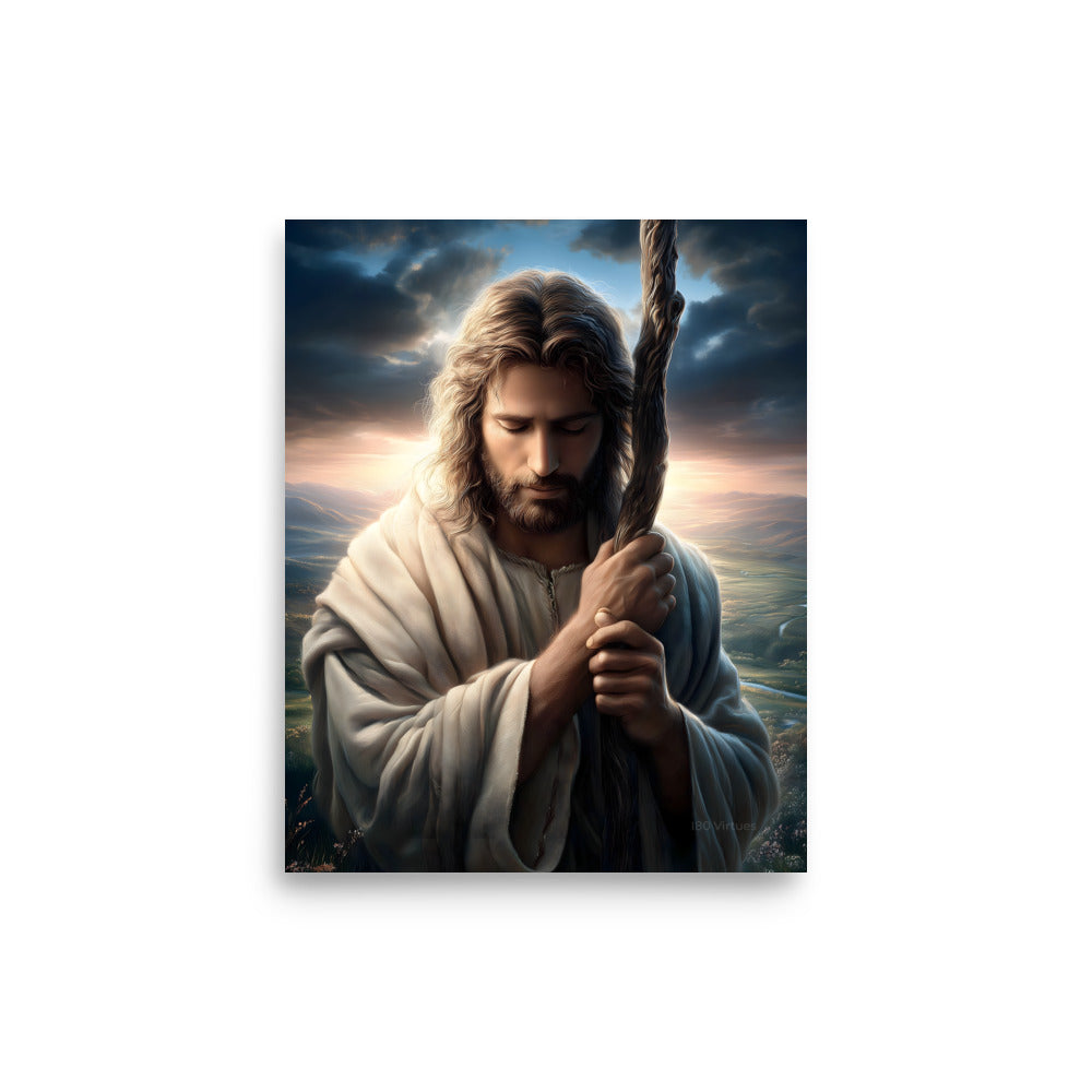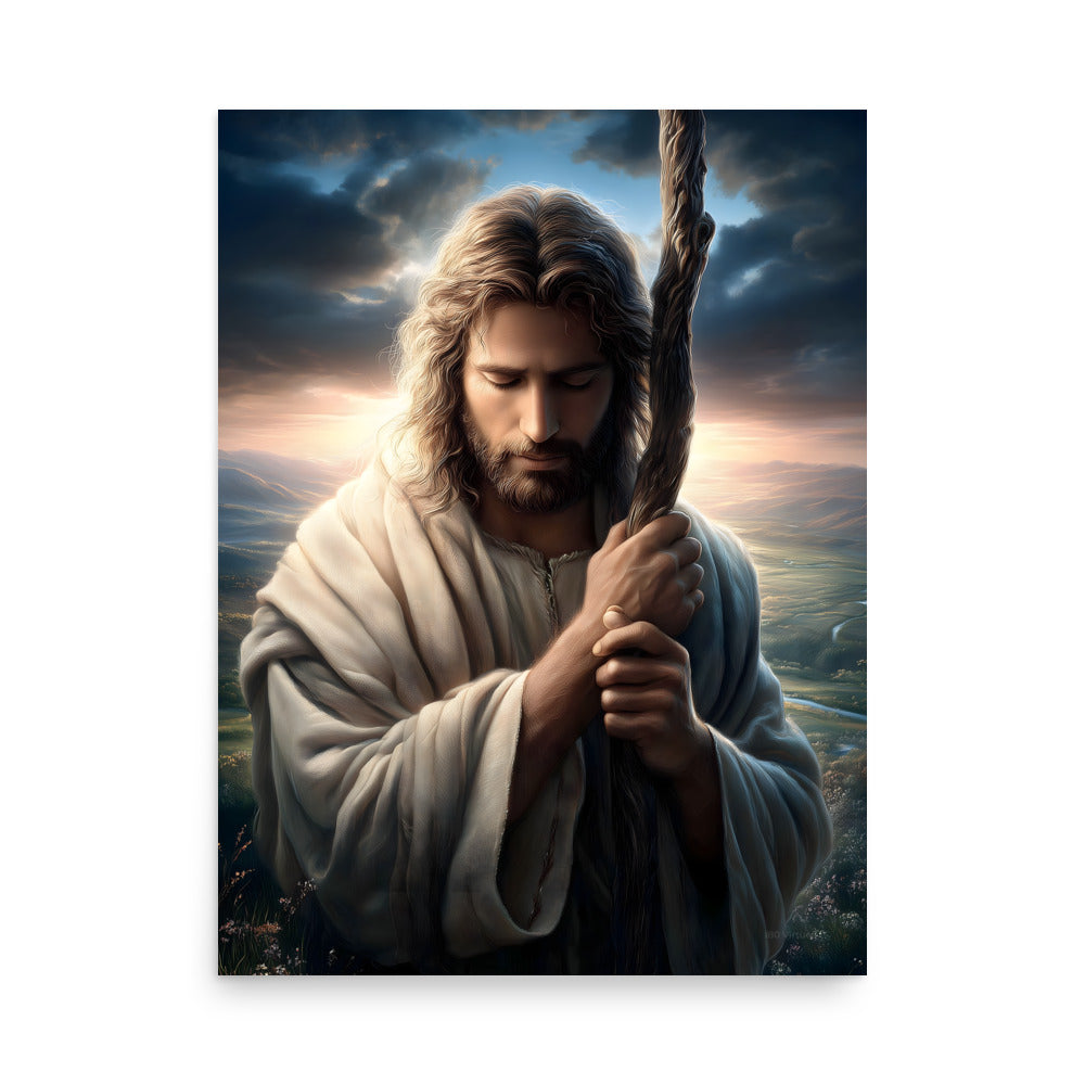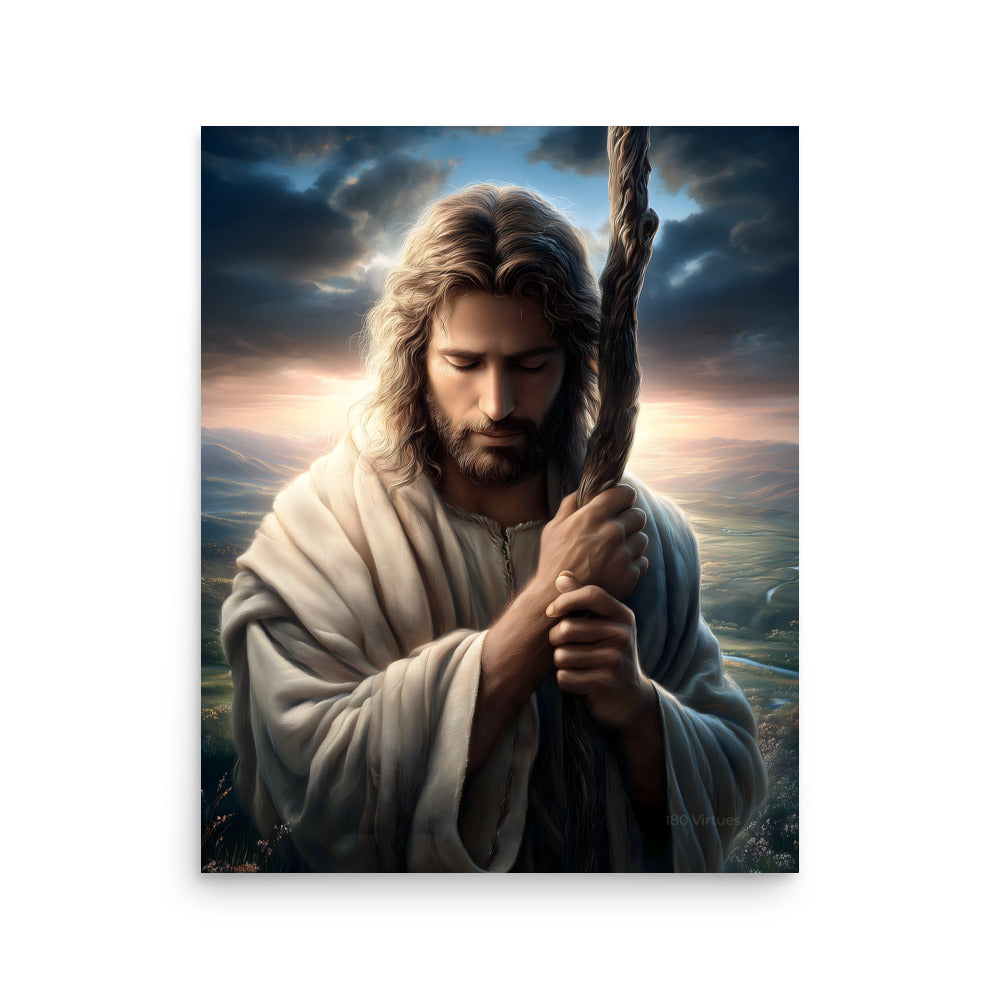 This image portrays Jesus as the Good Shepherd in a moment of deep humility and prayer. His head is bowed, eyes closed, hands gently wrapped around the shepherd’s staff—not as a symbol of authority here, but of dependence and resolve. The posture feels intimate, almost private, as if we’re witnessing a sacred pause between heaven and earth.