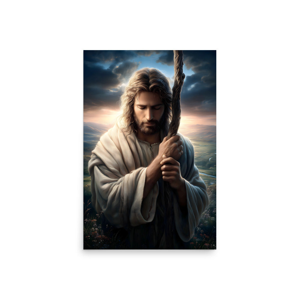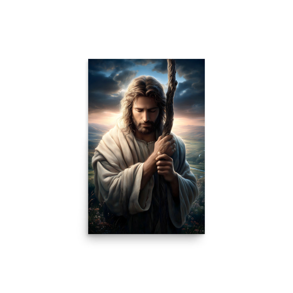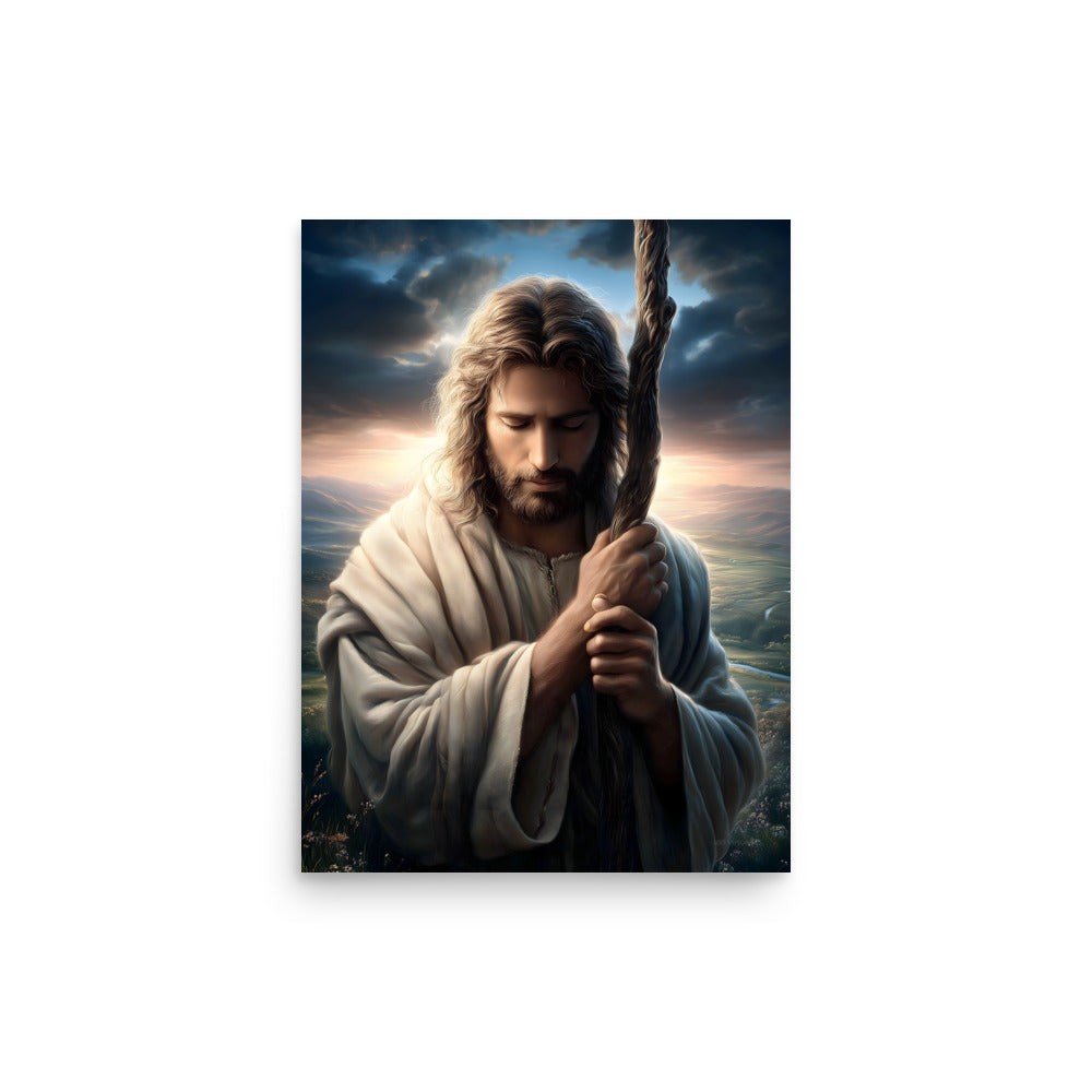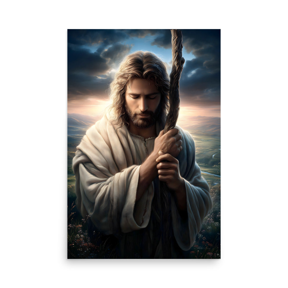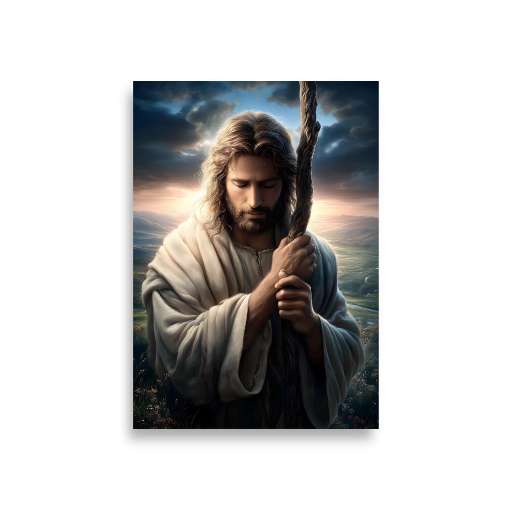 This image portrays Jesus as the Good Shepherd in a moment of deep humility and prayer. His head is bowed, eyes closed, hands gently wrapped around the shepherd’s staff—not as a symbol of authority here, but of dependence and resolve. The posture feels intimate, almost private, as if we’re witnessing a sacred pause between heaven and earth.