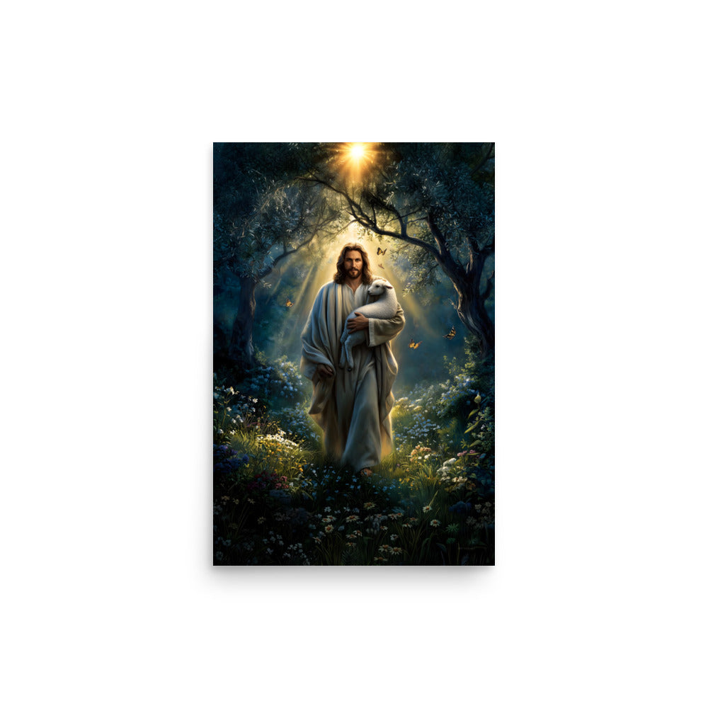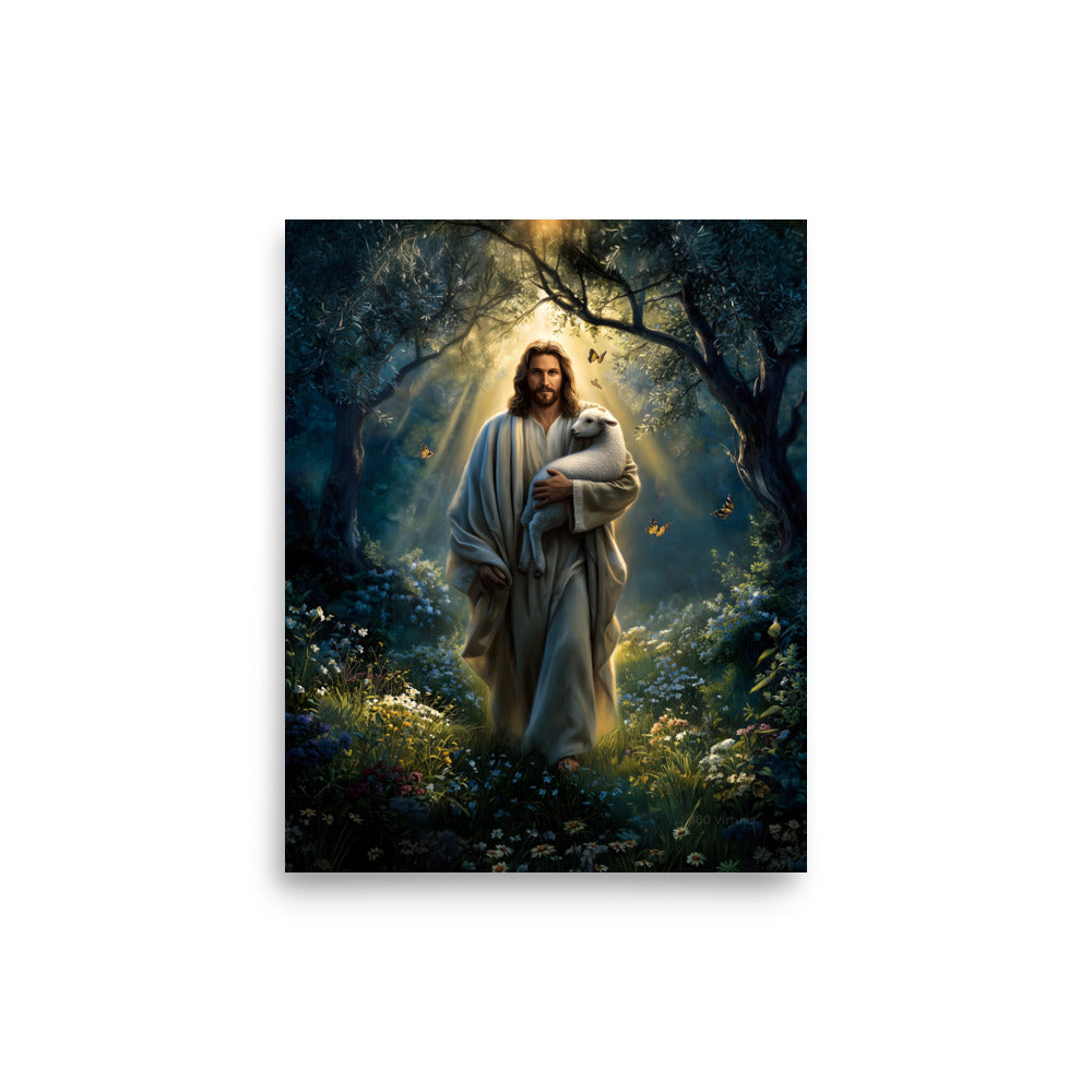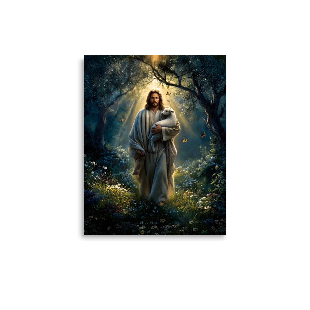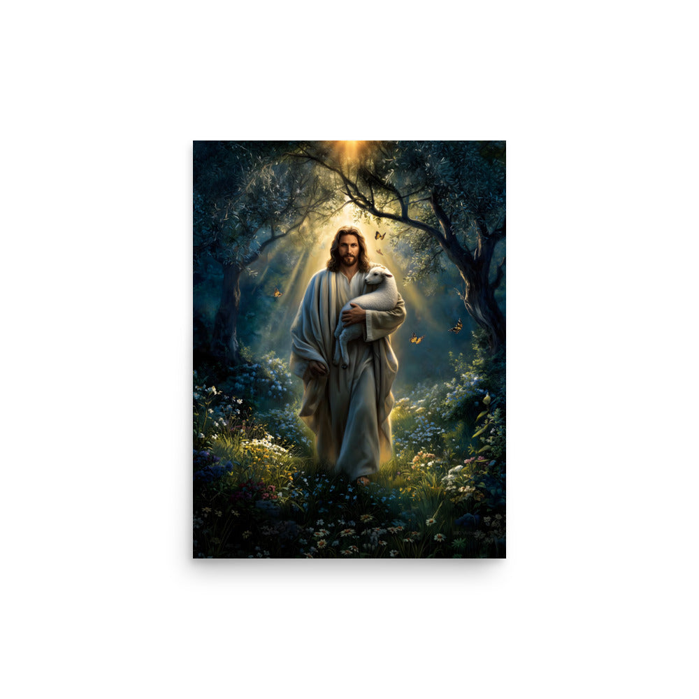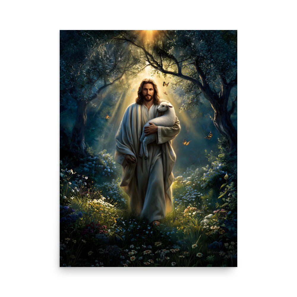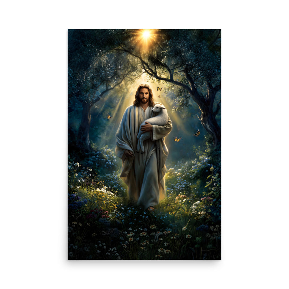 Invite peace, protection, and gentle assurance into your space with this luminous, museum-quality artwork depicting Jesus Christ as the Good Shepherd, walking through a quiet forest alive with light and creation. Cradling a lamb securely in His arms, Christ moves forward beneath a radiant canopy of trees as golden sunlight streams down from above. Butterflies drift through the air and wildflowers bloom along the path, symbolizing renewal, hope, and the harmony of God’s care woven into every detail of the scene.