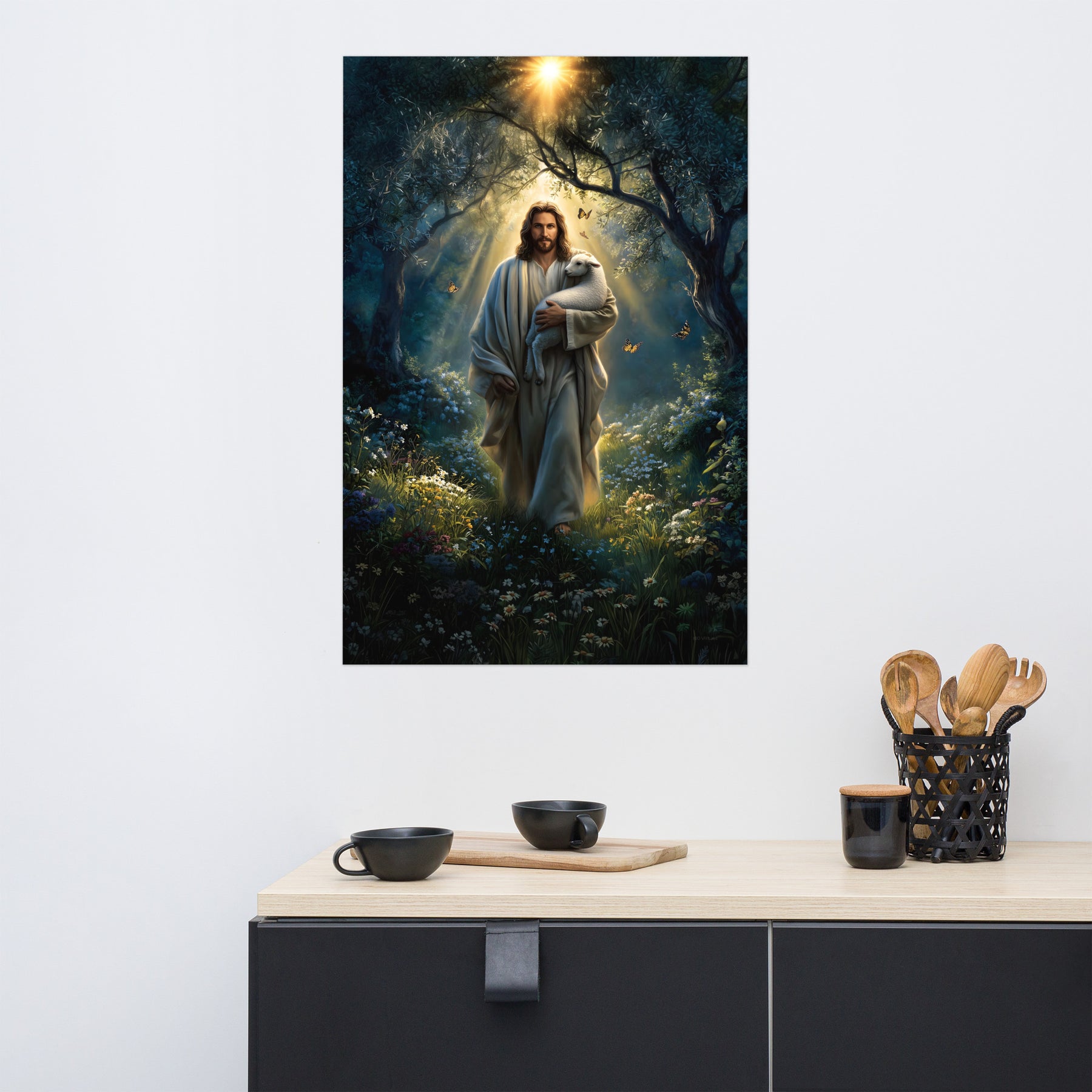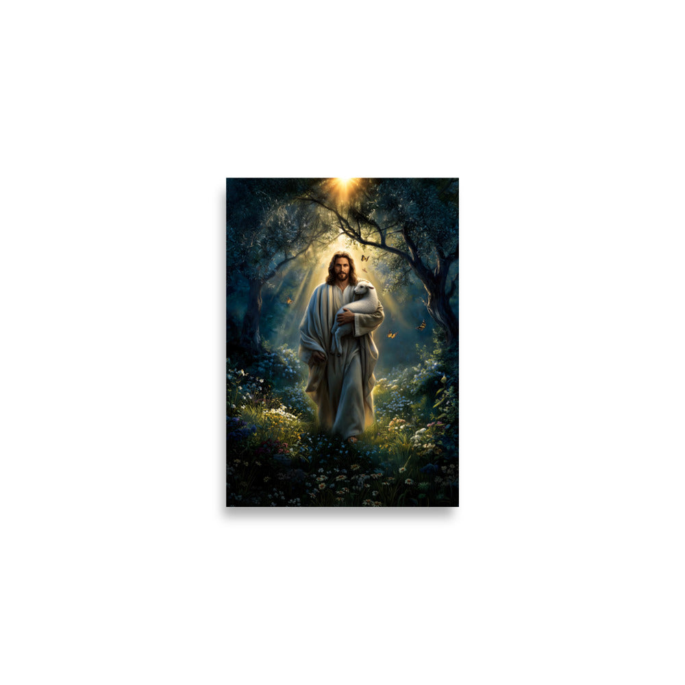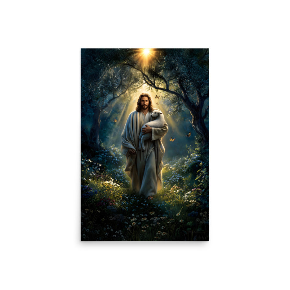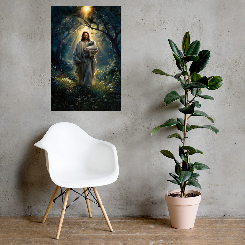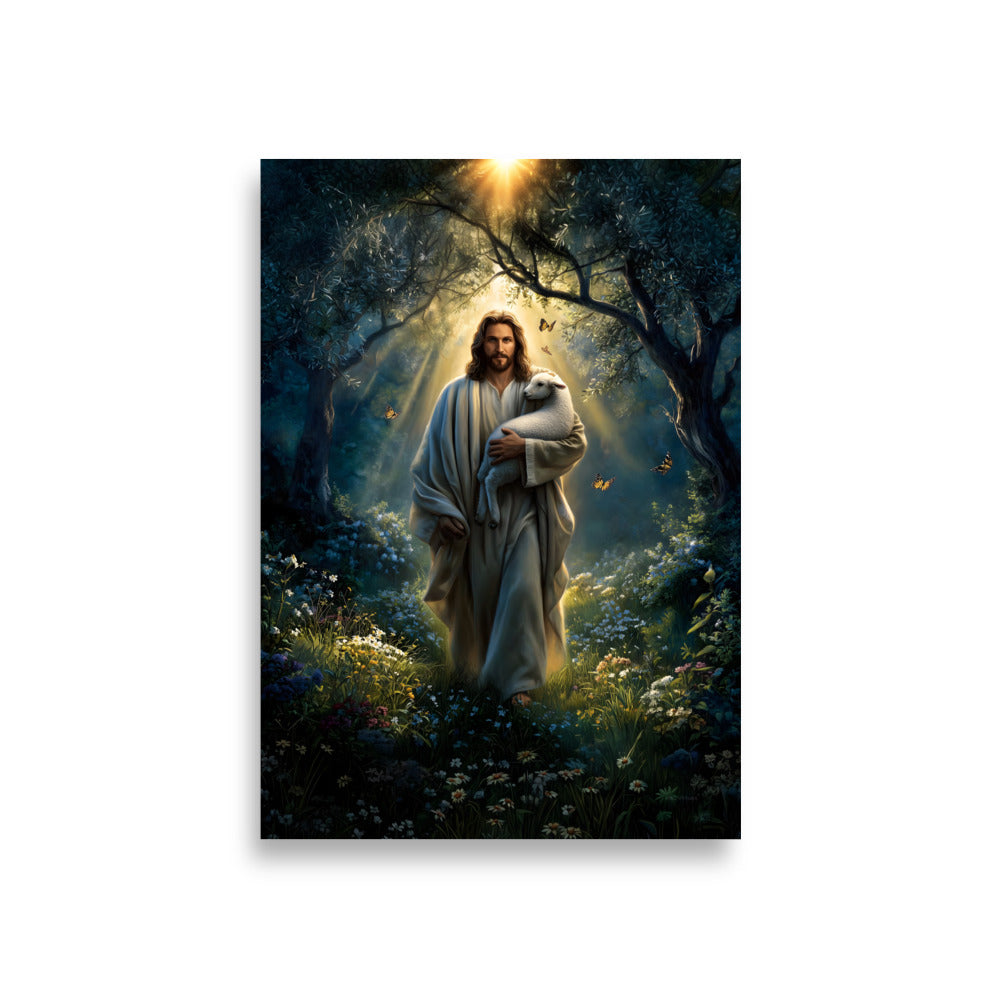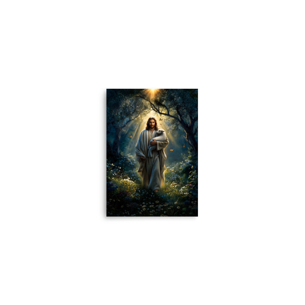 Invite peace, protection, and gentle assurance into your space with this luminous, museum-quality artwork depicting Jesus Christ as the Good Shepherd, walking through a quiet forest alive with light and creation. Cradling a lamb securely in His arms, Christ moves forward beneath a radiant canopy of trees as golden sunlight streams down from above. Butterflies drift through the air and wildflowers bloom along the path, symbolizing renewal, hope, and the harmony of God’s care woven into every detail of the scene.