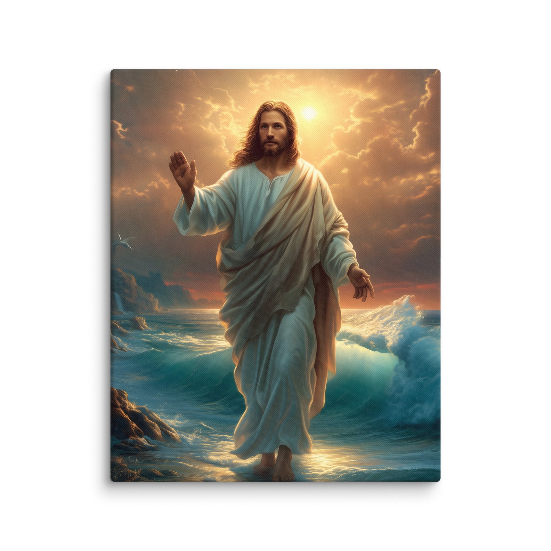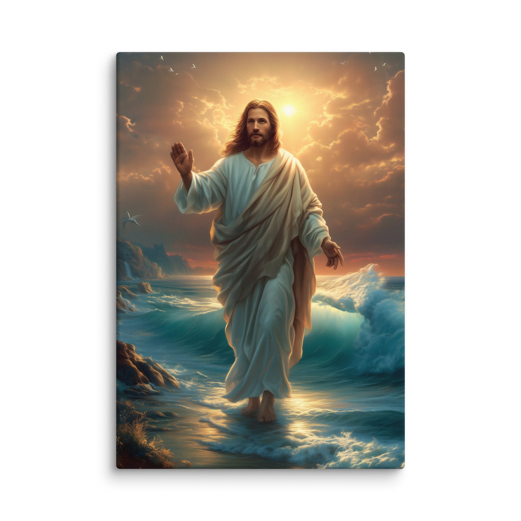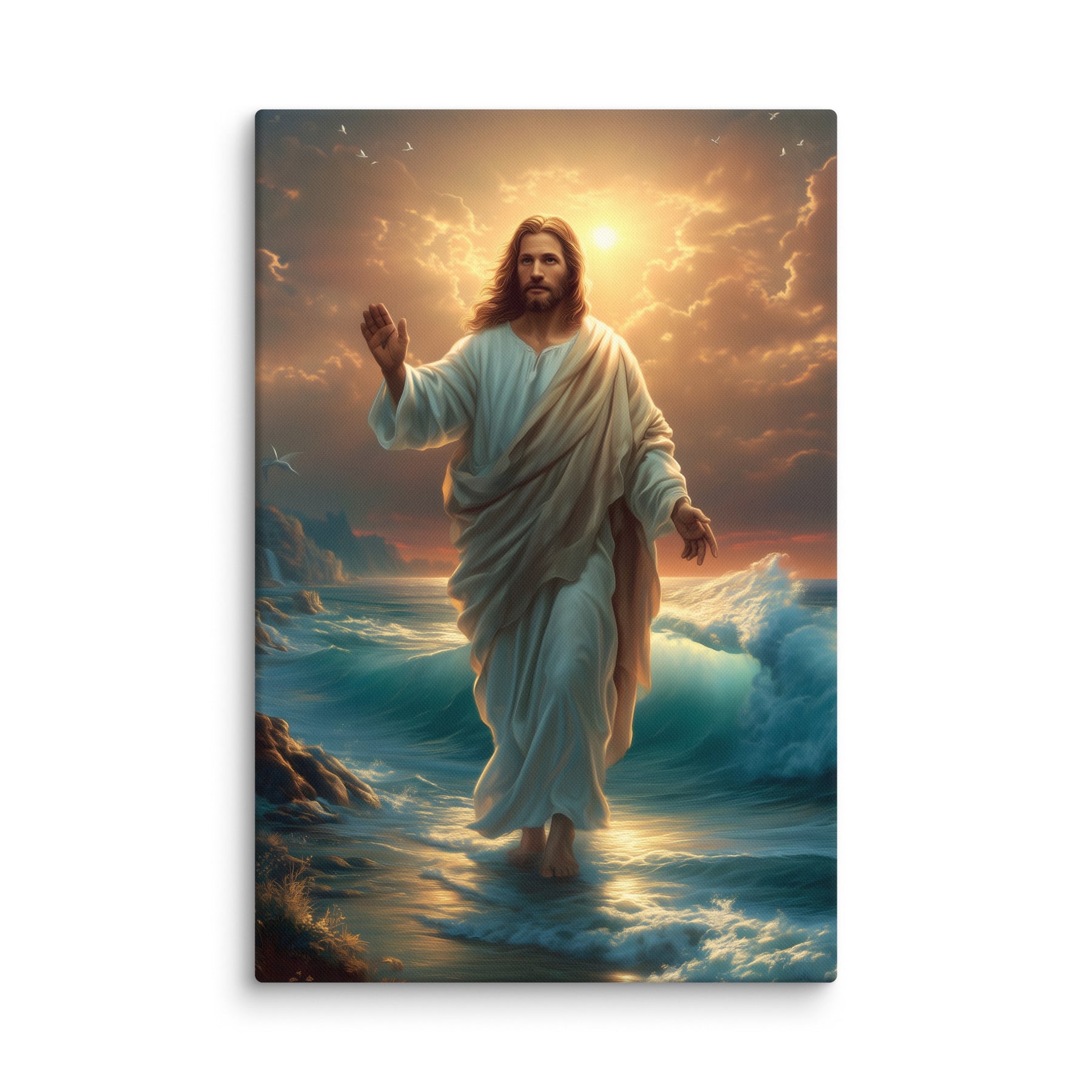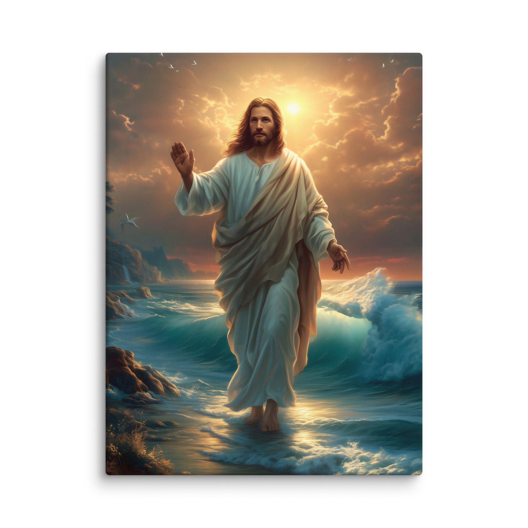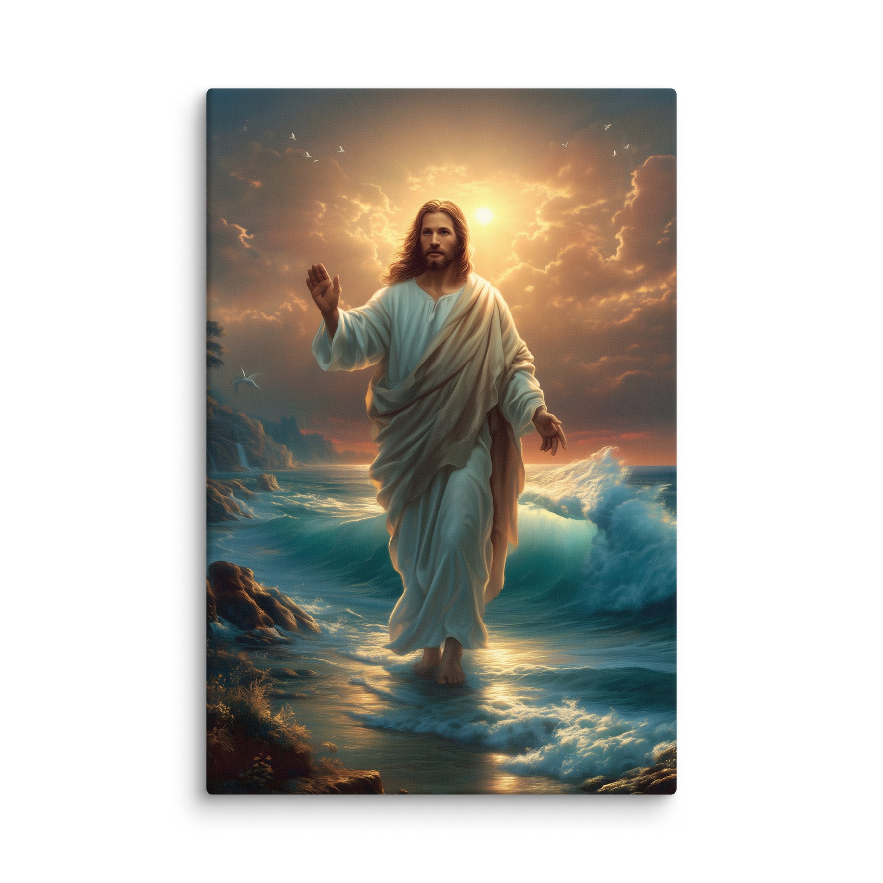 This artwork captures the majesty and compassion of Christ—the graceful flow of His white robe, His calm yet powerful presence, and the vibrant colors of the sunrise reflecting across the ocean. The rocky coastline, glowing waters, and brilliant sky create a sacred, uplifting atmosphere, making this piece a beautiful spiritual centerpiece for any room or devotional space.