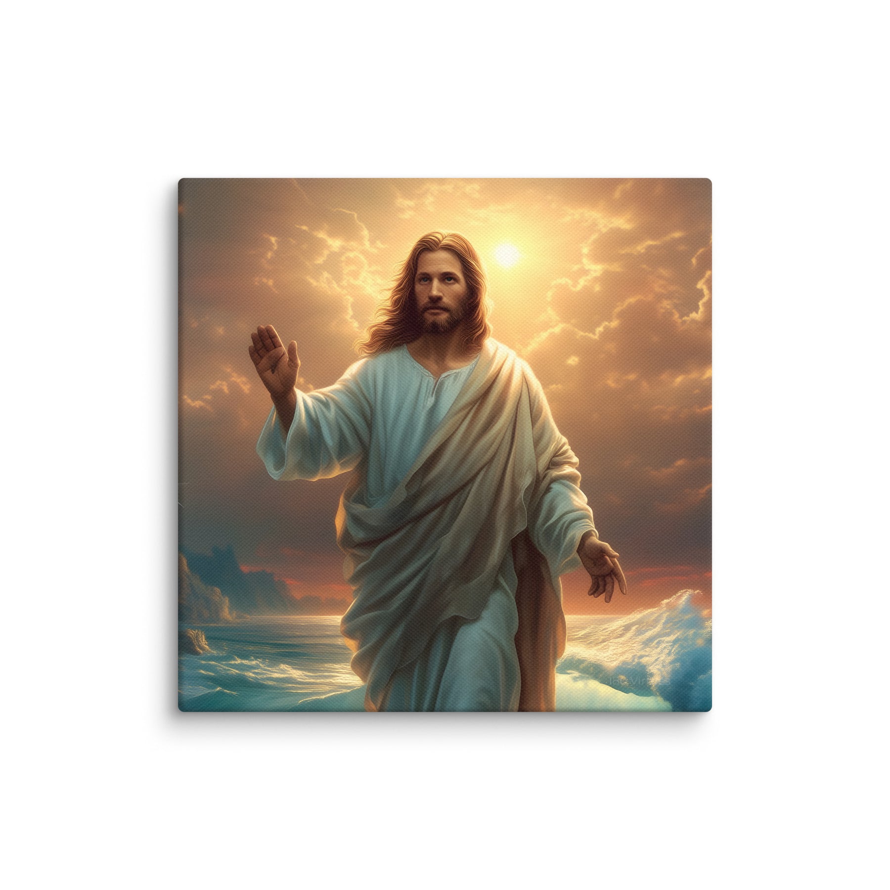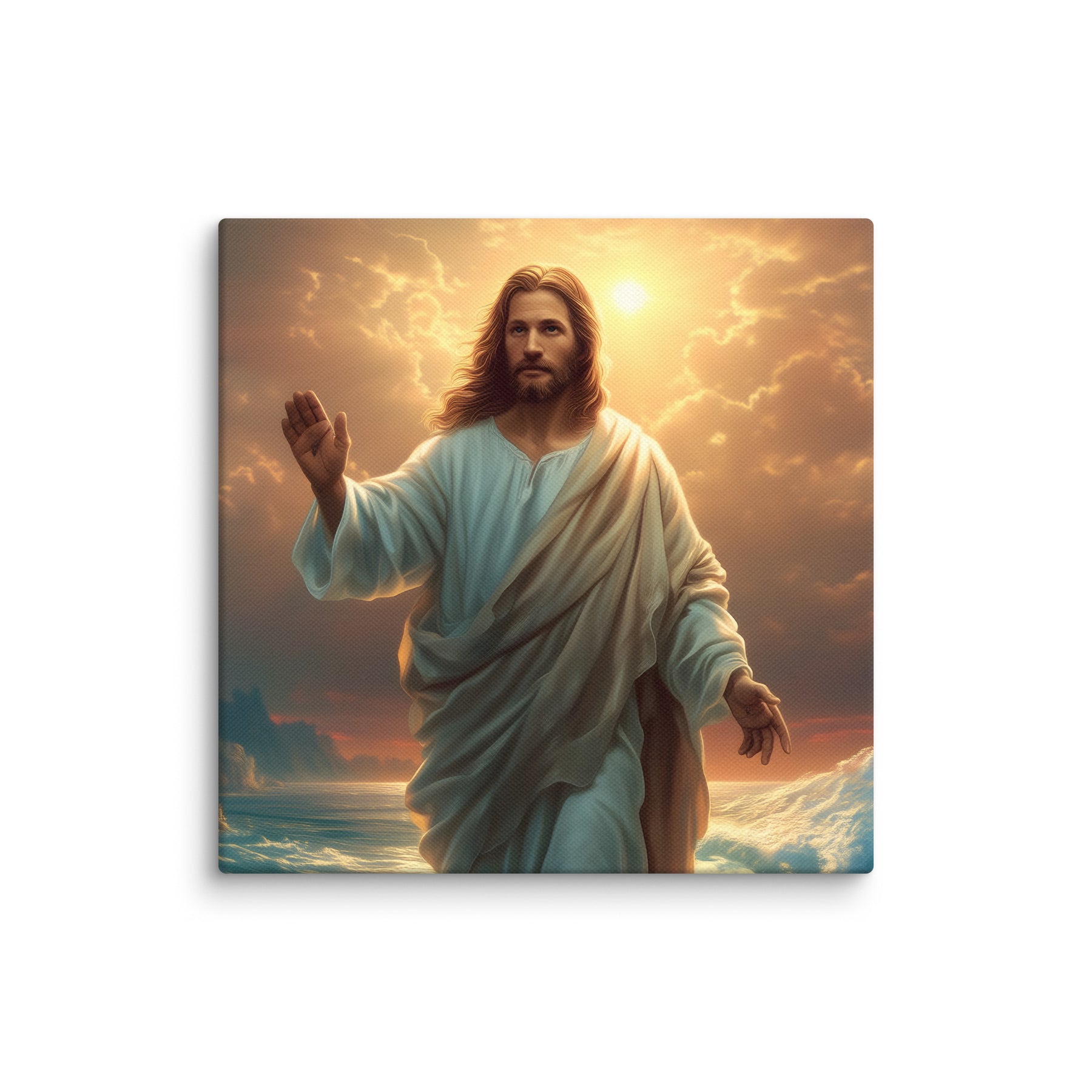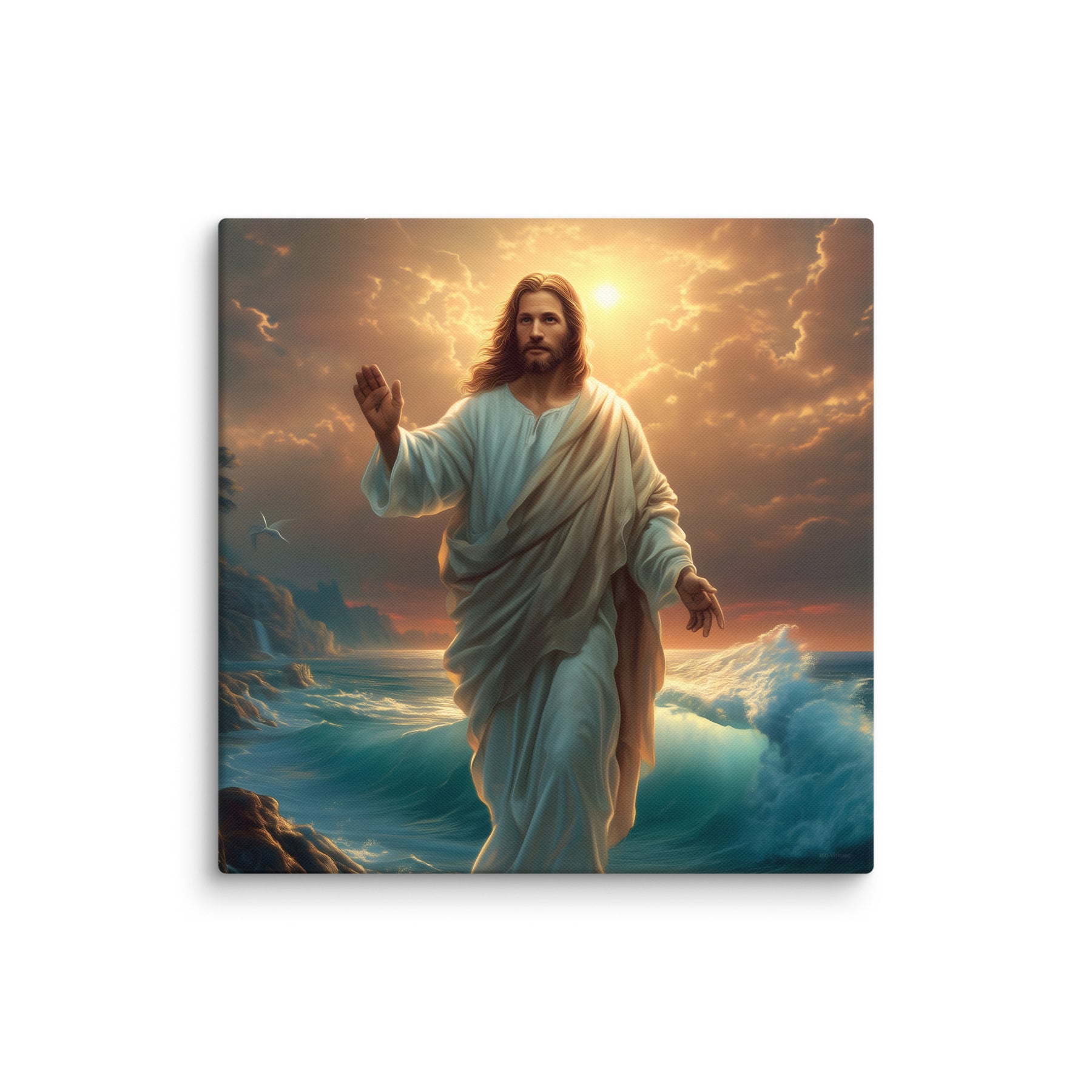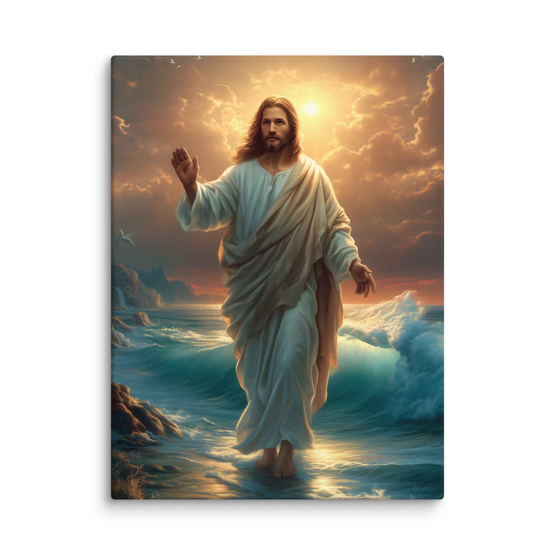 This artwork captures the majesty and compassion of Christ—the graceful flow of His white robe, His calm yet powerful presence, and the vibrant colors of the sunrise reflecting across the ocean. The rocky coastline, glowing waters, and brilliant sky create a sacred, uplifting atmosphere, making this piece a beautiful spiritual centerpiece for any room or devotional space.