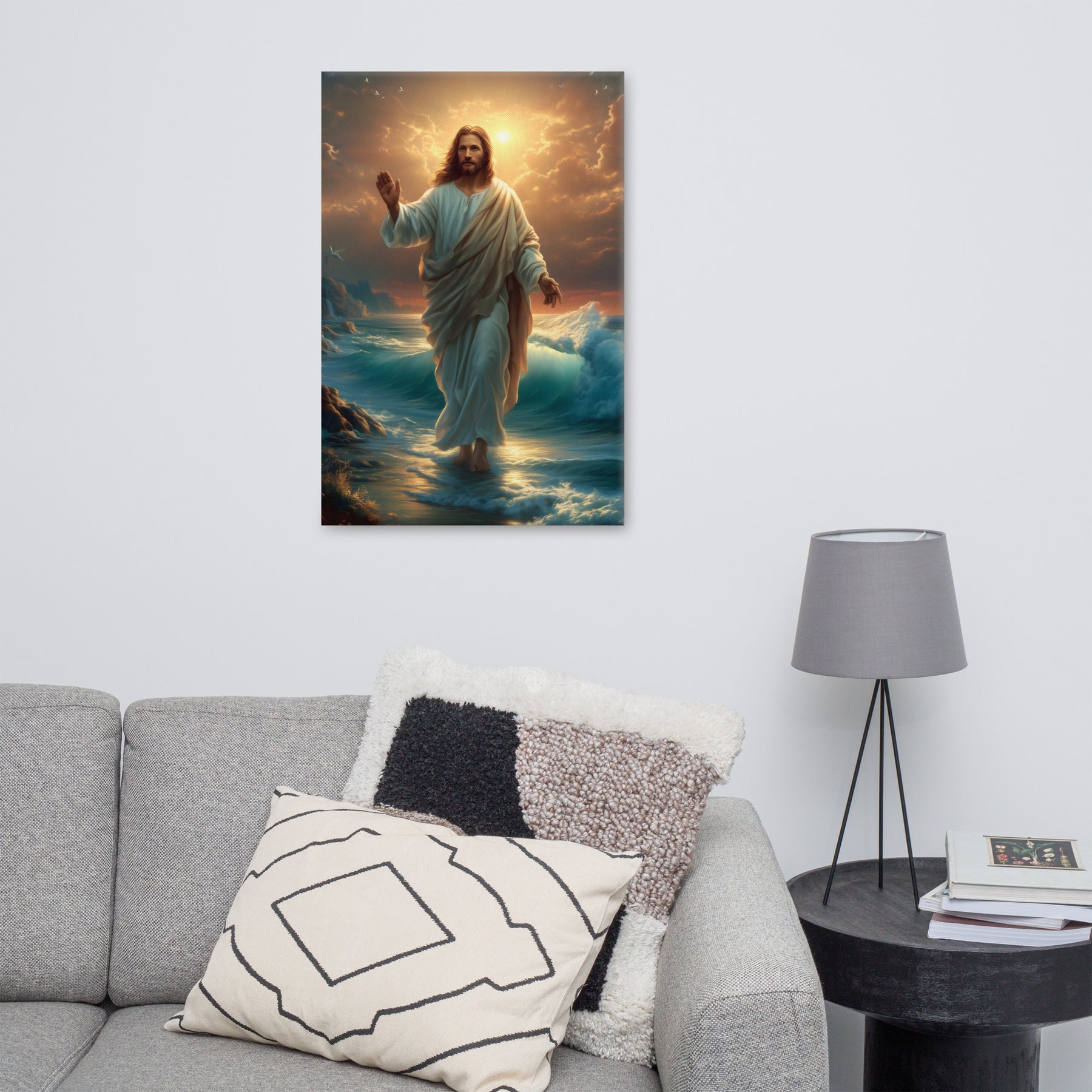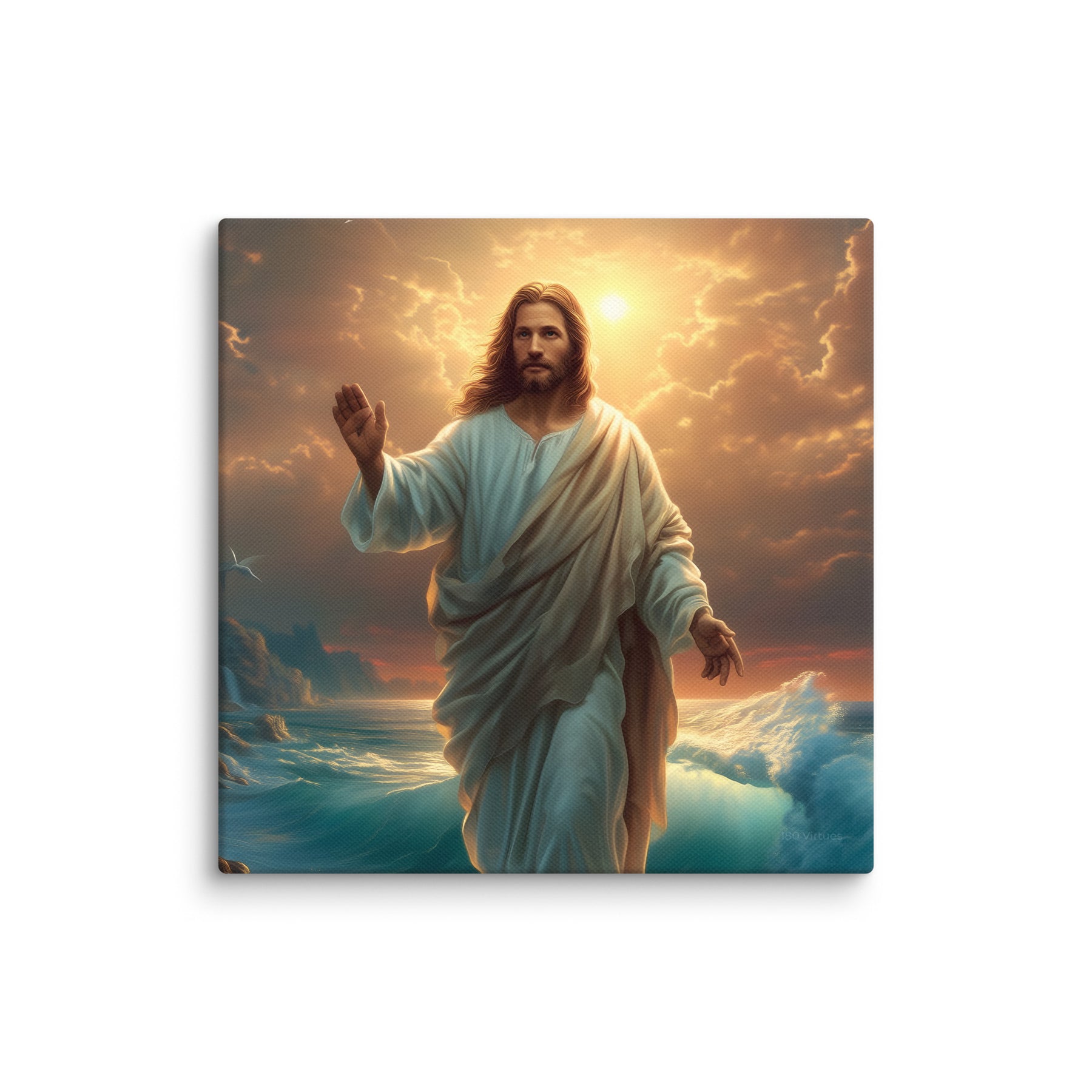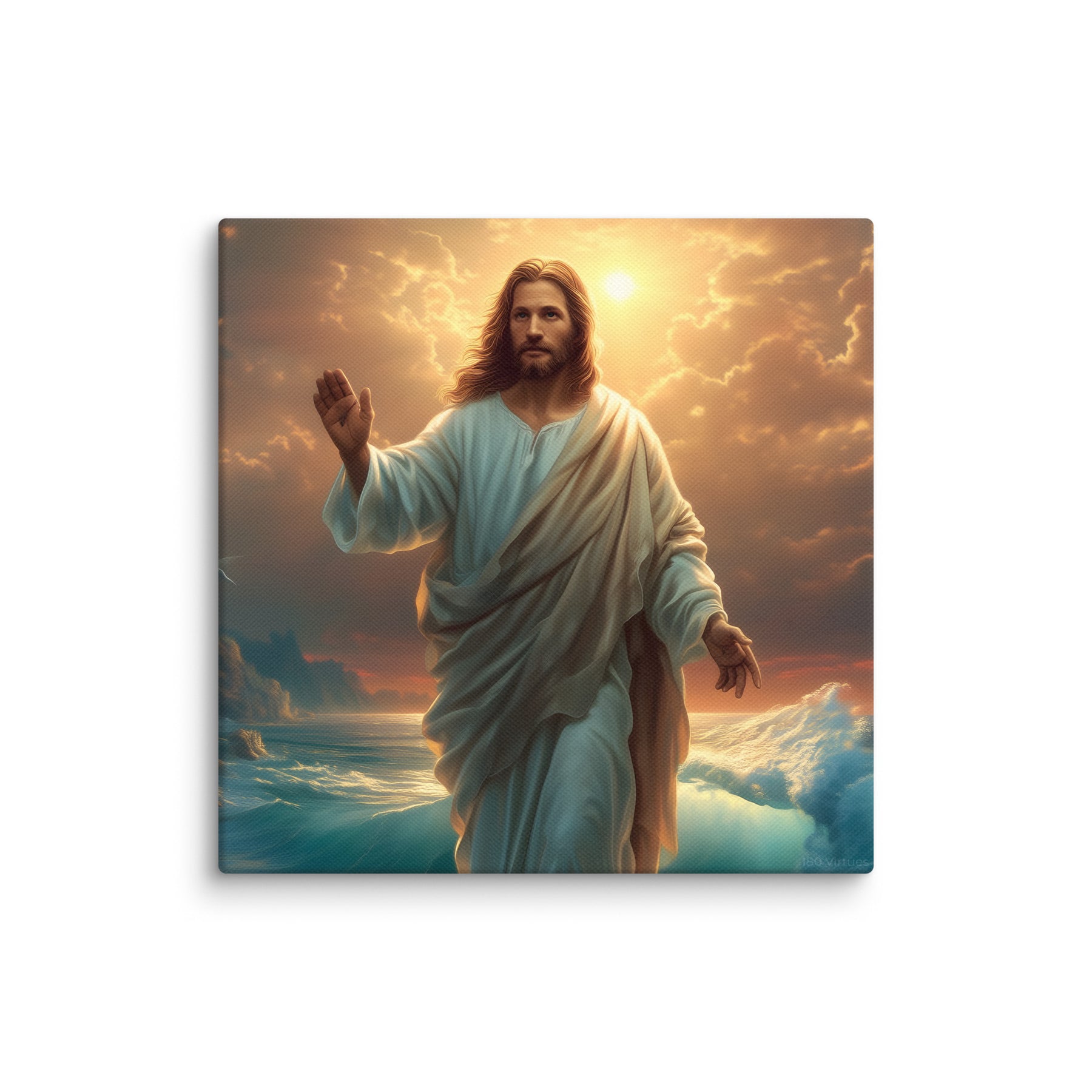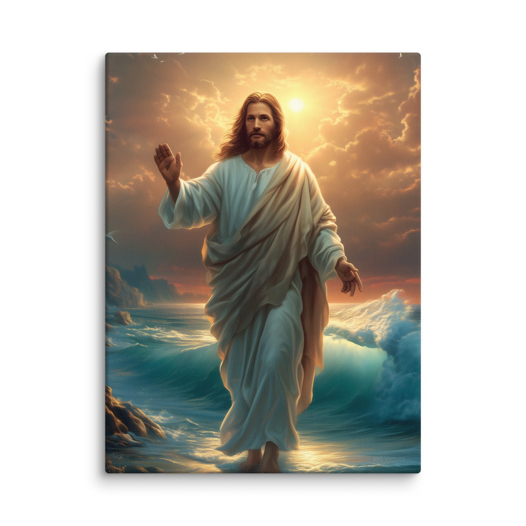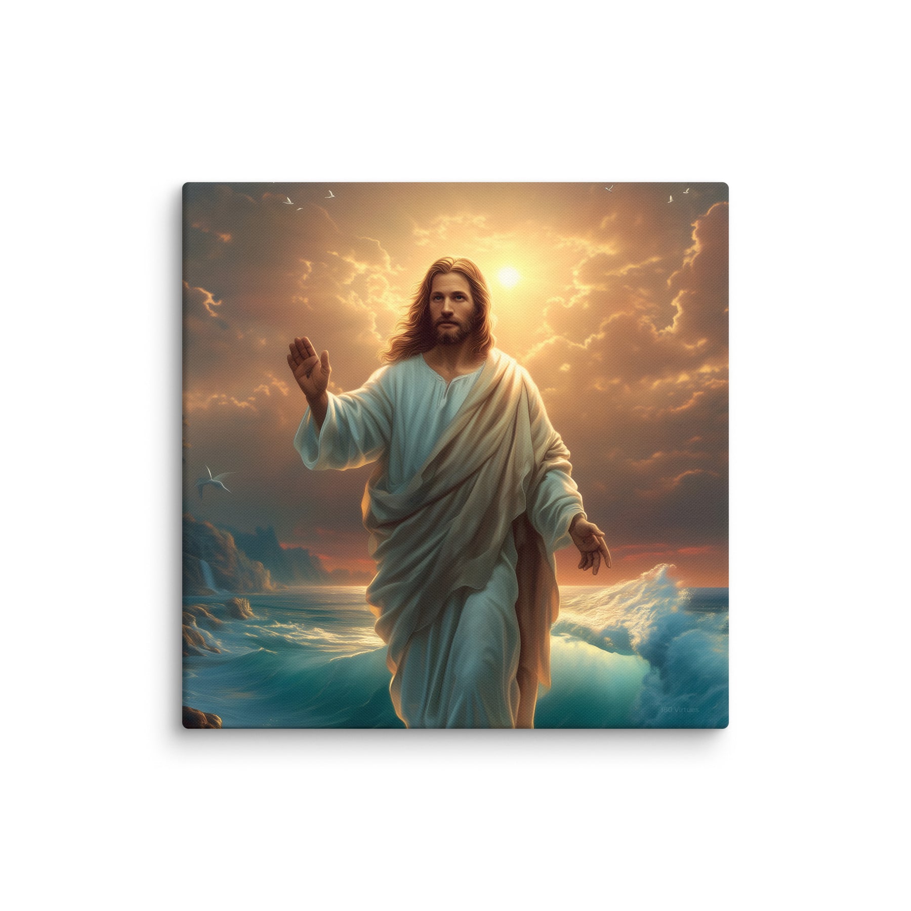 This artwork captures the majesty and compassion of Christ—the graceful flow of His white robe, His calm yet powerful presence, and the vibrant colors of the sunrise reflecting across the ocean. The rocky coastline, glowing waters, and brilliant sky create a sacred, uplifting atmosphere, making this piece a beautiful spiritual centerpiece for any room or devotional space.