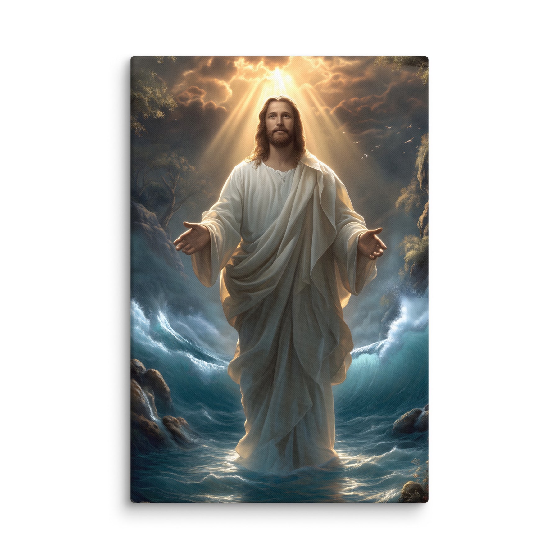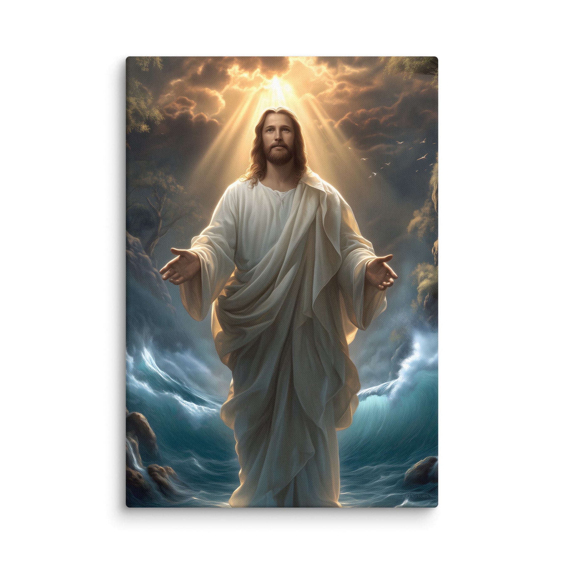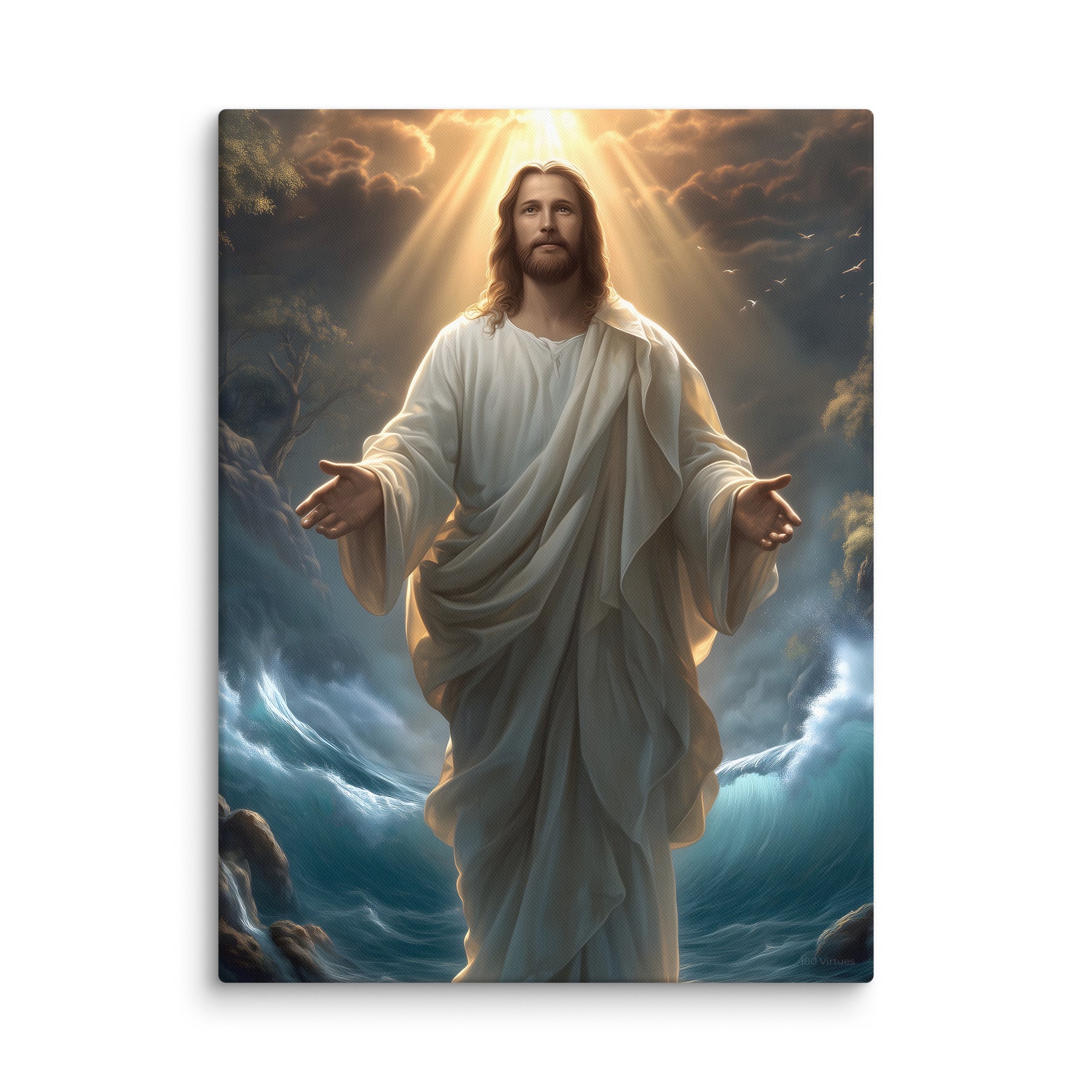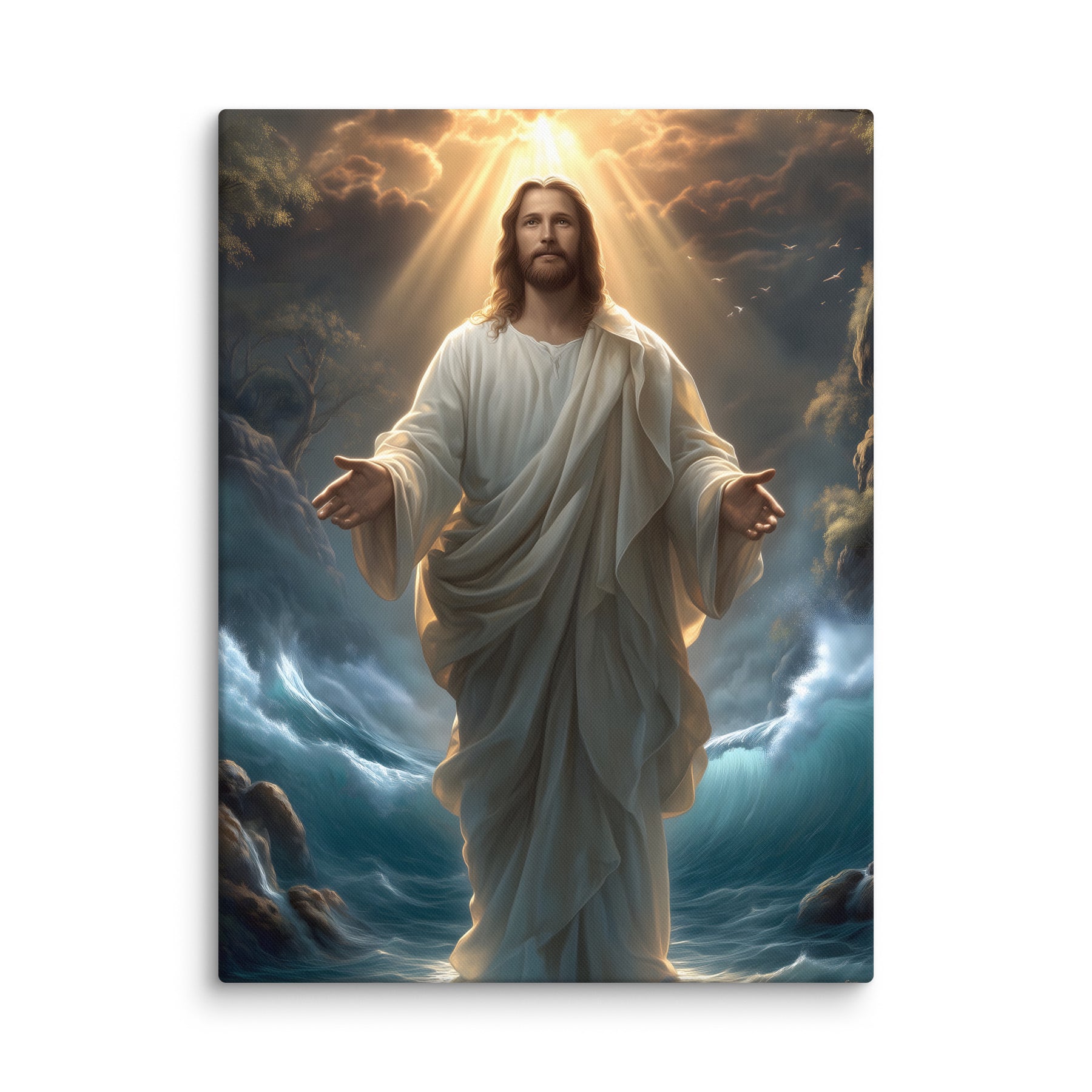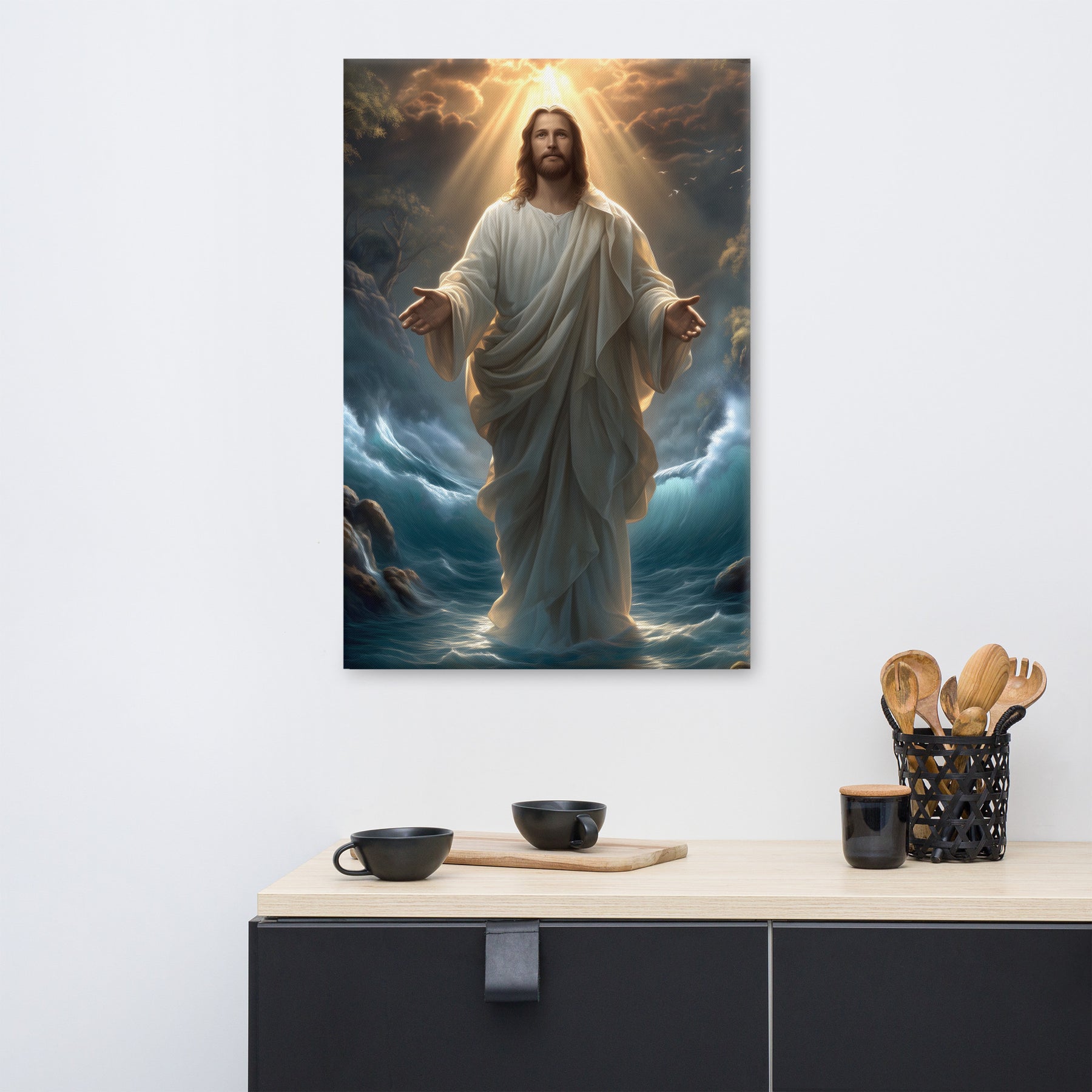 Bring hope, strength, and heavenly reassurance into your home with this breathtaking 8K canvas of Jesus walking on the water, illuminated by brilliant rays of light breaking through the clouds. With His arms extended in invitation and peace, the Savior stands steady above the swirling waves—reminding us that He has power over every storm and walks beside us through every trial.