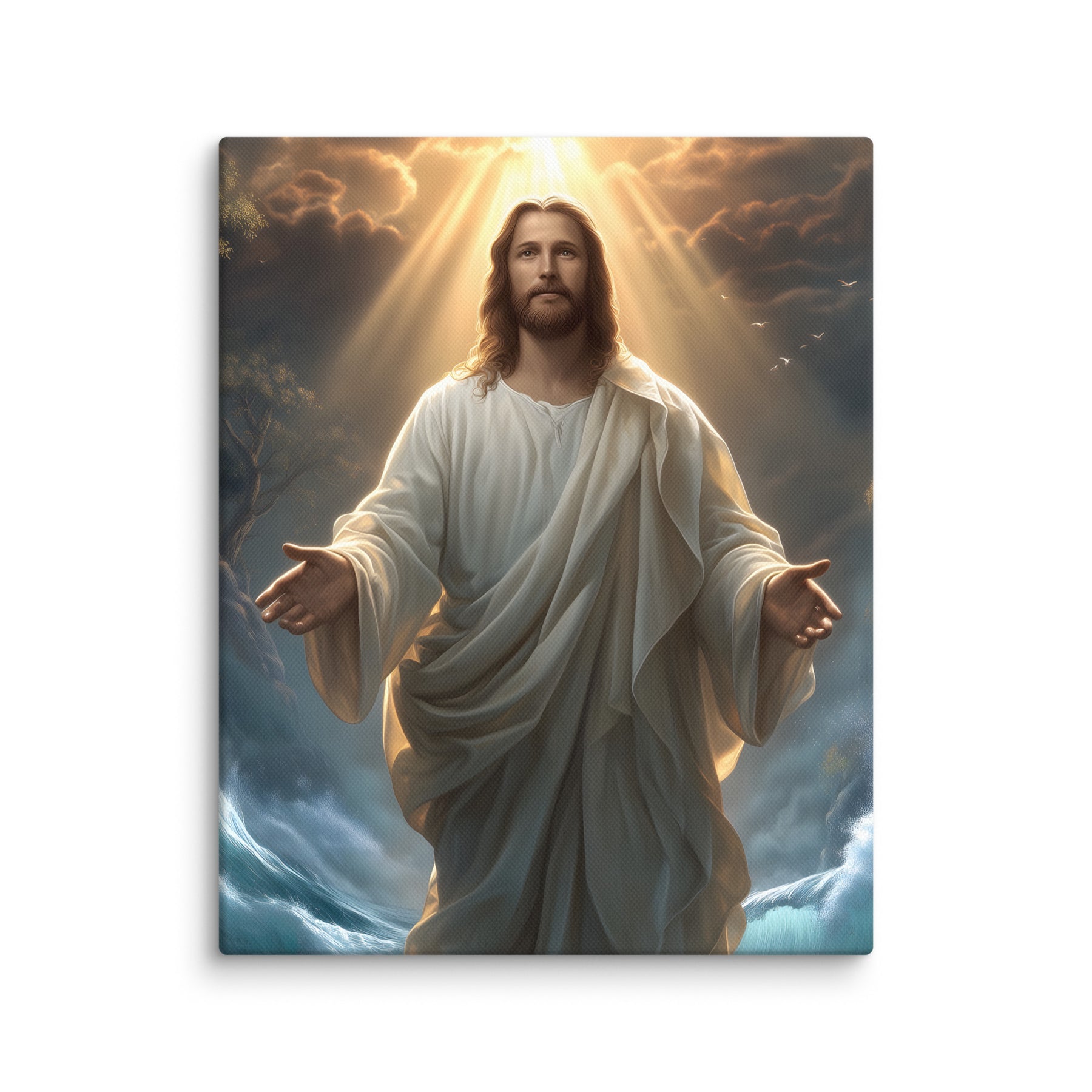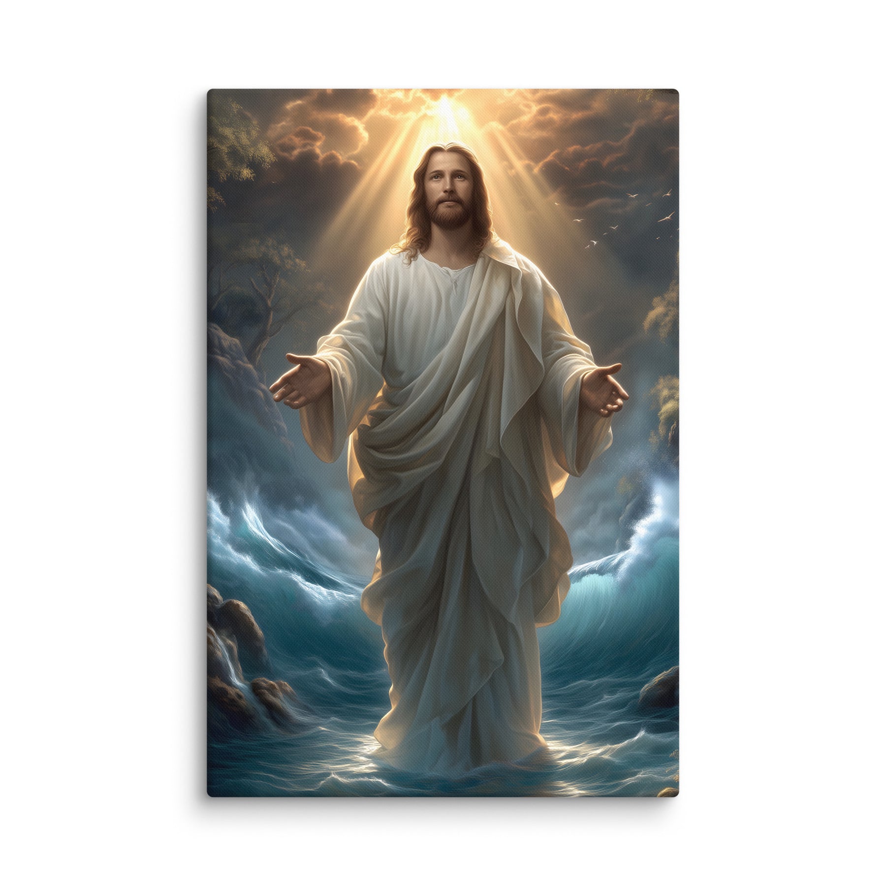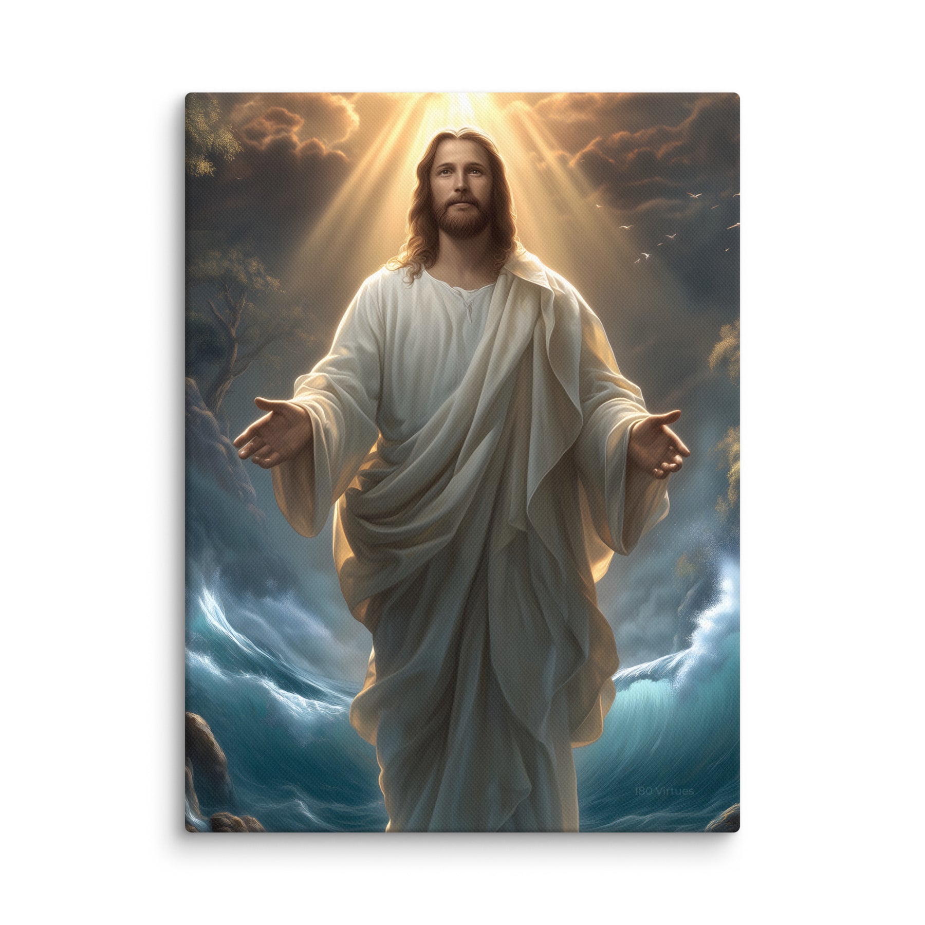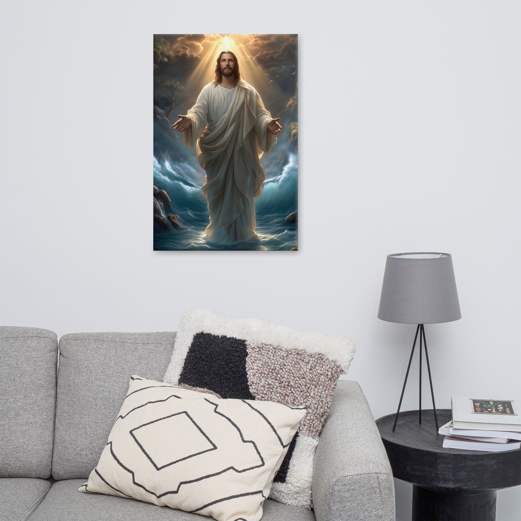 Bring hope, strength, and heavenly reassurance into your home with this breathtaking 8K canvas of Jesus walking on the water, illuminated by brilliant rays of light breaking through the clouds. With His arms extended in invitation and peace, the Savior stands steady above the swirling waves—reminding us that He has power over every storm and walks beside us through every trial.