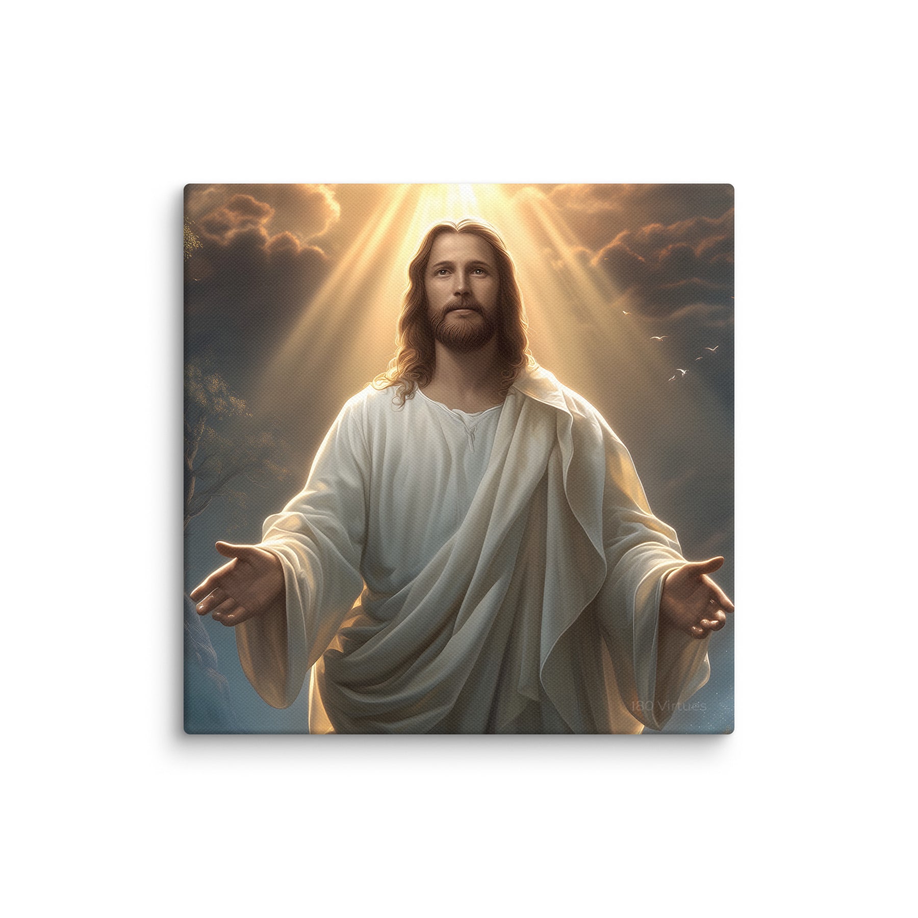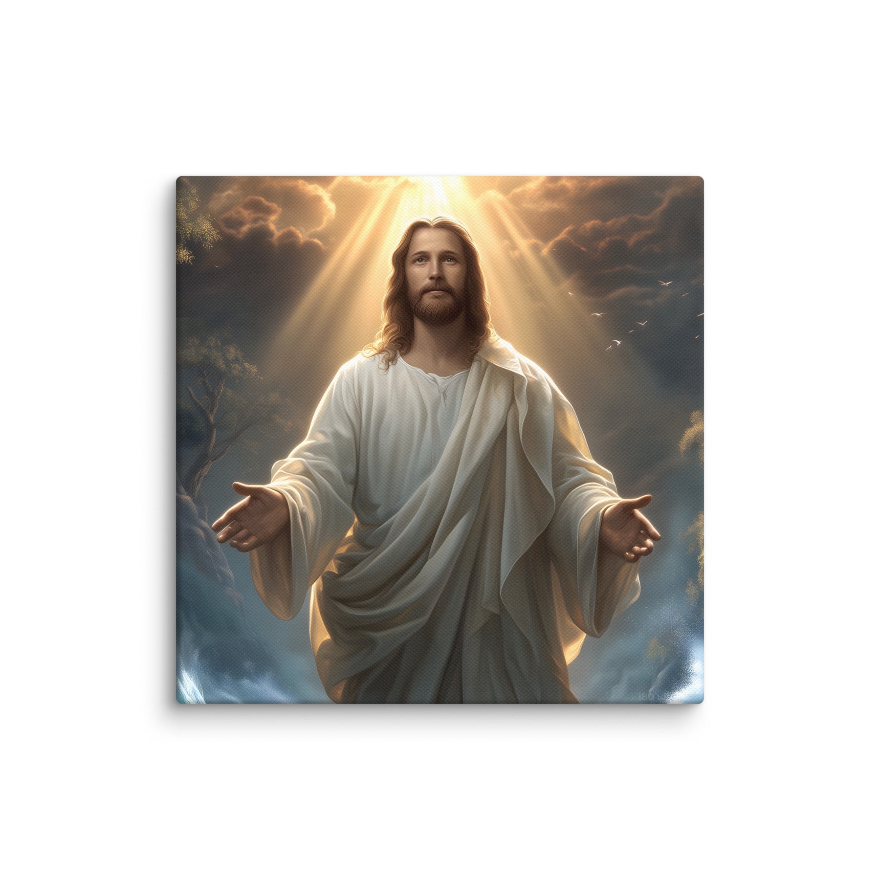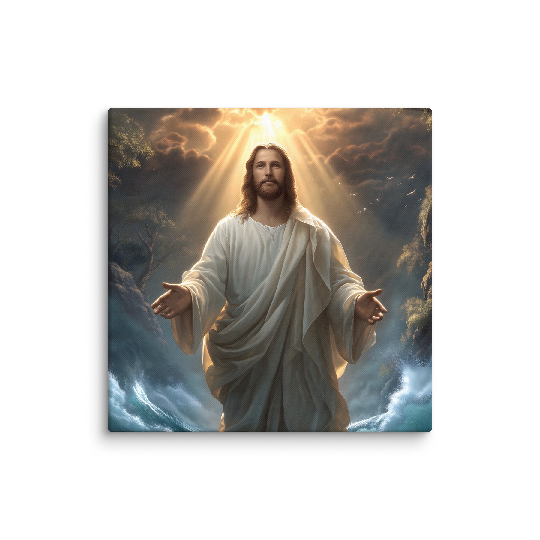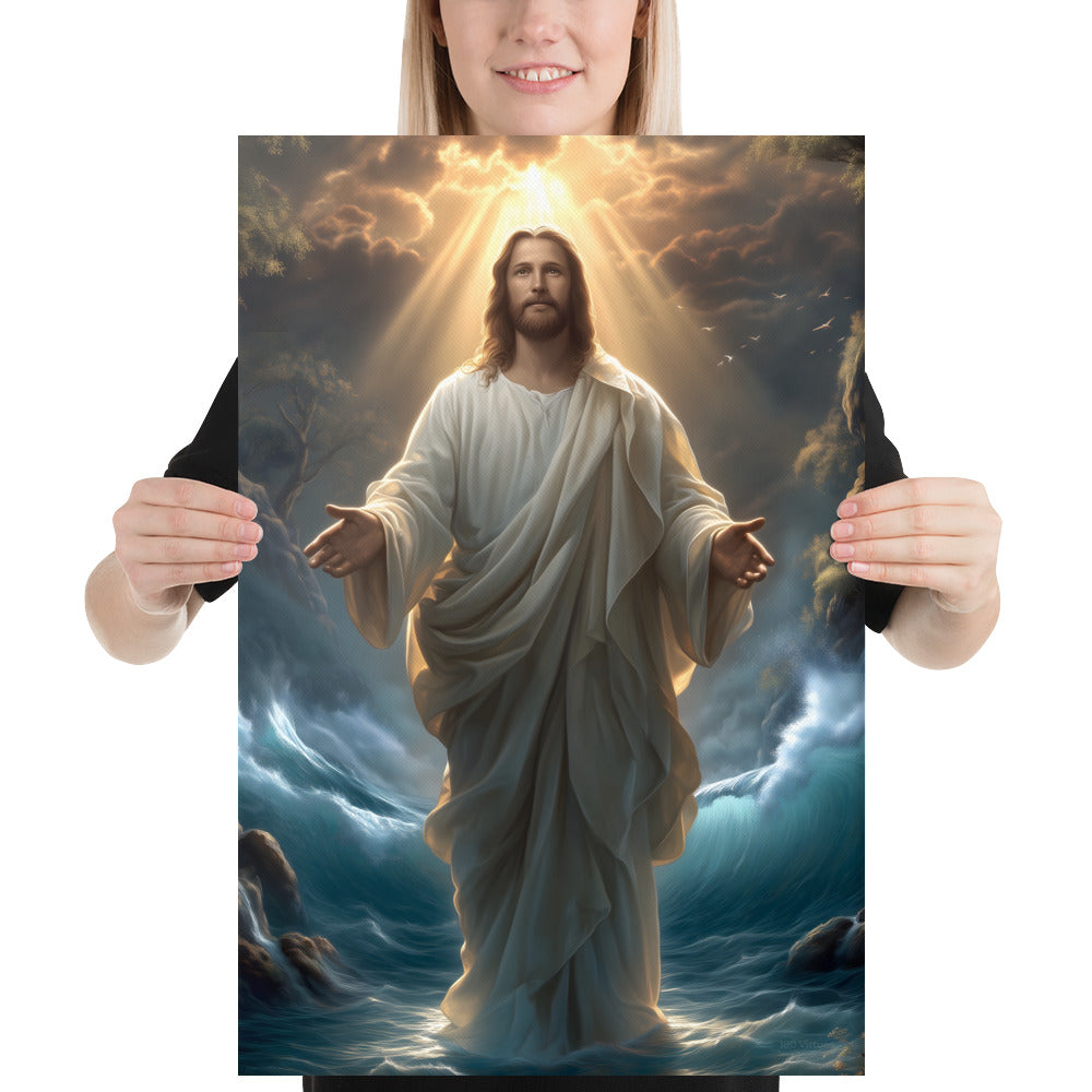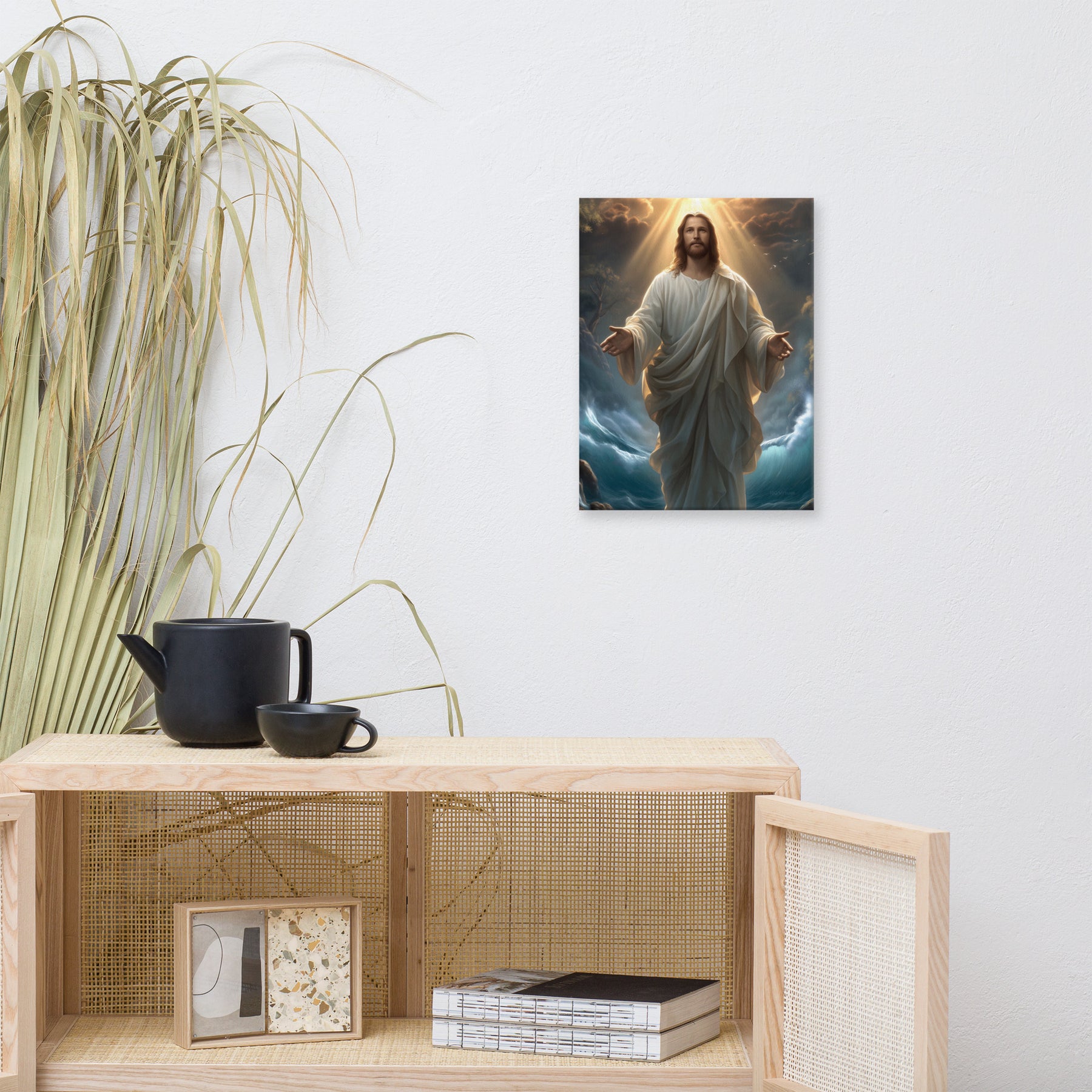 Bring hope, strength, and heavenly reassurance into your home with this breathtaking 8K canvas of Jesus walking on the water, illuminated by brilliant rays of light breaking through the clouds. With His arms extended in invitation and peace, the Savior stands steady above the swirling waves—reminding us that He has power over every storm and walks beside us through every trial.