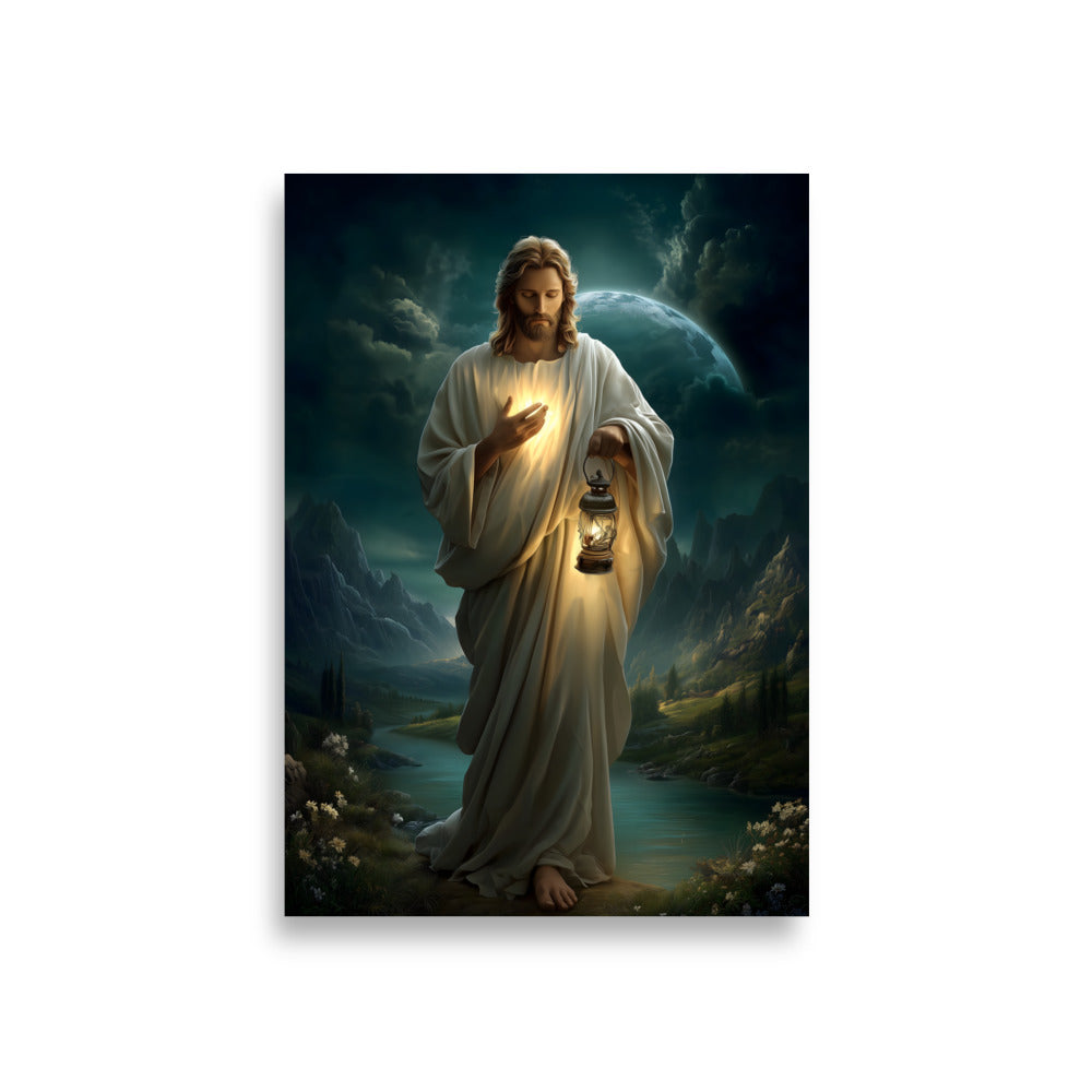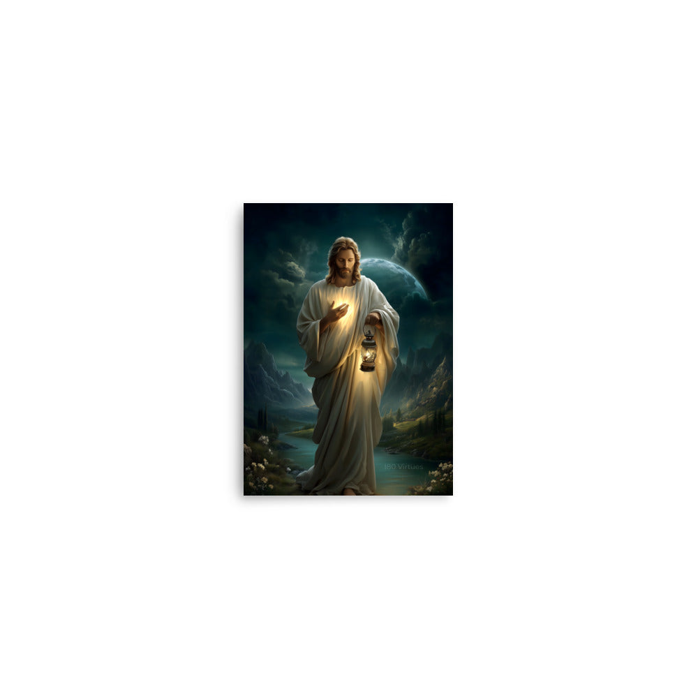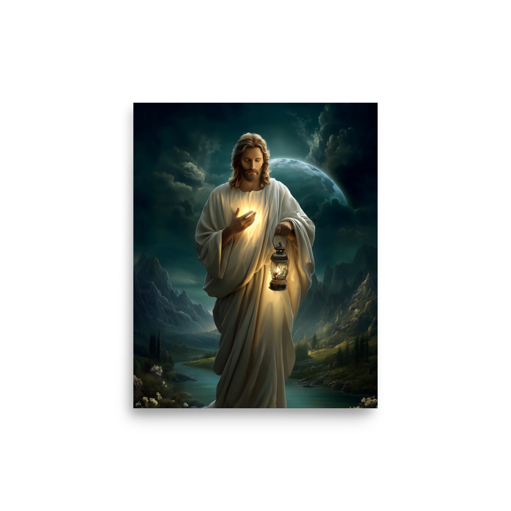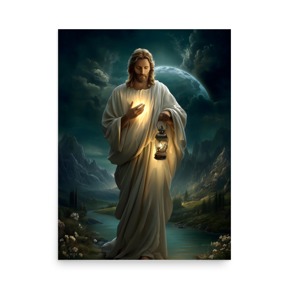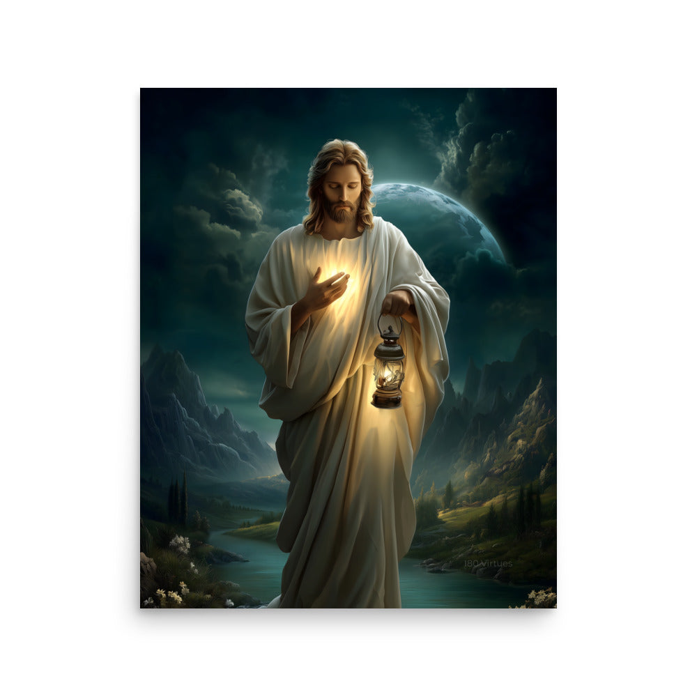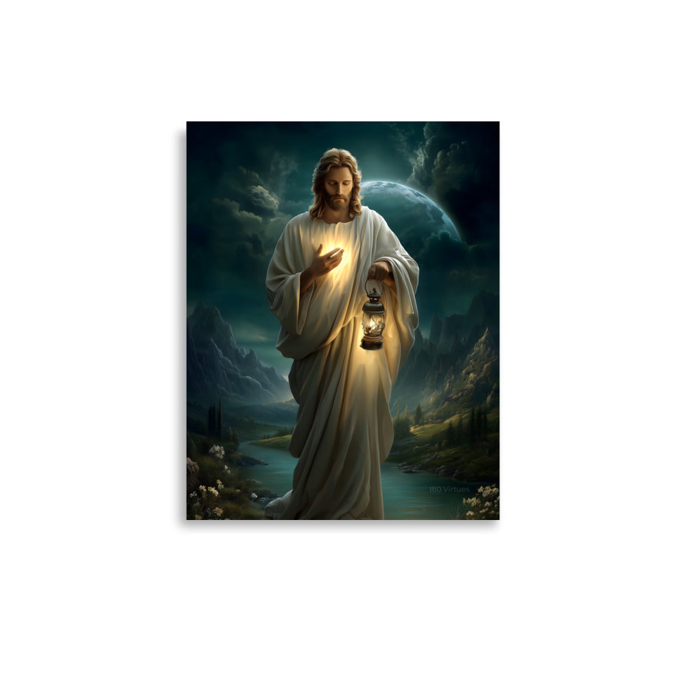 Bring peace, guidance, and quiet assurance into your space with this striking, museum-quality artwork portraying **Jesus Christ** as the Light of the World. Walking gently through a shadowed landscape beneath a vast night sky, Christ holds a glowing lantern that illuminates both His path and the surrounding darkness. One hand rests over His heart, radiating a warm inner light that mirrors the lantern’s glow, symbolizing divine truth, compassion, and the presence of God shining from within.
