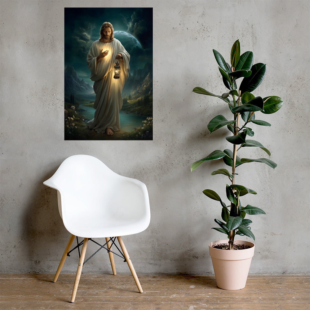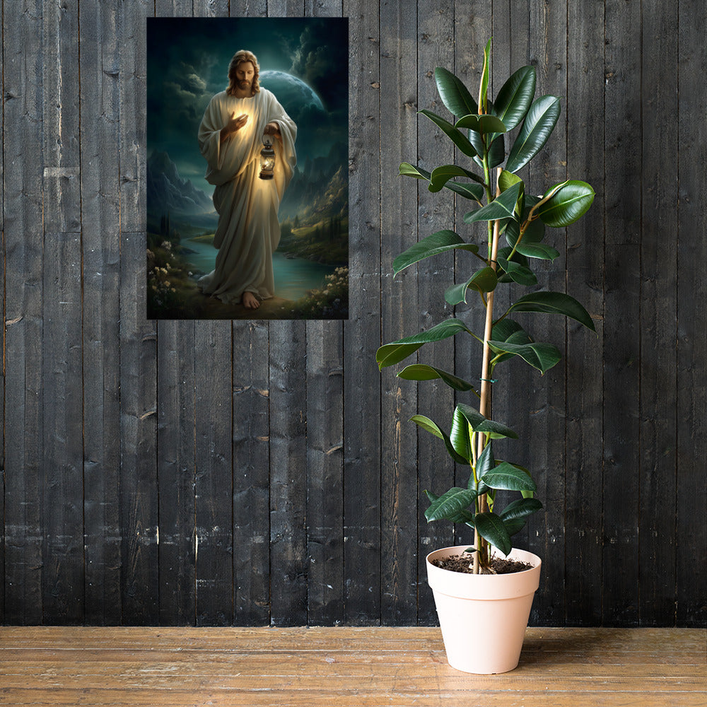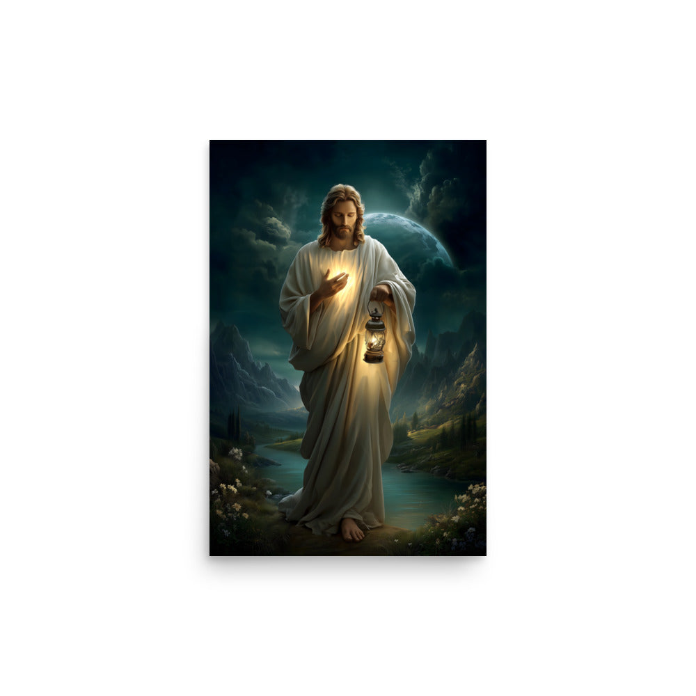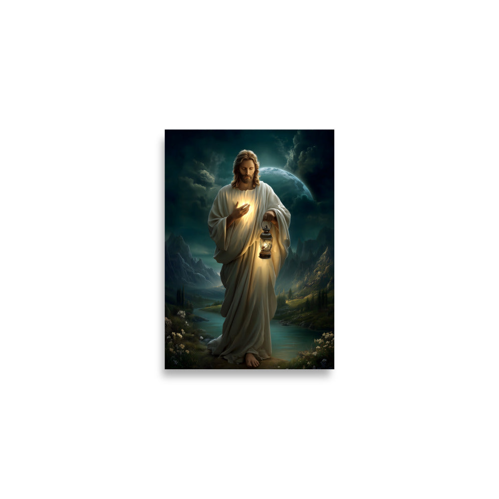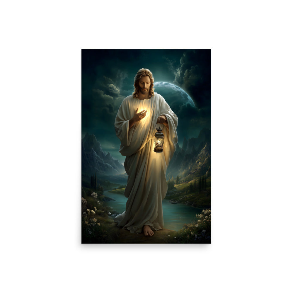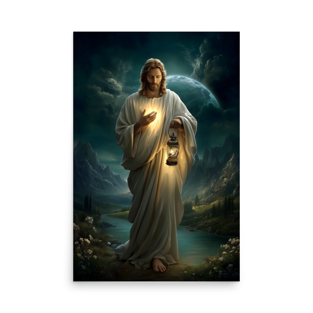 Bring peace, guidance, and quiet assurance into your space with this striking, museum-quality artwork portraying **Jesus Christ** as the Light of the World. Walking gently through a shadowed landscape beneath a vast night sky, Christ holds a glowing lantern that illuminates both His path and the surrounding darkness. One hand rests over His heart, radiating a warm inner light that mirrors the lantern’s glow, symbolizing divine truth, compassion, and the presence of God shining from within.