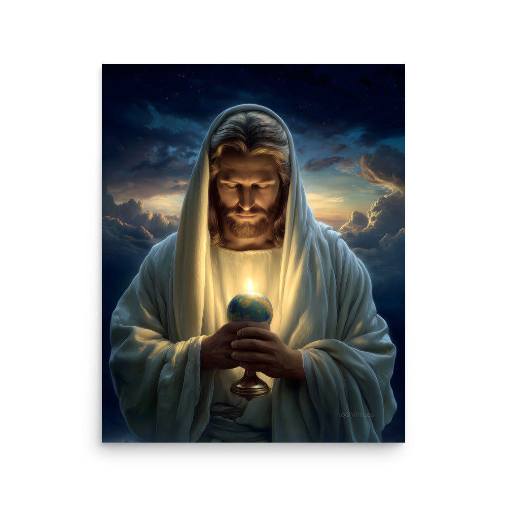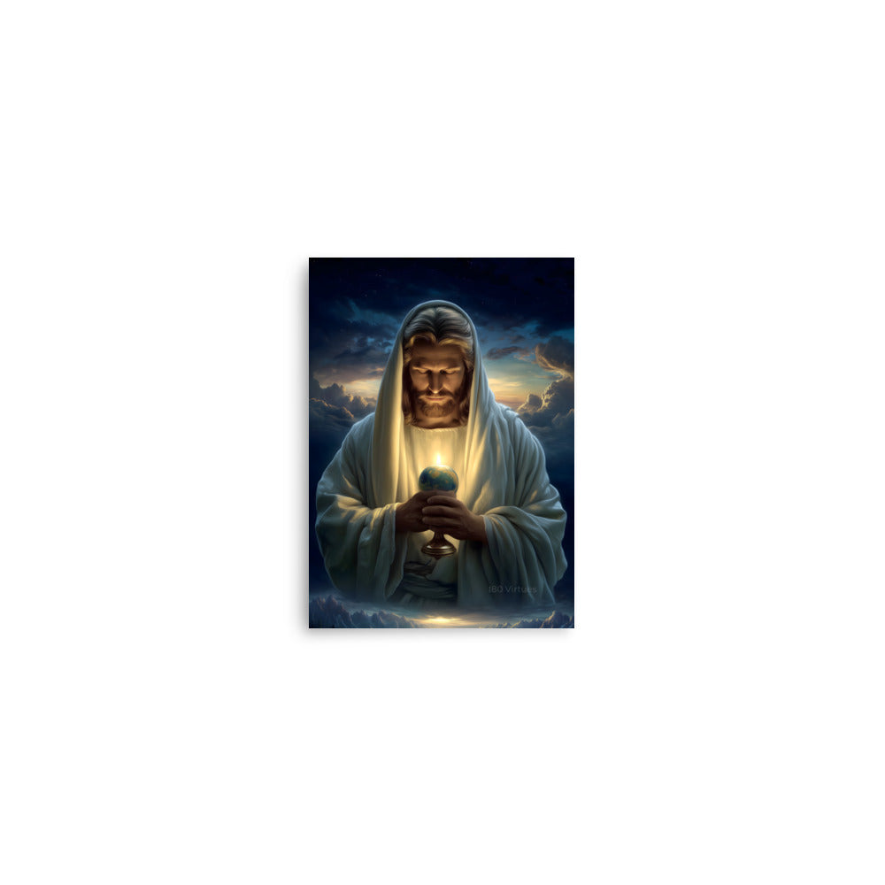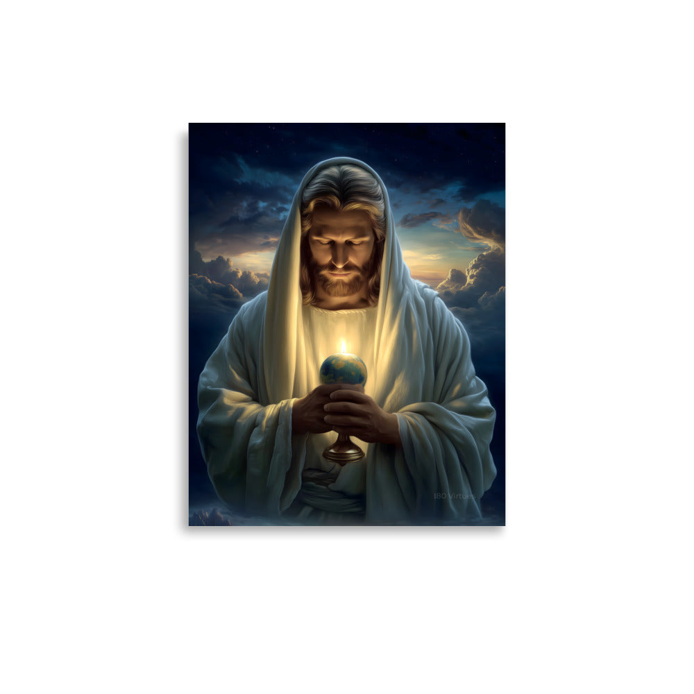 Invite stillness, reverence, and sacred reflection into your space with this luminous, museum-quality artwork portraying **Jesus Christ** holding the light of the world close to His heart. Set against a deep, star-filled night sky, Christ’s bowed head and gentle expression radiate humility, compassion, and divine love. The warm glow emanating from the sacred light illuminates His face and hands, symbolizing hope that shines brightest in darkness and truth that remains steady in every season of life.